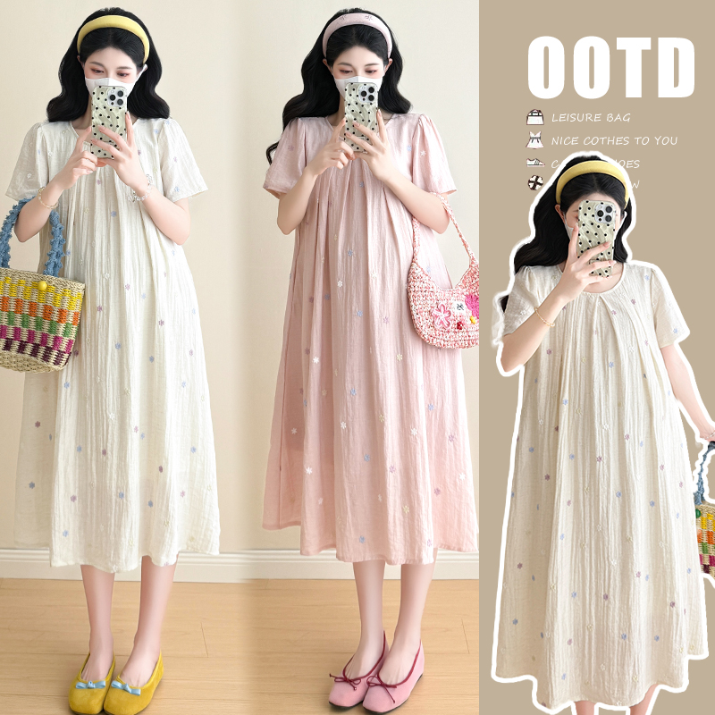 매운맛 엄마 인터넷 유명인 섹션 출산 착용 드레스 2026 여름 새로운 루즈핏 슬림해 보이는 빅 사이즈 중간 길이 치마 임신 기간 착용 가져 가라.