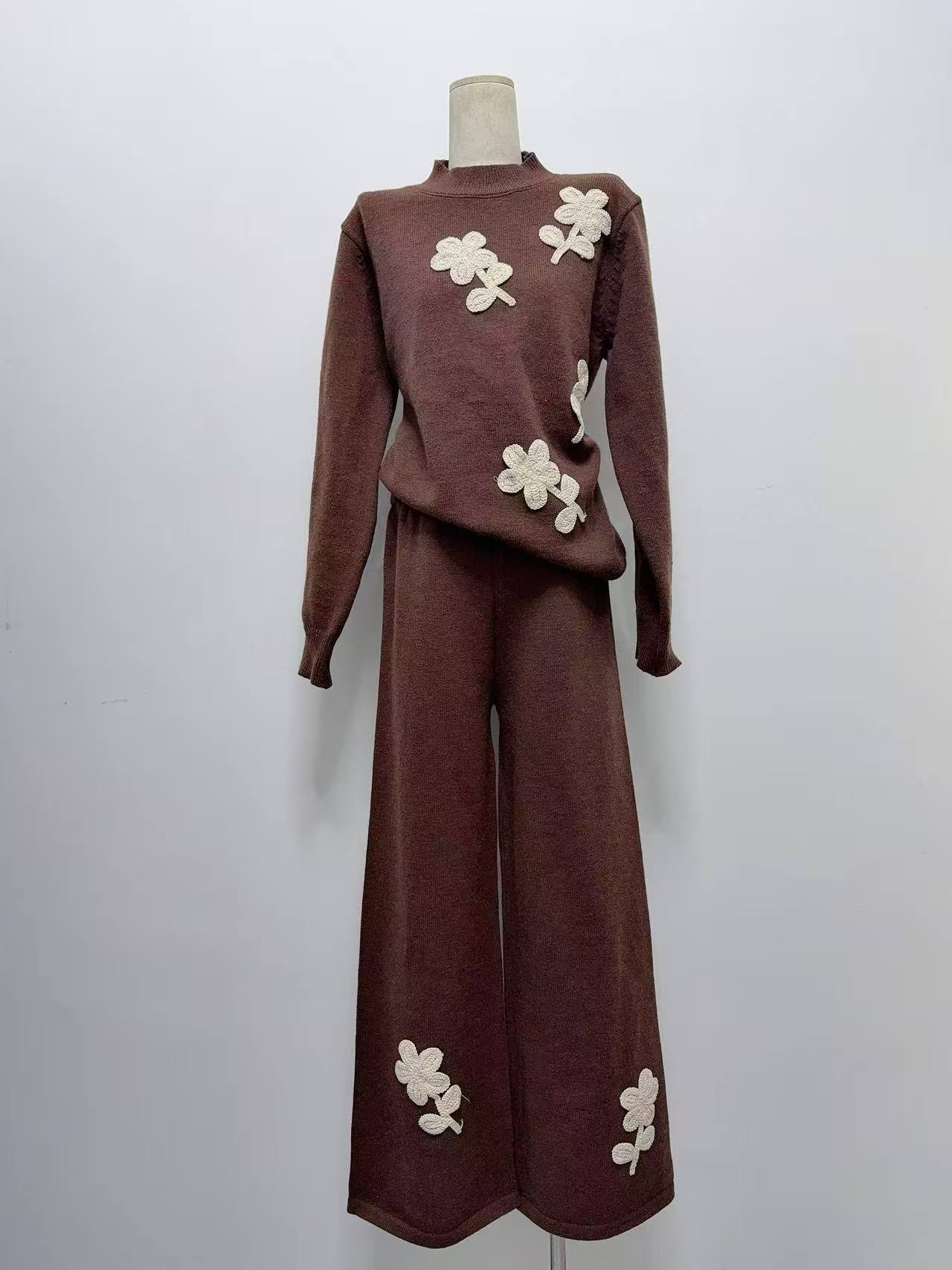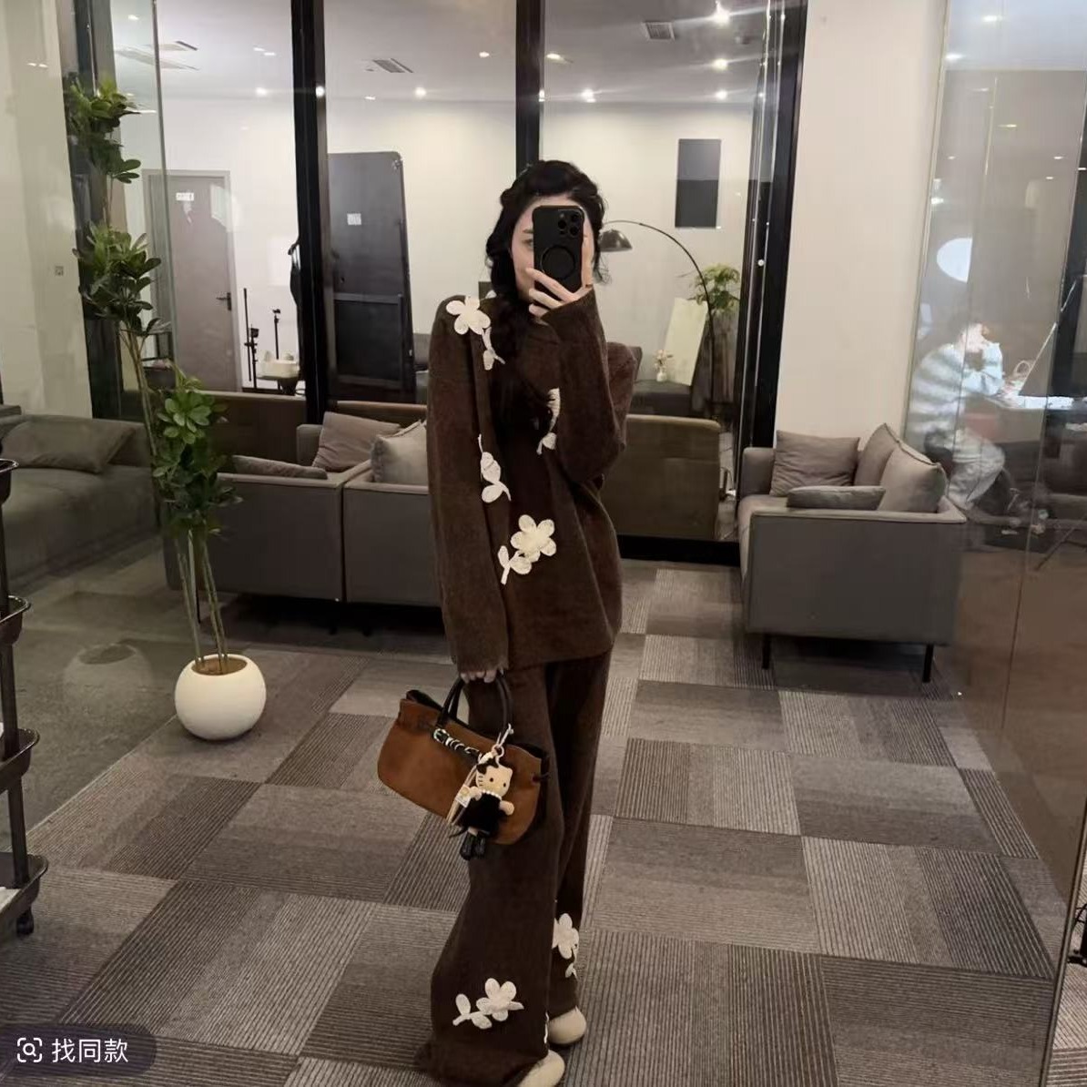 os&oneshow 루즈핏 슬림해 보이는 캐주얼 느긋한 바람 자수 스웨터 와이드 레그 팬츠 겨울 세트 여성 투피스 세트