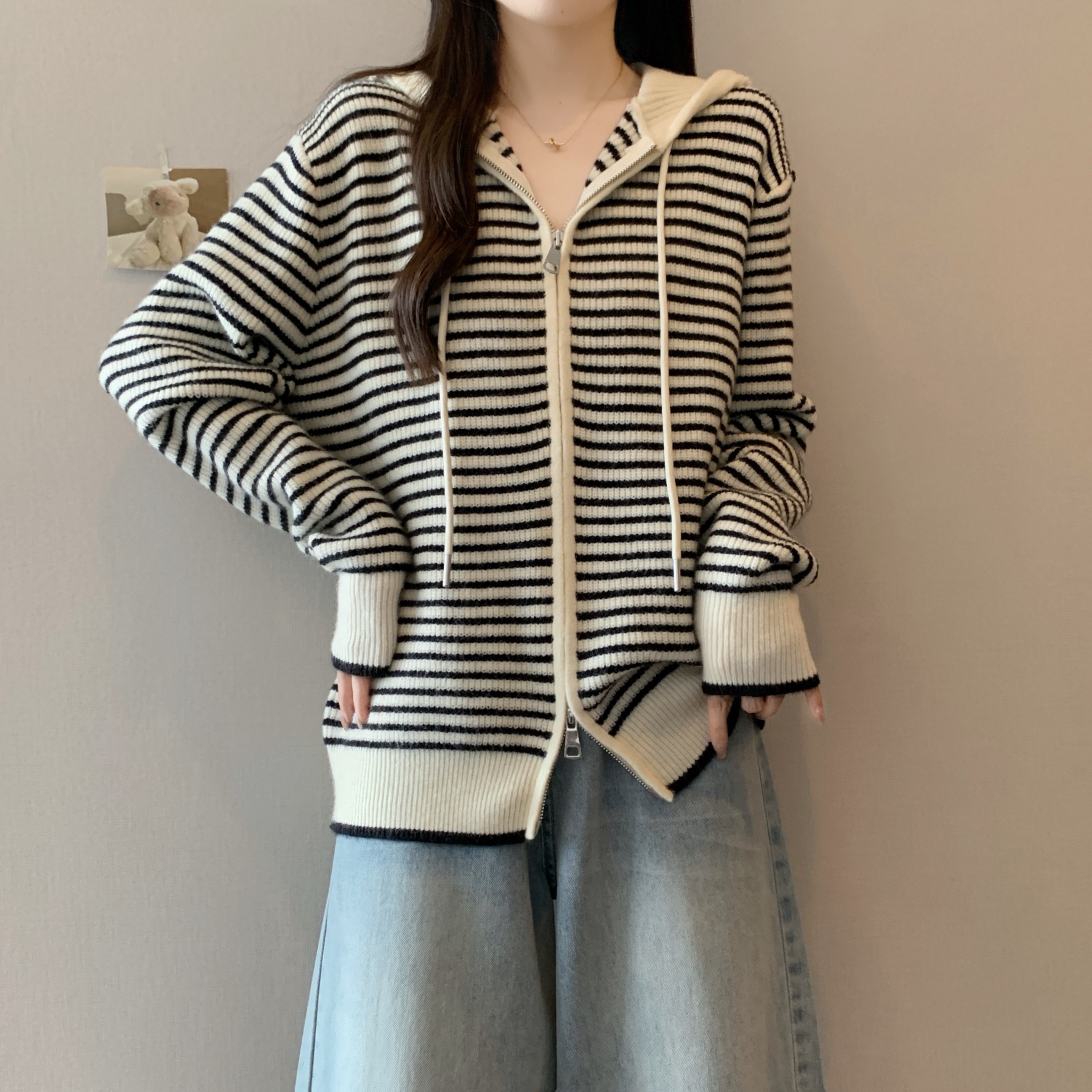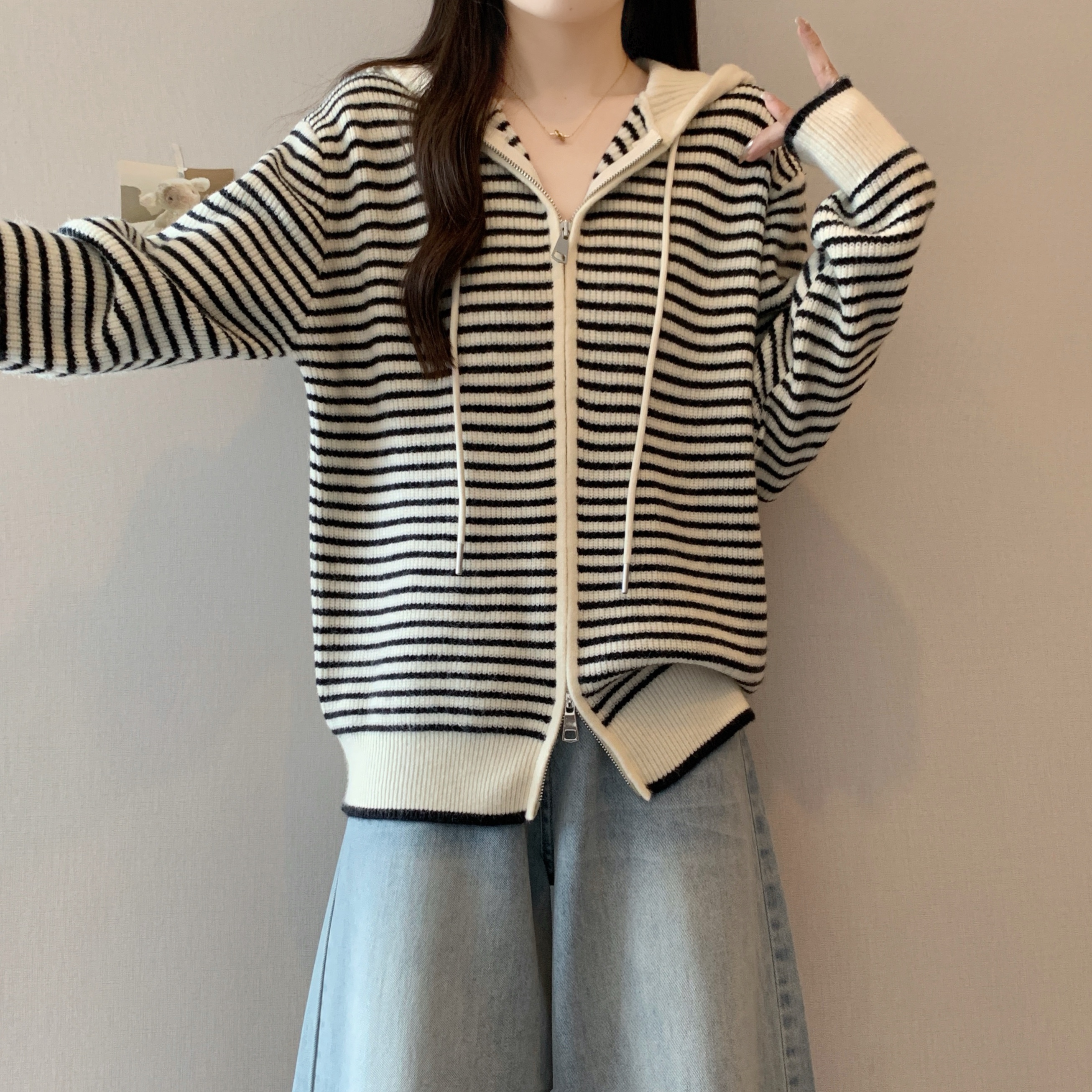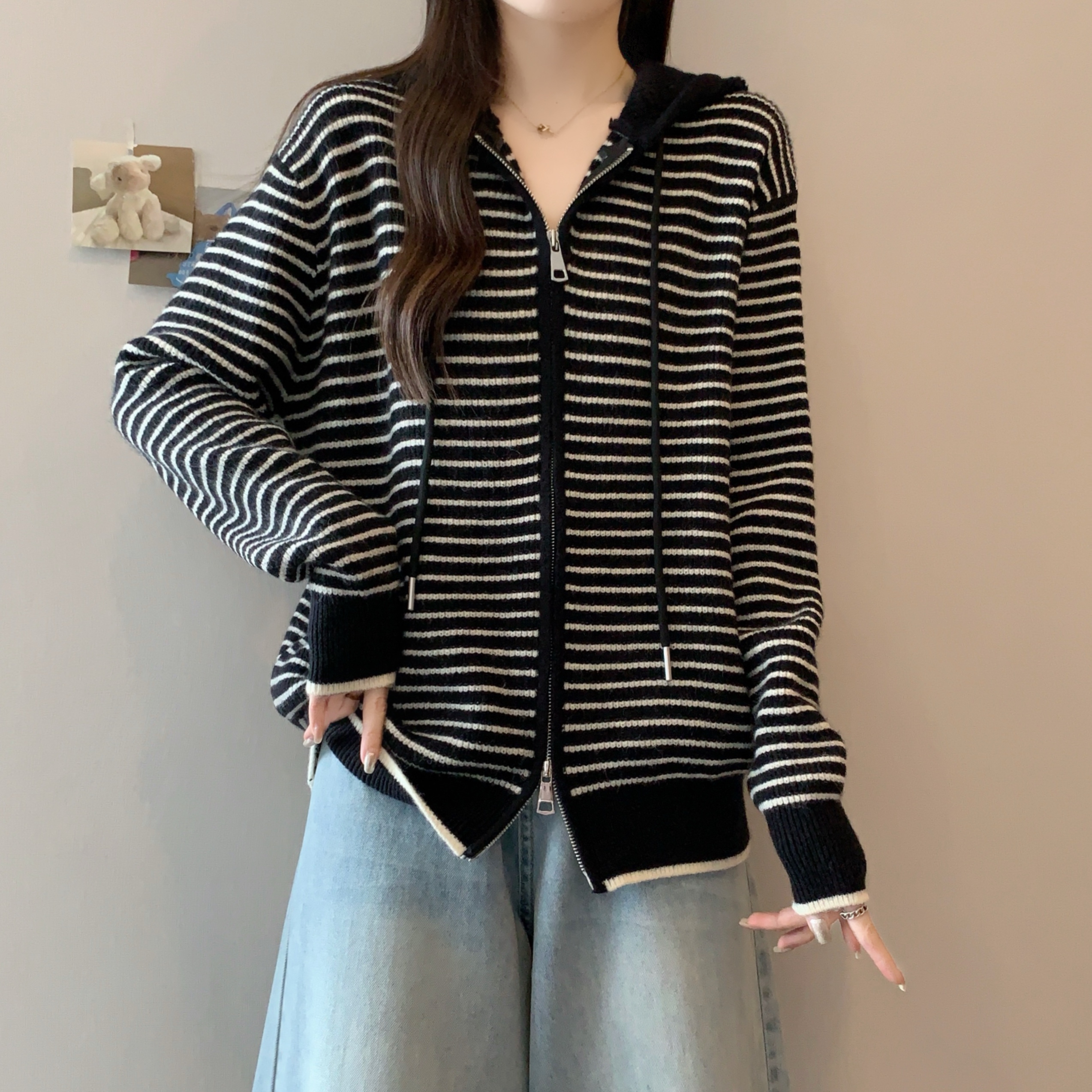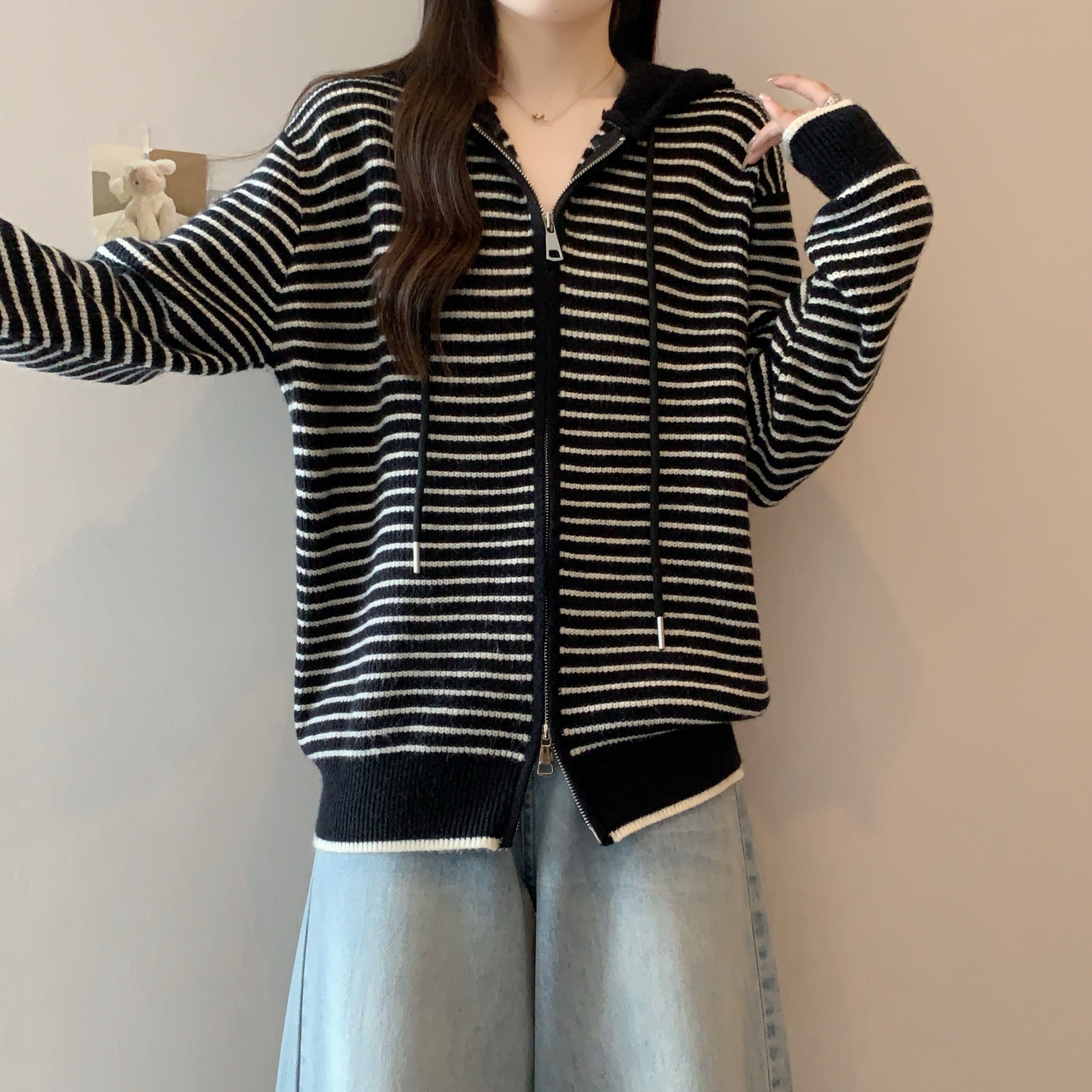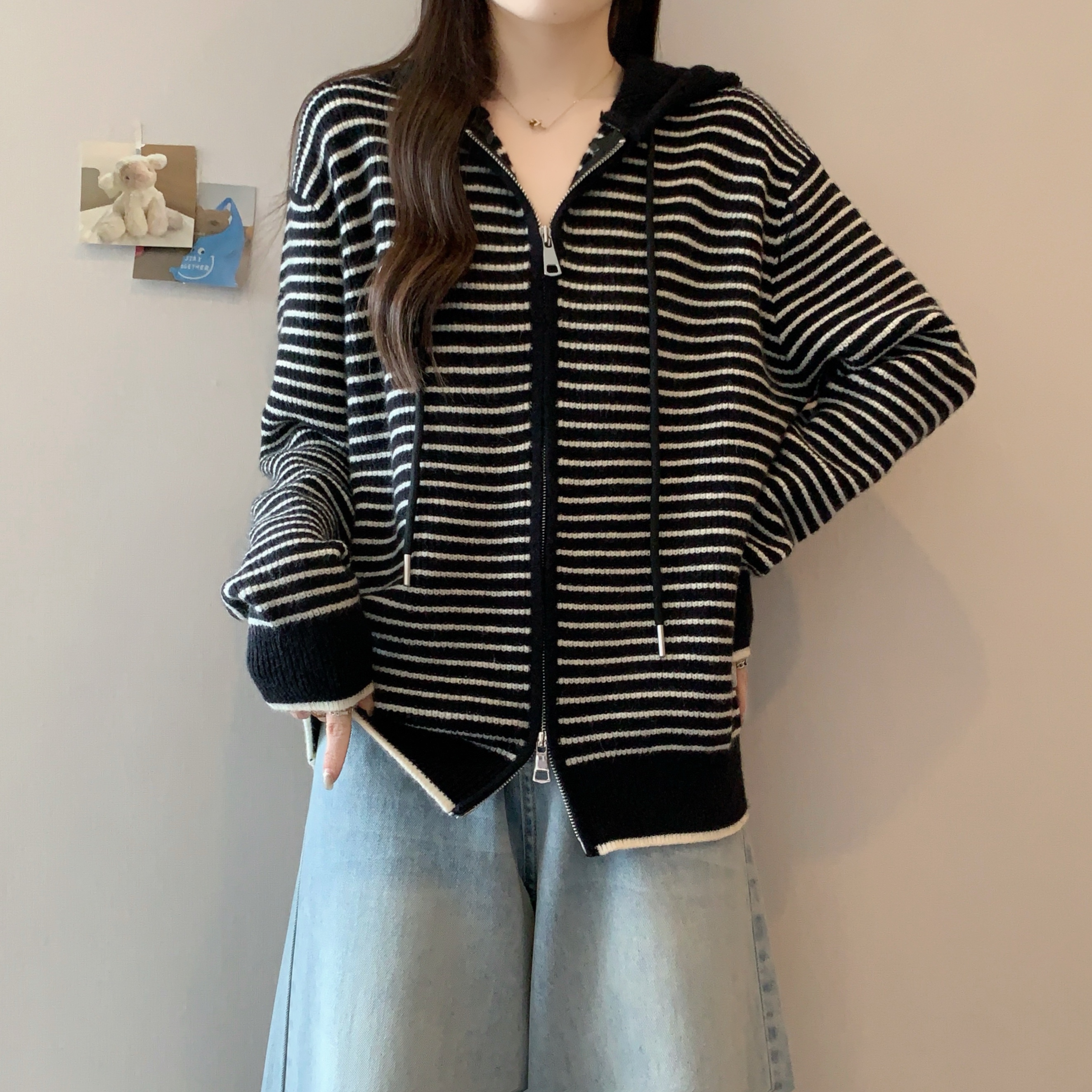 실사 빅 사이즈 후드 더블 머리 지퍼 니트 오픈 가디건 2025 년 가을 한국 스타일 루즈핏 슬림해 보이는 디자인 센스 스웨터