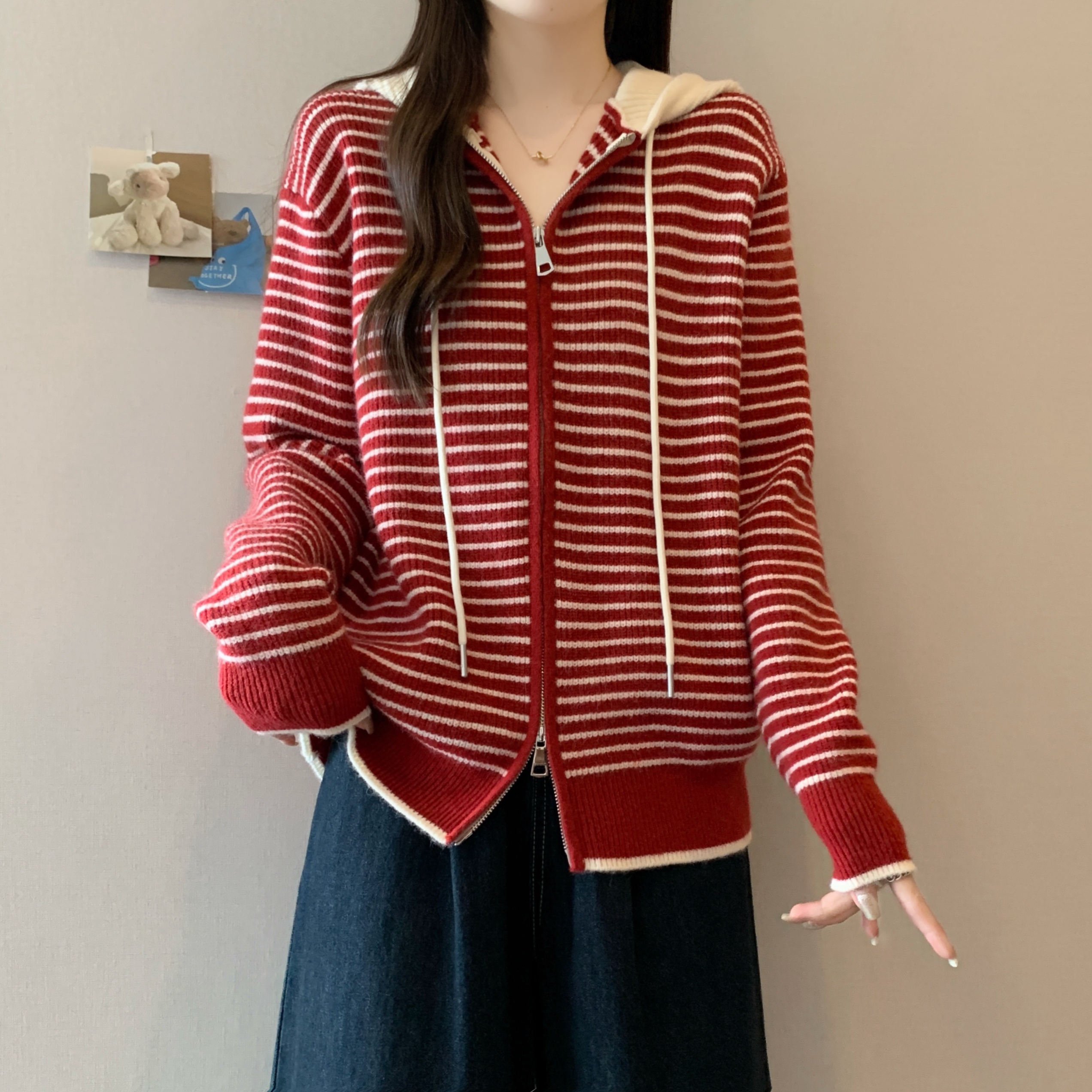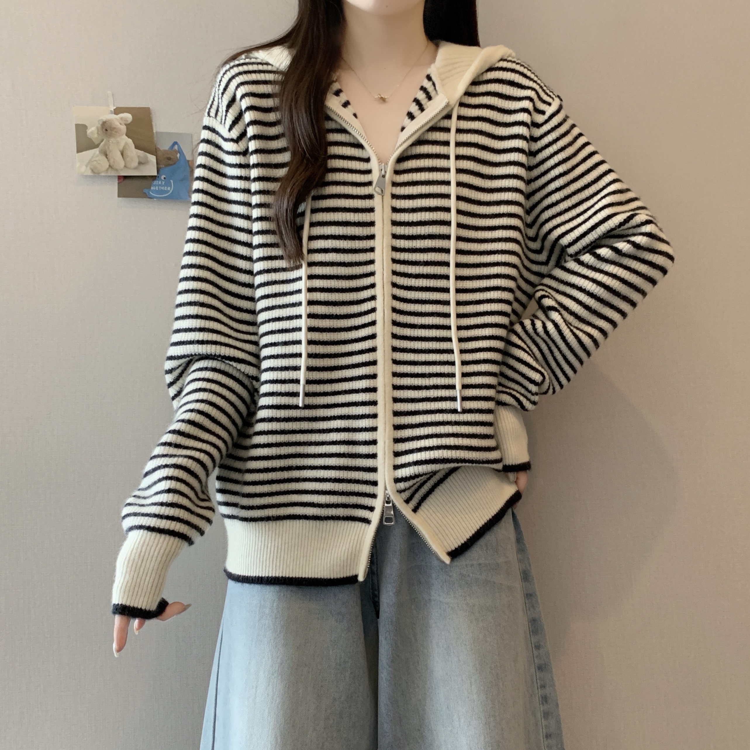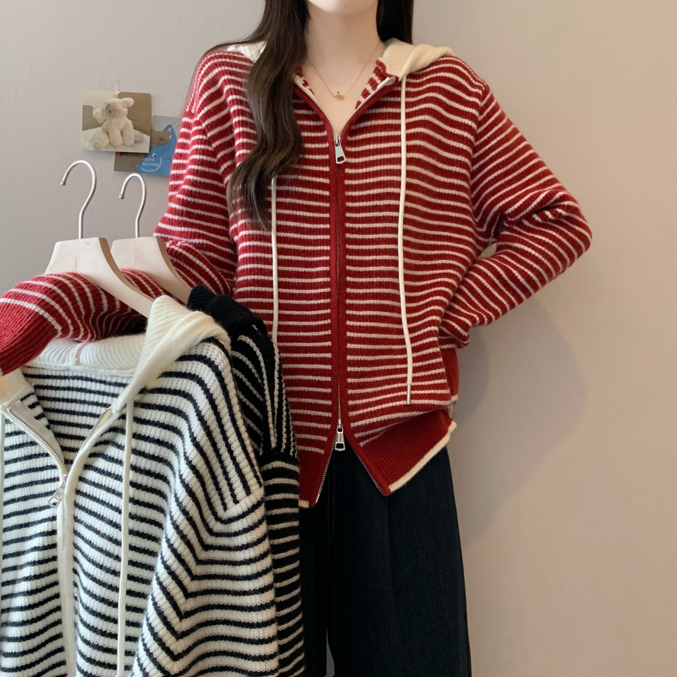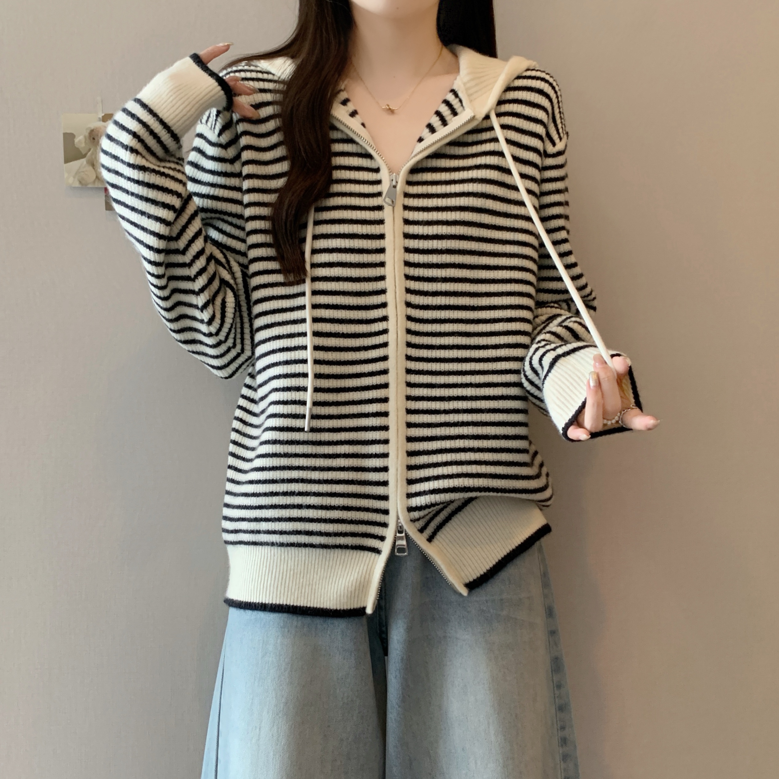 실사 빅 사이즈 후드 더블 머리 지퍼 니트 오픈 가디건 2025 년 가을 한국 스타일 루즈핏 슬림해 보이는 디자인 센스 스웨터