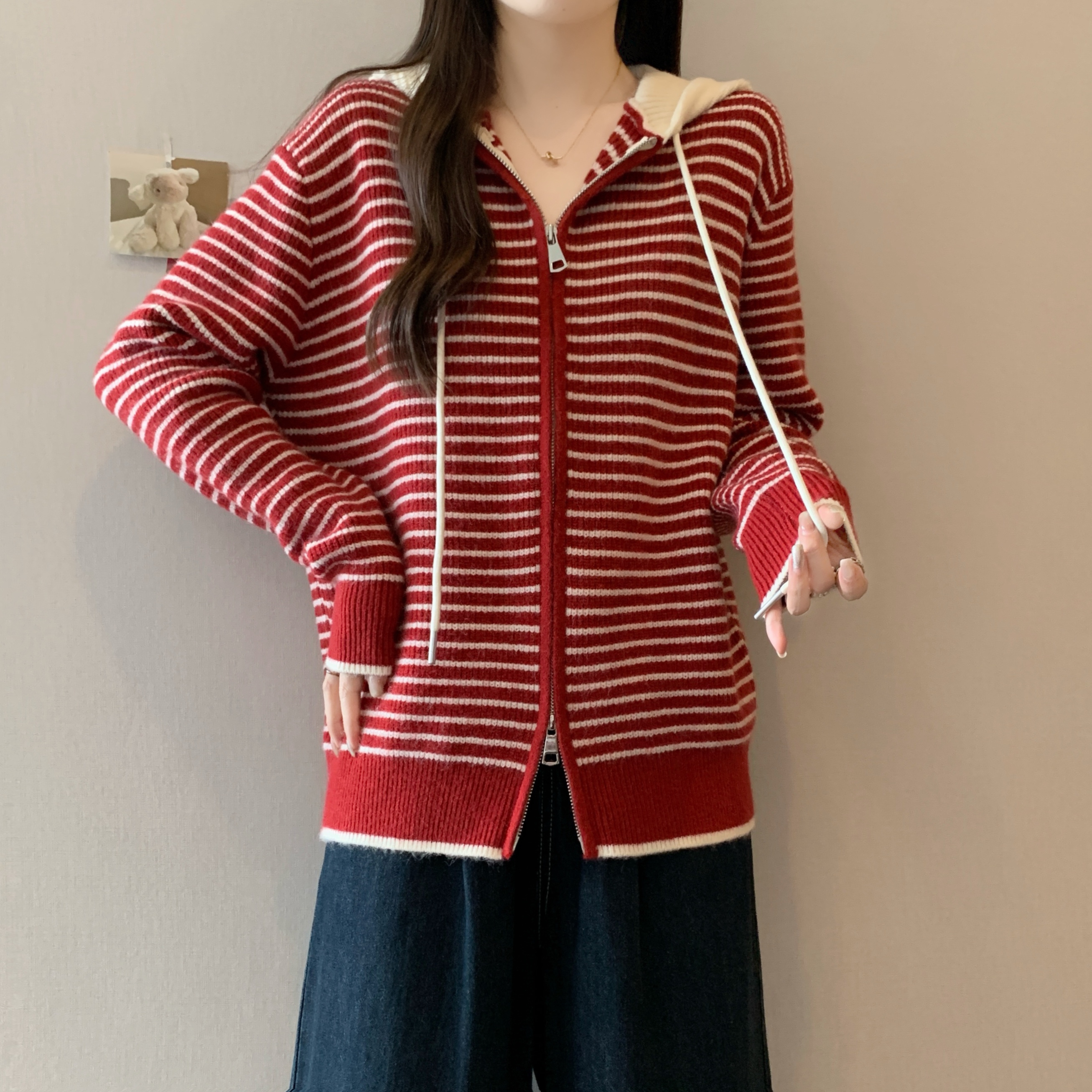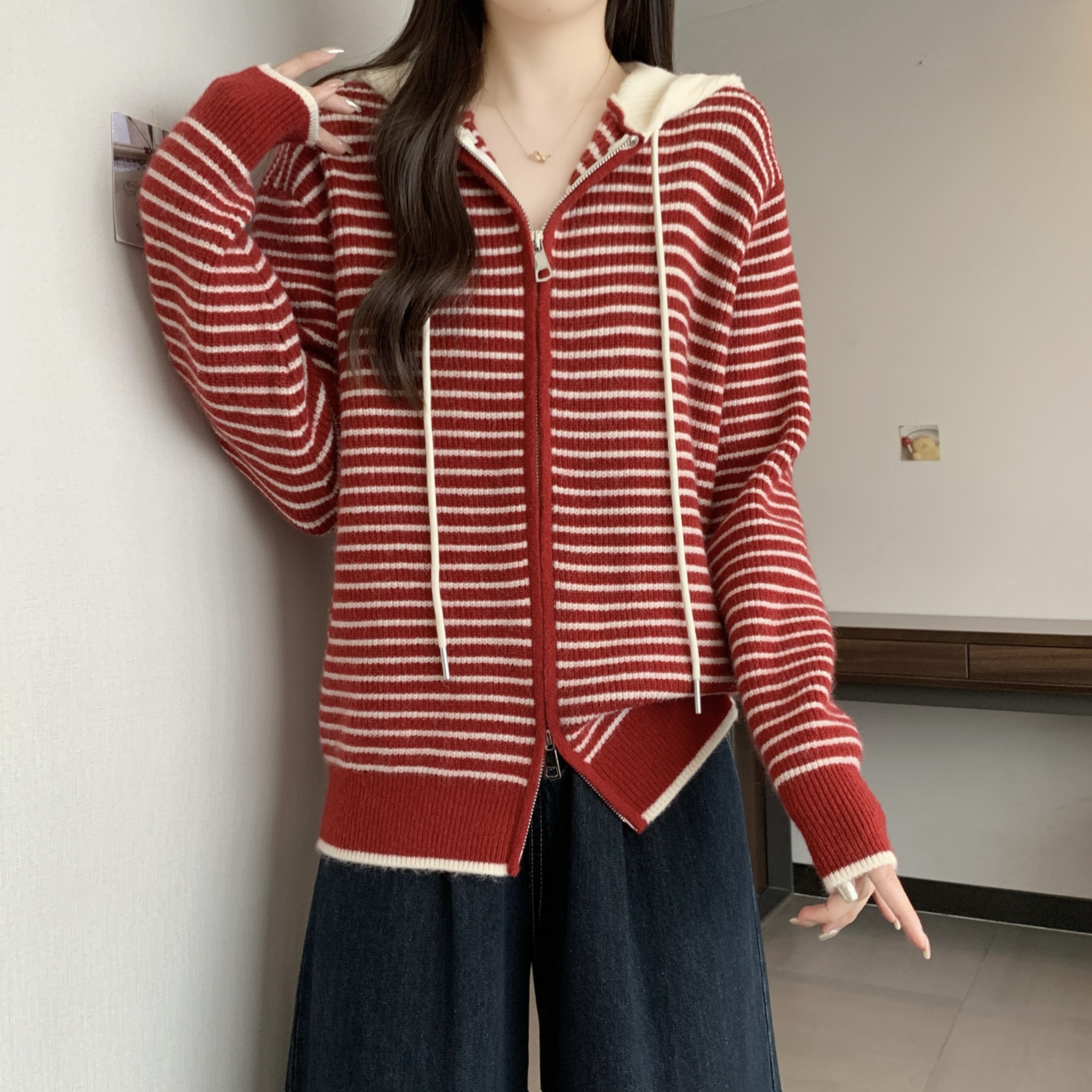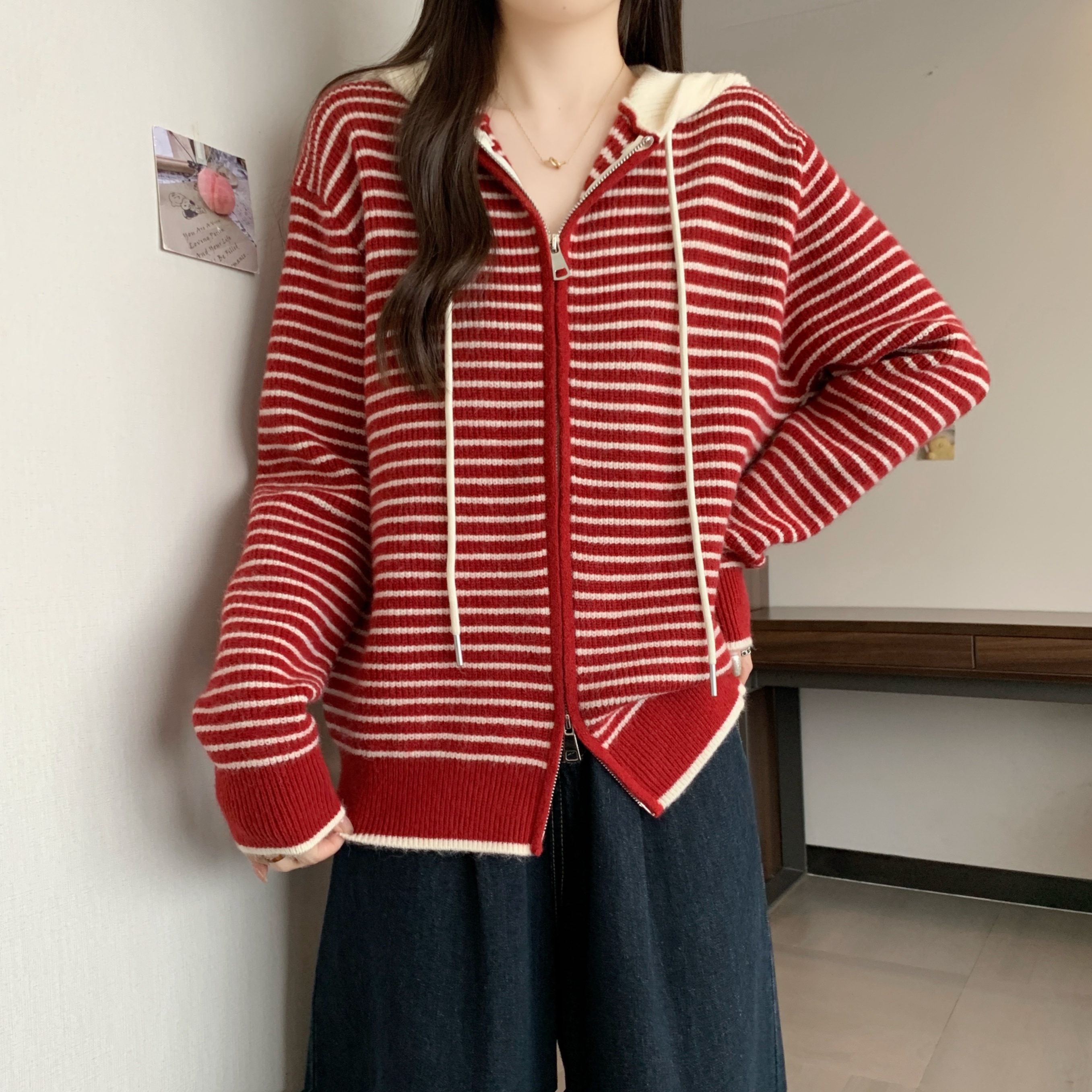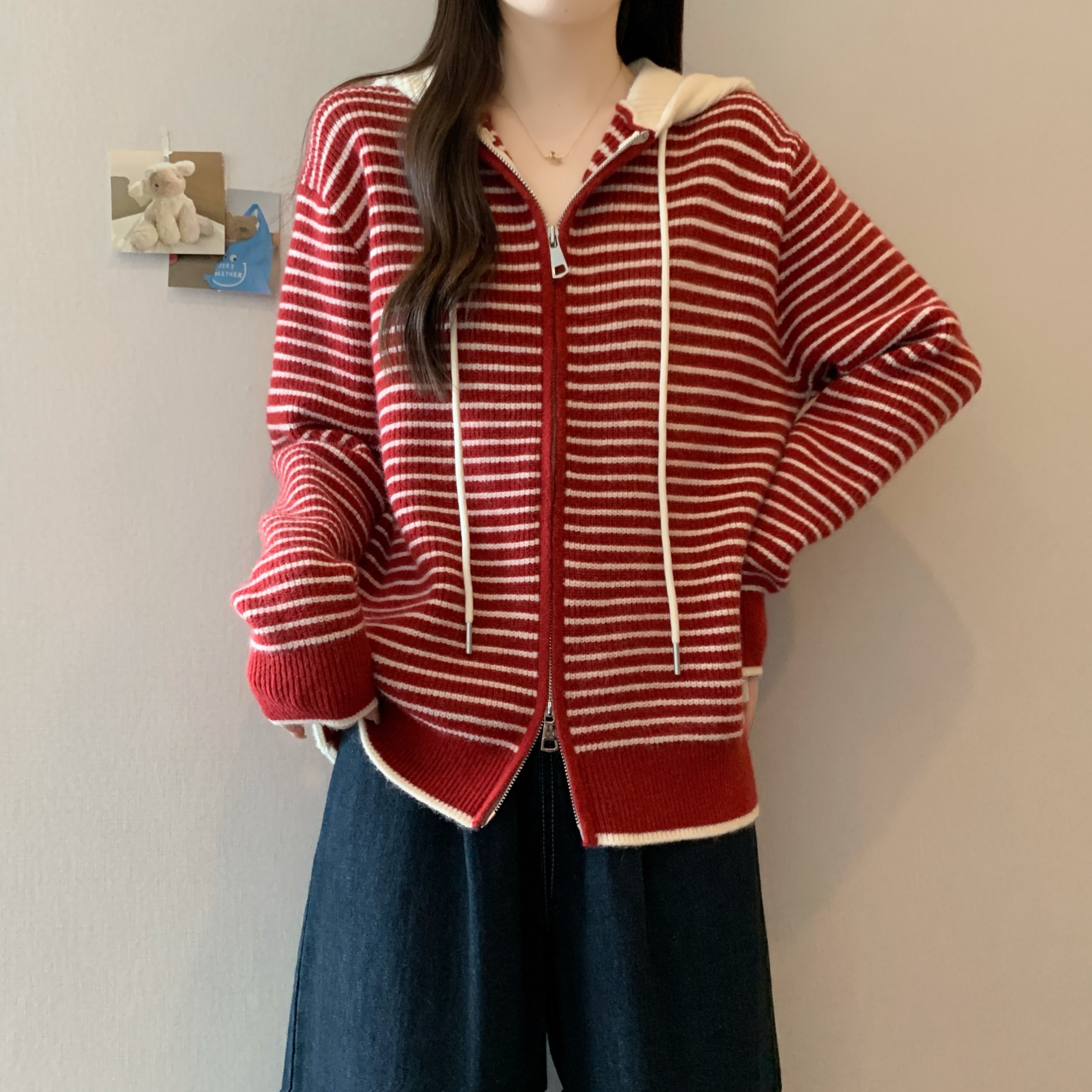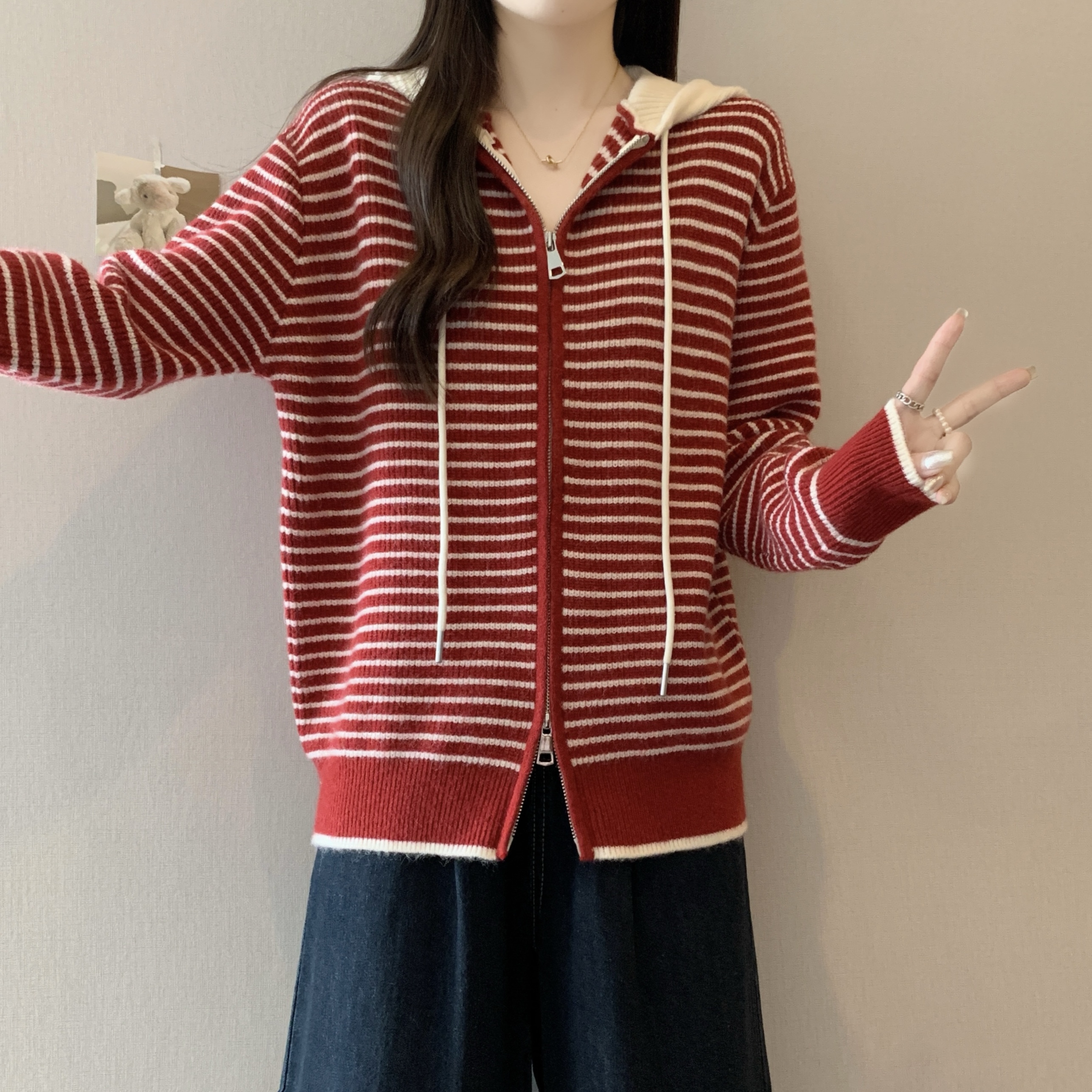 실사 빅 사이즈 후드 더블 머리 지퍼 니트 오픈 가디건 2025 년 가을 한국 스타일 루즈핏 슬림해 보이는 디자인 센스 스웨터