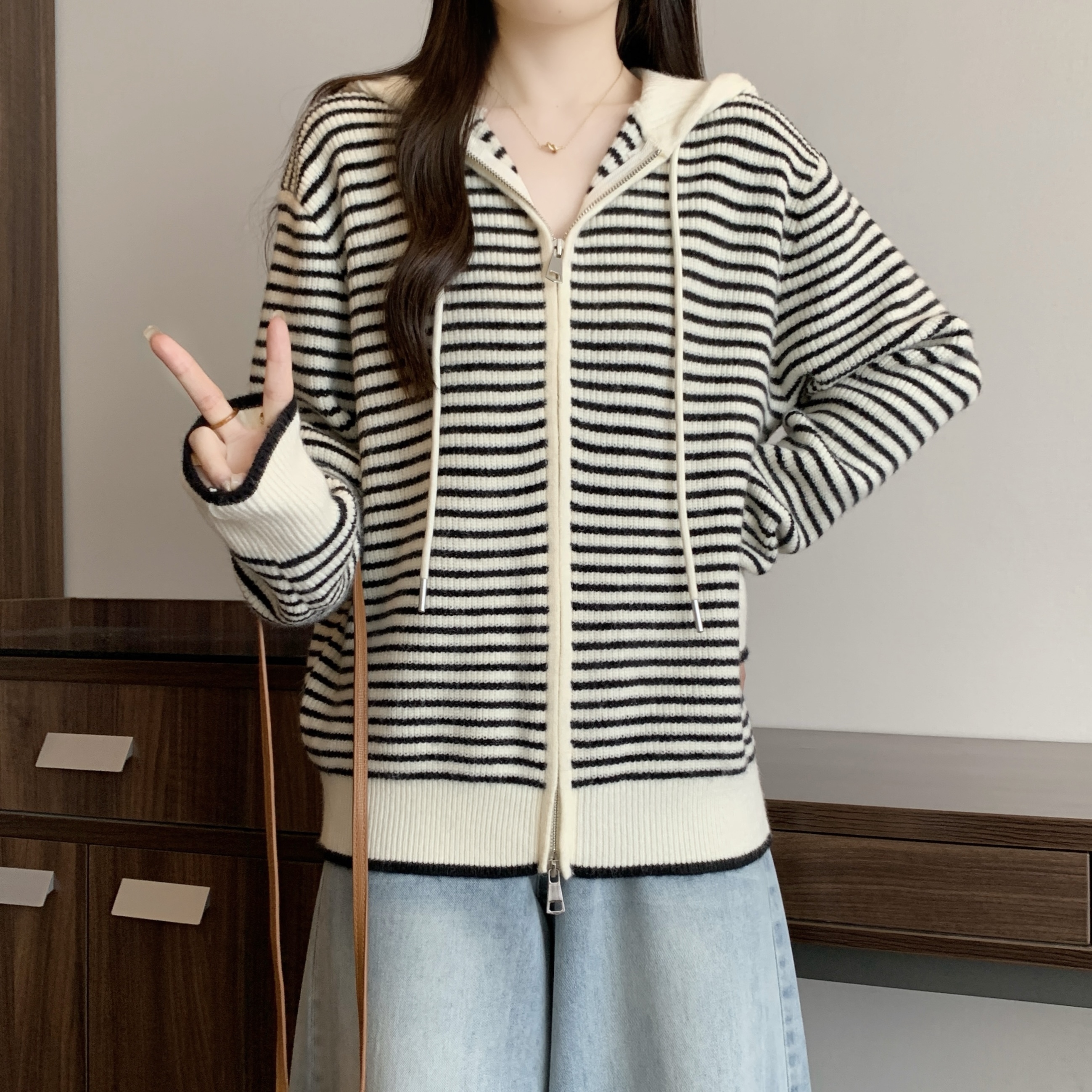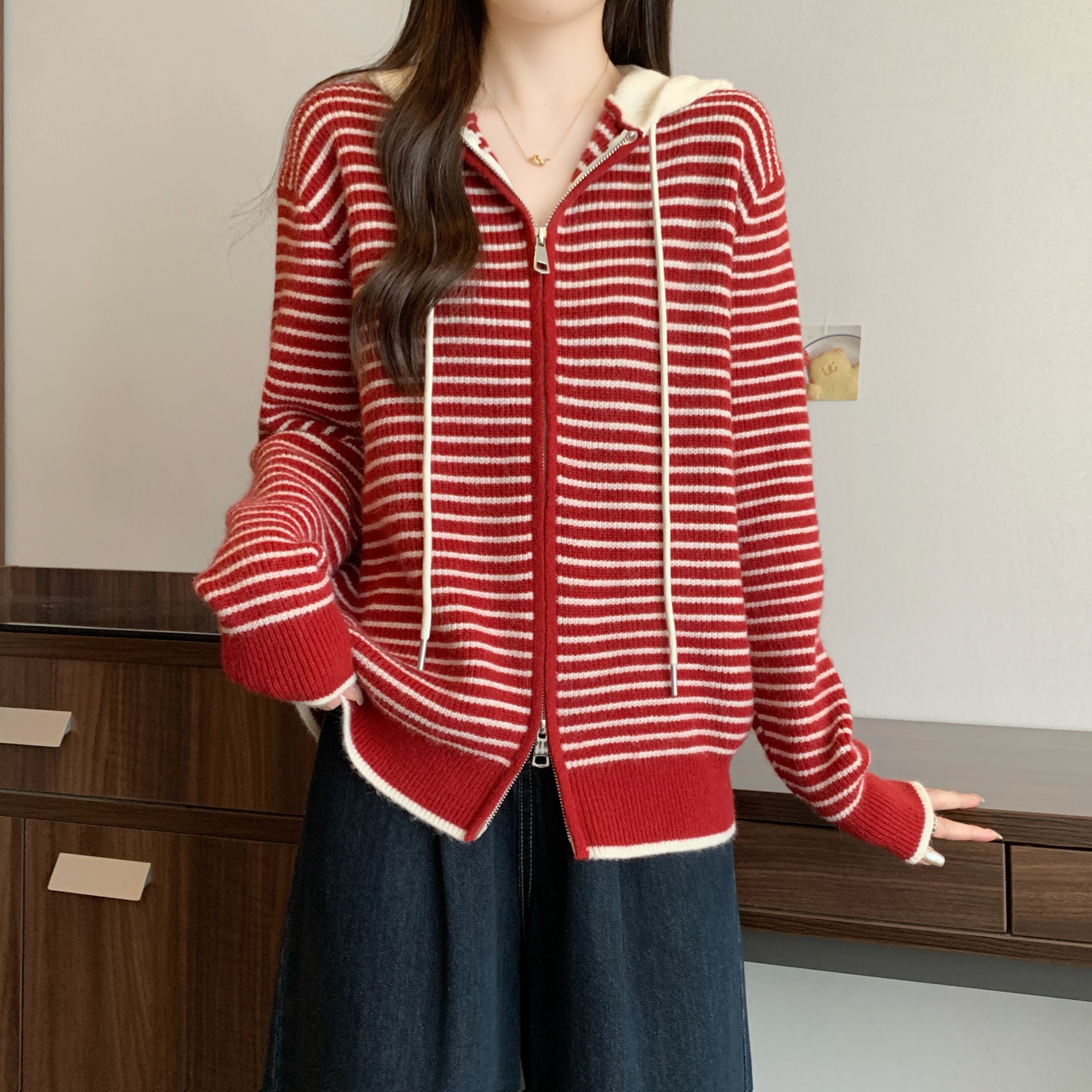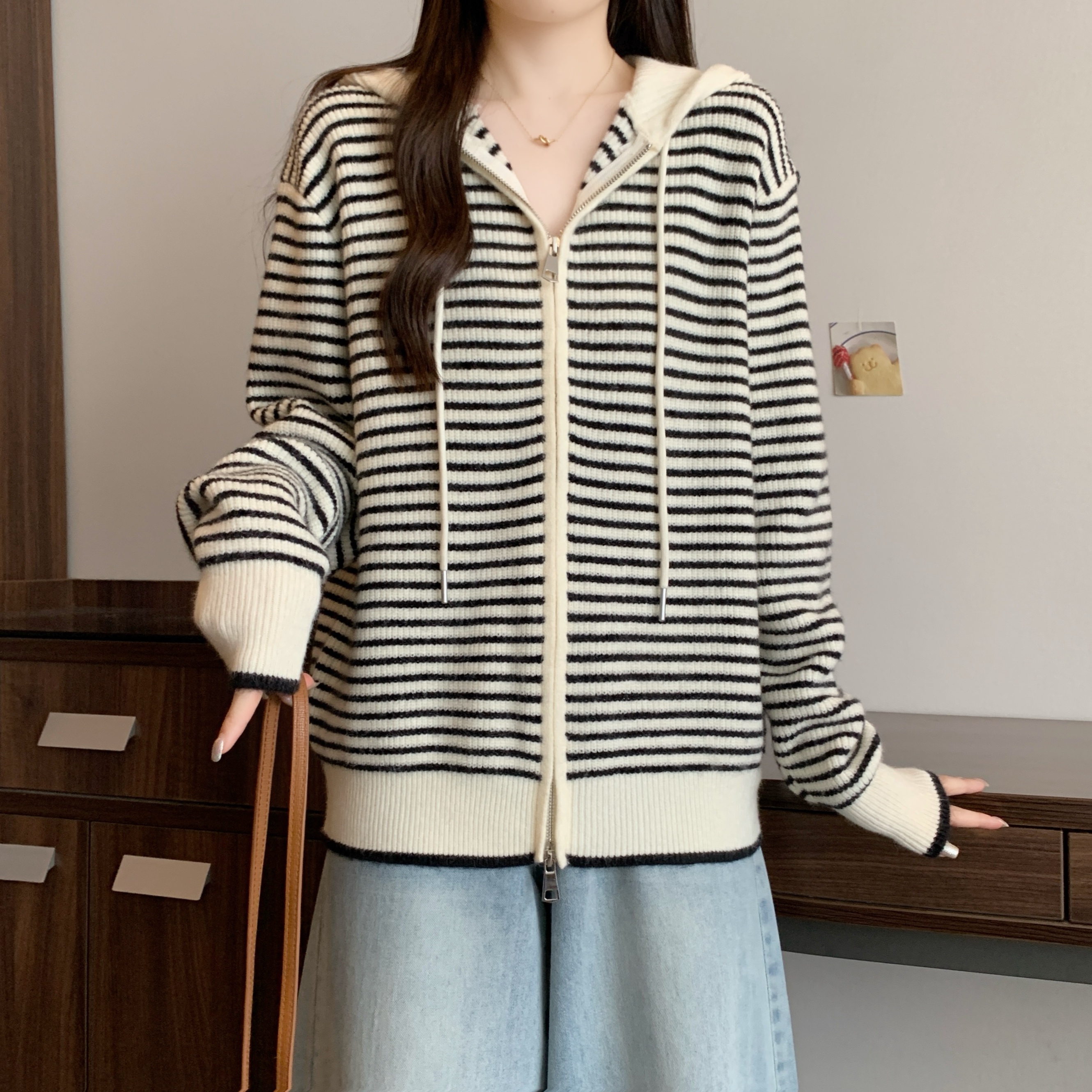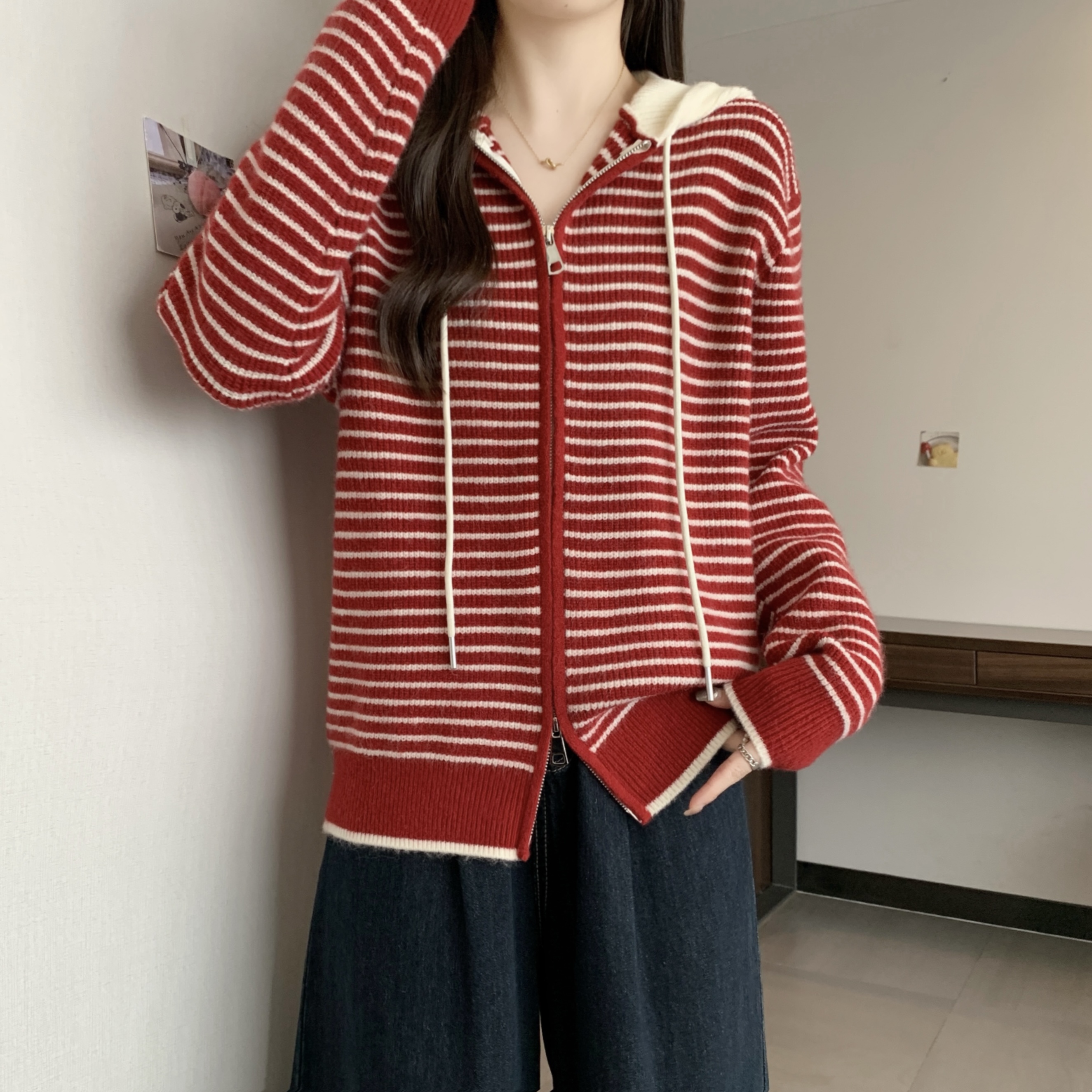 실사 빅 사이즈 후드 더블 머리 지퍼 니트 오픈 가디건 2025 년 가을 한국 스타일 루즈핏 슬림해 보이는 디자인 센스 스웨터