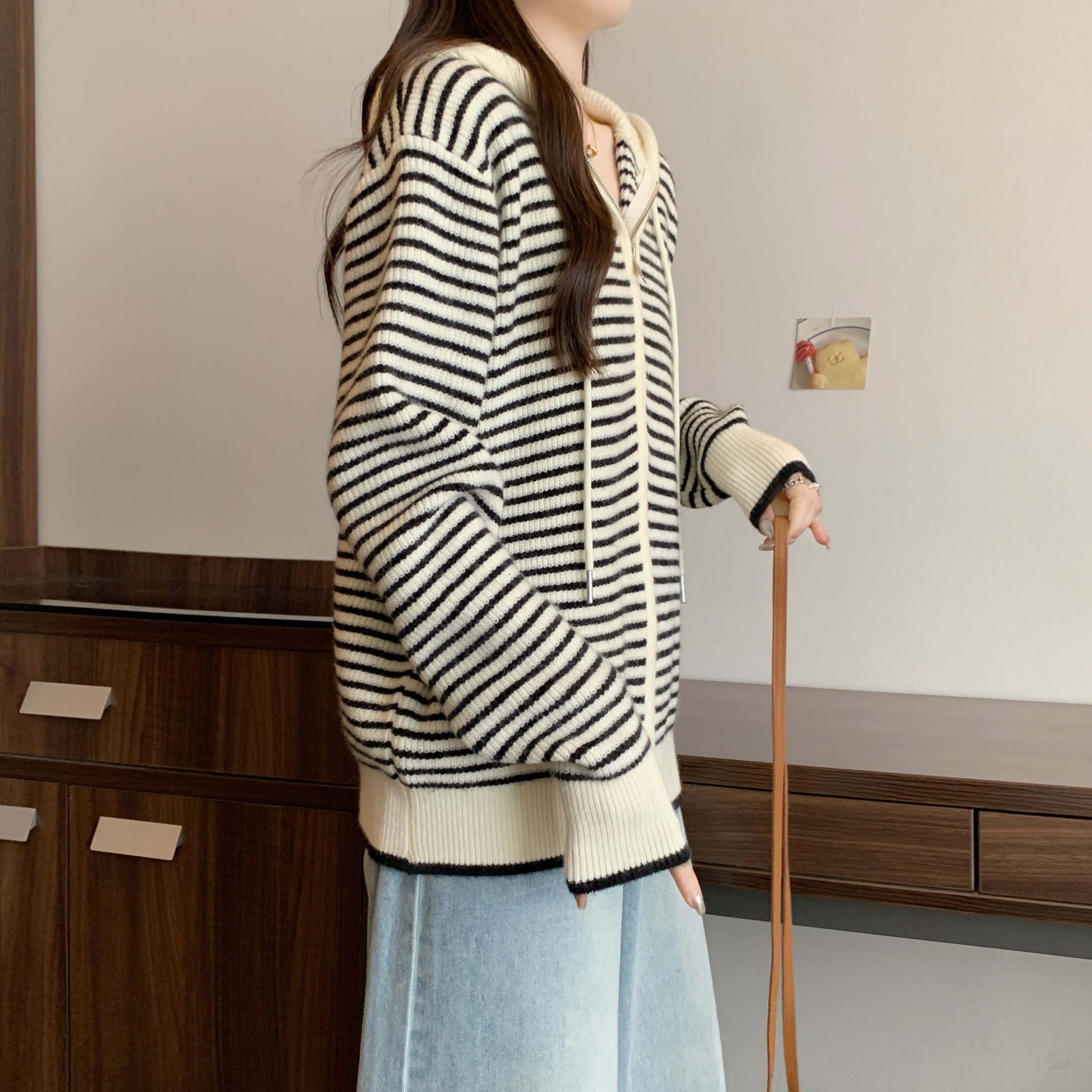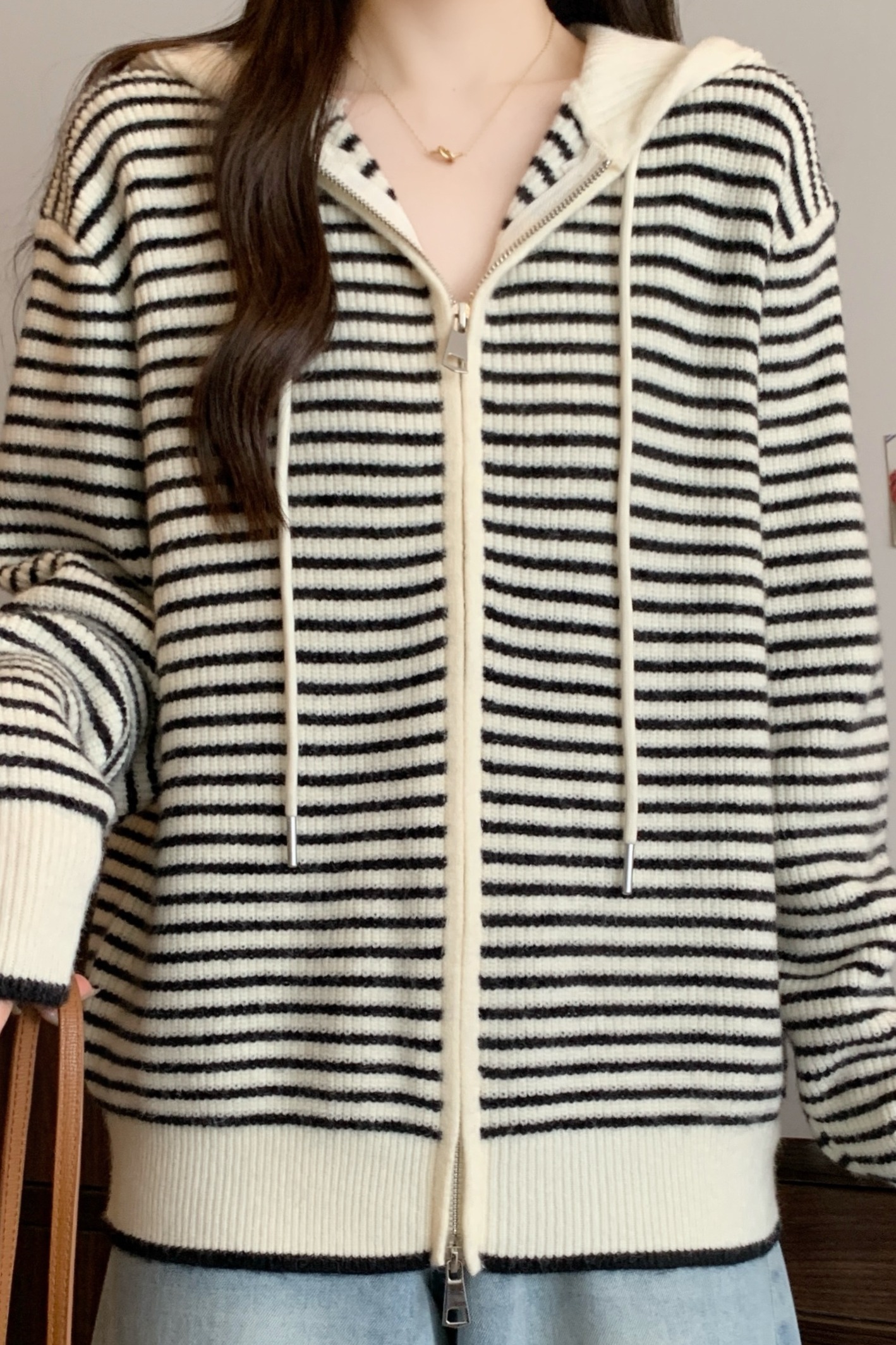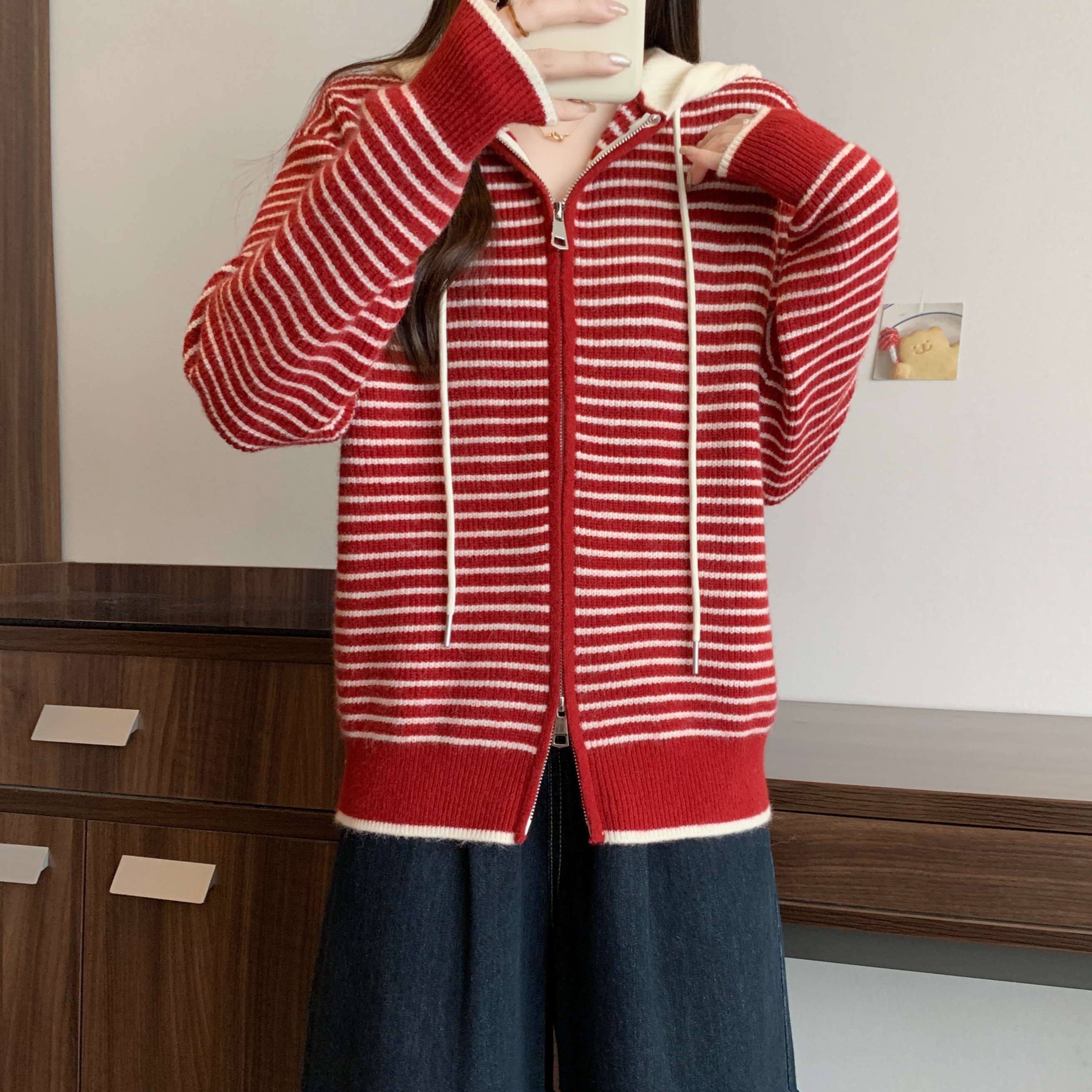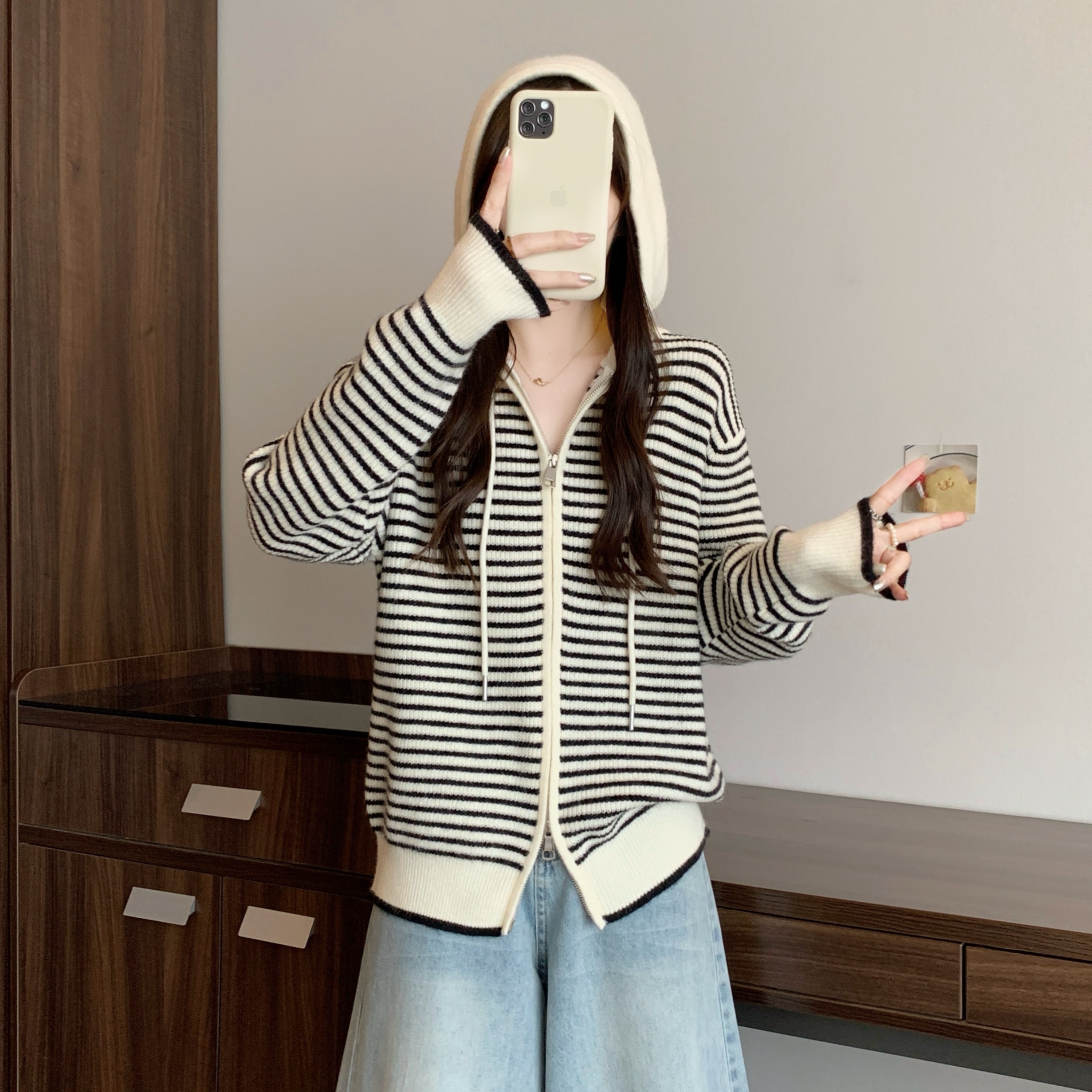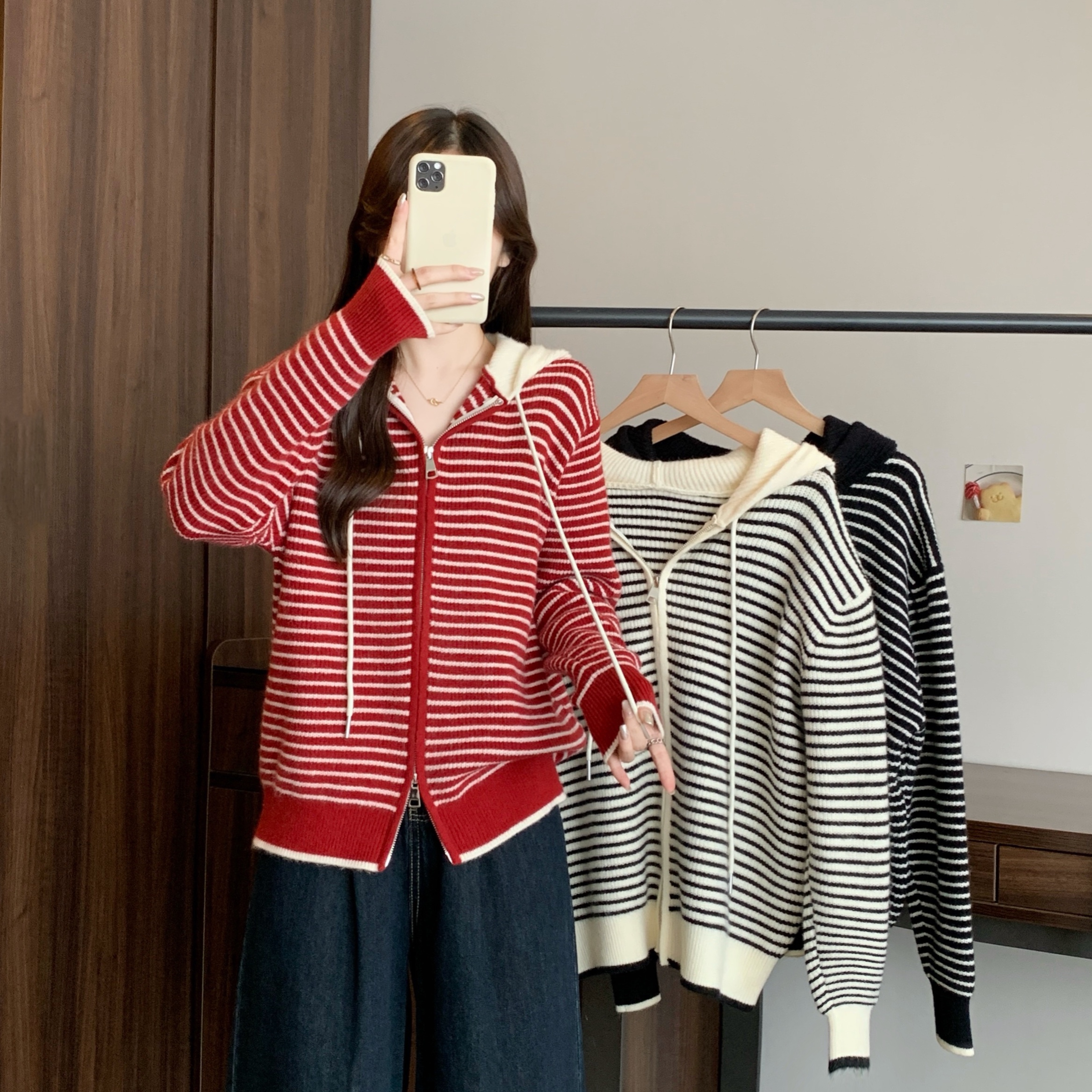 실사 빅 사이즈 후드 더블 머리 지퍼 니트 오픈 가디건 2025 년 가을 한국 스타일 루즈핏 슬림해 보이는 디자인 센스 스웨터