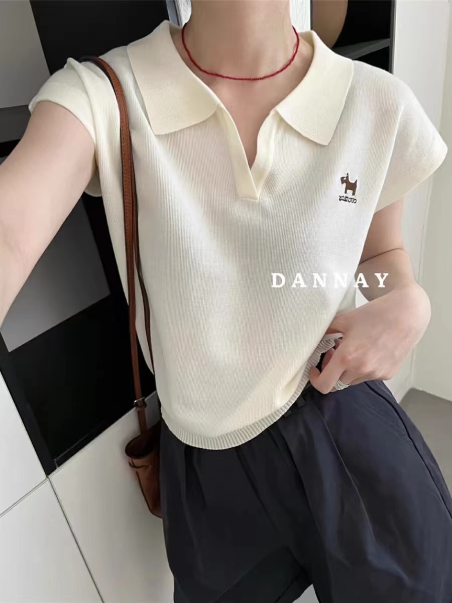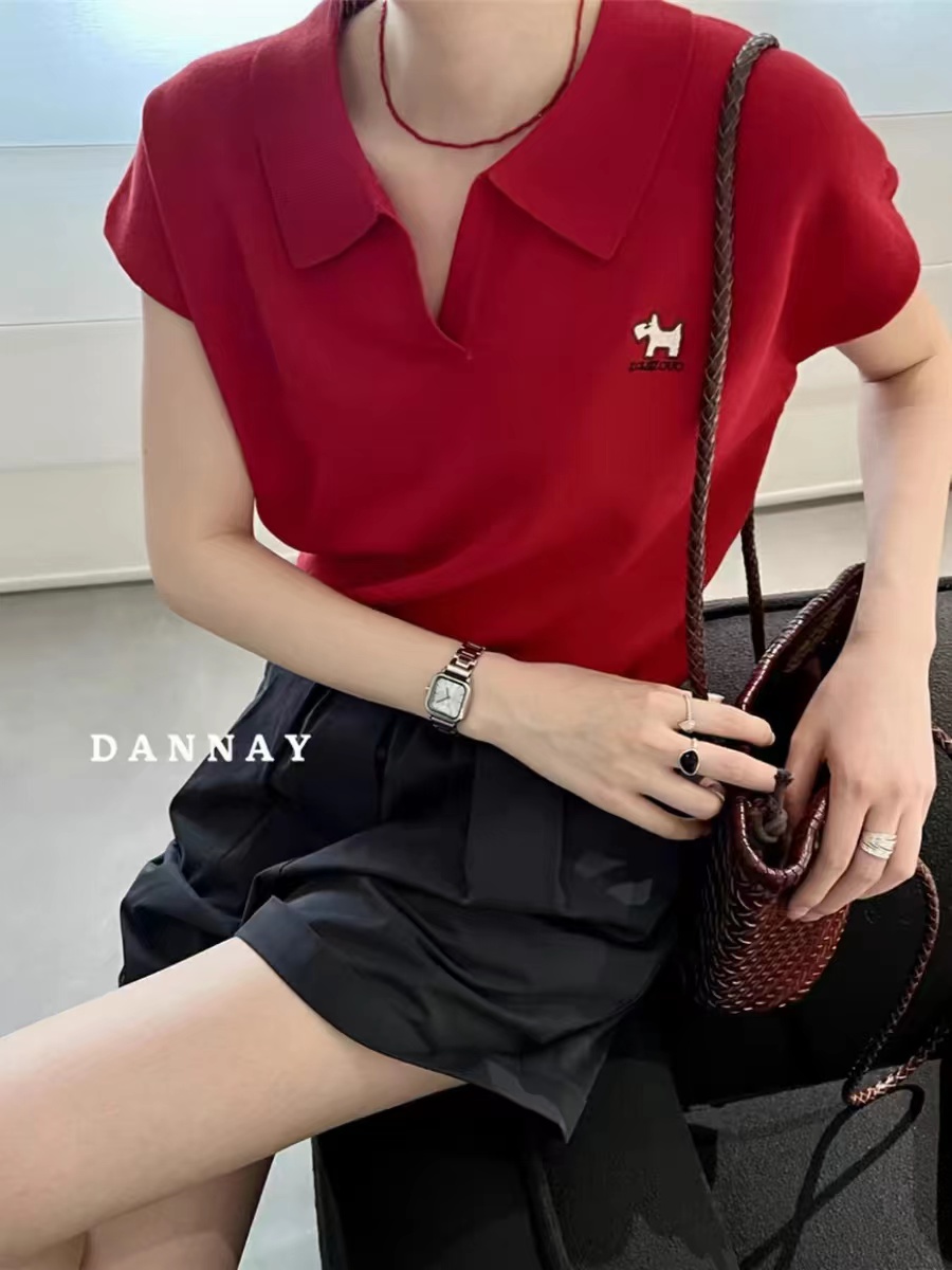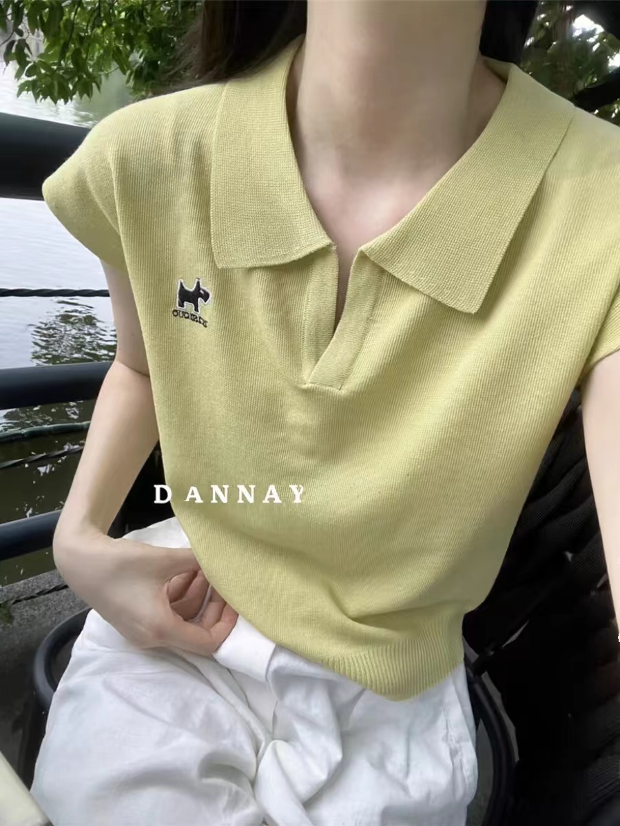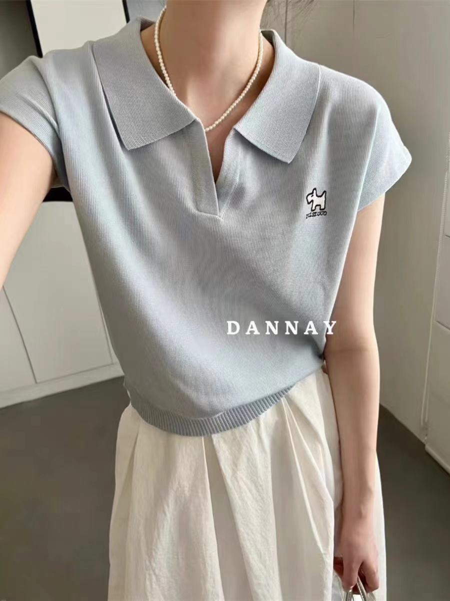 POLO 칼라 얼음 실크 자수 강아지 반팔 티셔츠 여성 2026 여름 얇은 스타일 V넥 쇼트 스타일 니트 작은 날다 소매 맨위