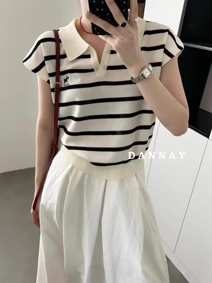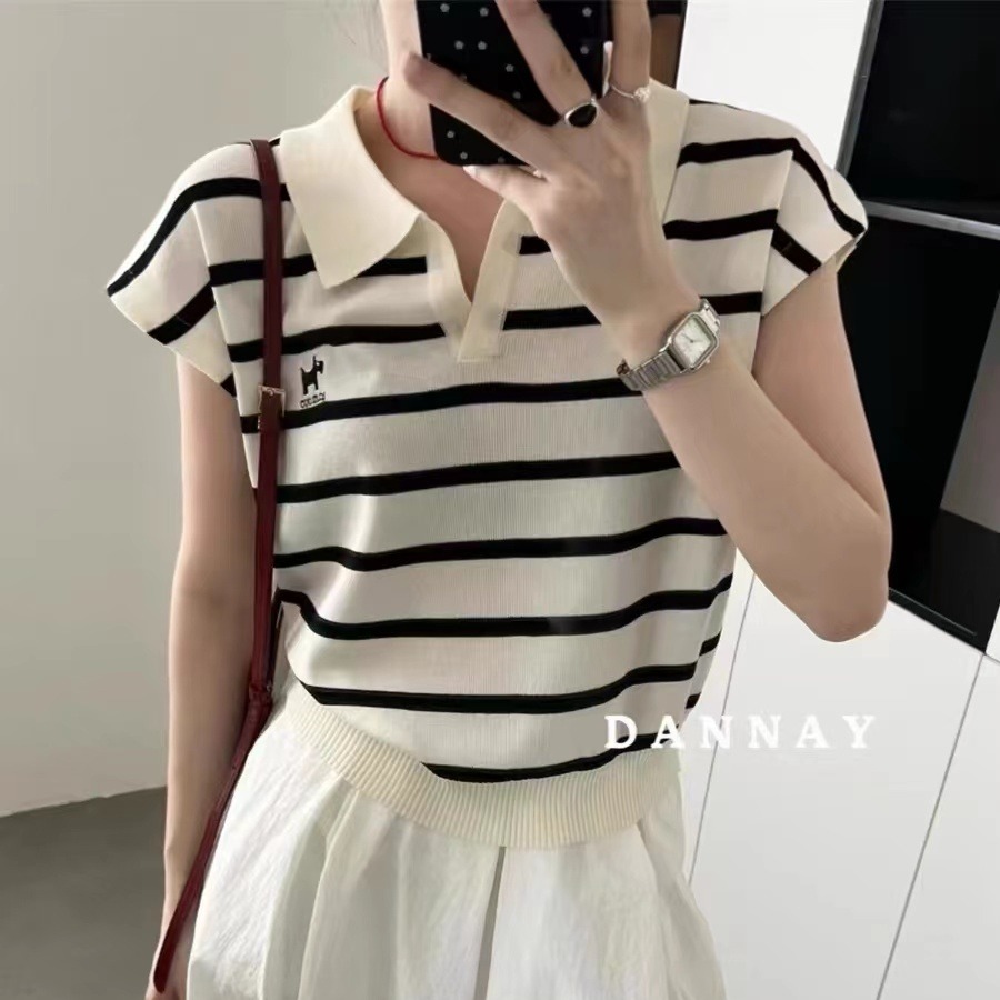 프랑스식 홀로우 아웃 작은 셔츠 톰 글 래 원인 블루 POLO 칼라 니트 얼음 실크 반팔 티셔츠 여성 여름 쇼트 스타일 긍정적 인 어깨 의류