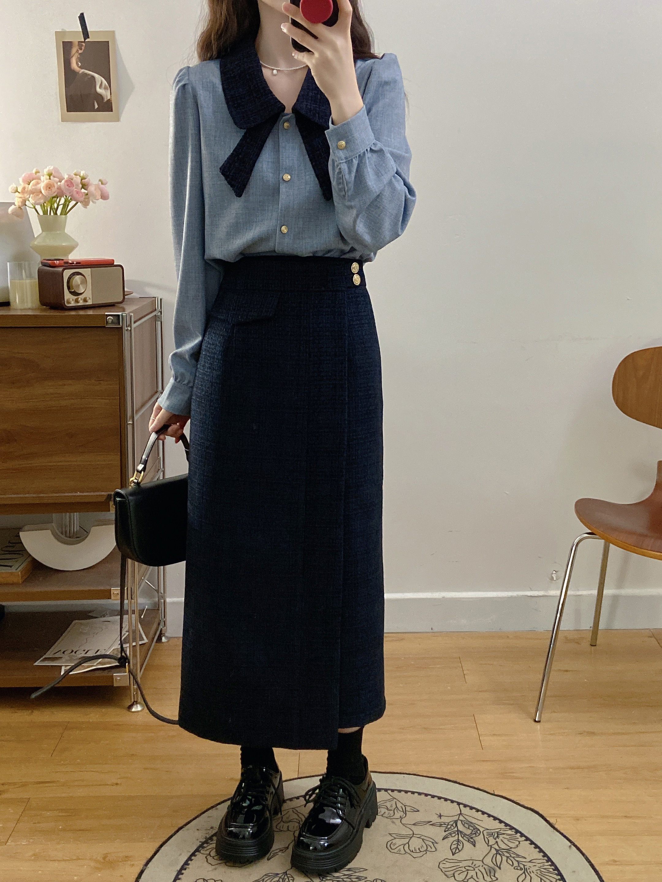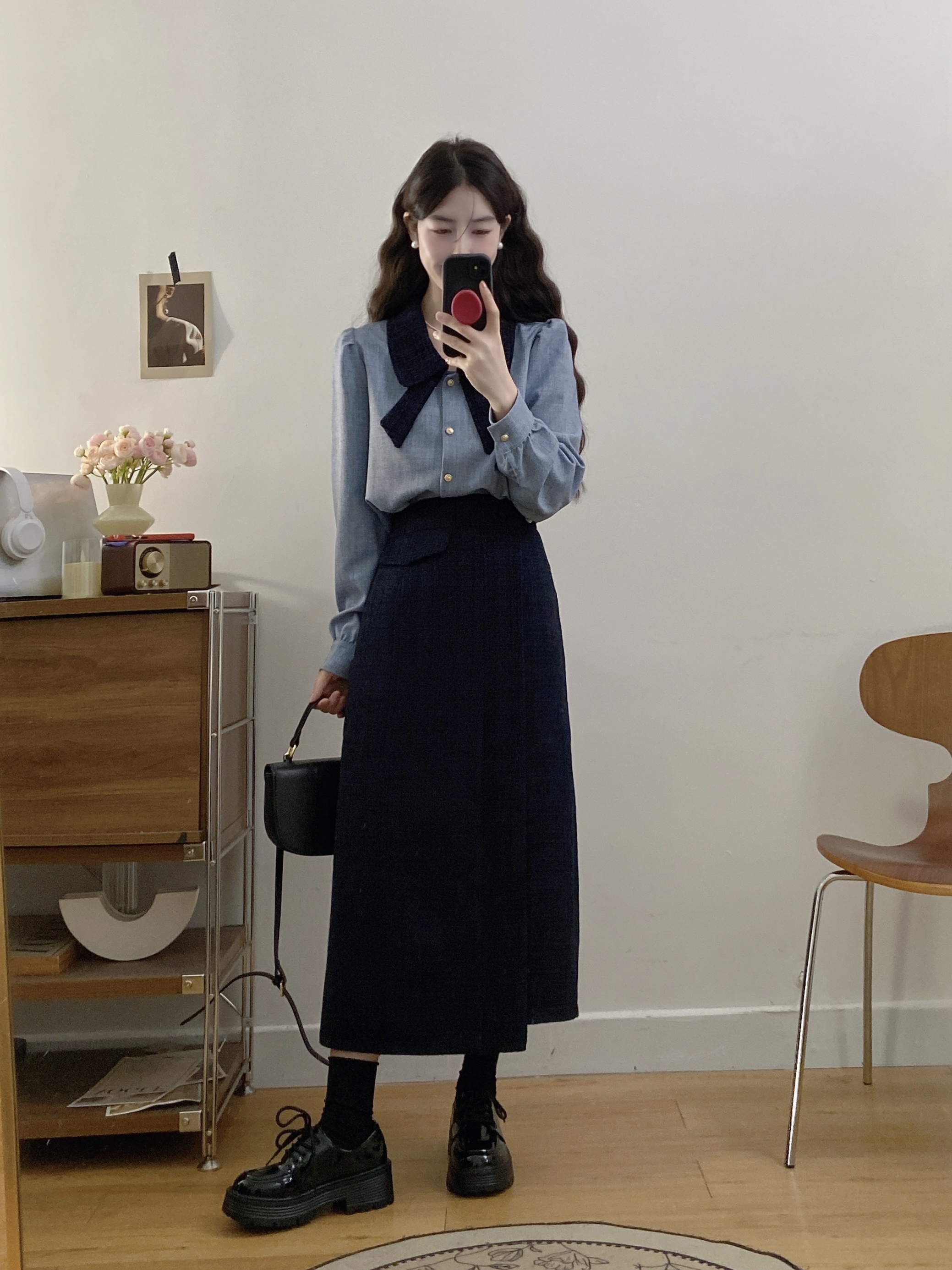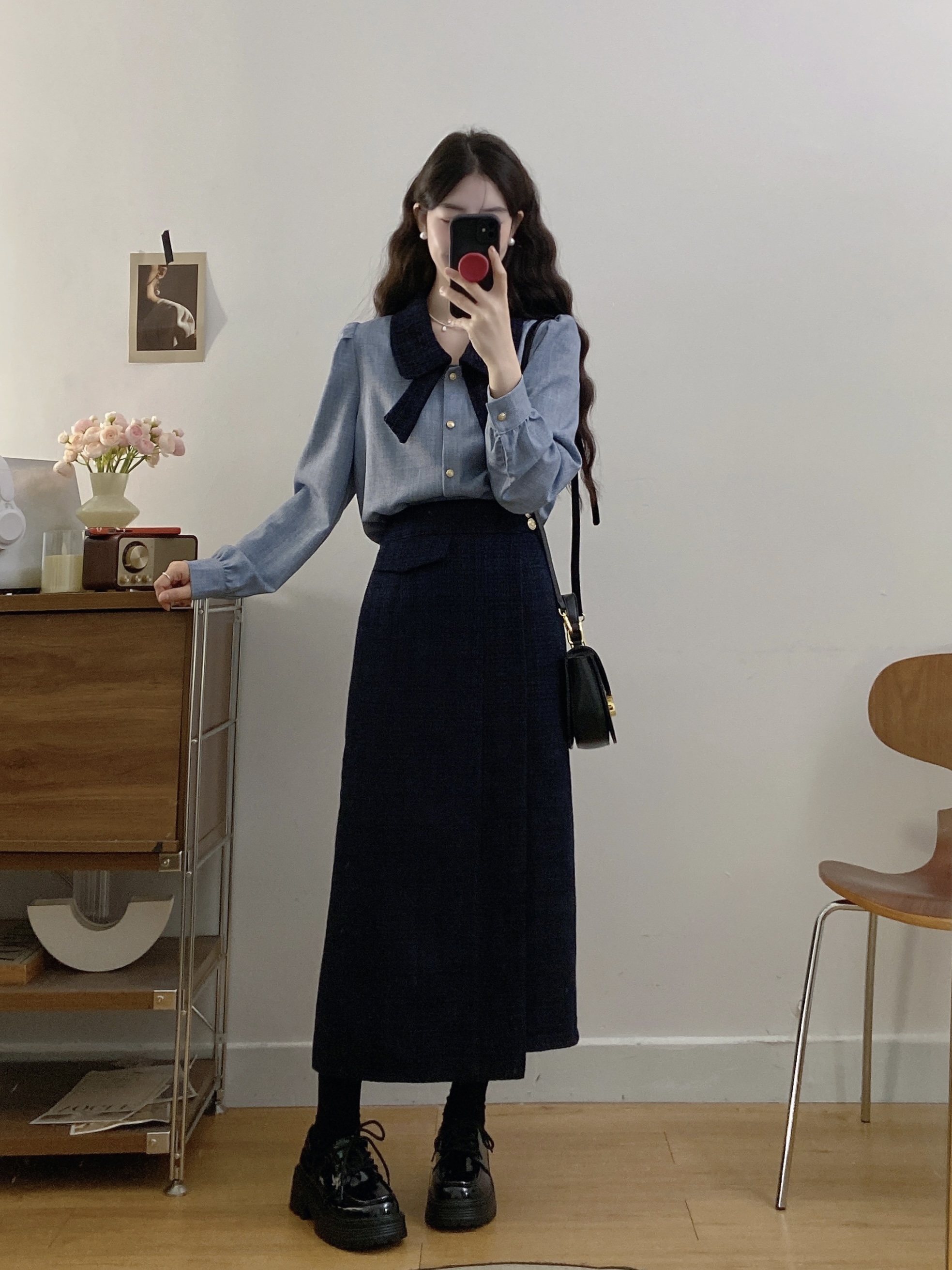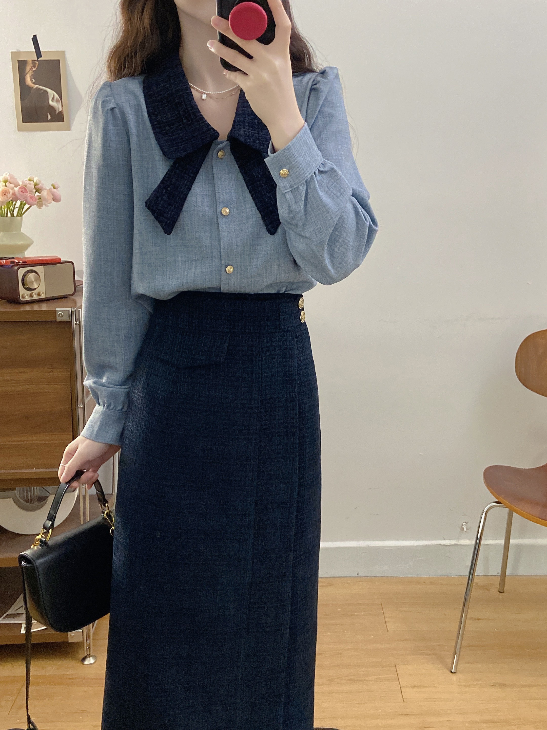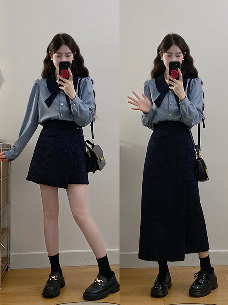 실사 빅 사이즈 여성 의류 2026 봄 새로운 한 부서 미니멀리즘 품격 다용도 셔츠 하이웨이스트 반신 치마 세트