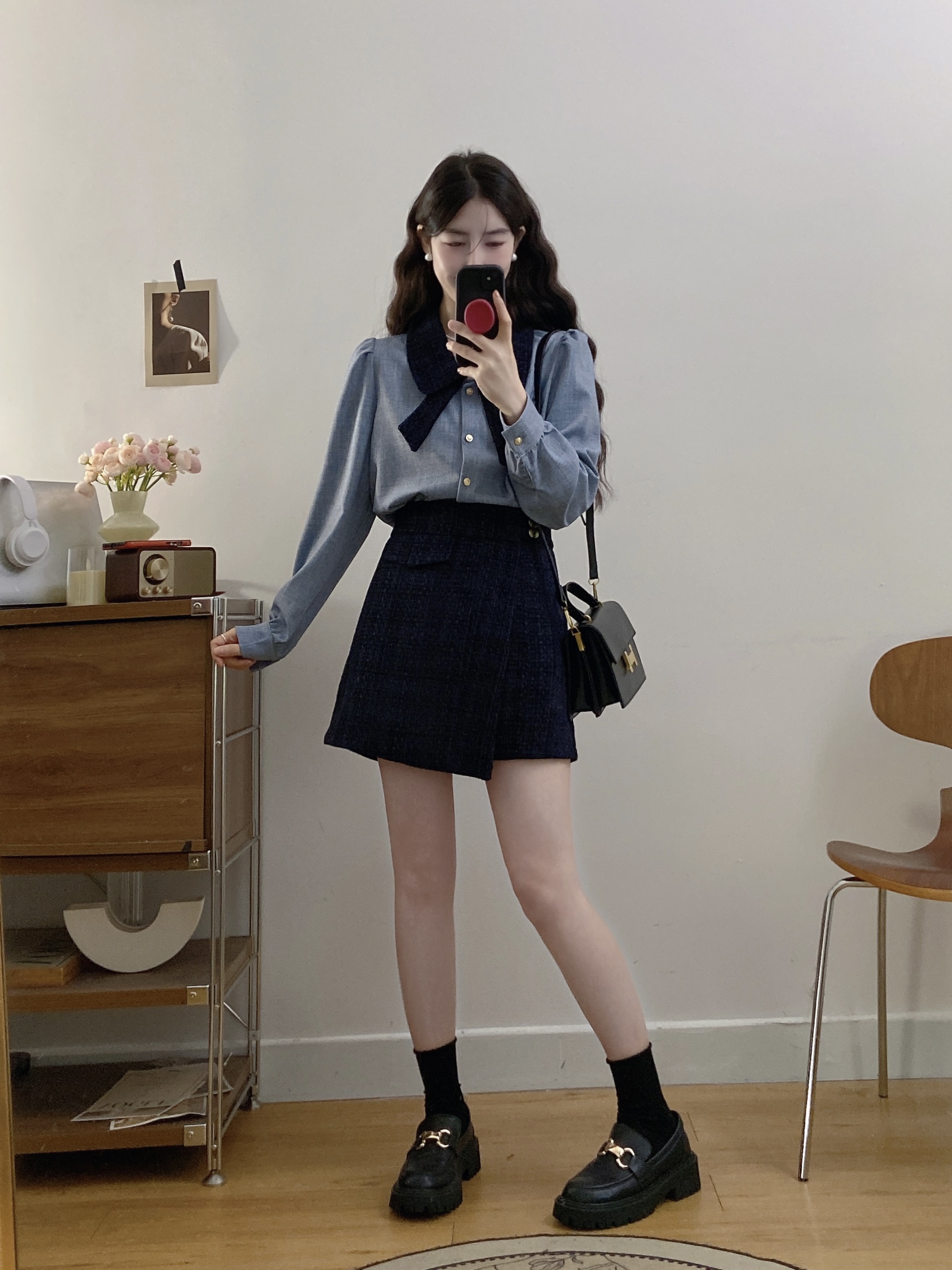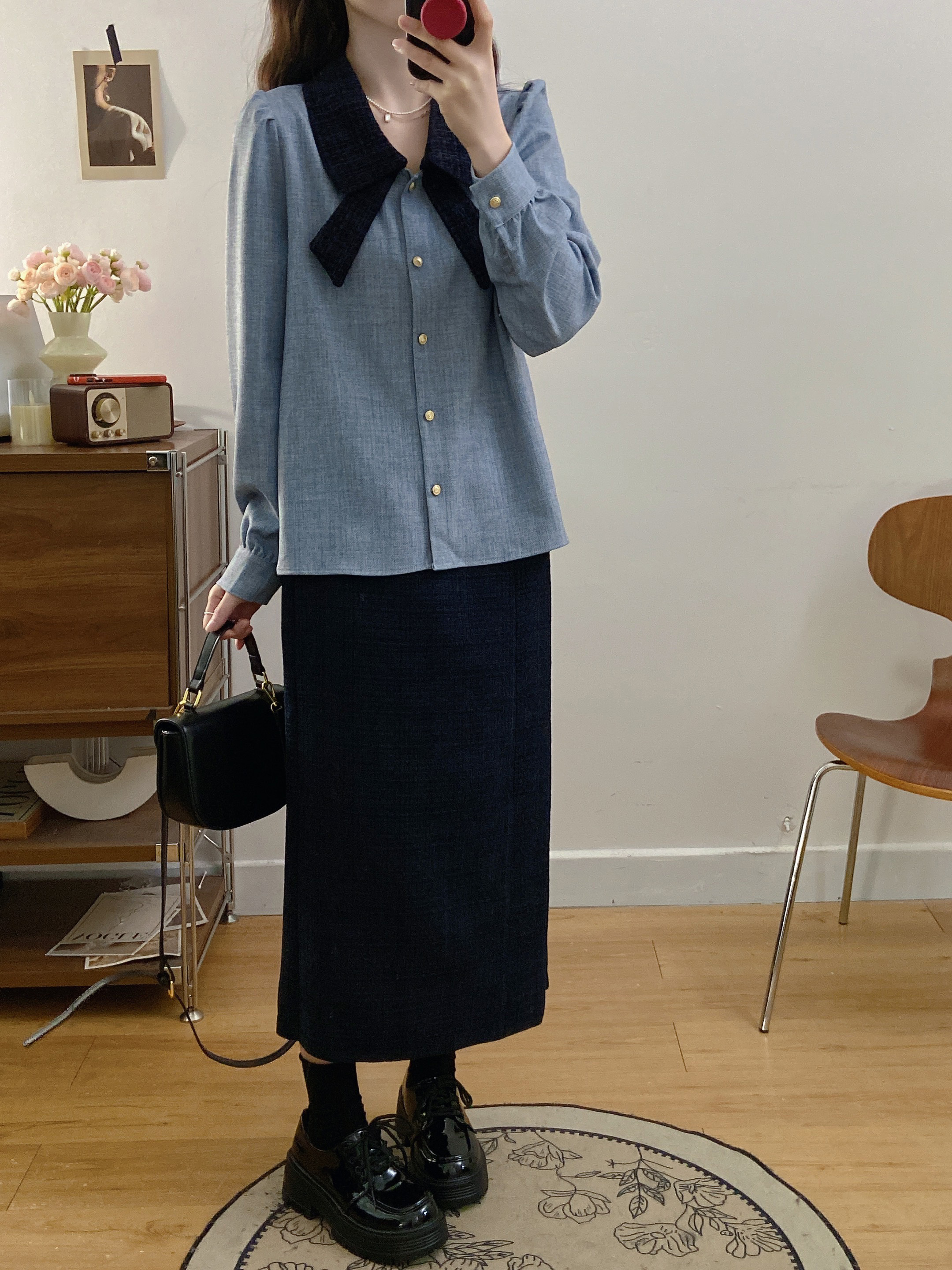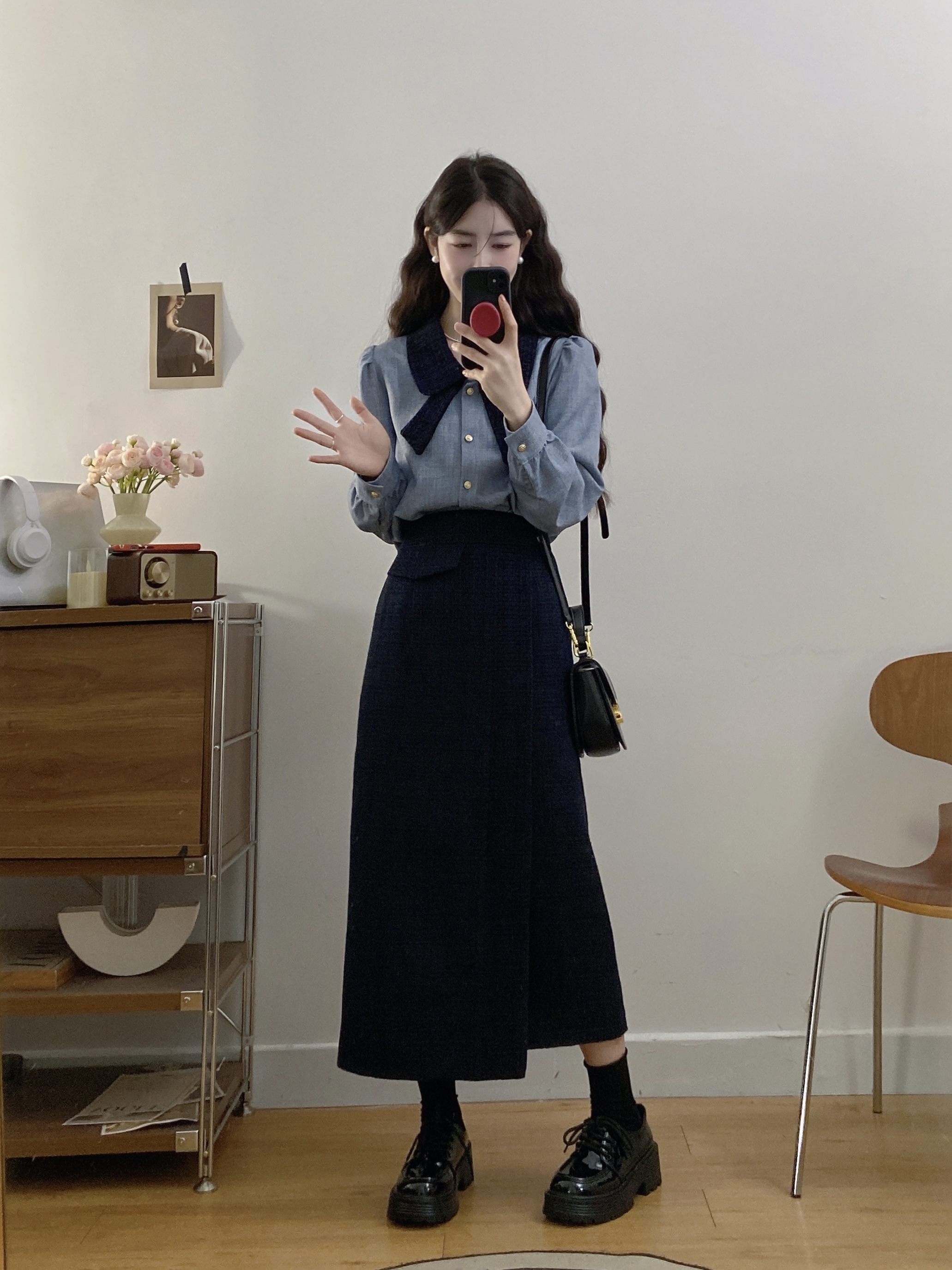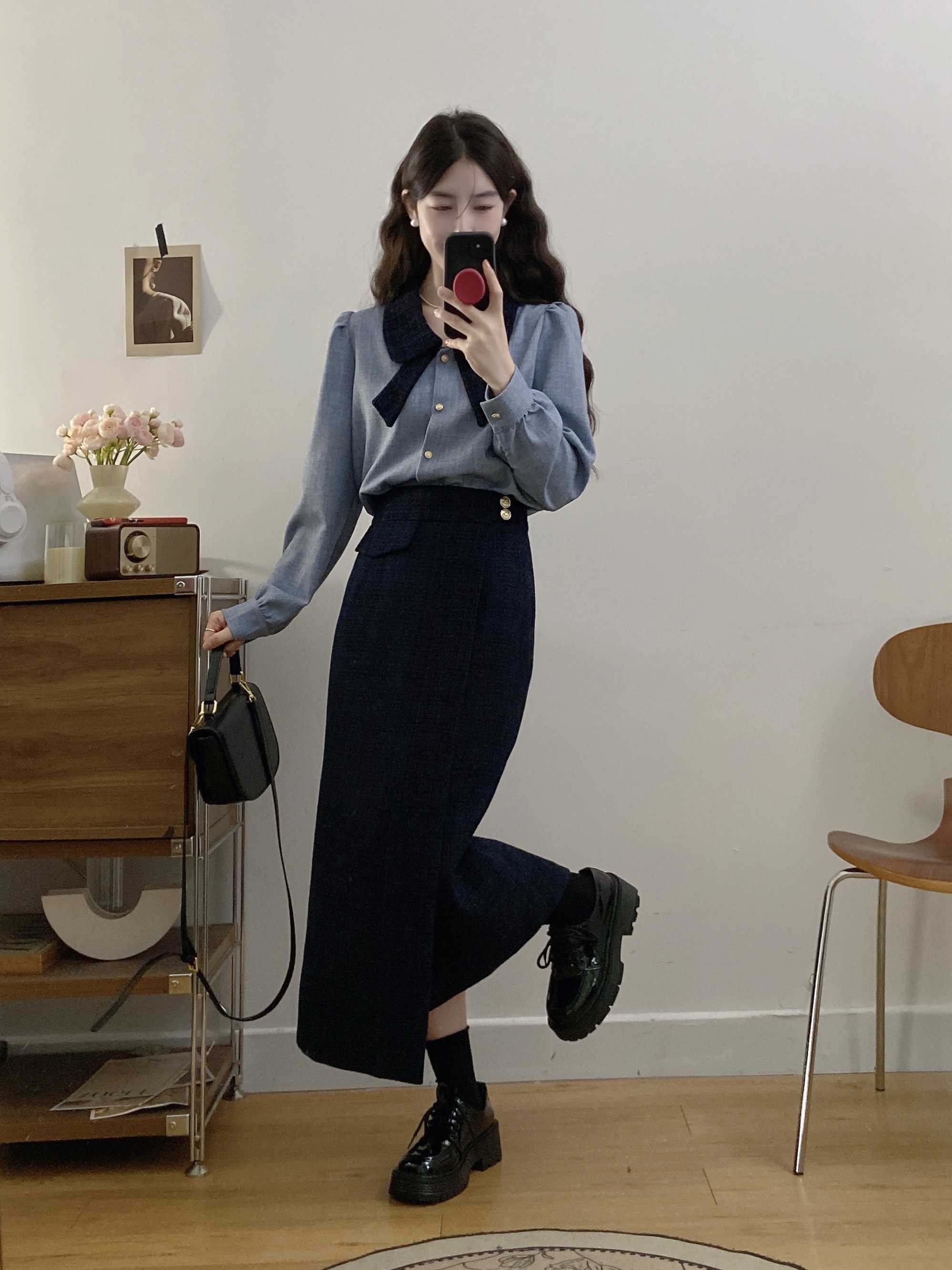 실사 빅 사이즈 여성 의류 2026 봄 새로운 한 부서 미니멀리즘 품격 다용도 셔츠 하이웨이스트 반신 치마 세트