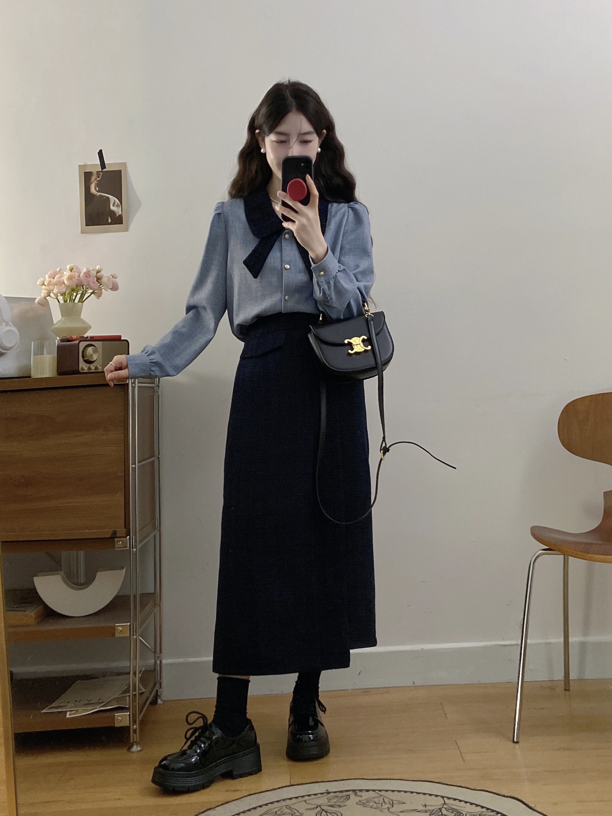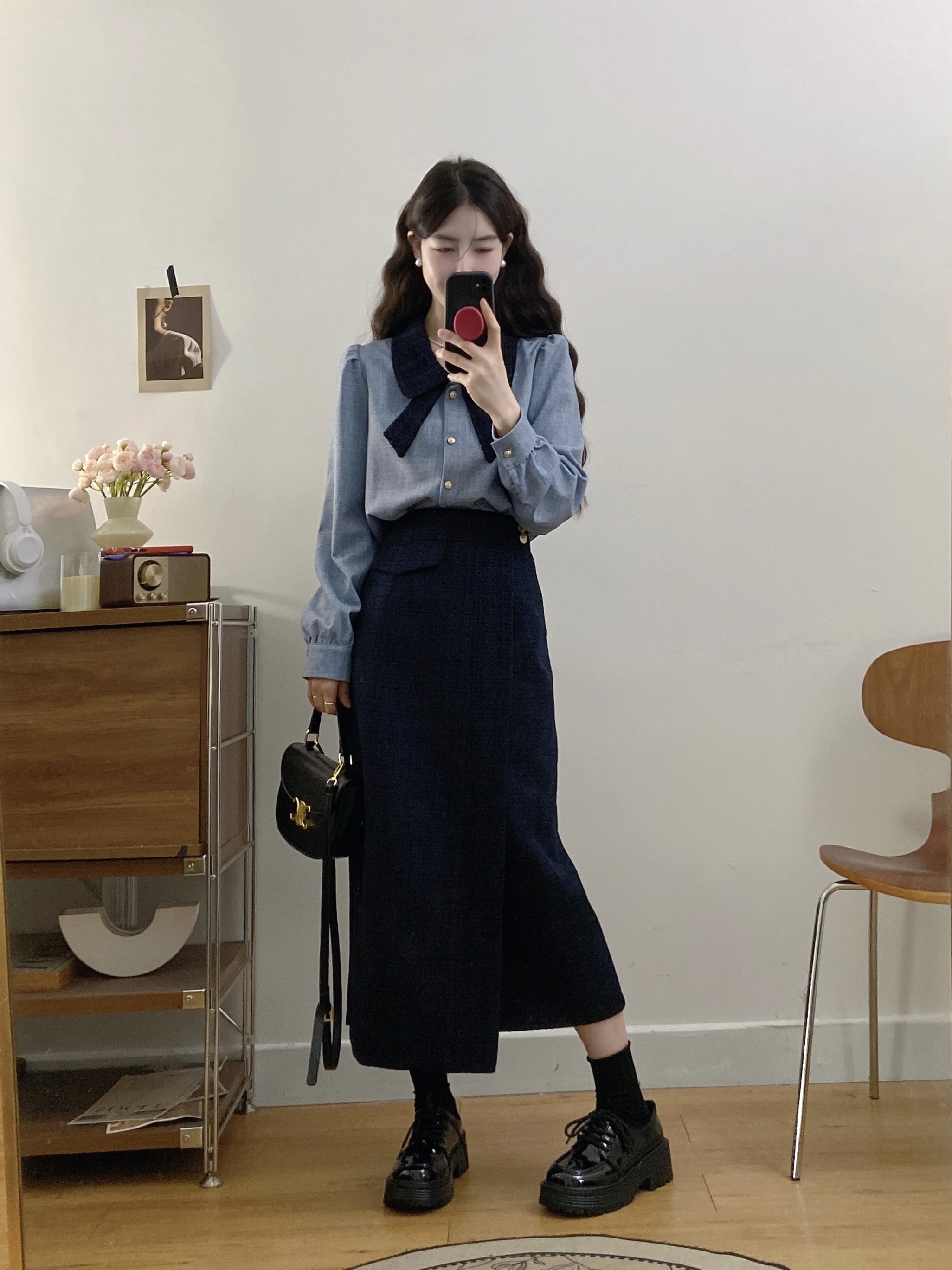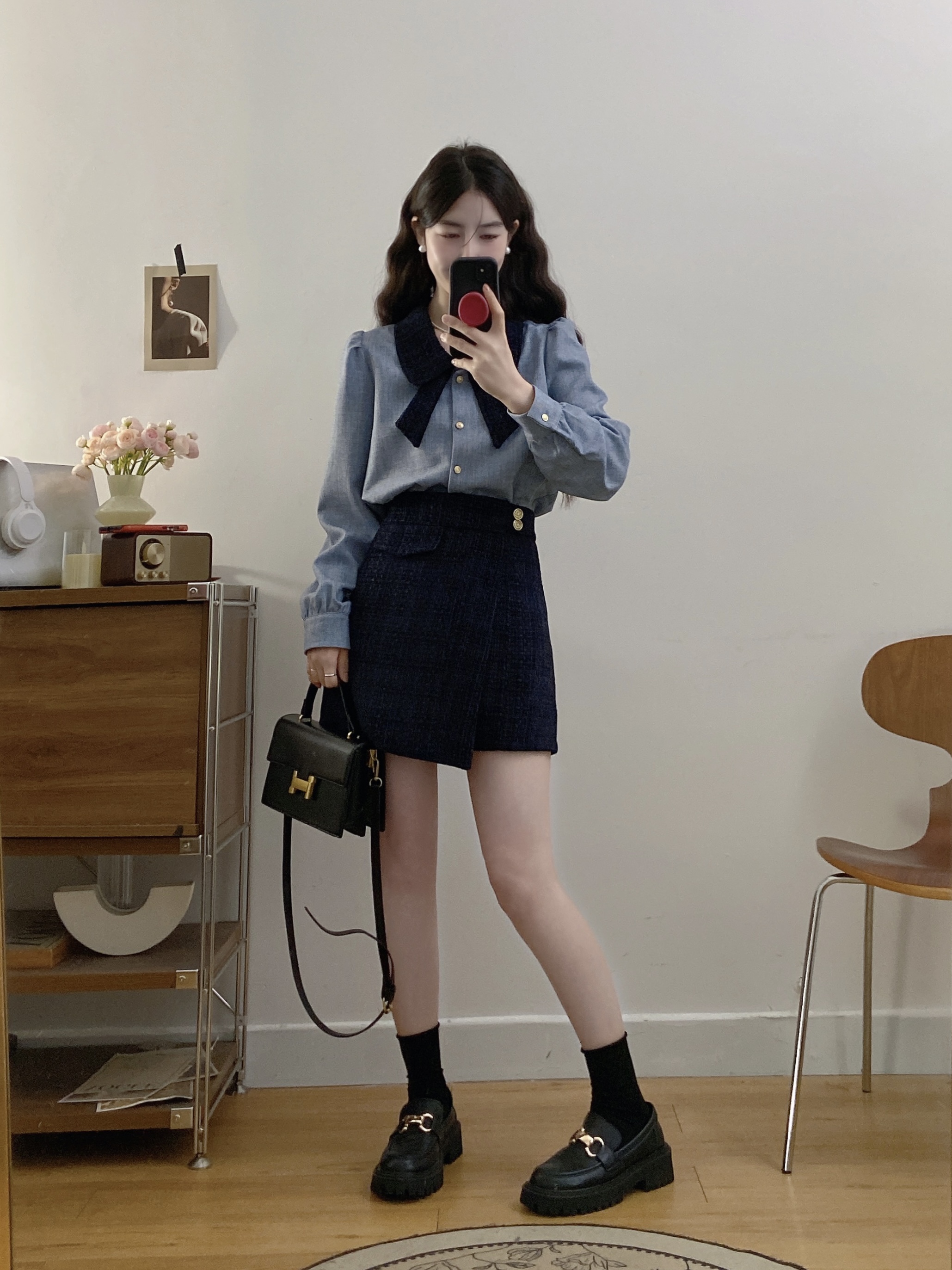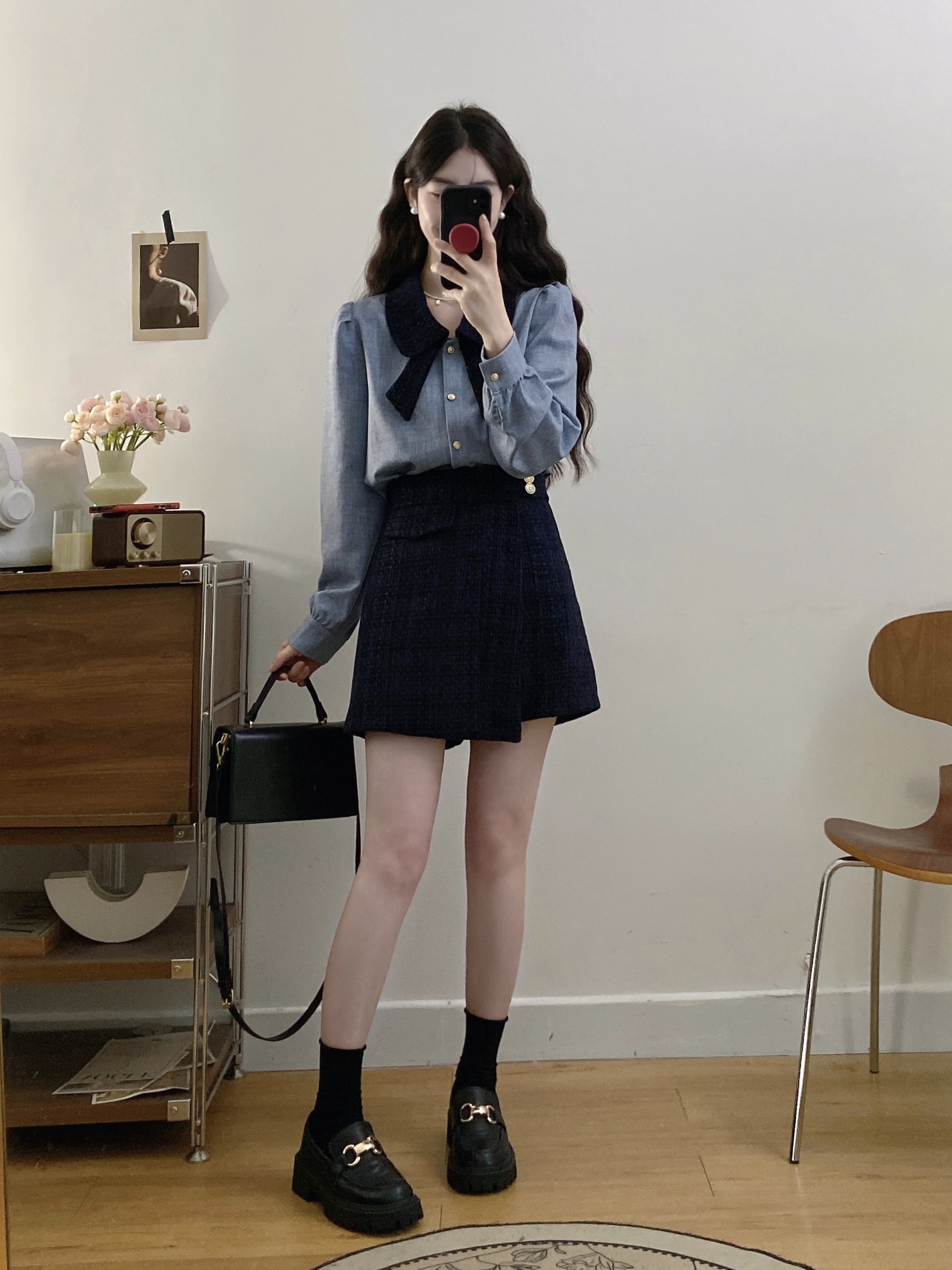 실사 빅 사이즈 여성 의류 2026 봄 새로운 한 부서 미니멀리즘 품격 다용도 셔츠 하이웨이스트 반신 치마 세트