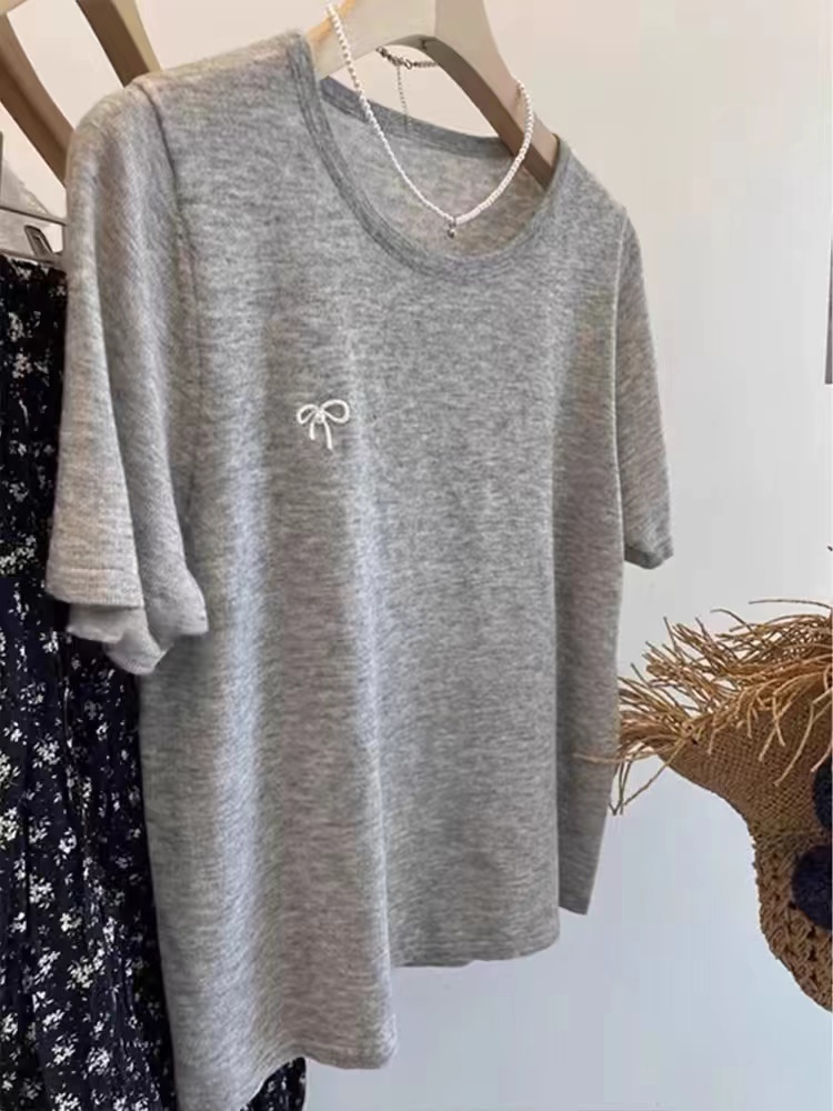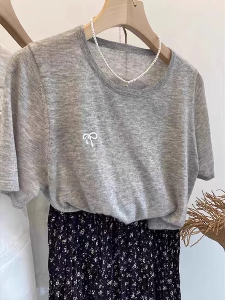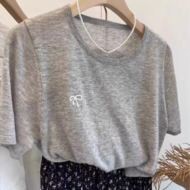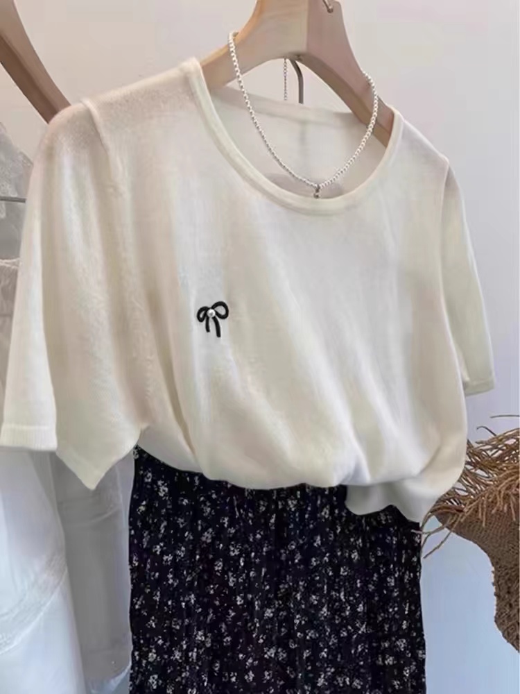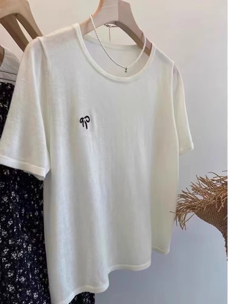 화이트 자수 얼음 실크 니트 반팔 긍정적 인 어깨 티셔츠 여성 여름 작은 키 얇은 스타일 티셔츠 루즈핏 쇼트 스타일 맨위