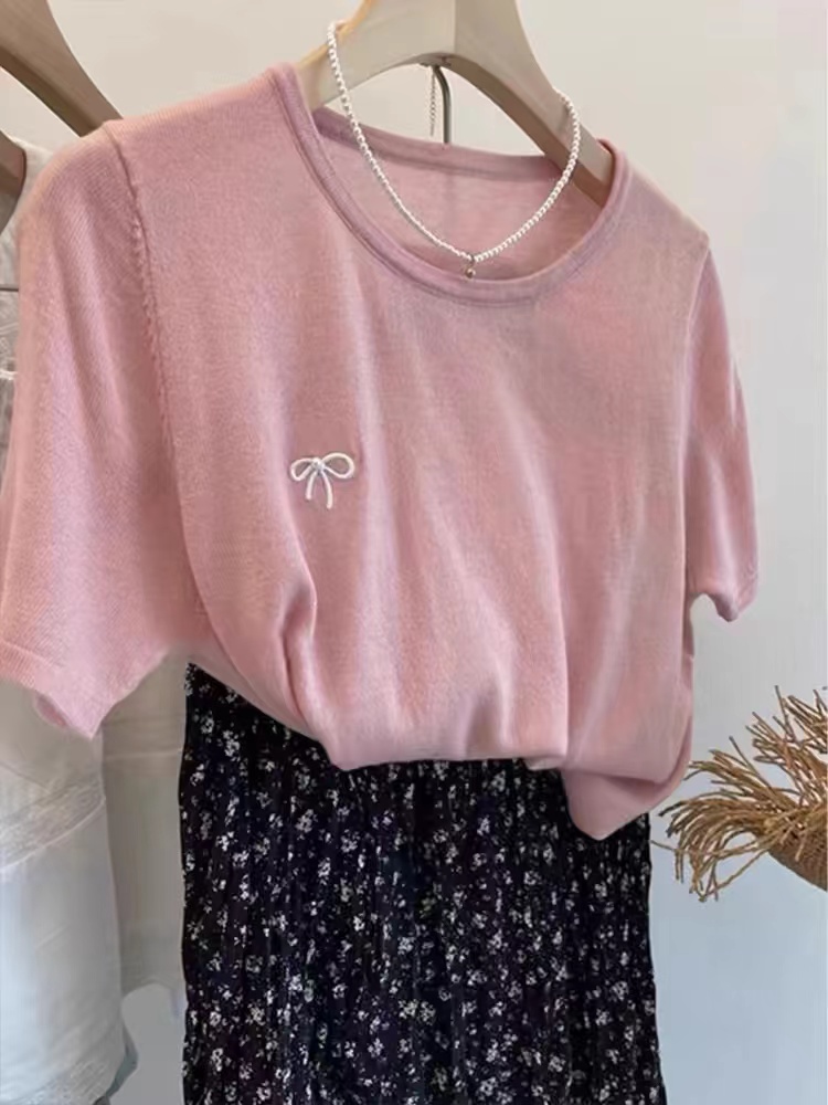 한 부서 고급 센스 디스플레이 화이트 baby 핑크색 니트 맨위 여성 여름 새로운 연령 감소 외국 가스 라운드 넥 날다 소매 티셔츠