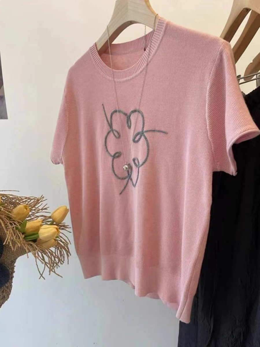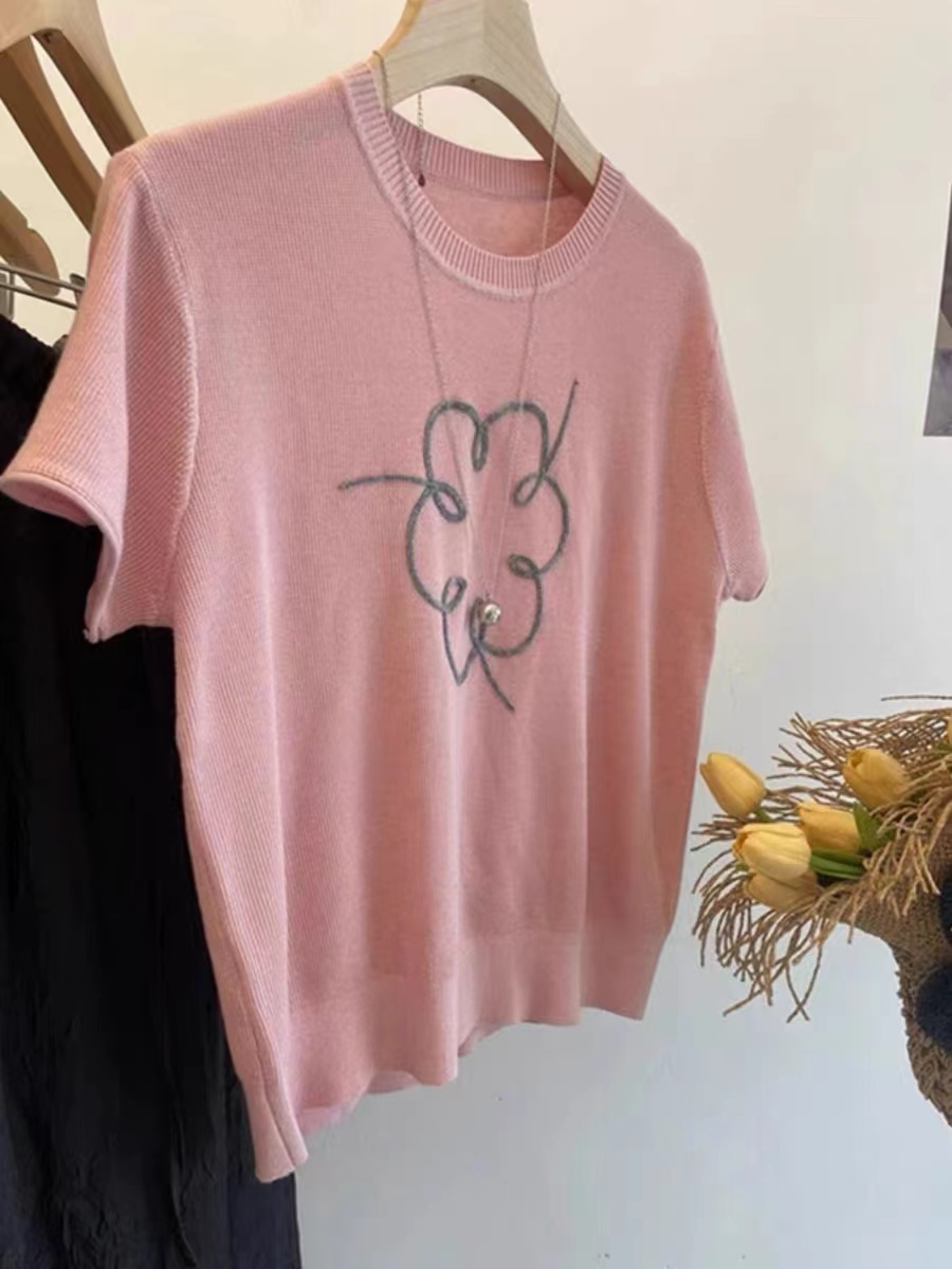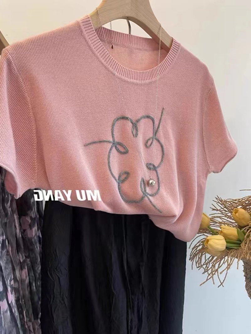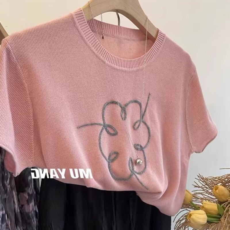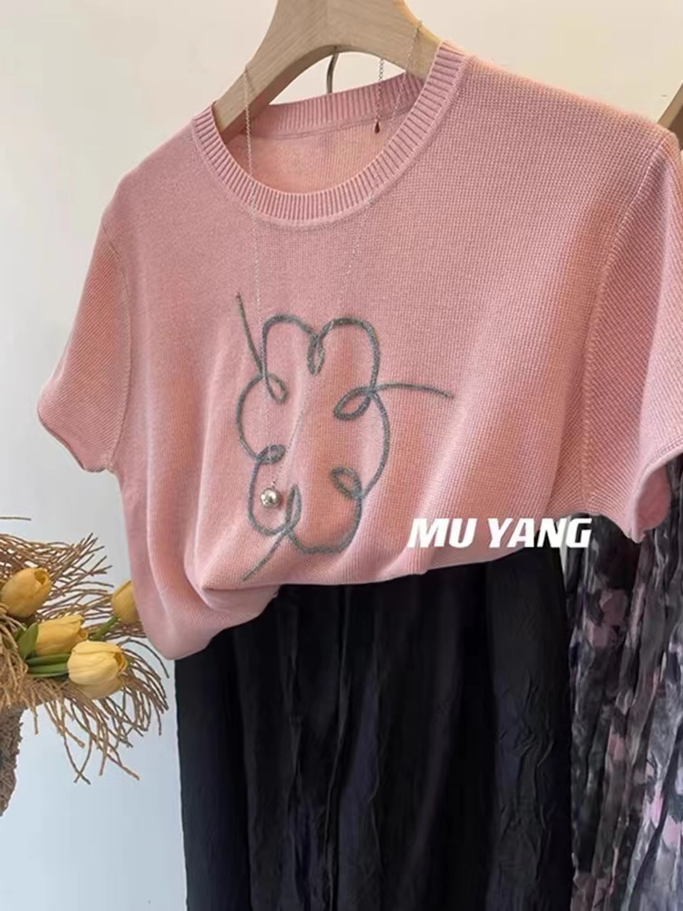 한 부서 핑크색 얼음 실크 니트 반팔 긍정적 인 어깨 티셔츠 여성 여름 꽃 3 차원 자수 디자인 센스 쇼트 스타일 맨위