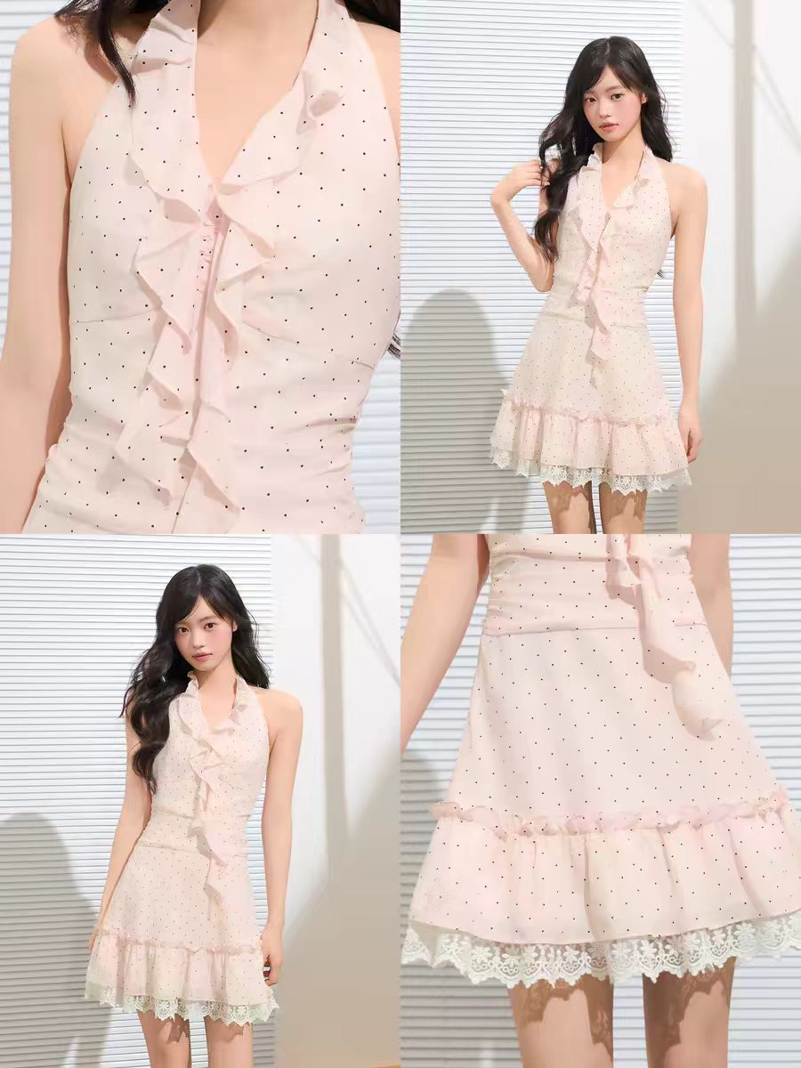 오리지널 천 골드 달콤한 스타일 도트 무늬 민소매 드레스 생일 치마 생선뼈 퍼프 미니 스커트
