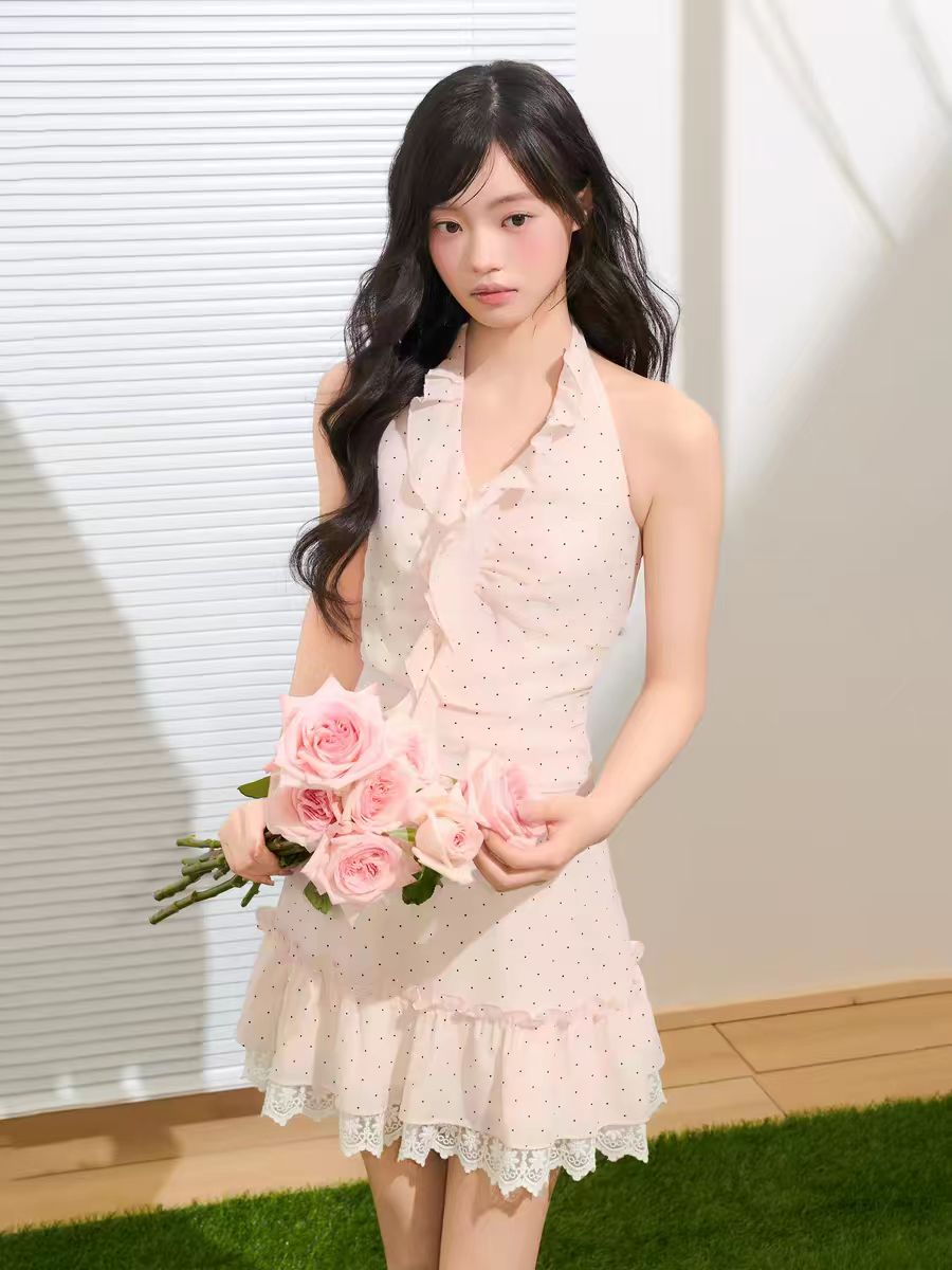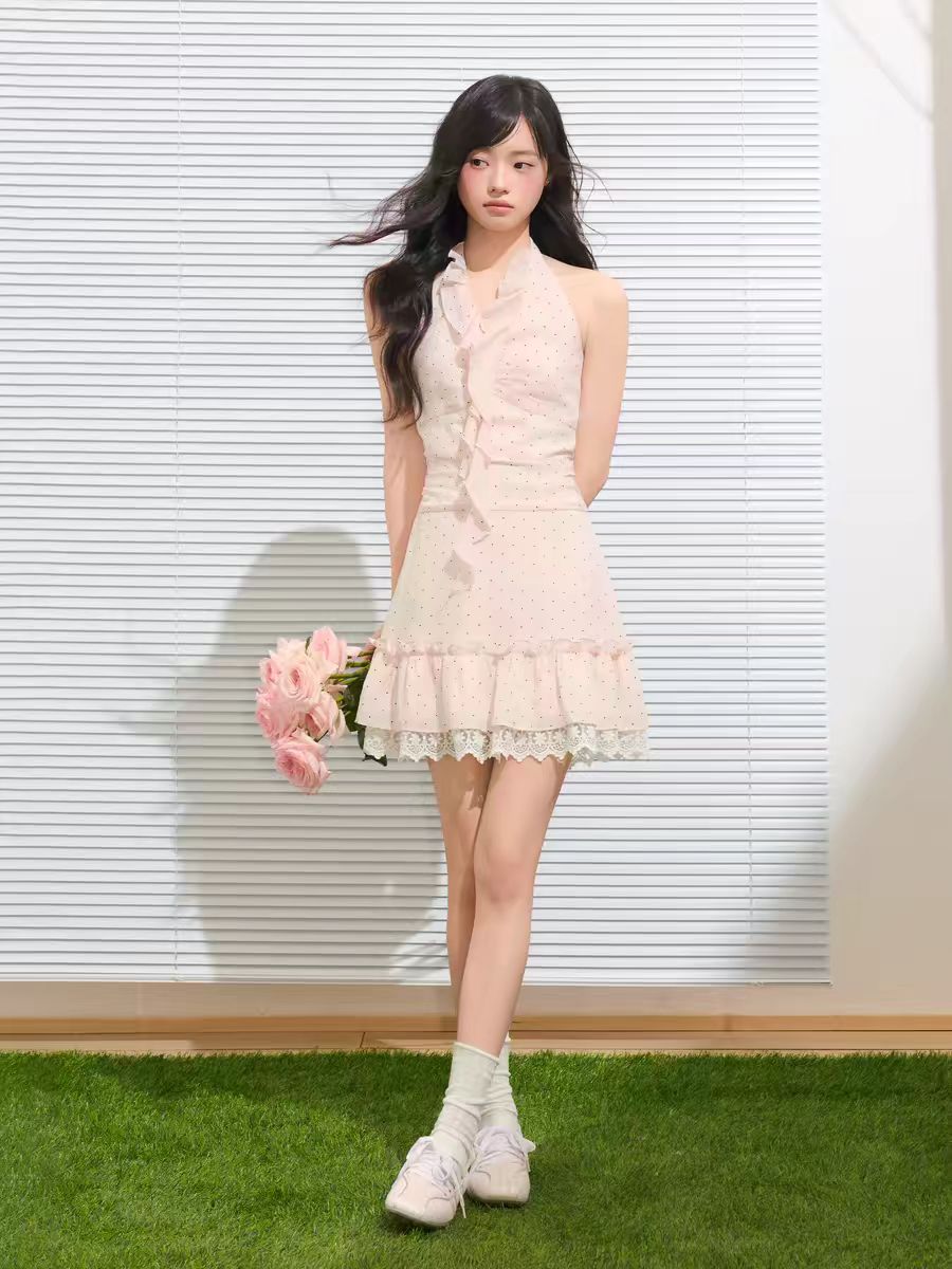 한 부서 디자인 센스 화이트 도트 무늬 드레스 여름 새로운 주름 디자인 센스 학원 스타일 소녀 치마