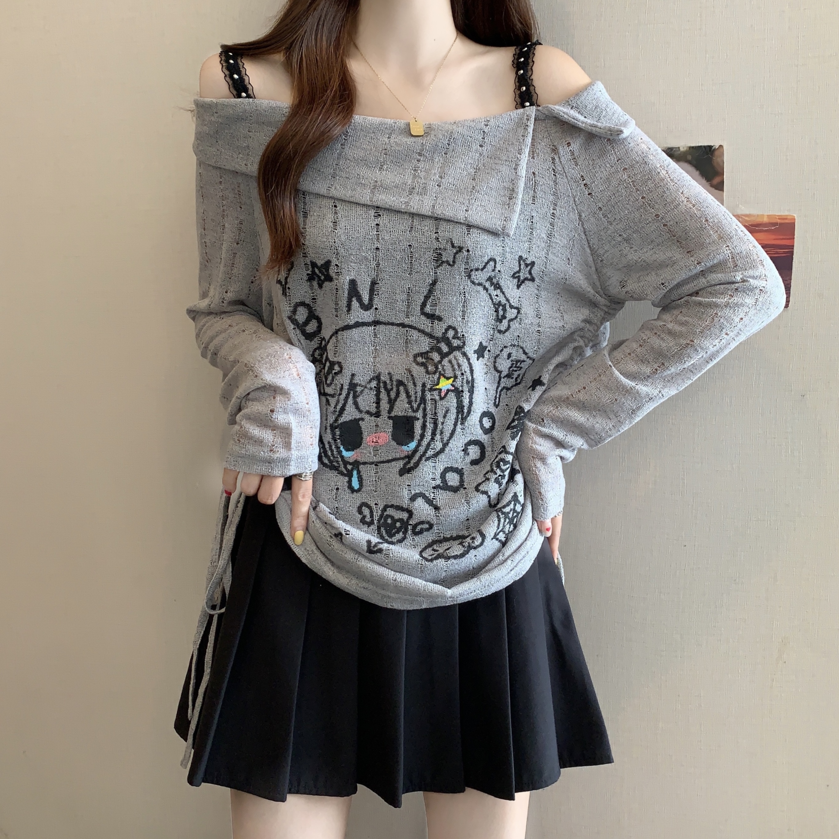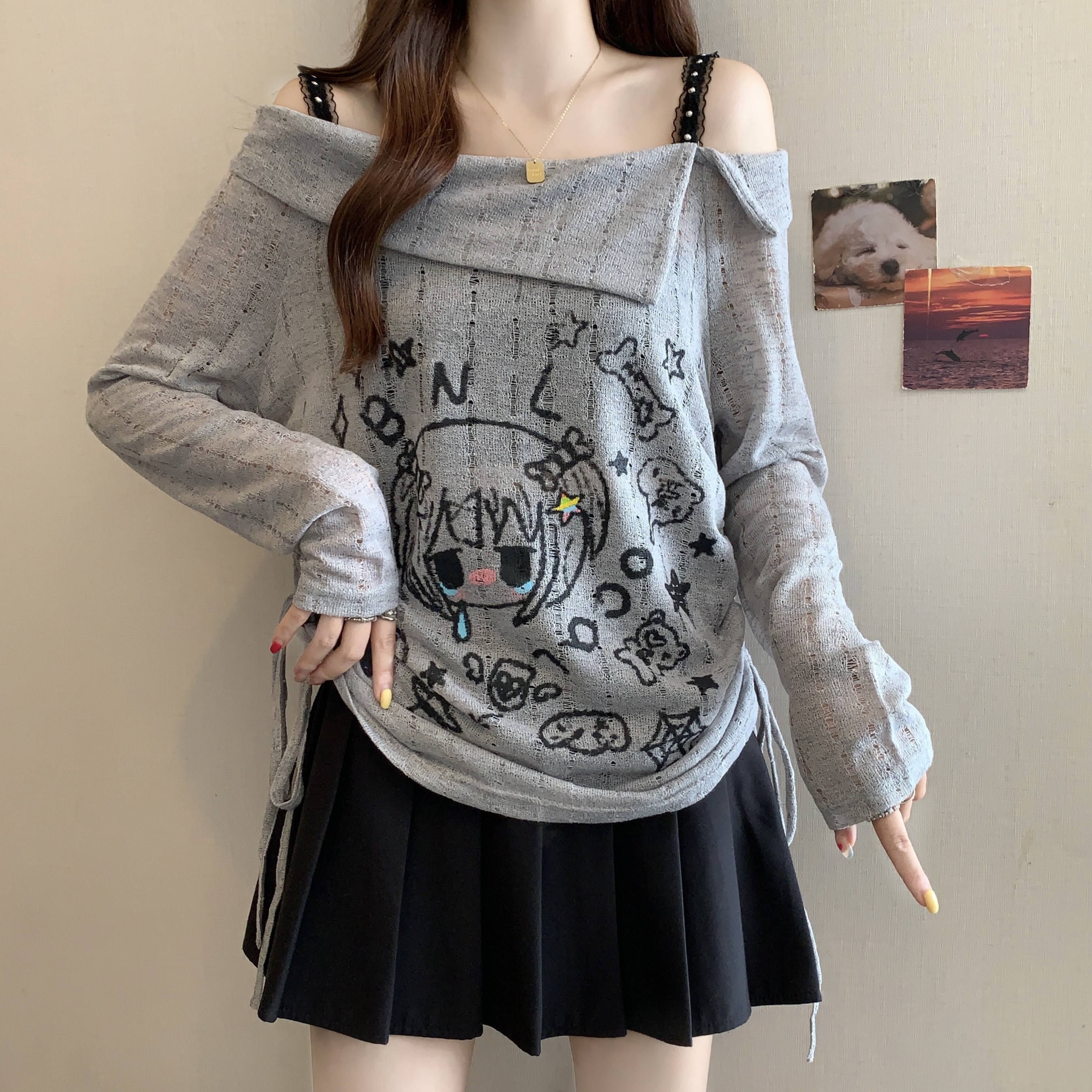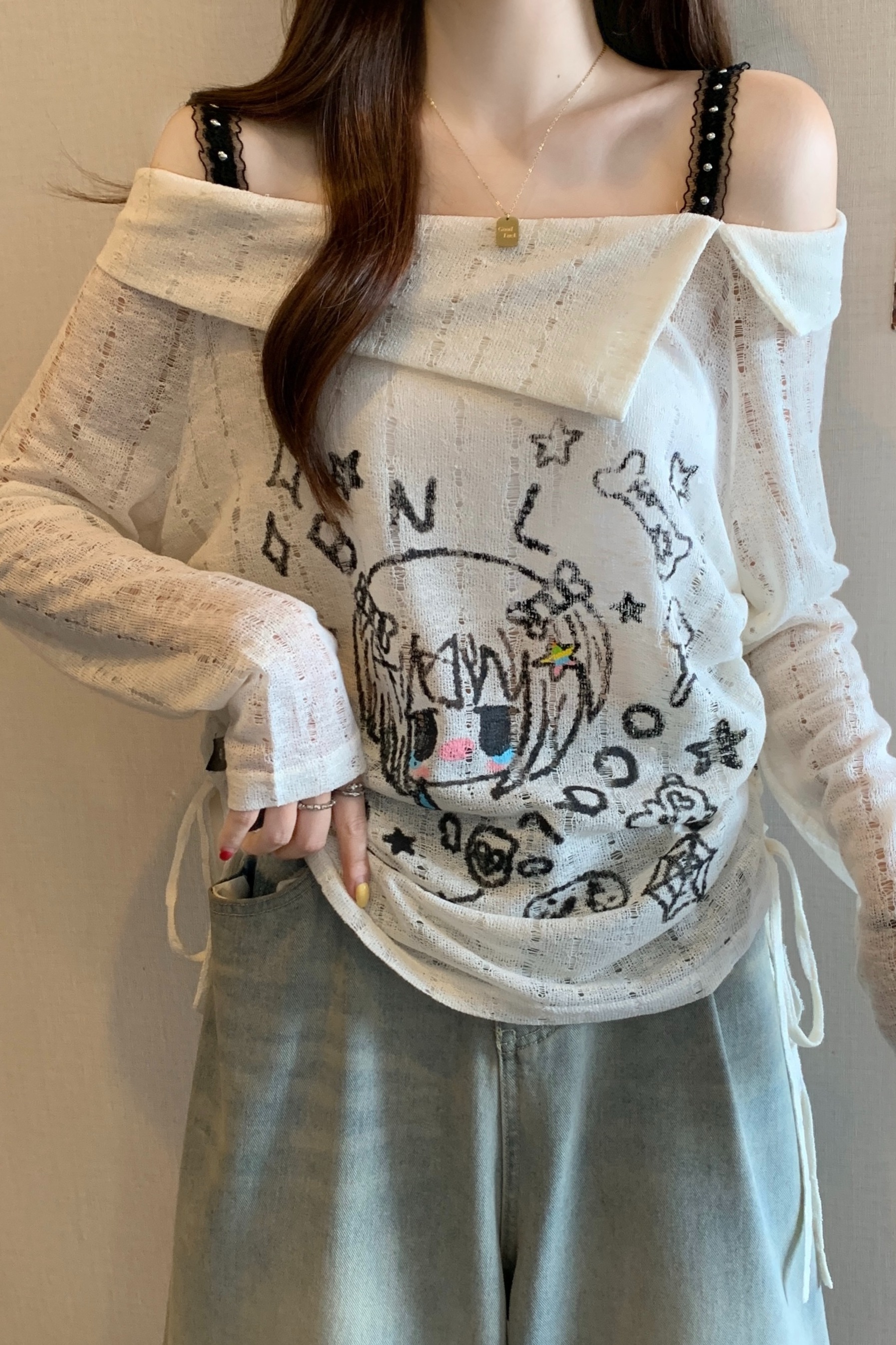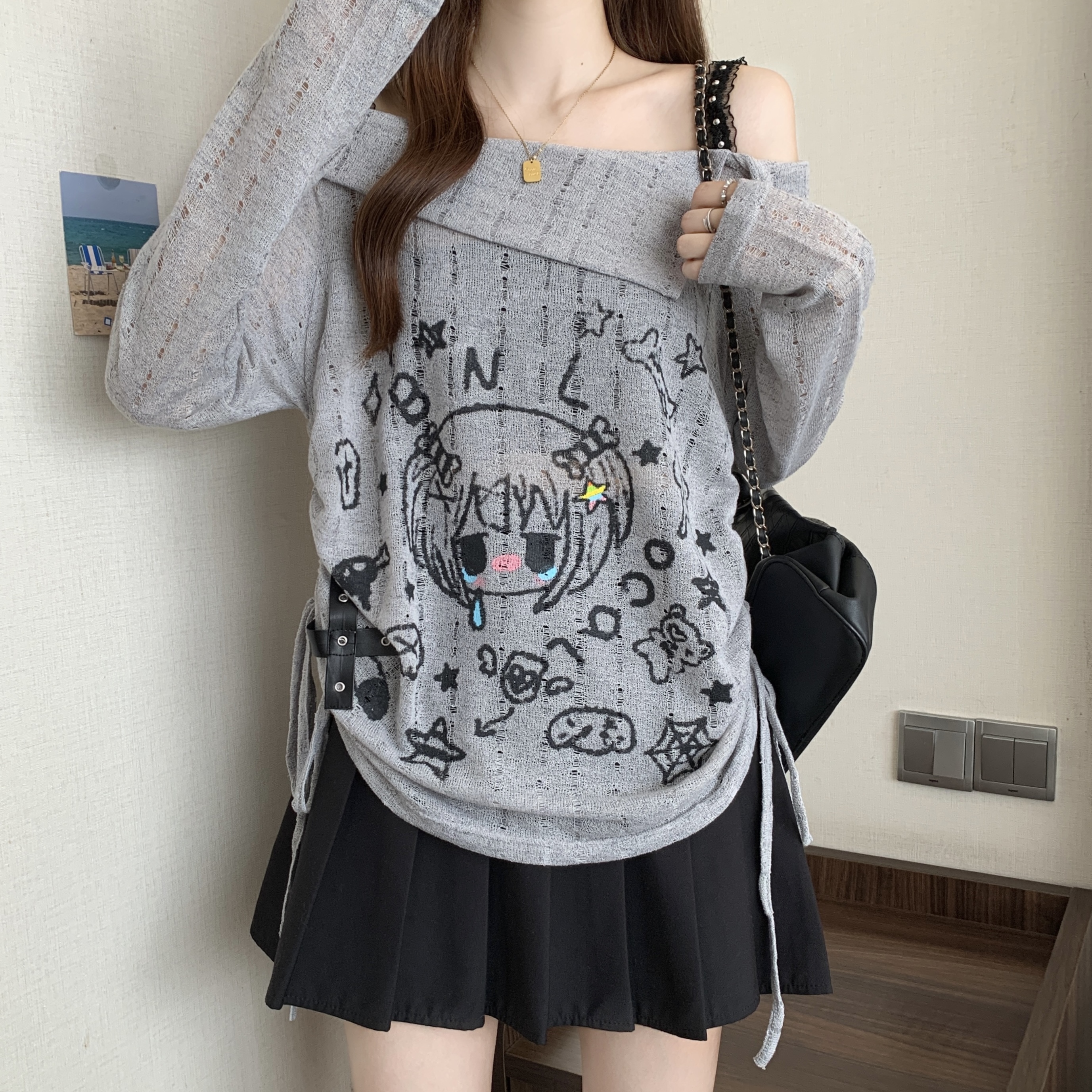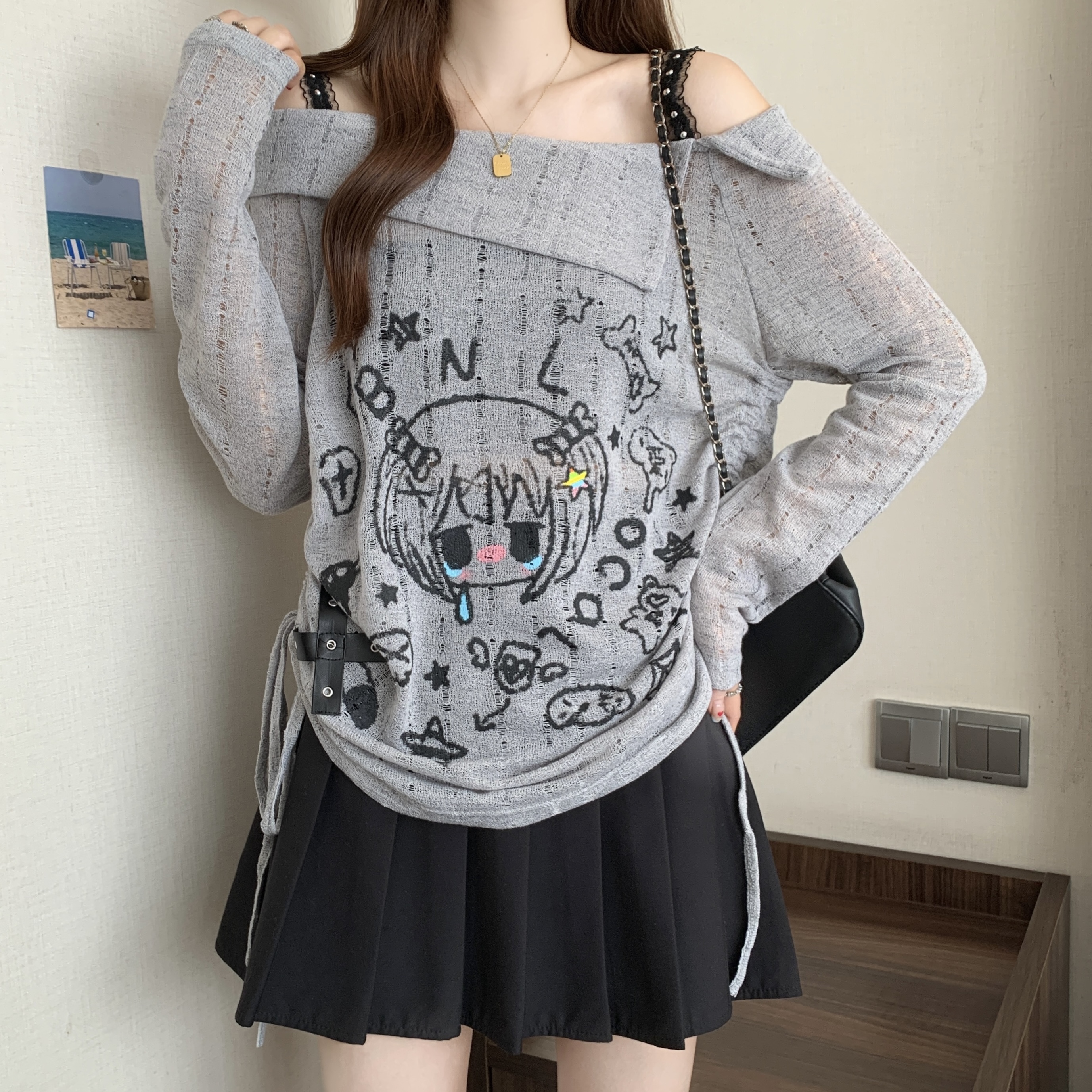 빅 사이즈 여성 의류 2026 새로운 아메리칸 만화 프린트 긴팔 여성 고급 센스 허리 수축 슬림해 보이는 아름다운 오프숄더 맨위