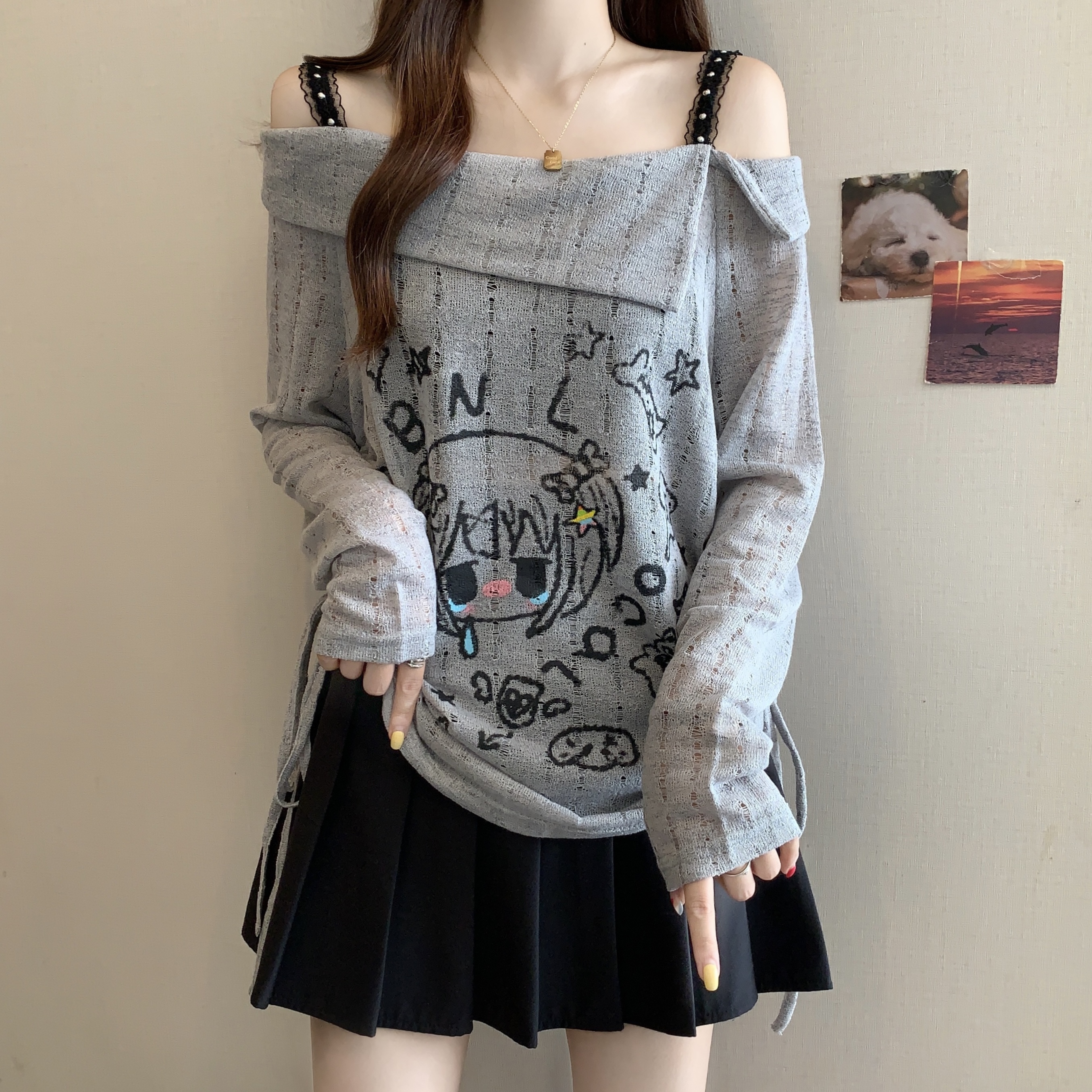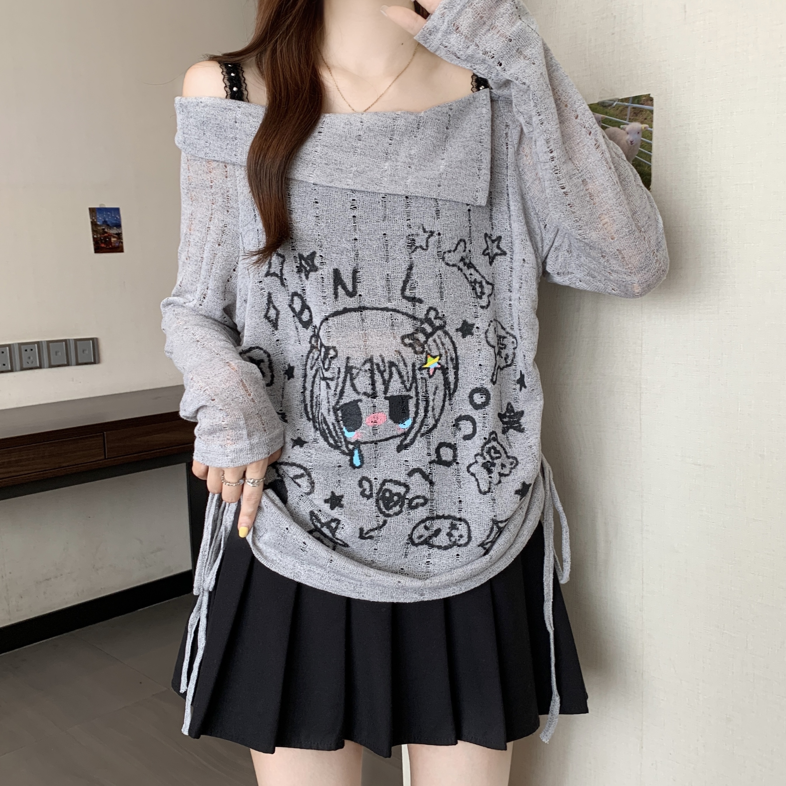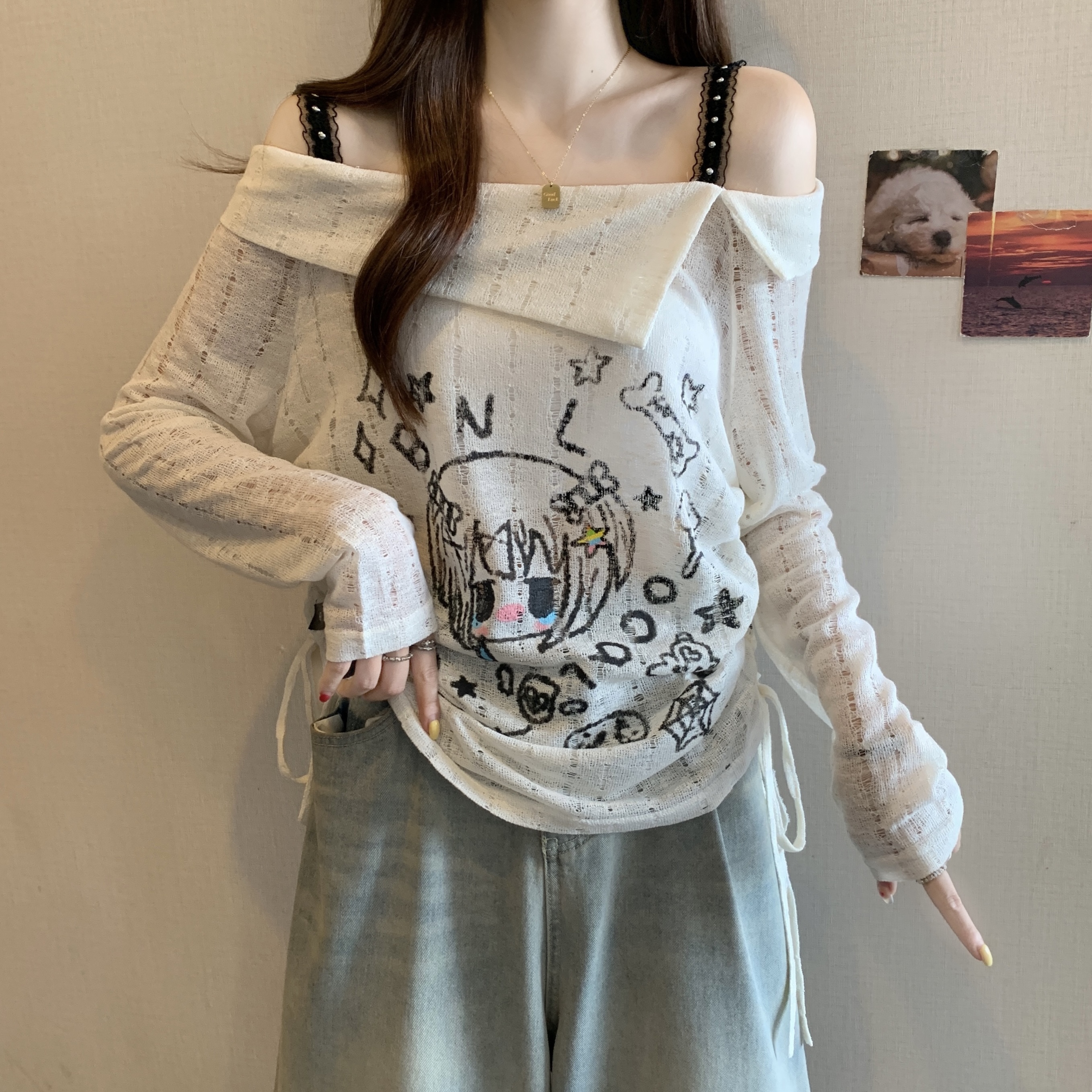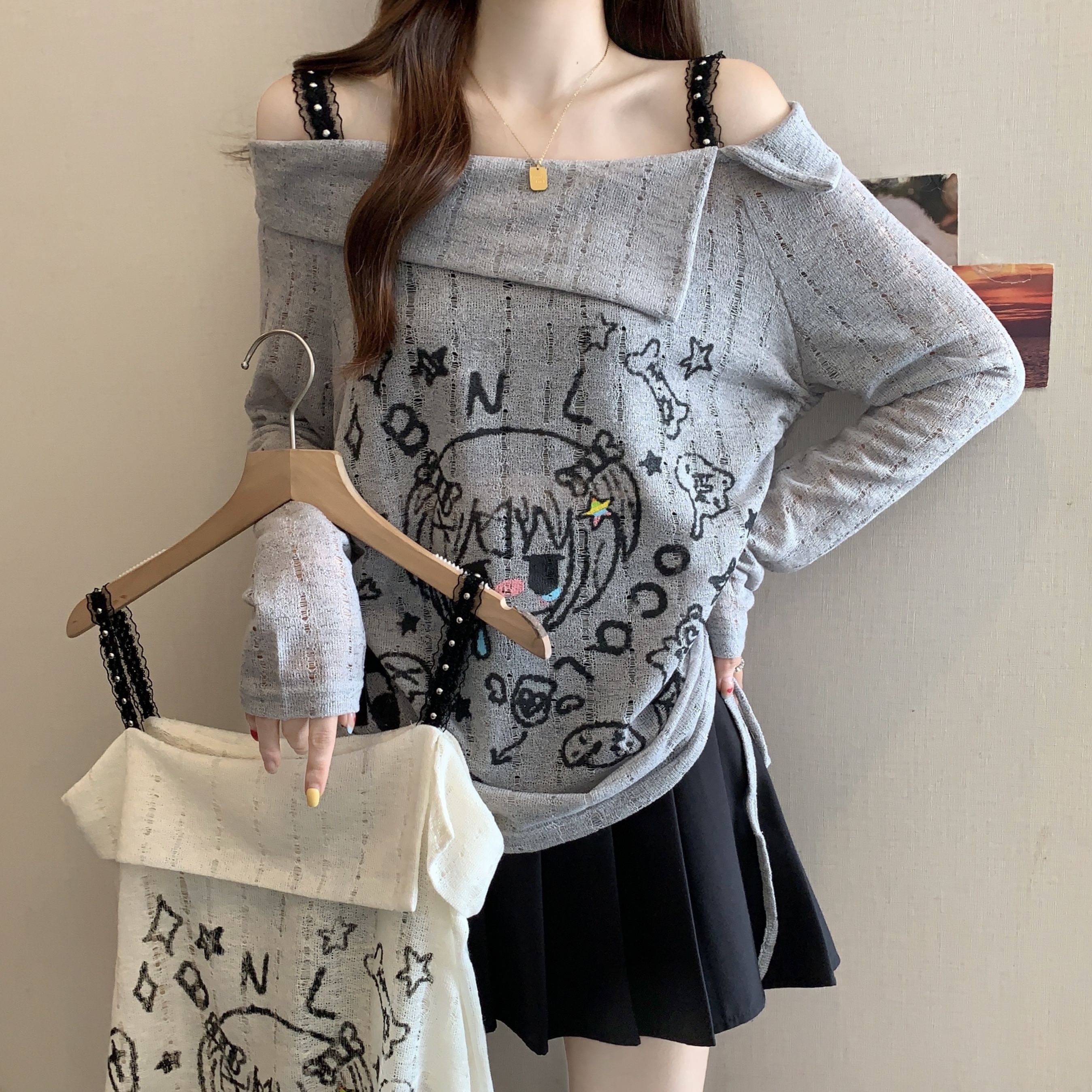 빅 사이즈 여성 의류 2026 새로운 아메리칸 만화 프린트 긴팔 여성 고급 센스 허리 수축 슬림해 보이는 아름다운 오프숄더 맨위