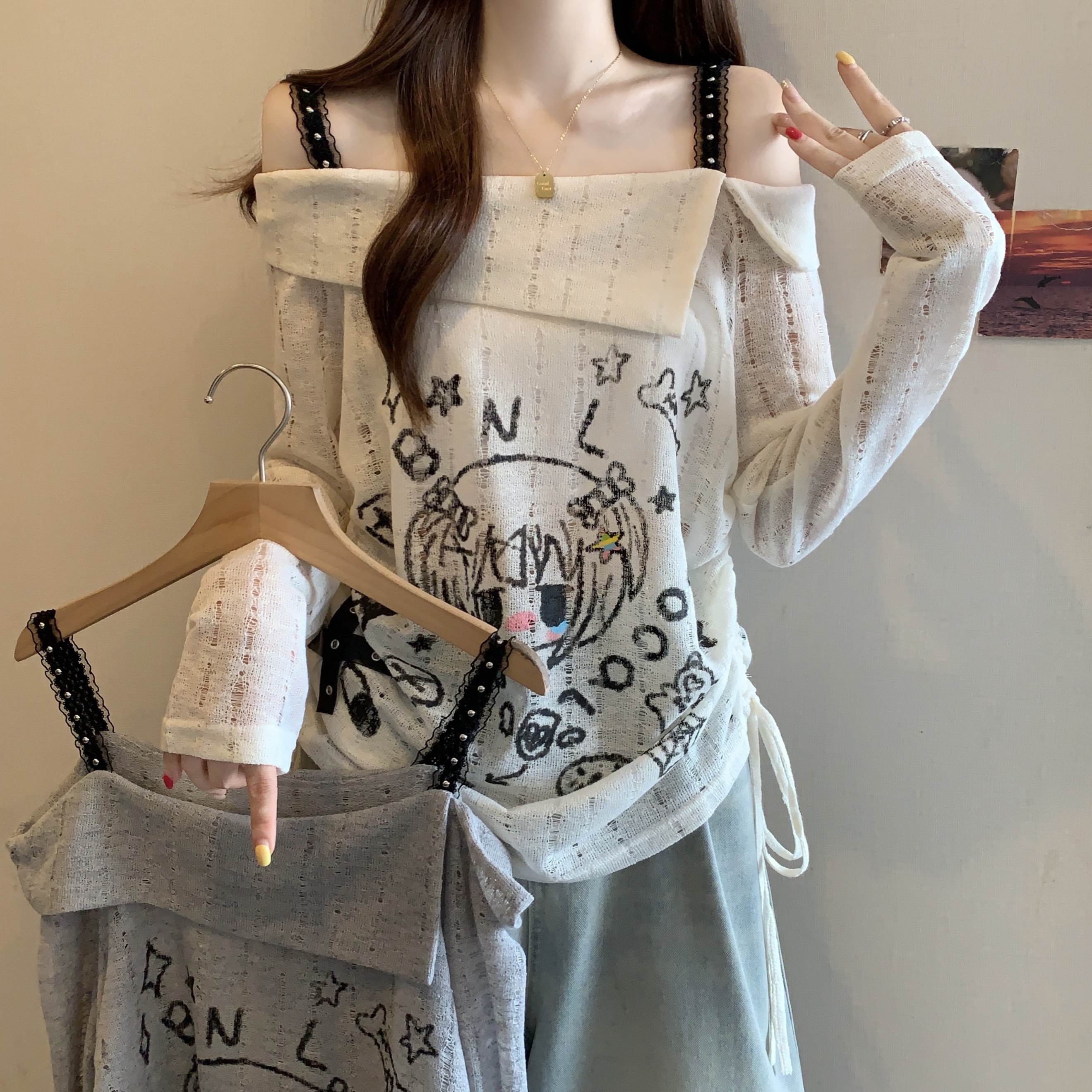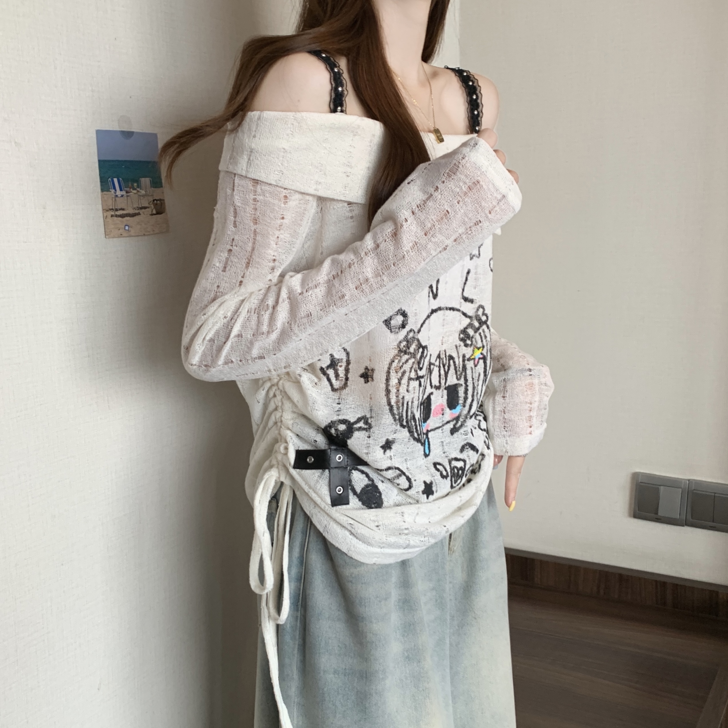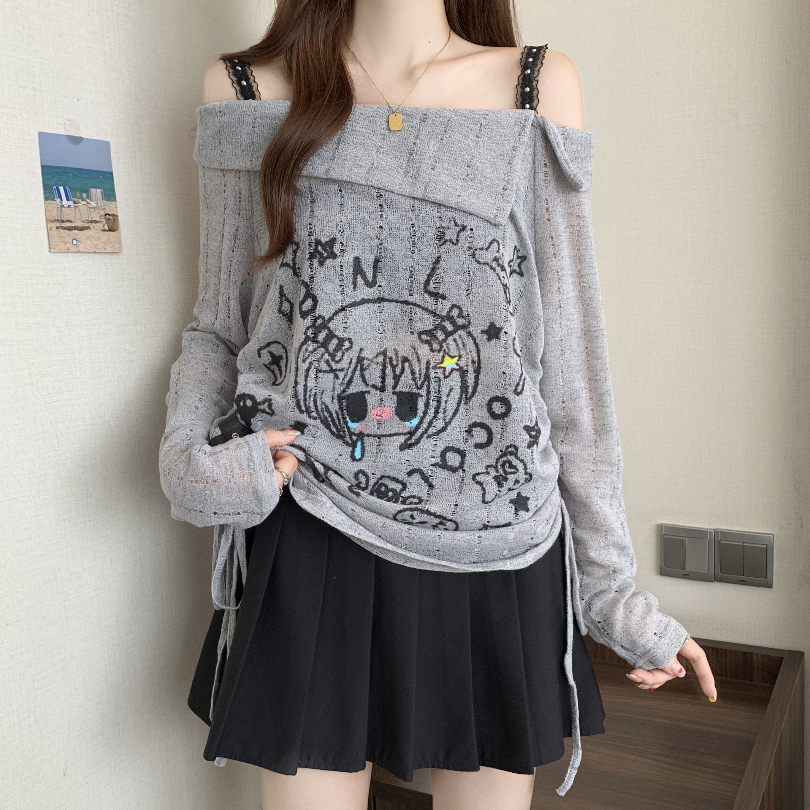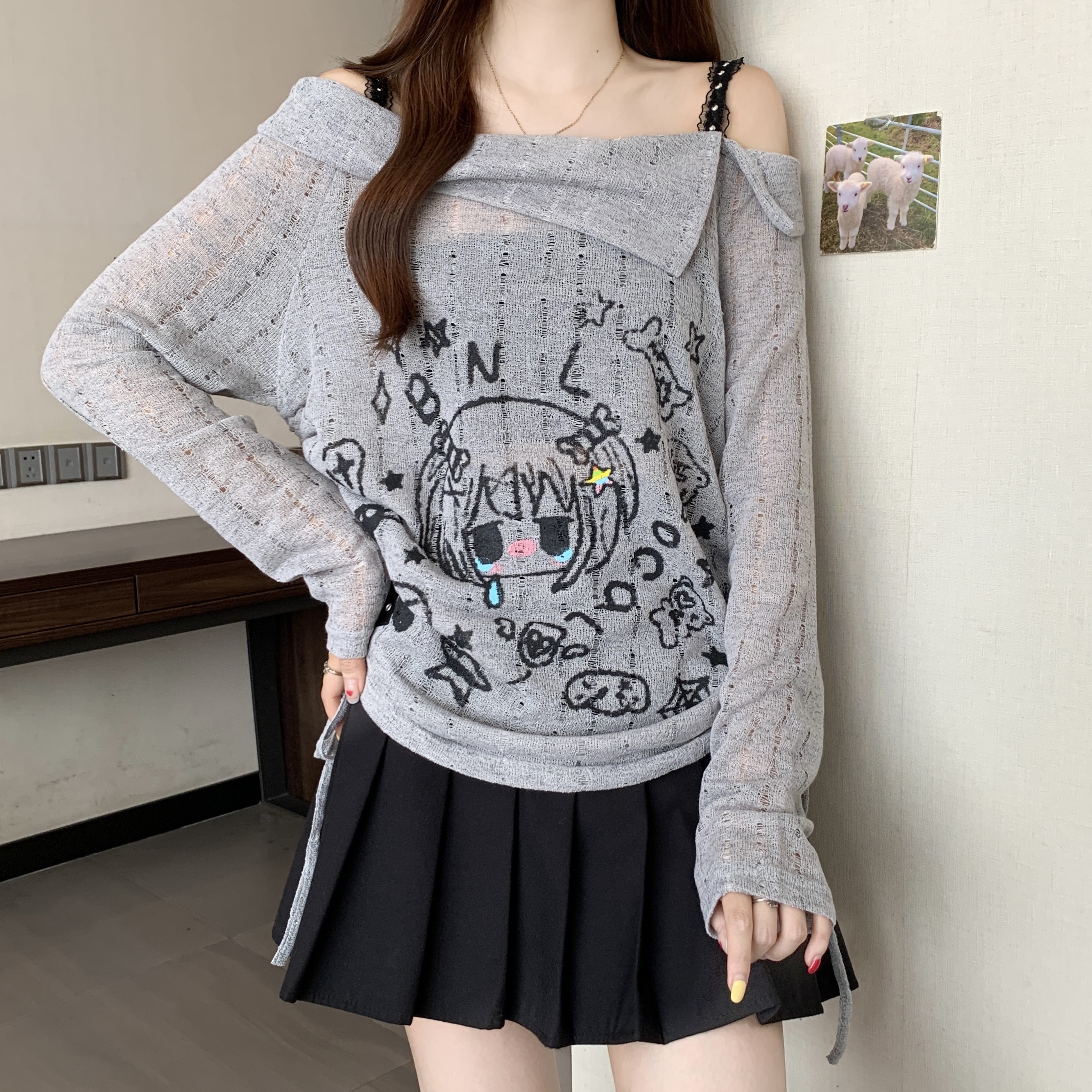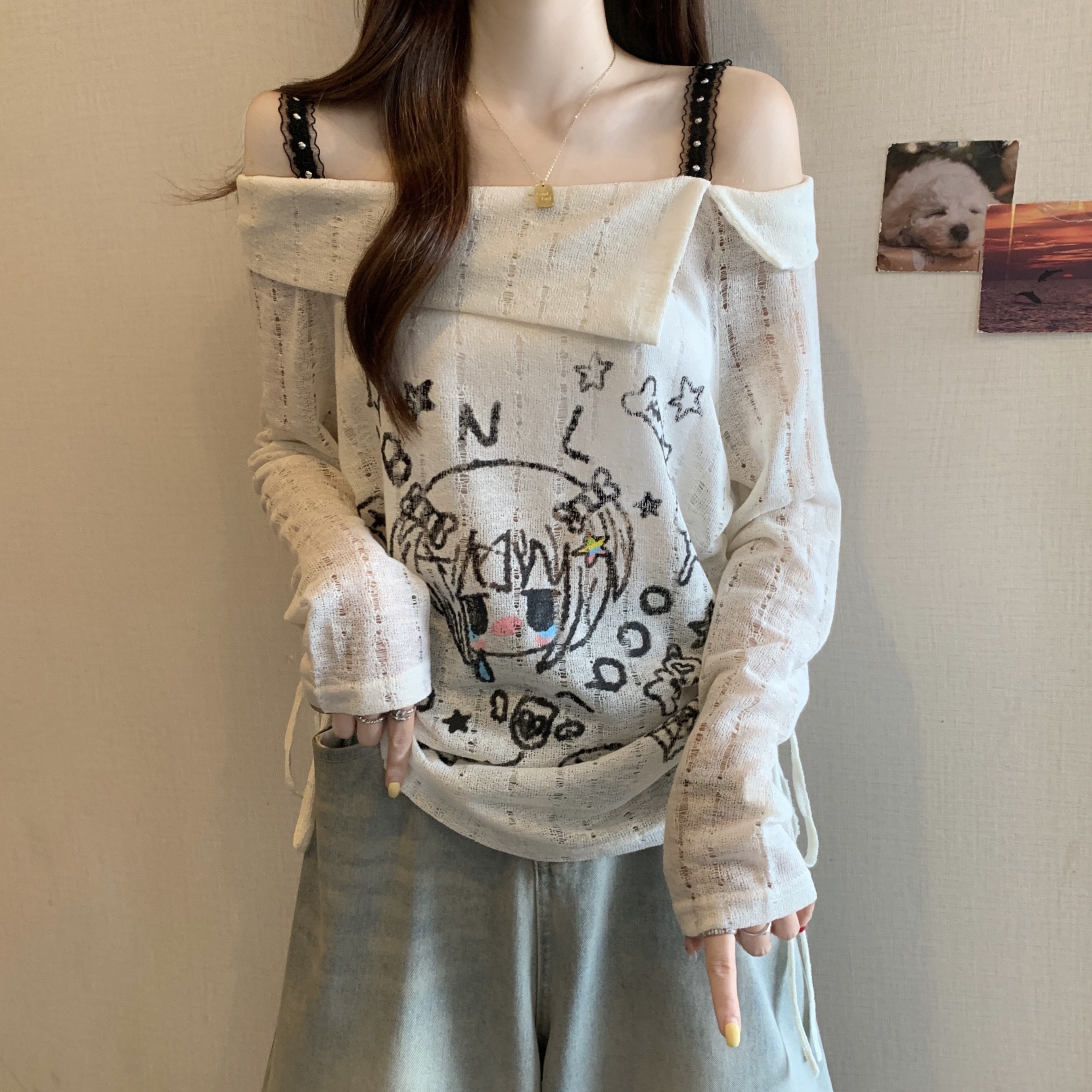 빅 사이즈 여성 의류 2026 새로운 아메리칸 만화 프린트 긴팔 여성 고급 센스 허리 수축 슬림해 보이는 아름다운 오프숄더 맨위
