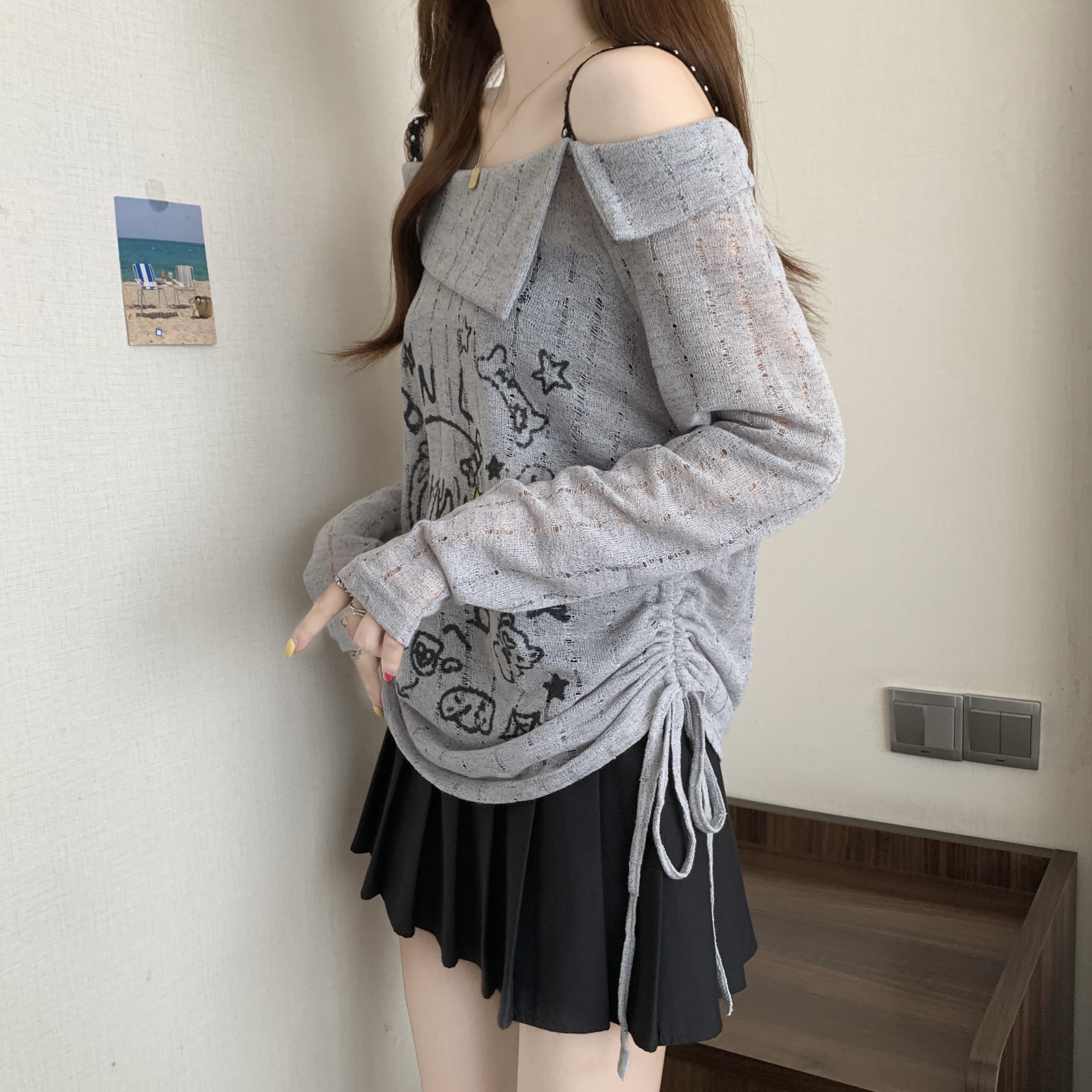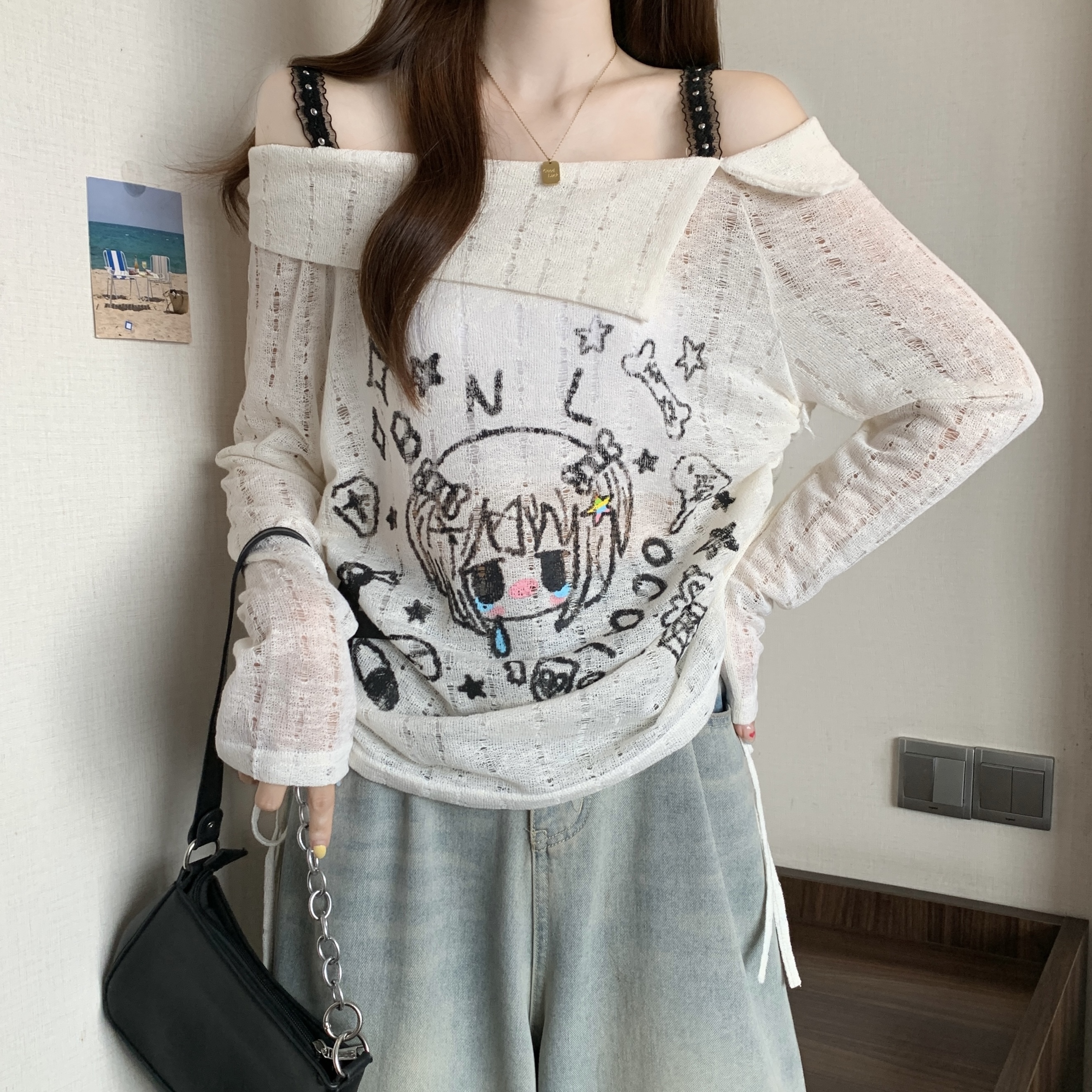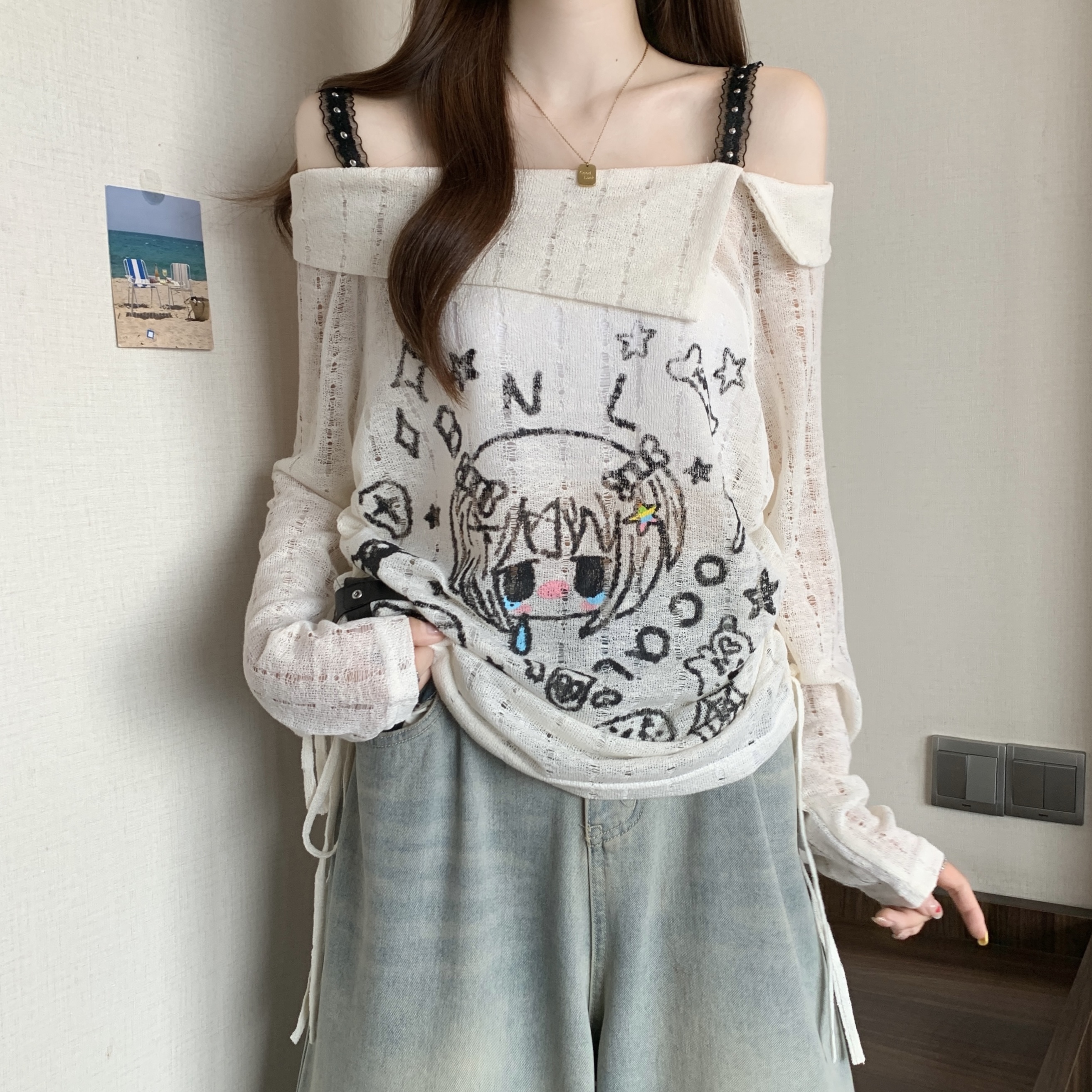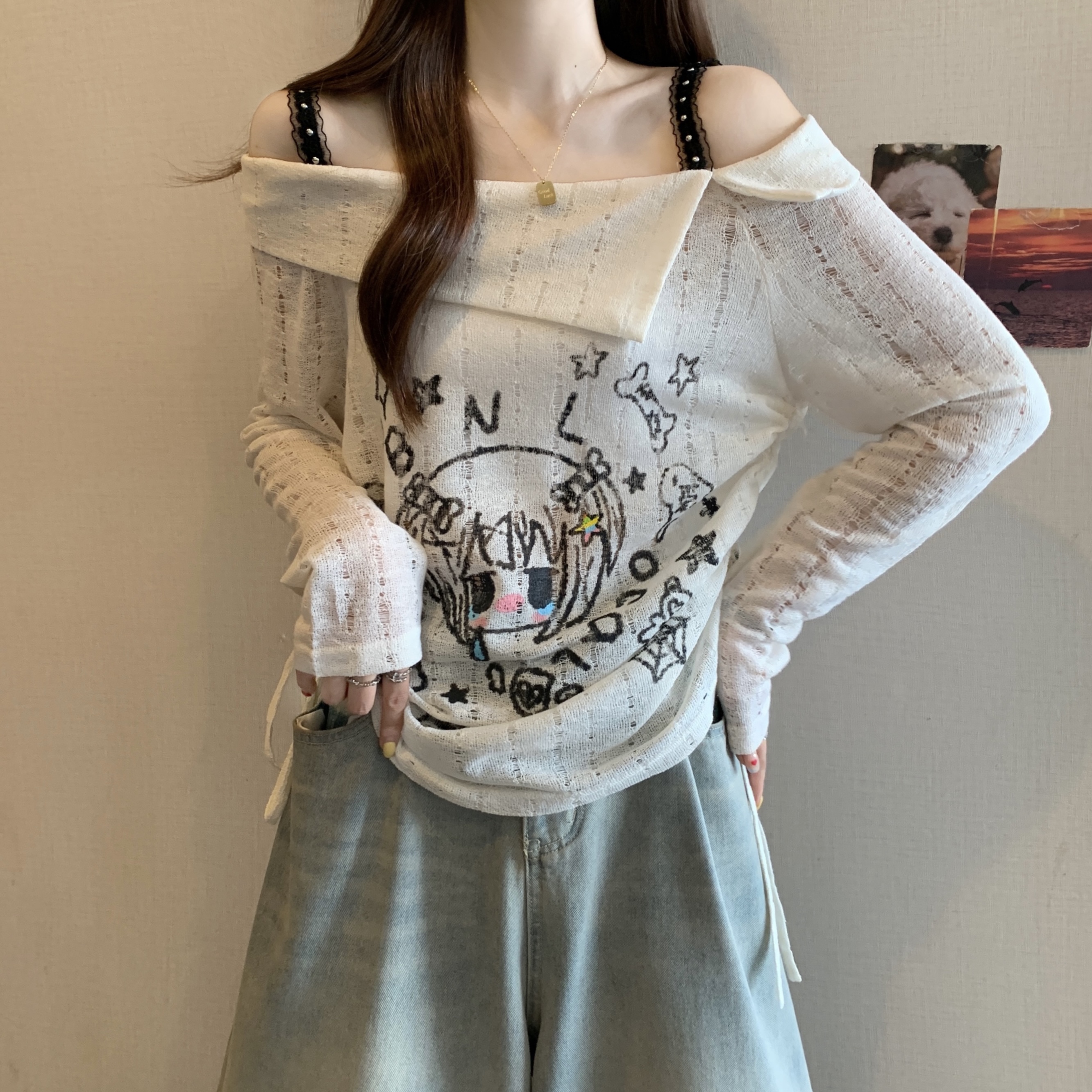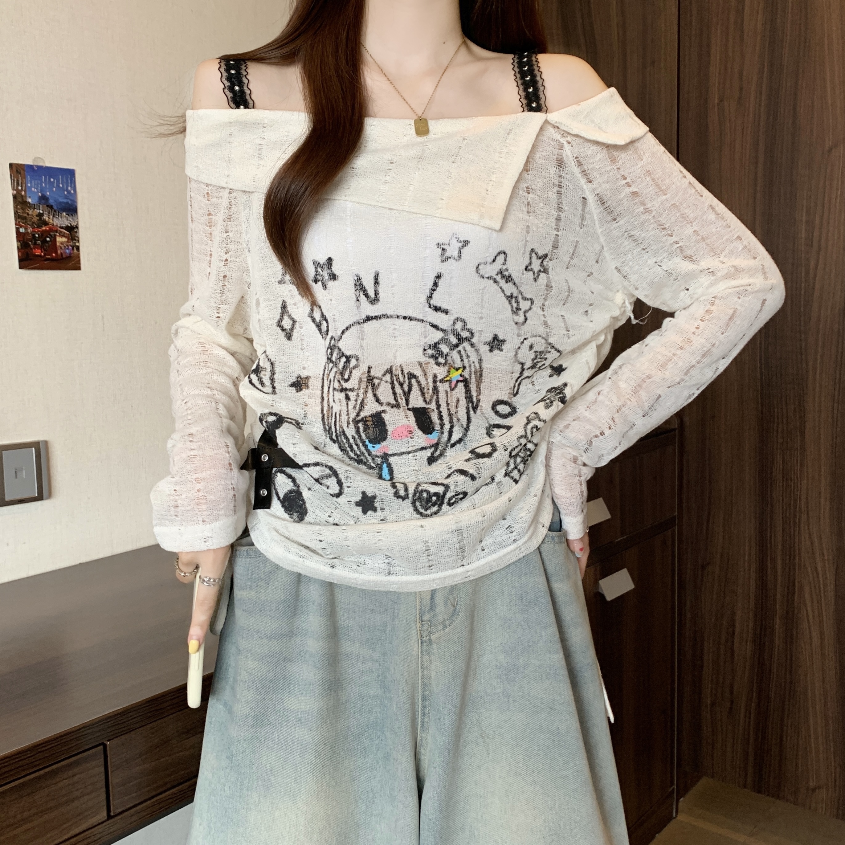 빅 사이즈 여성 의류 2026 새로운 아메리칸 만화 프린트 긴팔 여성 고급 센스 허리 수축 슬림해 보이는 아름다운 오프숄더 맨위