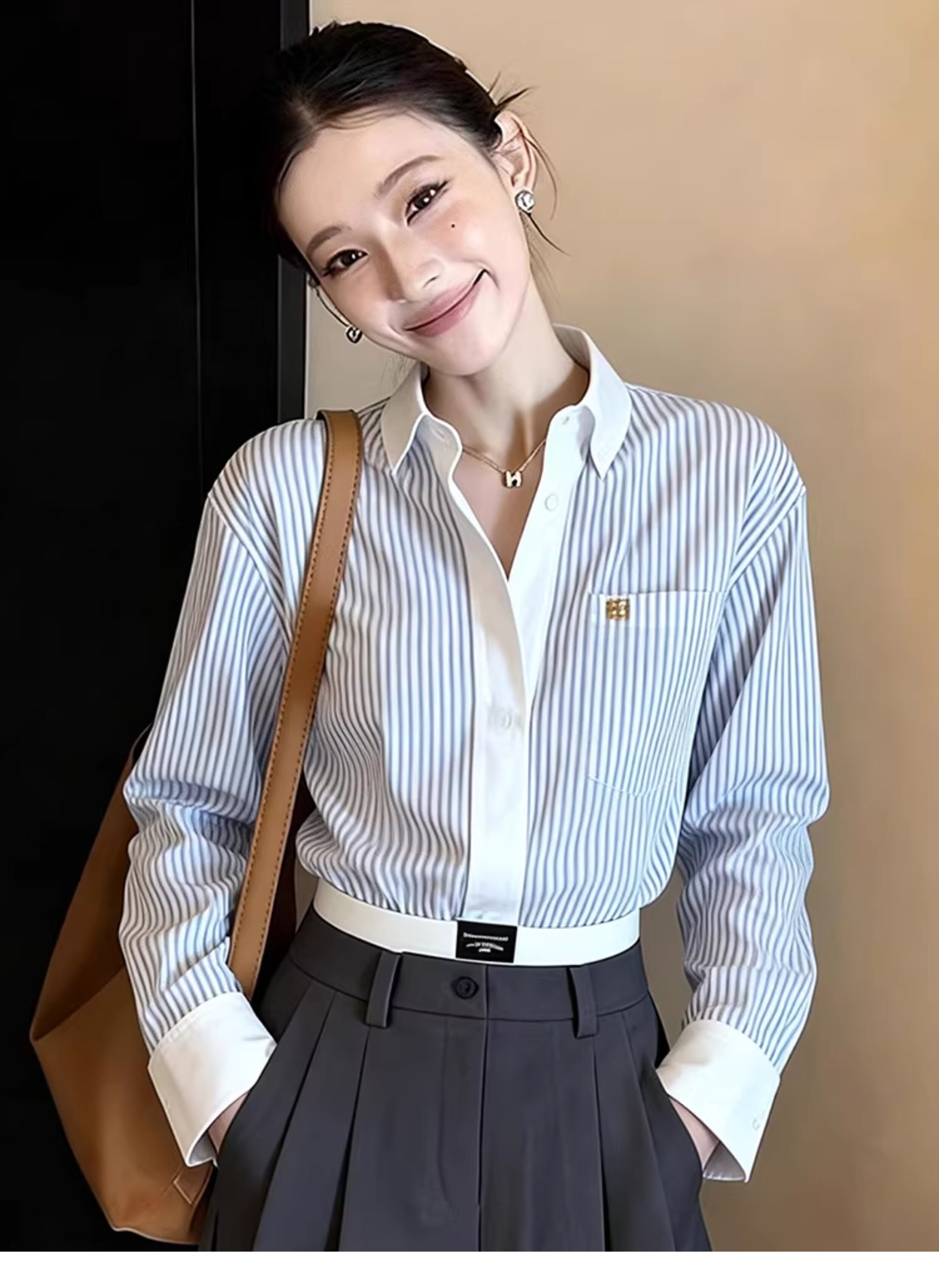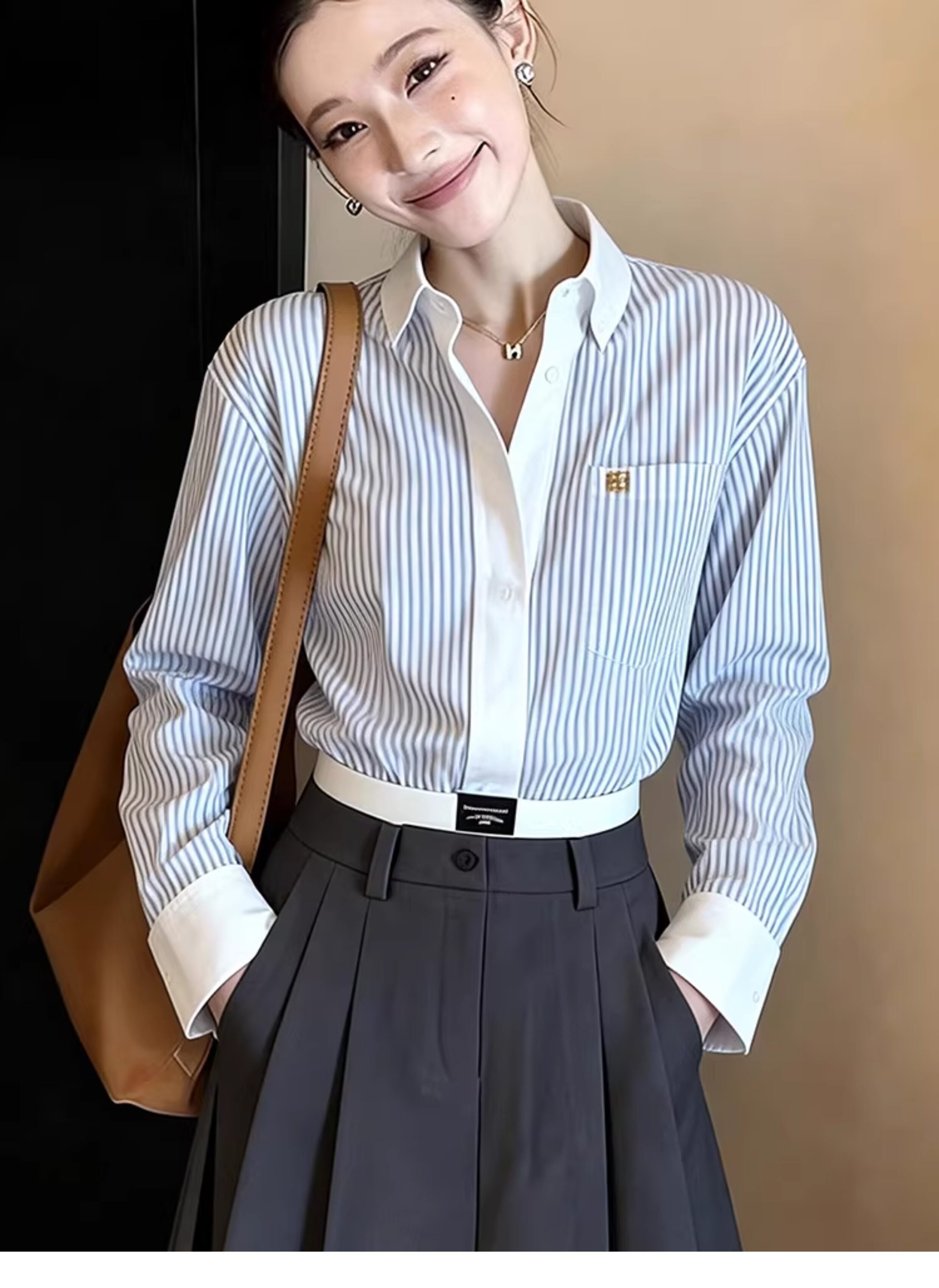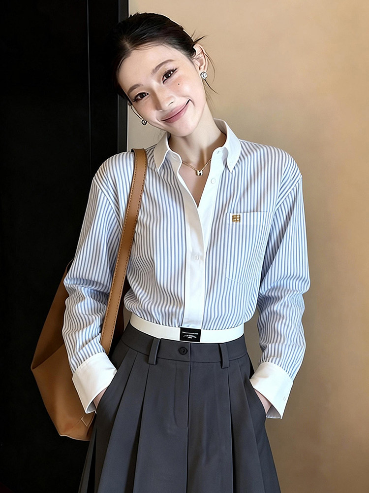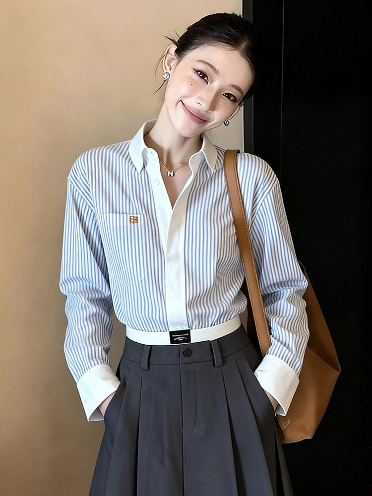 한 부서 디자인 센스 면 린넨 펌프 로프 허리 수축 스트라이프 여성 셔츠 봄 미니멀리즘 다용도 품격 다용도 루즈핏 맨위