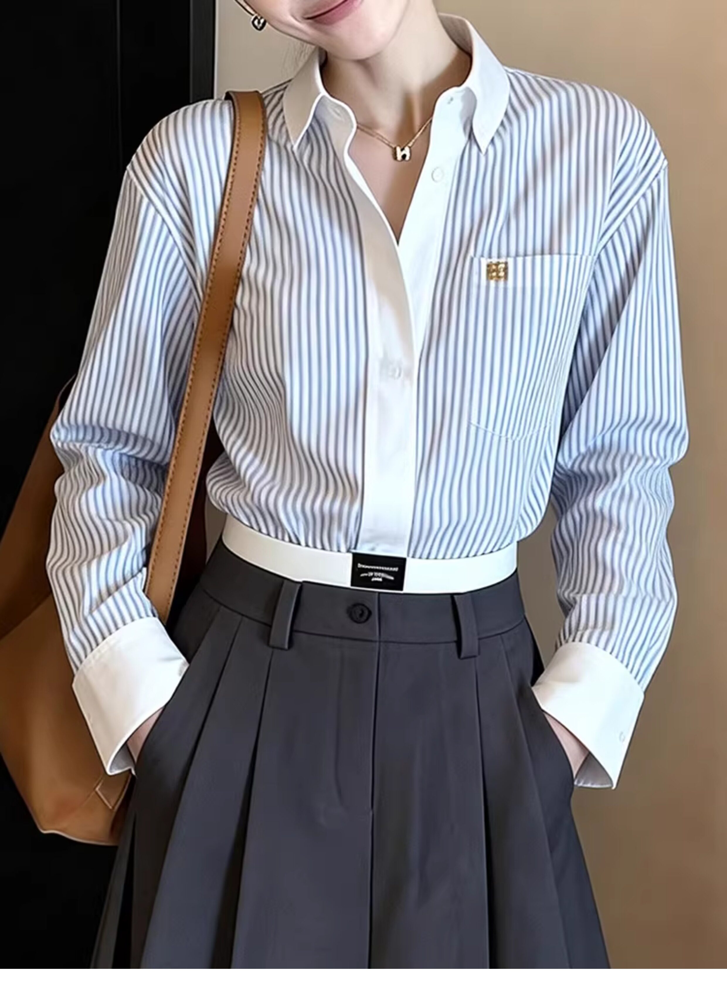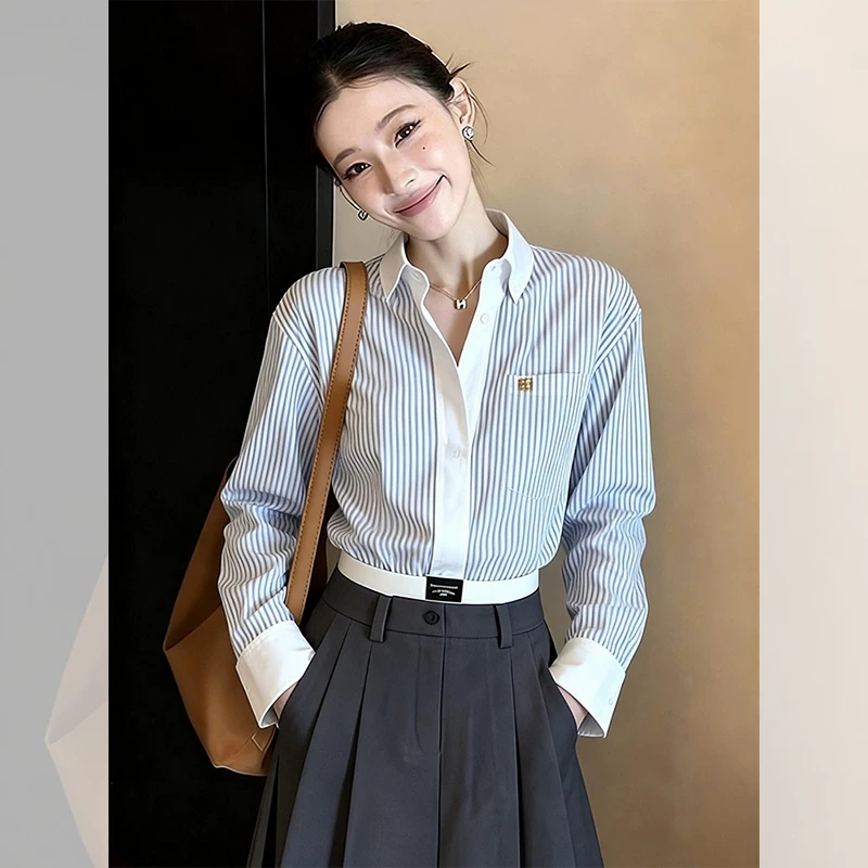 회색 스트라이프 여성 셔츠 2026 봄 새로운 패션 외국 가스 연령 감소 레이스업 허리 수축 슬림해 보이는 캐주얼 맨위