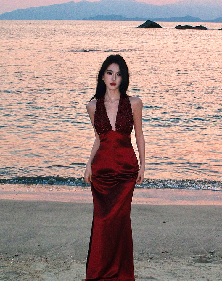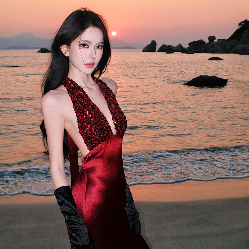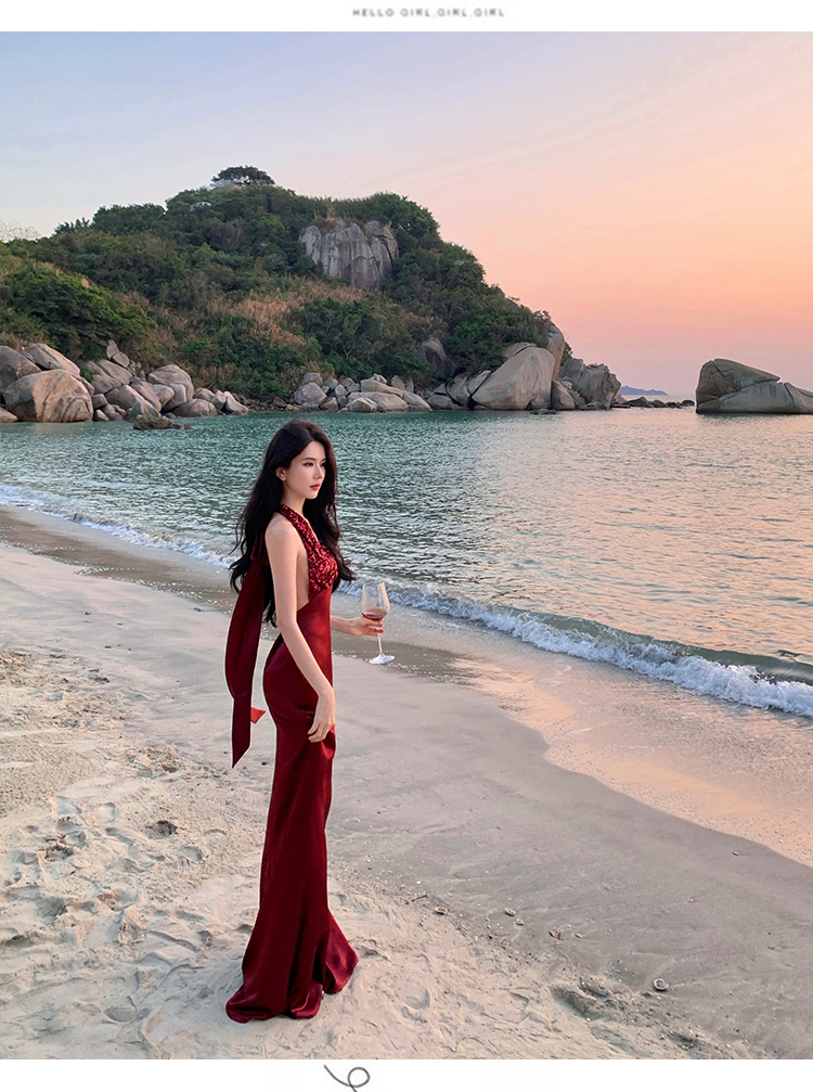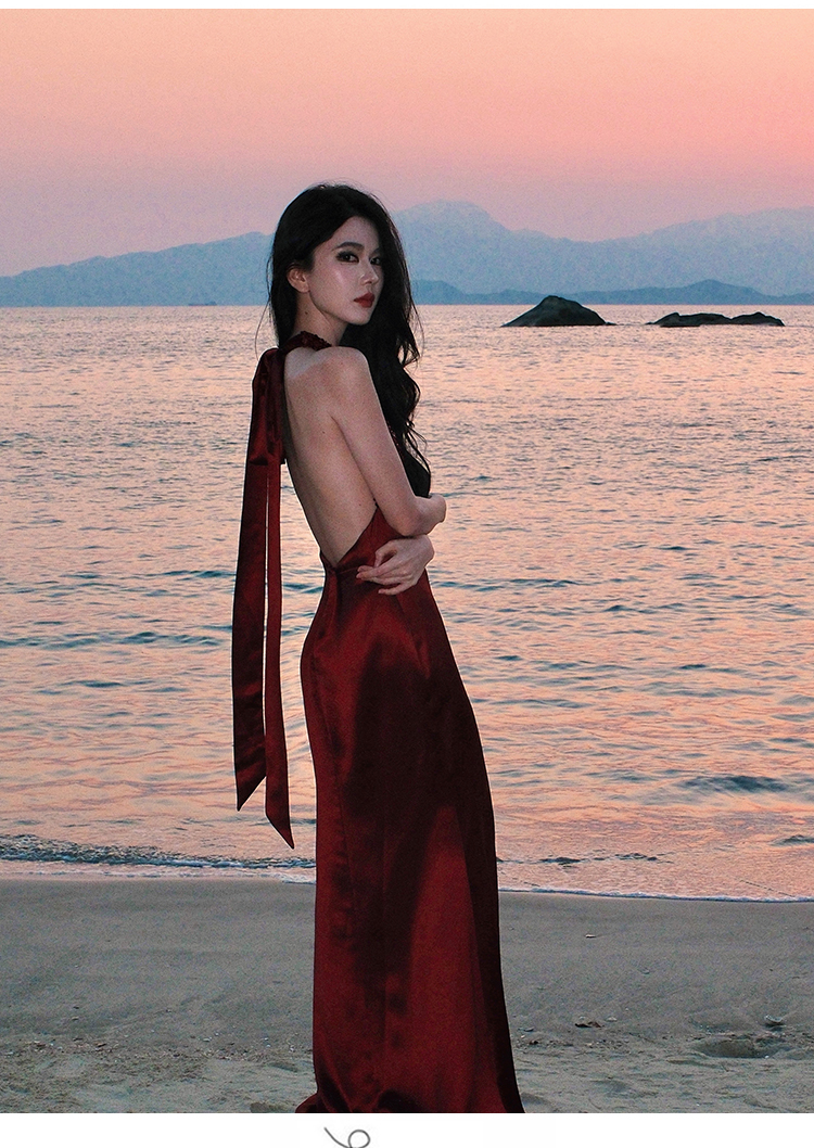 레이스 조각 백리스 슬립 여성 드레스 여름 허리 수축 슬림해 보이는 빅 플레어 스커트 부드러운 휴가 바람 한 마디 롱 스커트