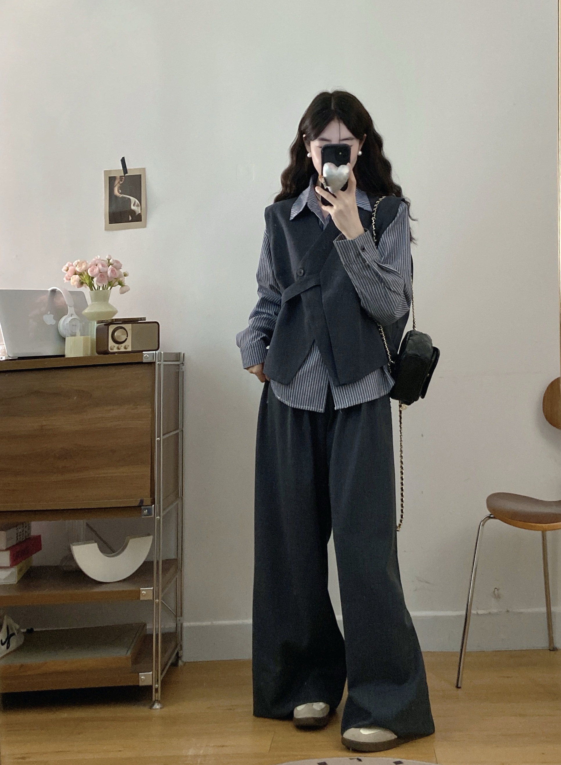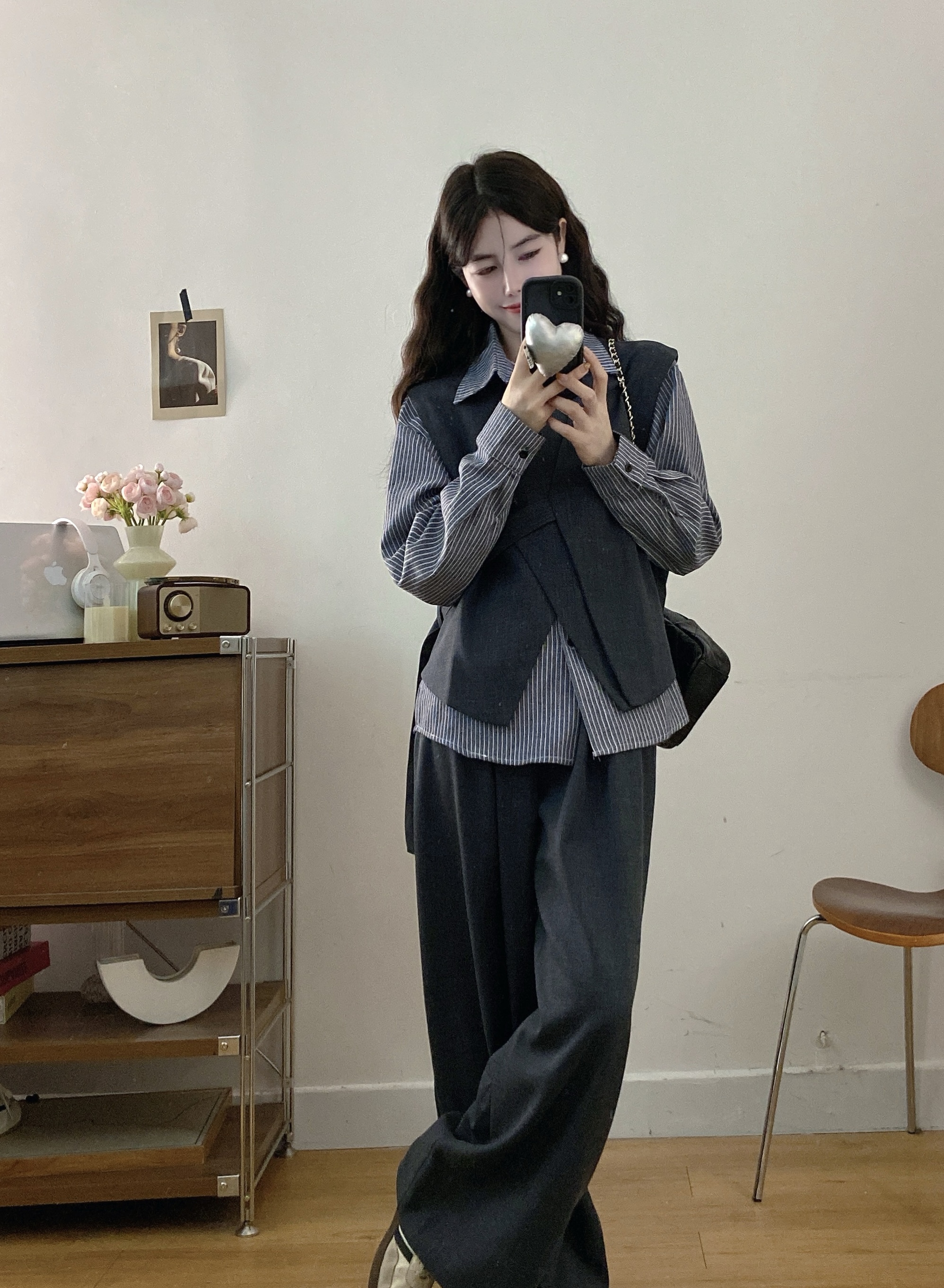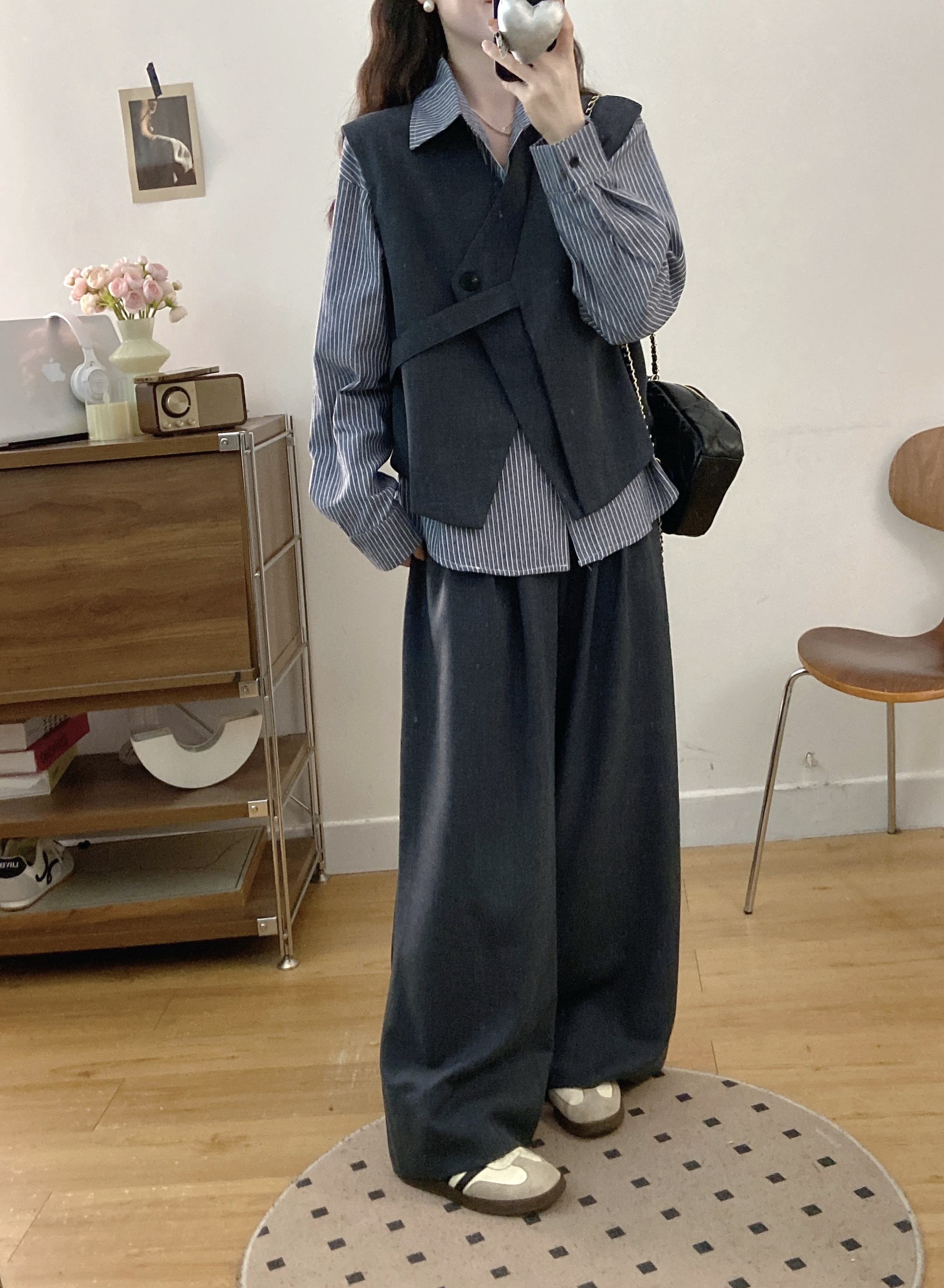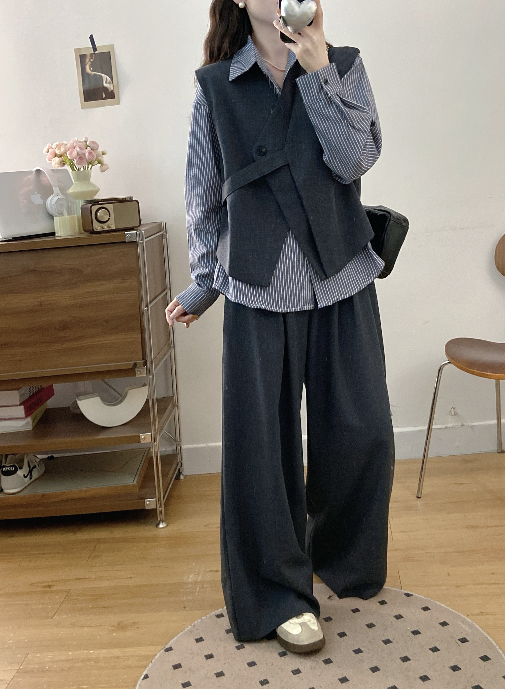 실사 빅 사이즈 여성 의류 2026 봄 새로운 한국 스타일 고급 센스 베스트 셔츠 와이드 레그 팬츠 3종 세트