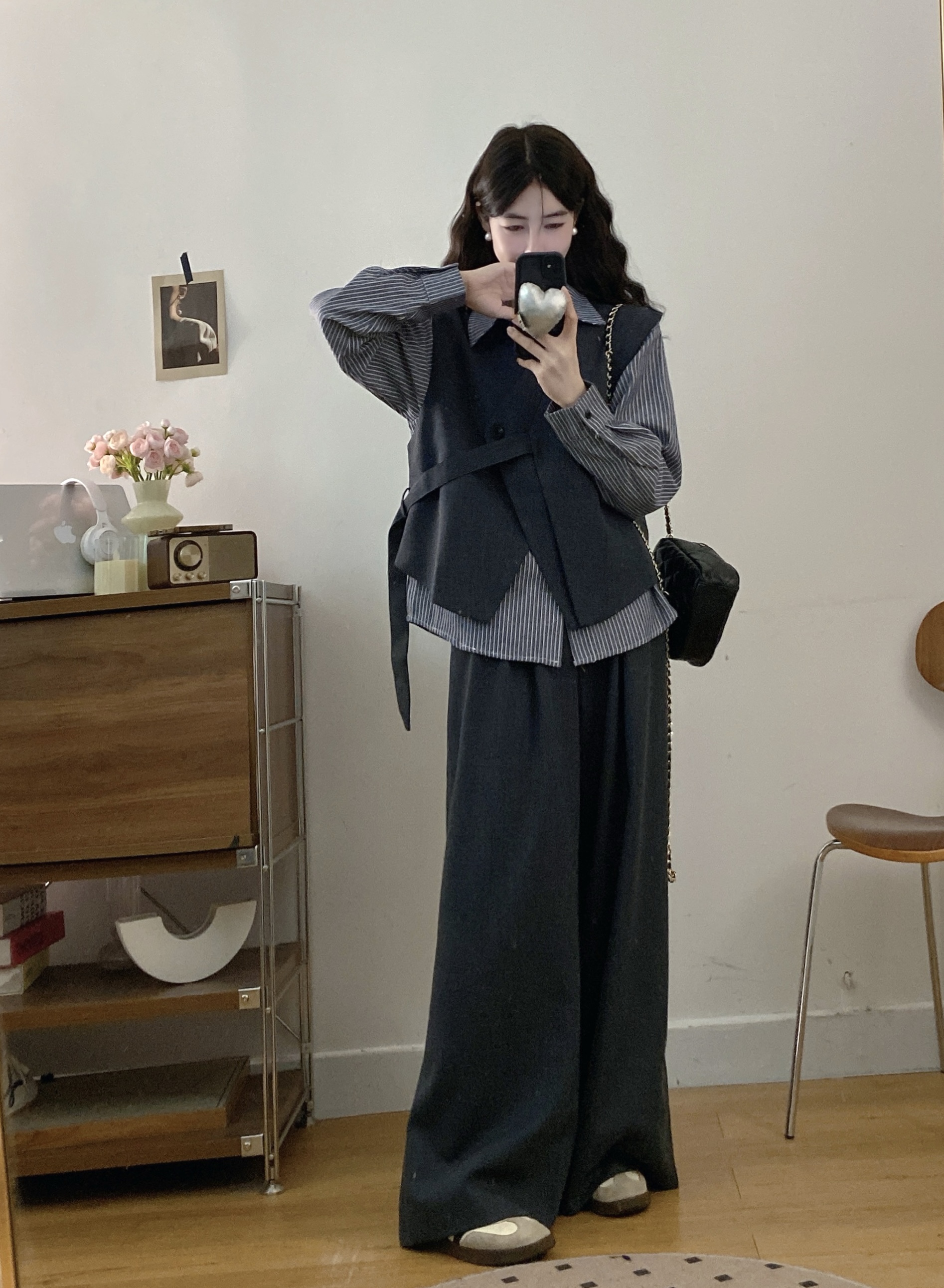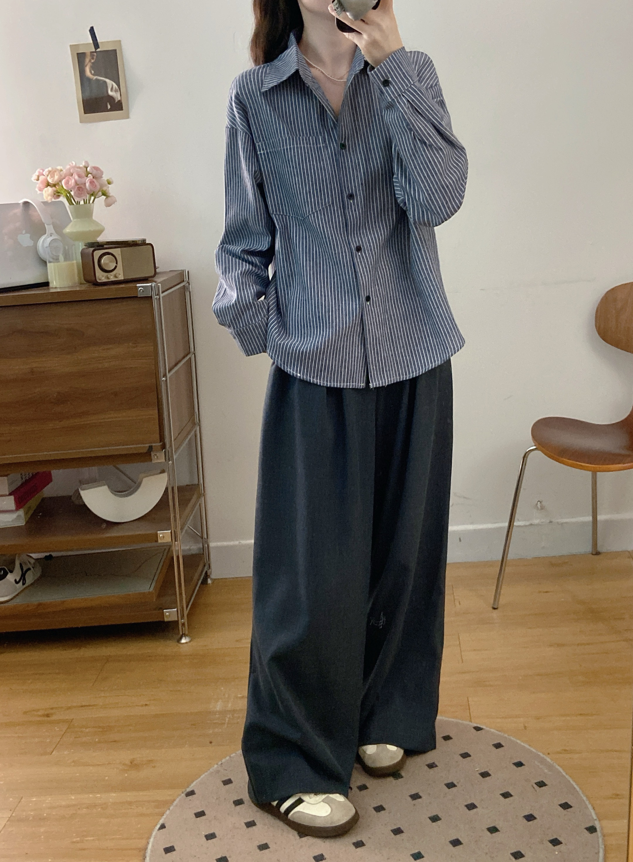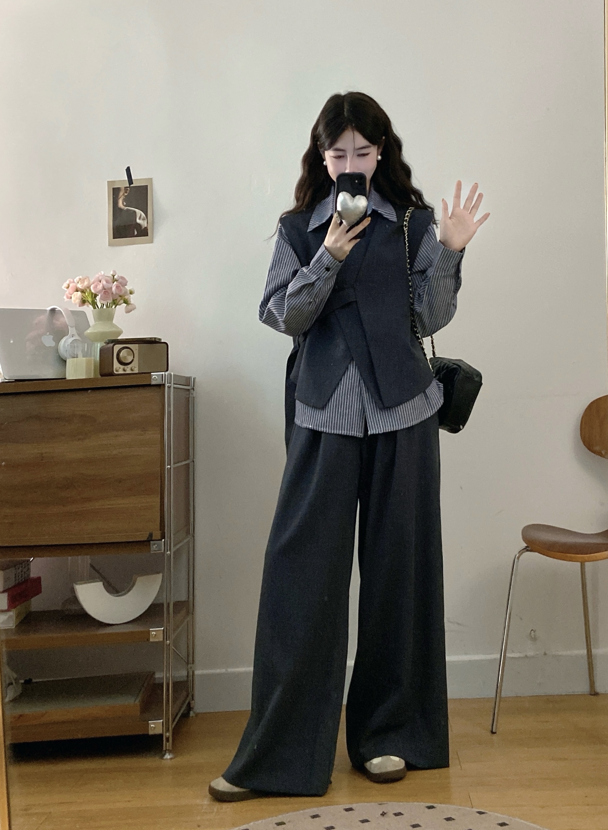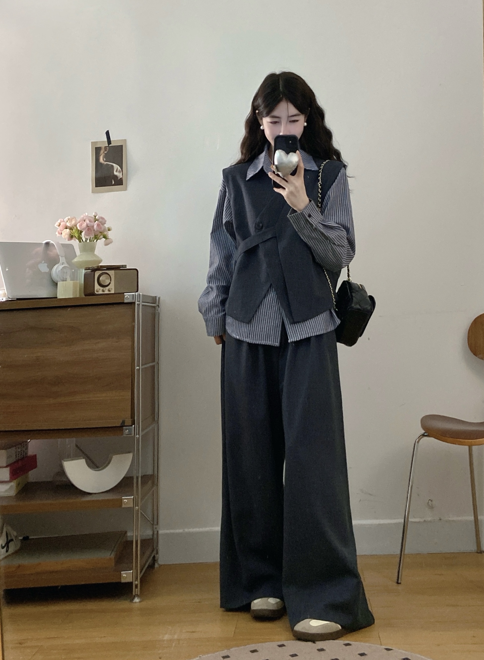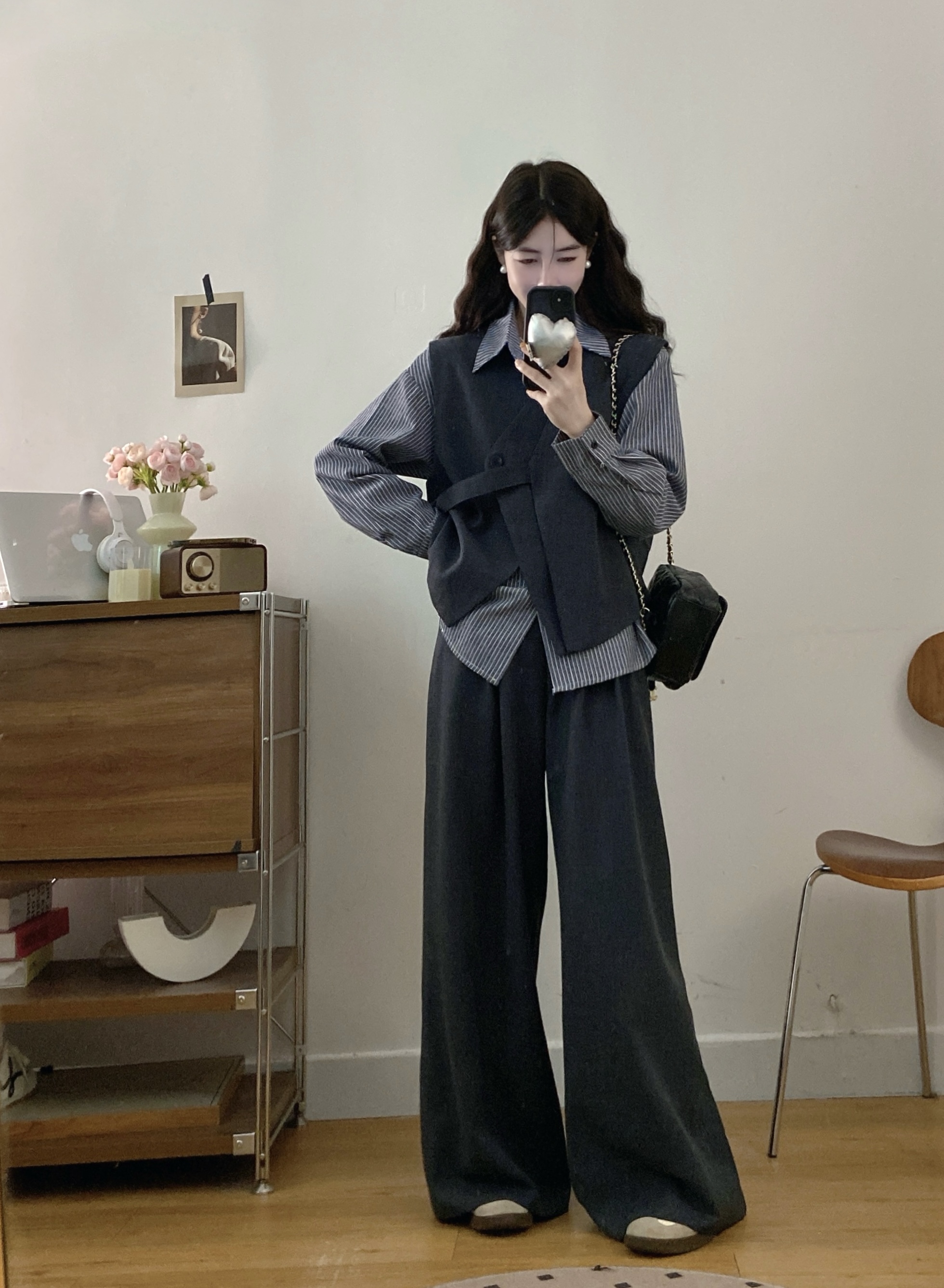 실사 빅 사이즈 여성 의류 2026 봄 새로운 한국 스타일 고급 센스 베스트 셔츠 와이드 레그 팬츠 3종 세트