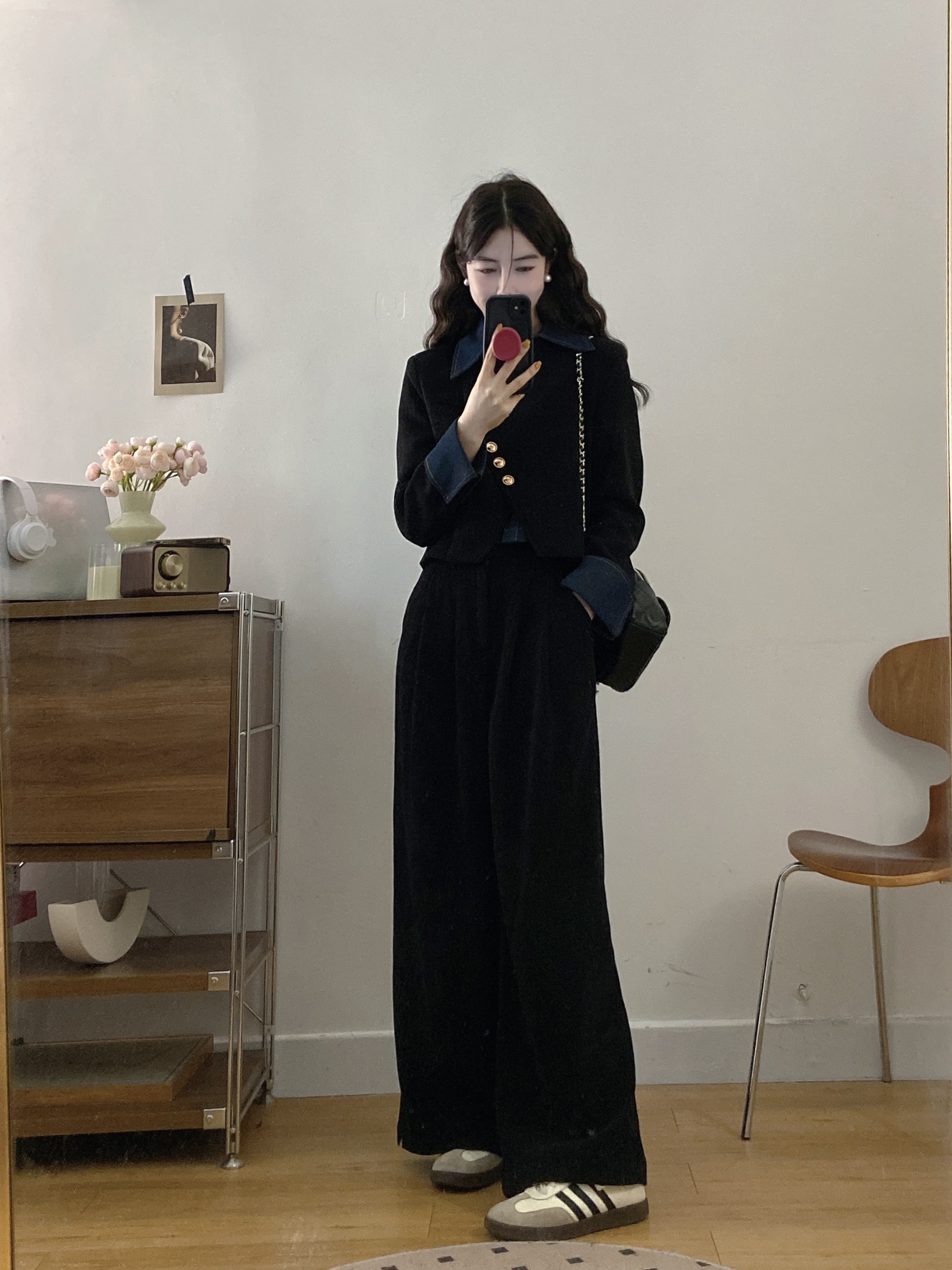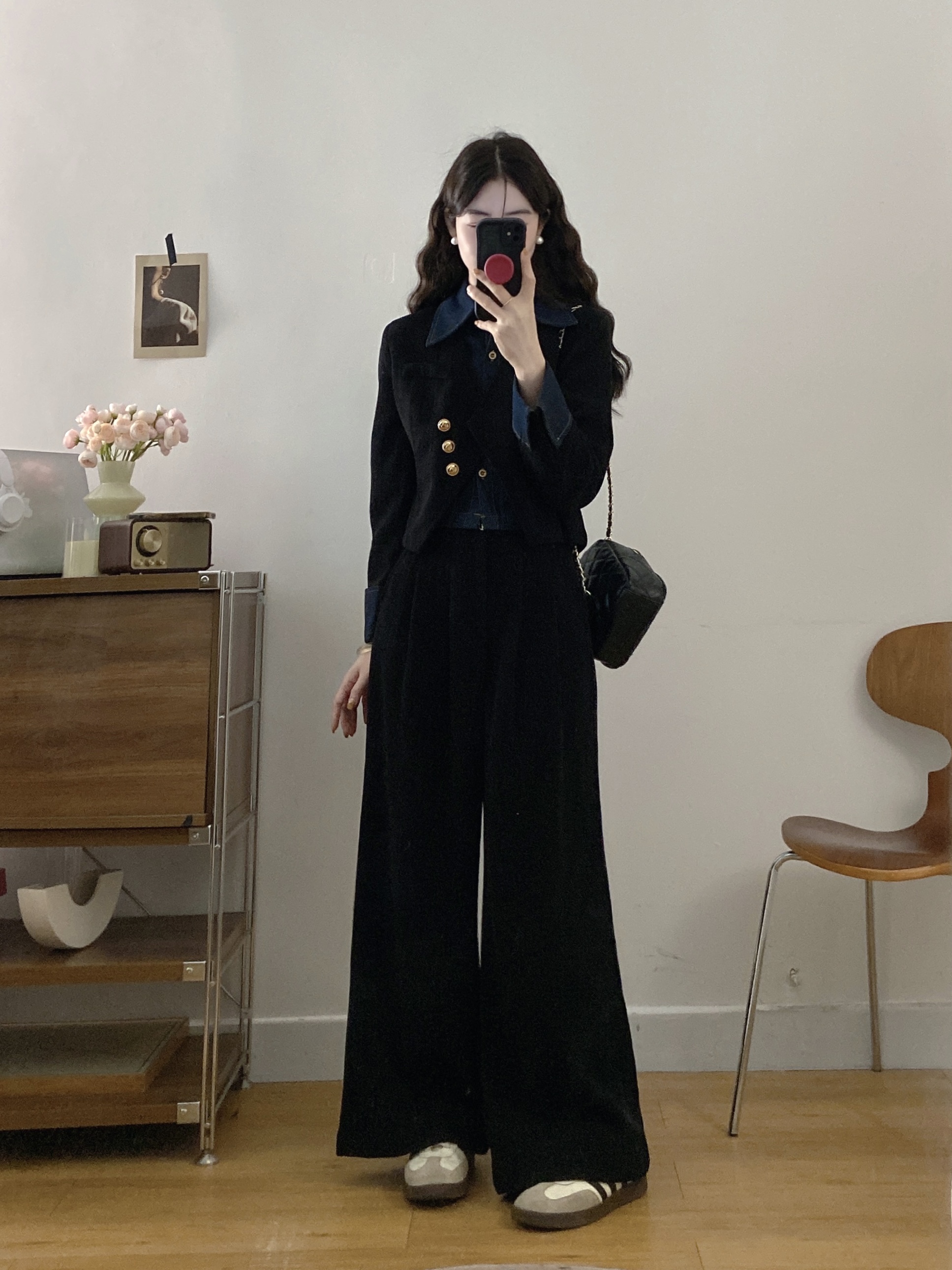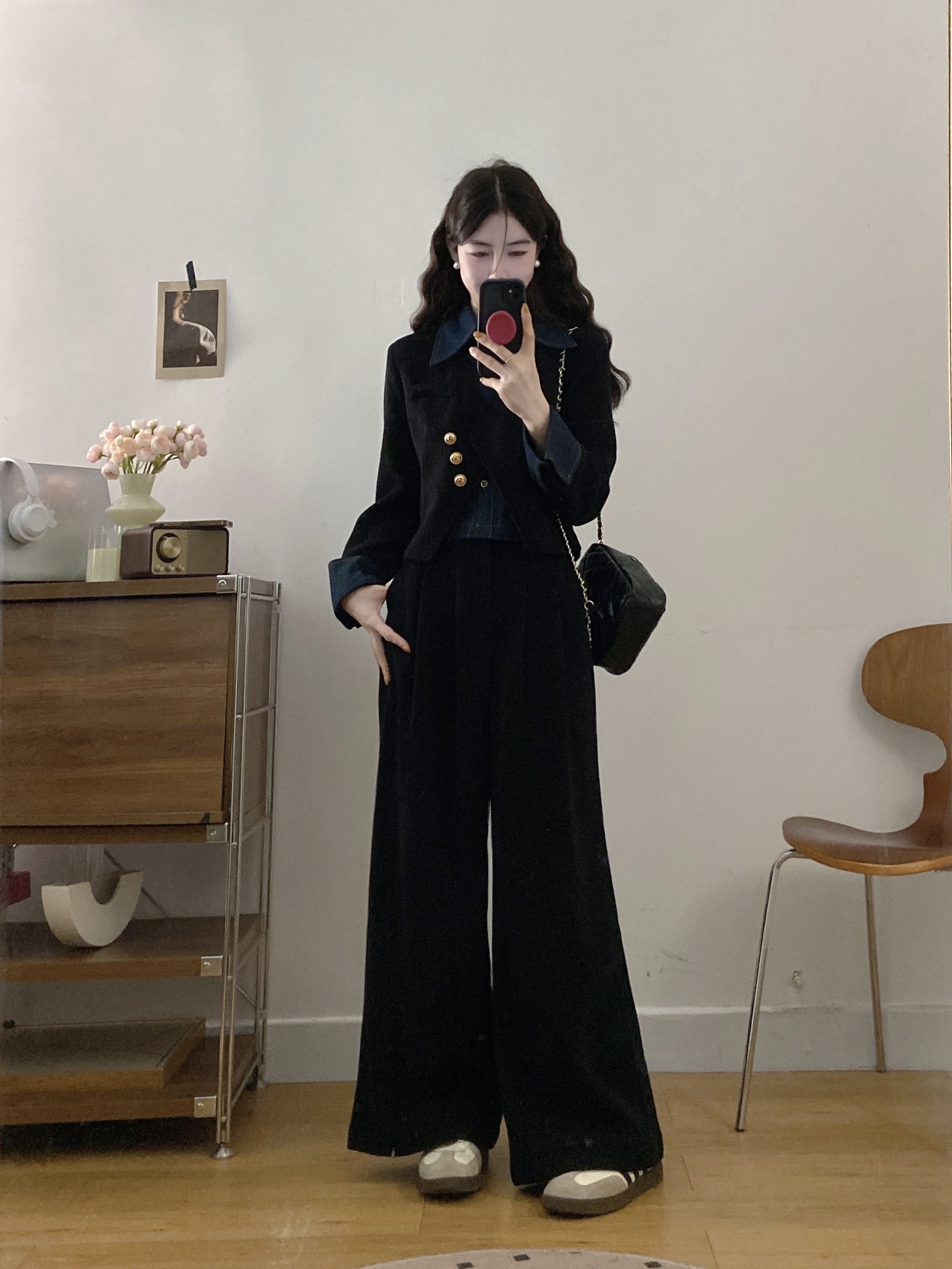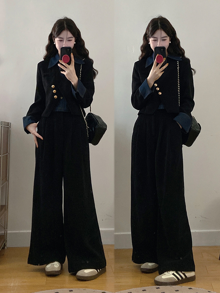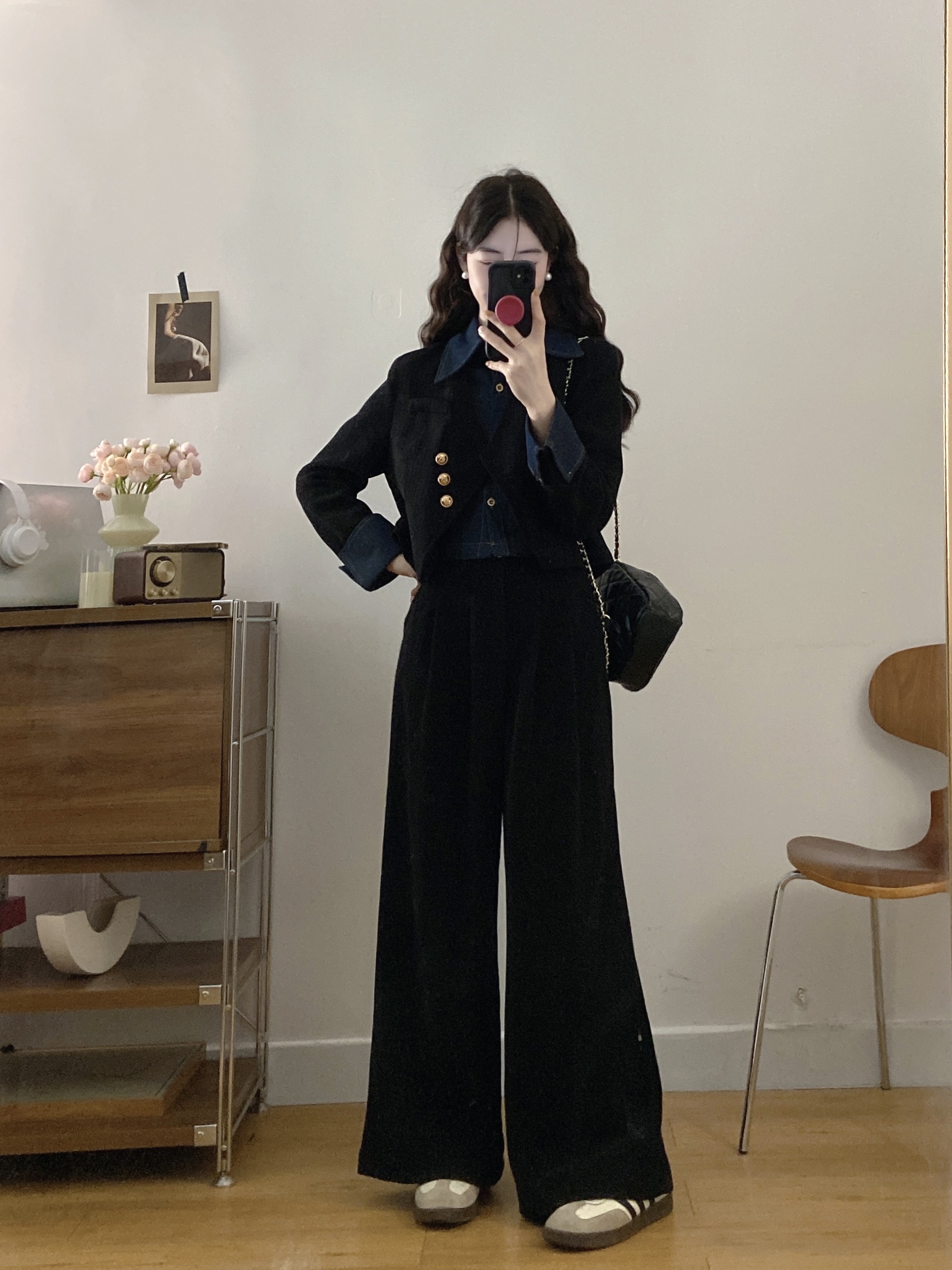 실사 빅 사이즈 여성 의류 2026 봄 새로운 고급 센스 슬림해 보이는 페이크 레이어드 재킷 와이드 레그 팬츠 투피스 세트