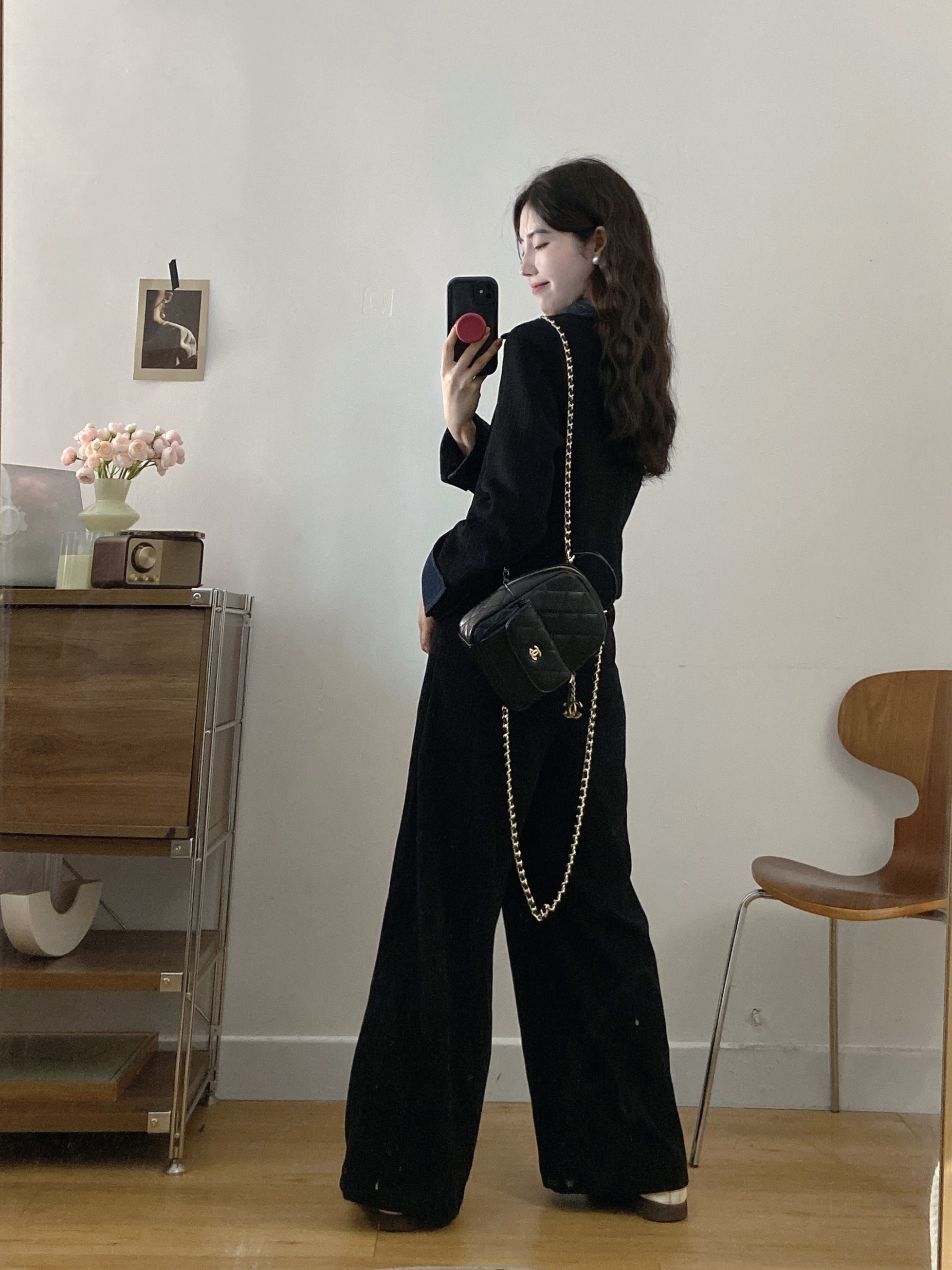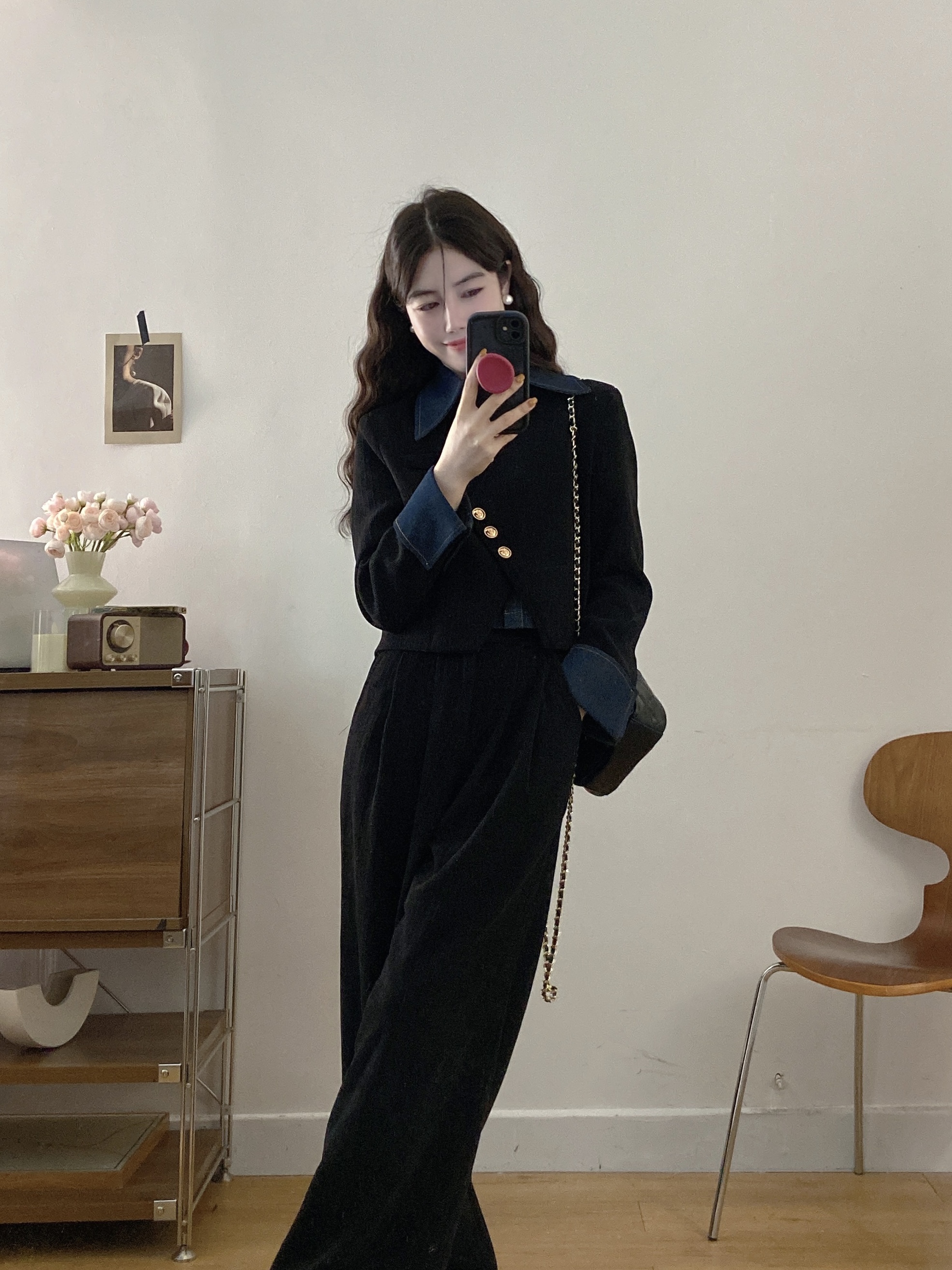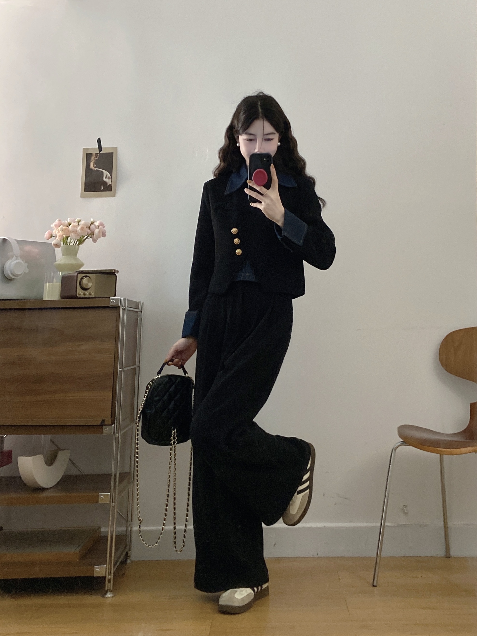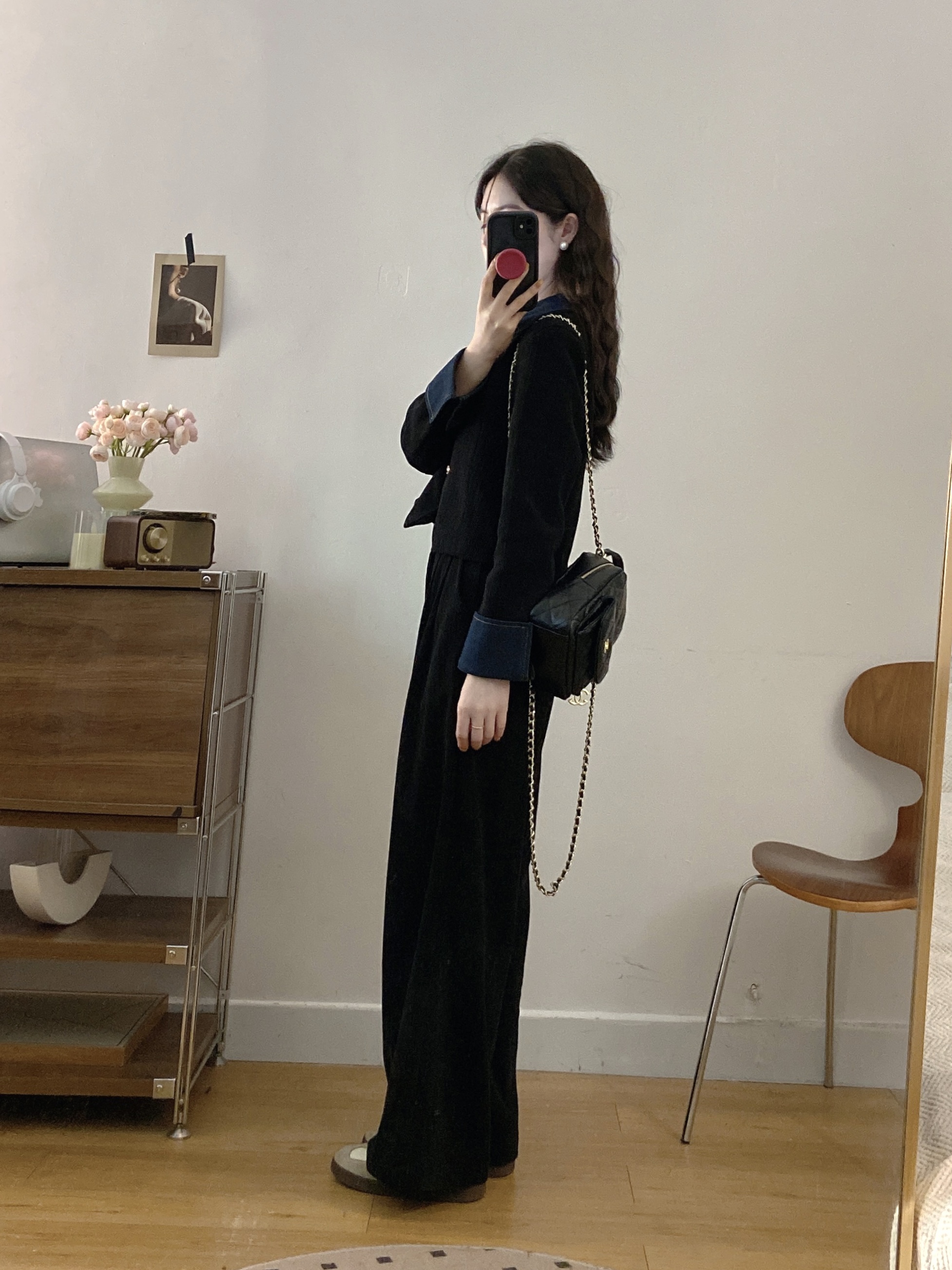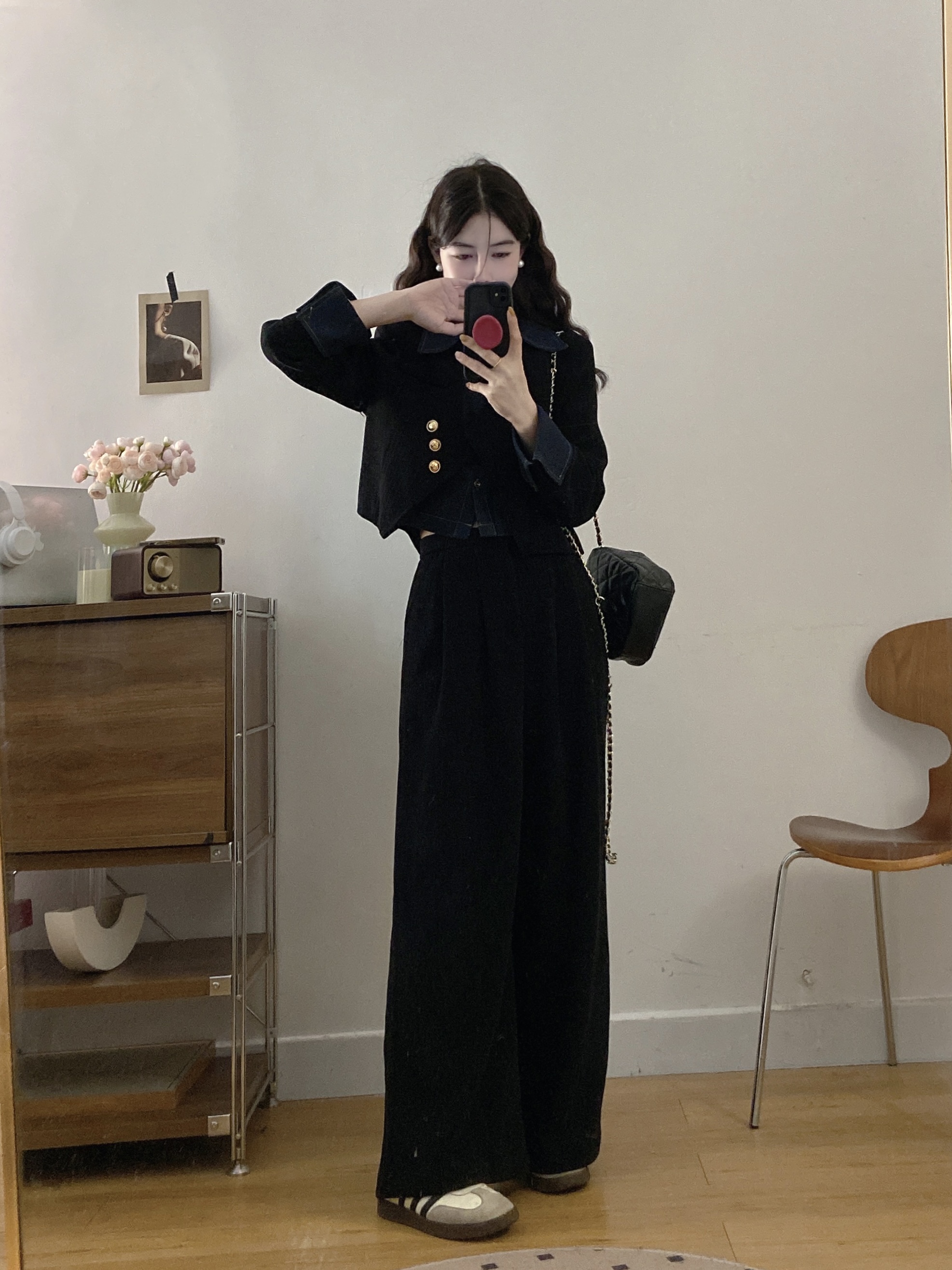 실사 빅 사이즈 여성 의류 2026 봄 새로운 고급 센스 슬림해 보이는 페이크 레이어드 재킷 와이드 레그 팬츠 투피스 세트