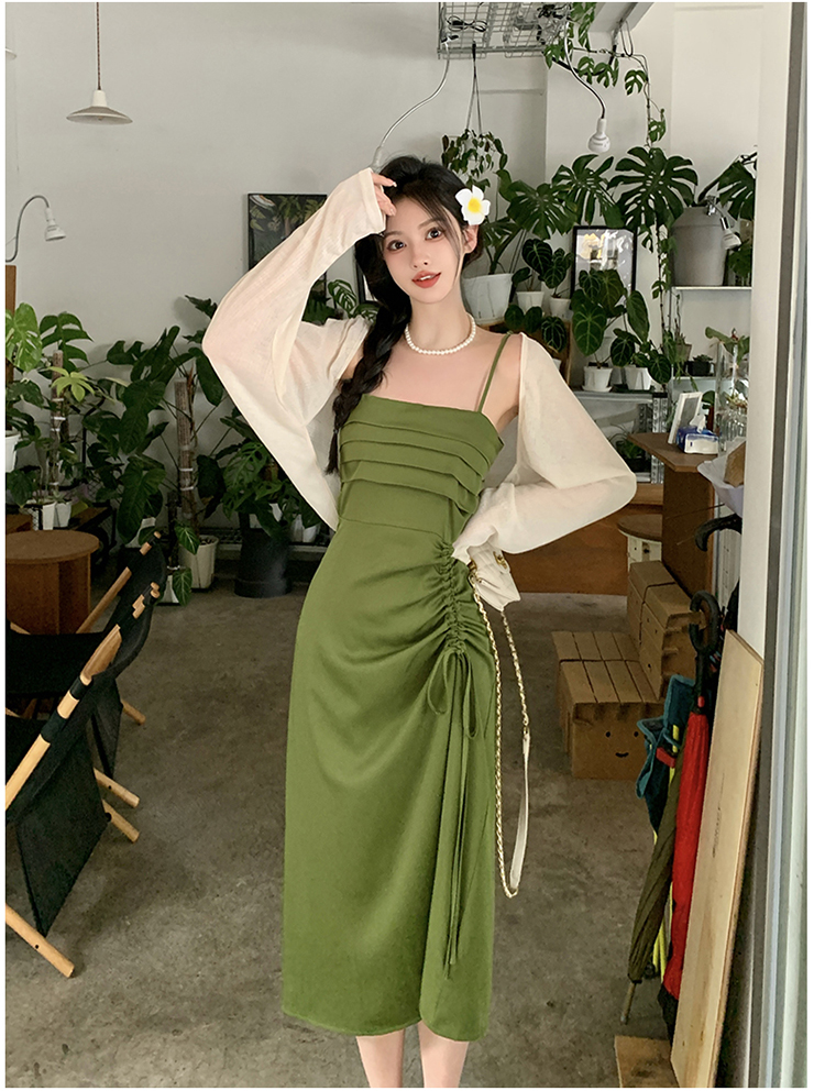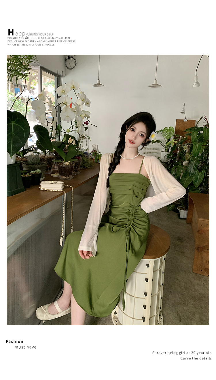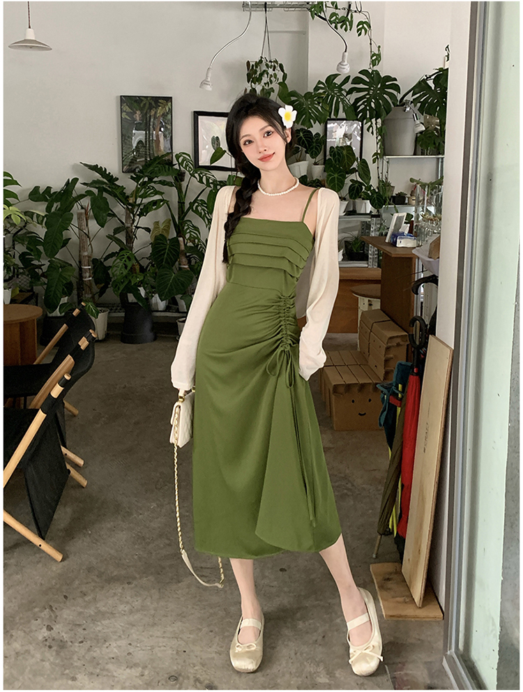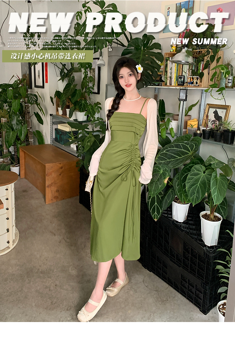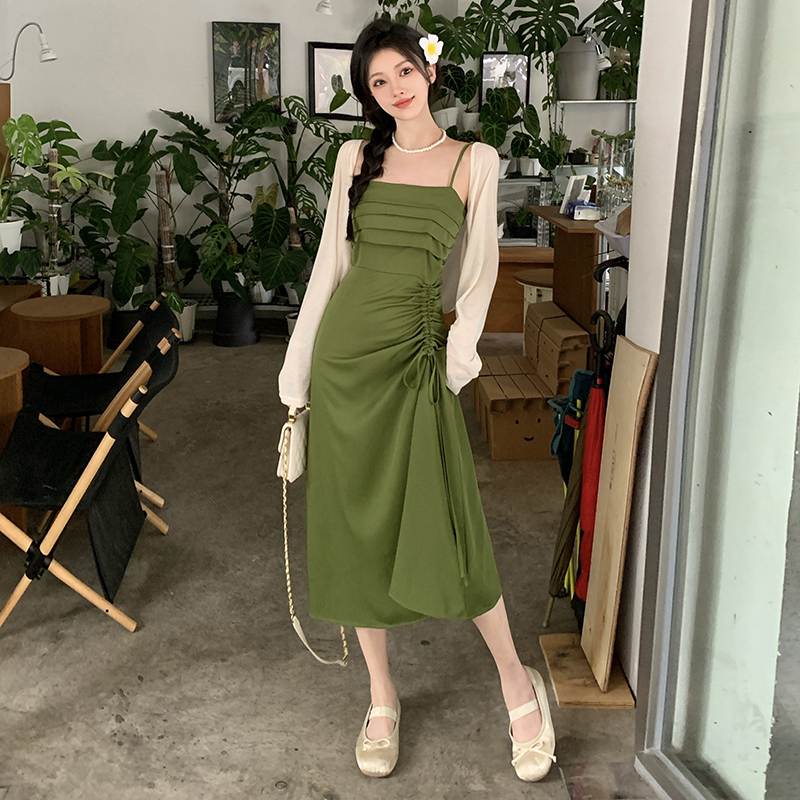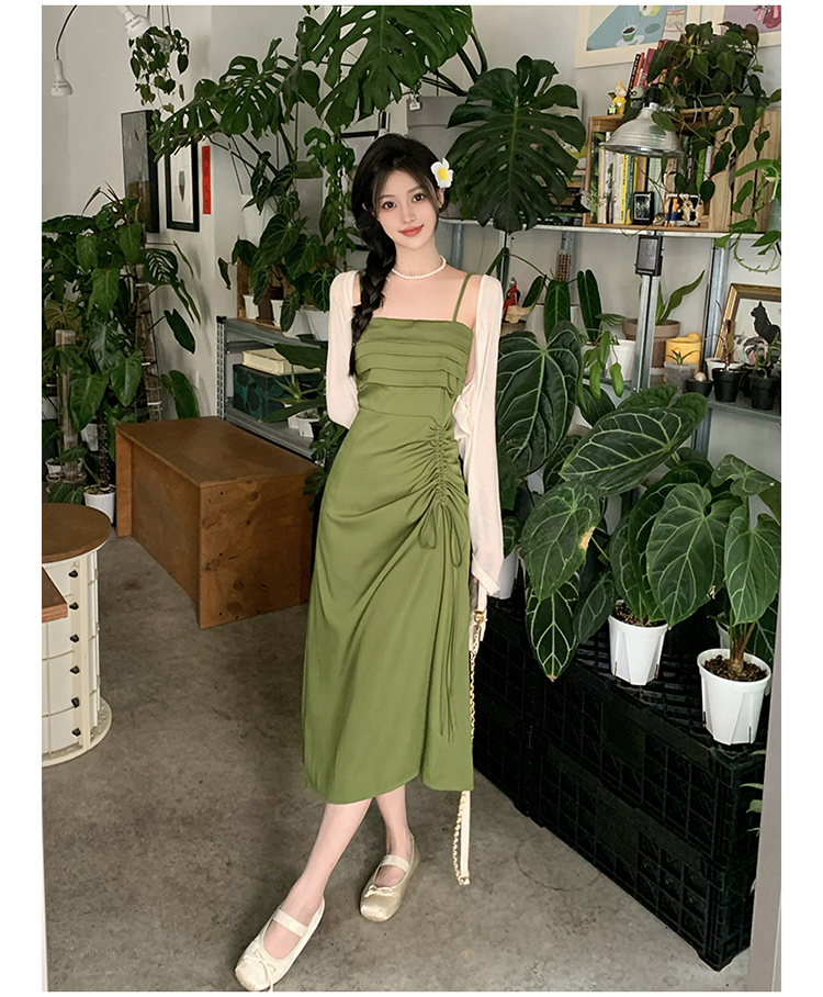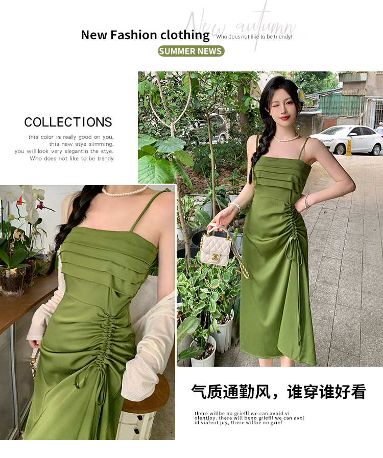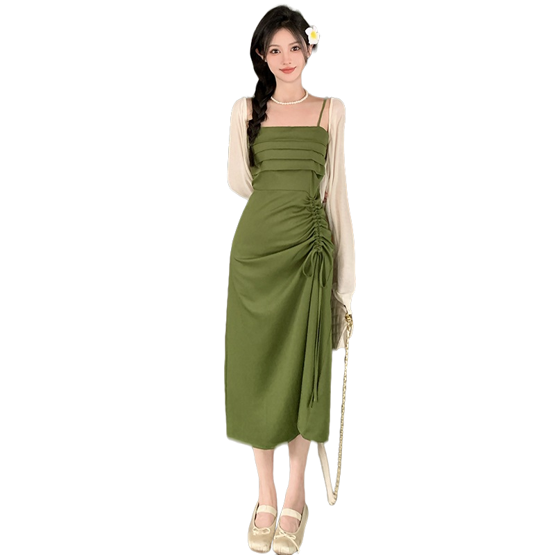 실사 마이크로 지방 빅 사이즈 녹색 슬립 롱 스커트 봄 여름 2026 지방 mm 품격 백리스 허리 수축 한 마디 드레스