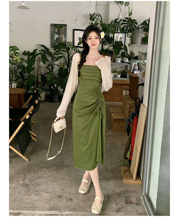 실사 빅 사이즈 꽃무늬 녹색 드레스 지방 mm 봄 여름 슬림해 보이는 표지 배 치마 프랑스식 슬립 롱 스커트 세트