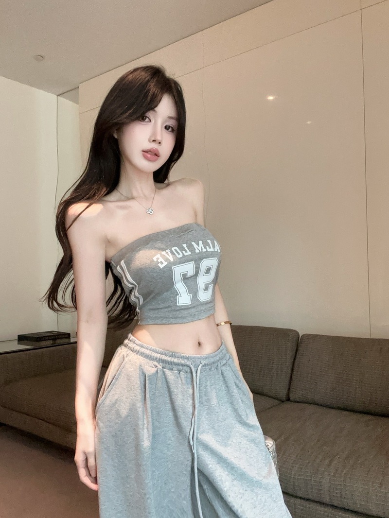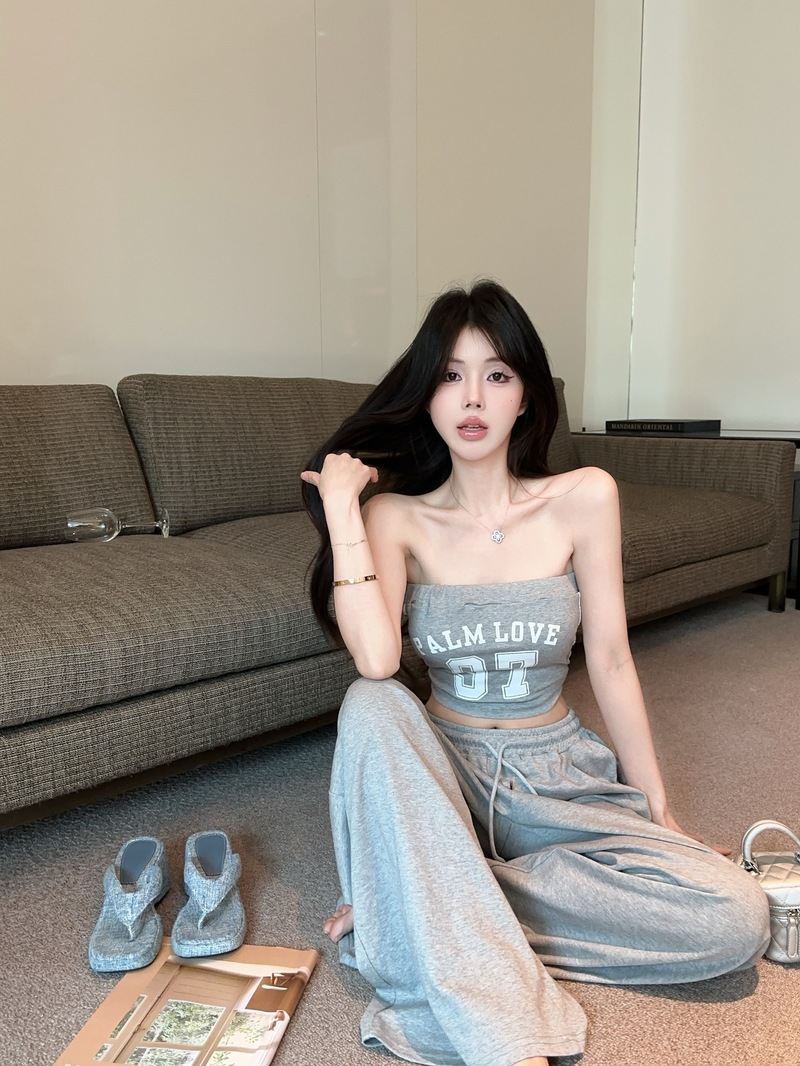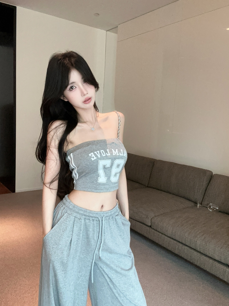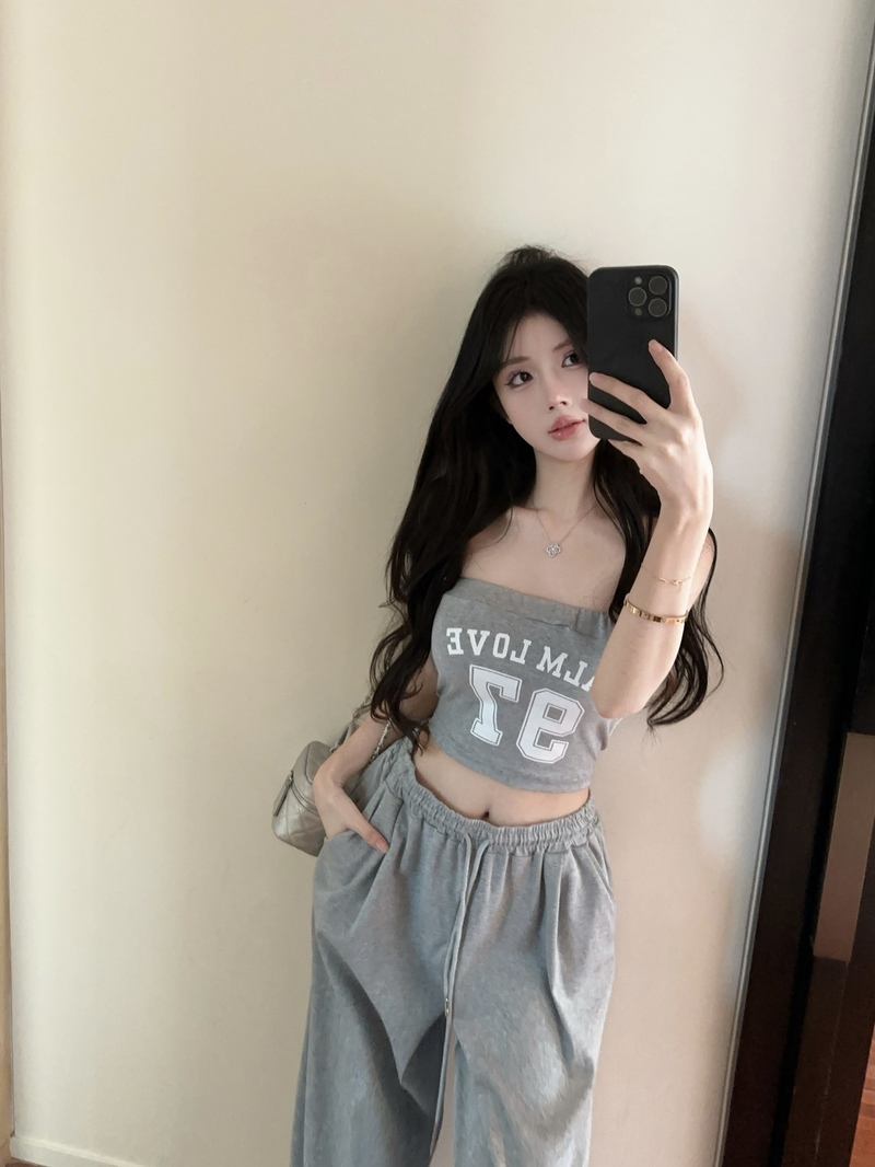 실사 정가 2026 봄 여름 알파벳 신축성 조끼 포장 가슴 티셔츠 슬림해 보이는 허리밴드 긴 바지 스포츠 슈트