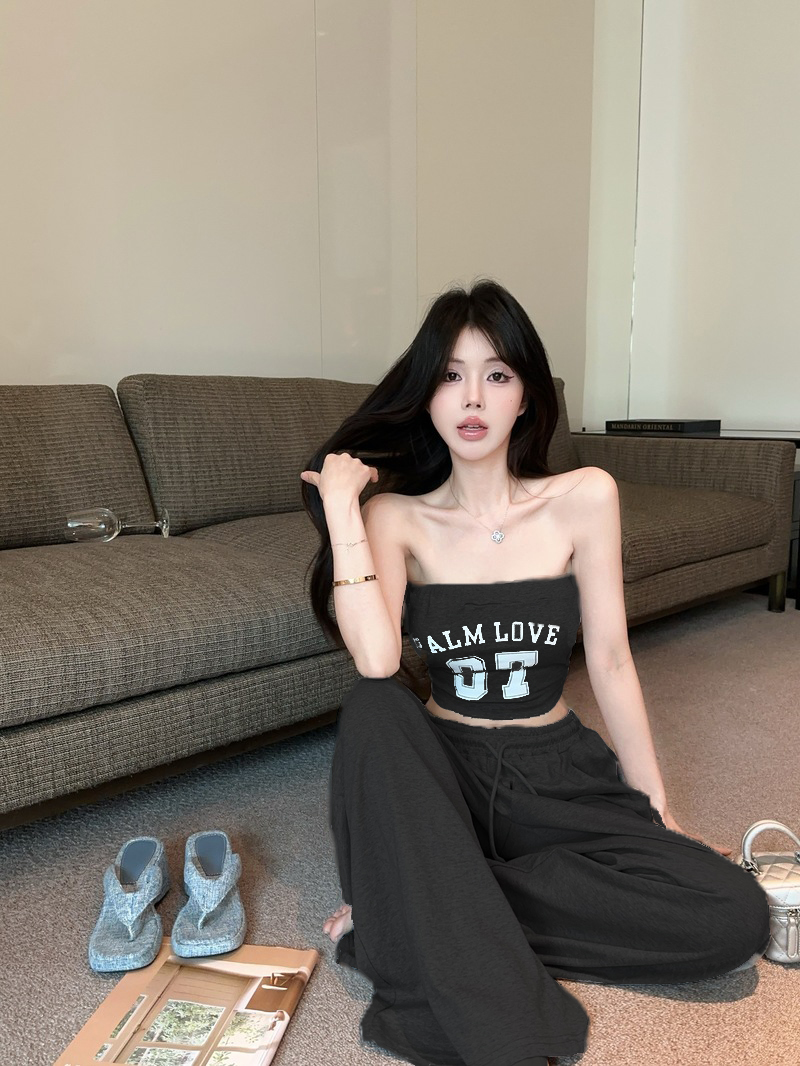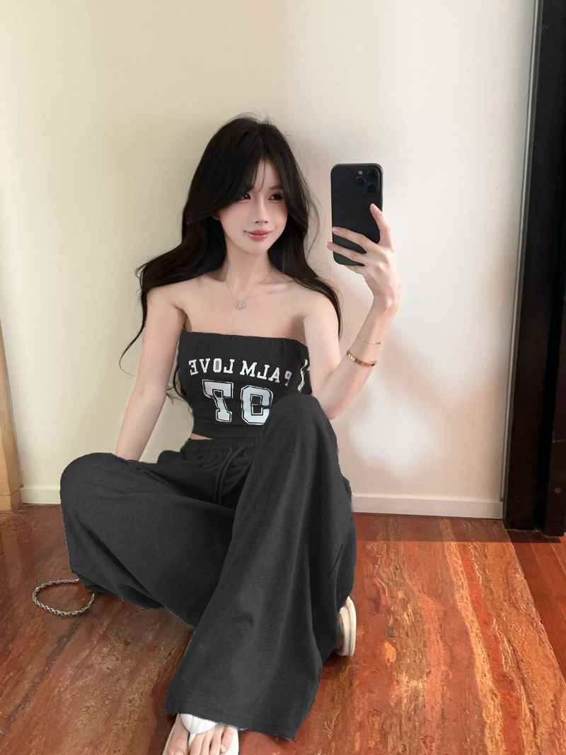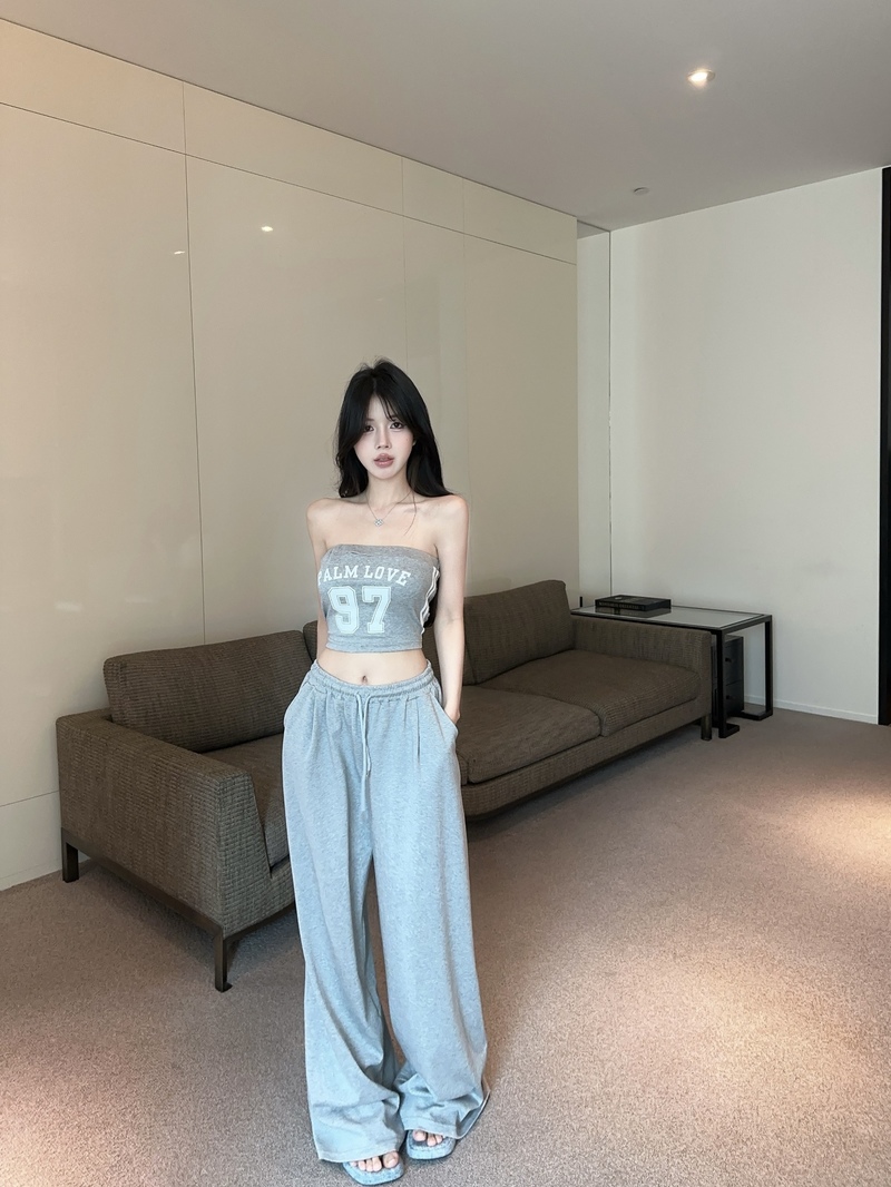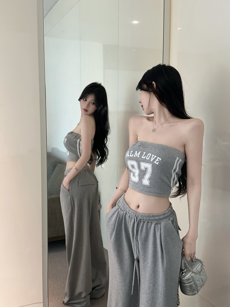 실사 정가 2026 봄 여름 알파벳 신축성 조끼 포장 가슴 티셔츠 슬림해 보이는 허리밴드 긴 바지 스포츠 슈트