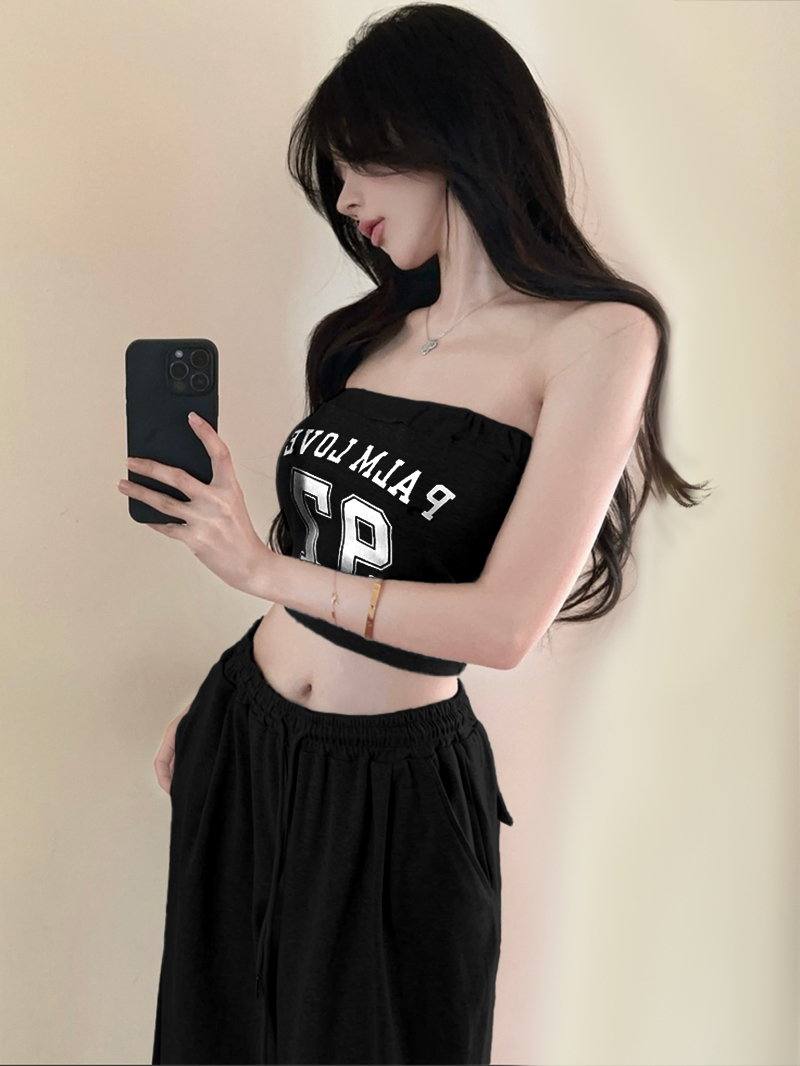 실사 정가 핫걸 섹시함 강아지 자수 트임 신축성 튜브탑 스트라이프 몸매 가꾸기 슬림해 보이는 오프숄더 맨위 티셔츠