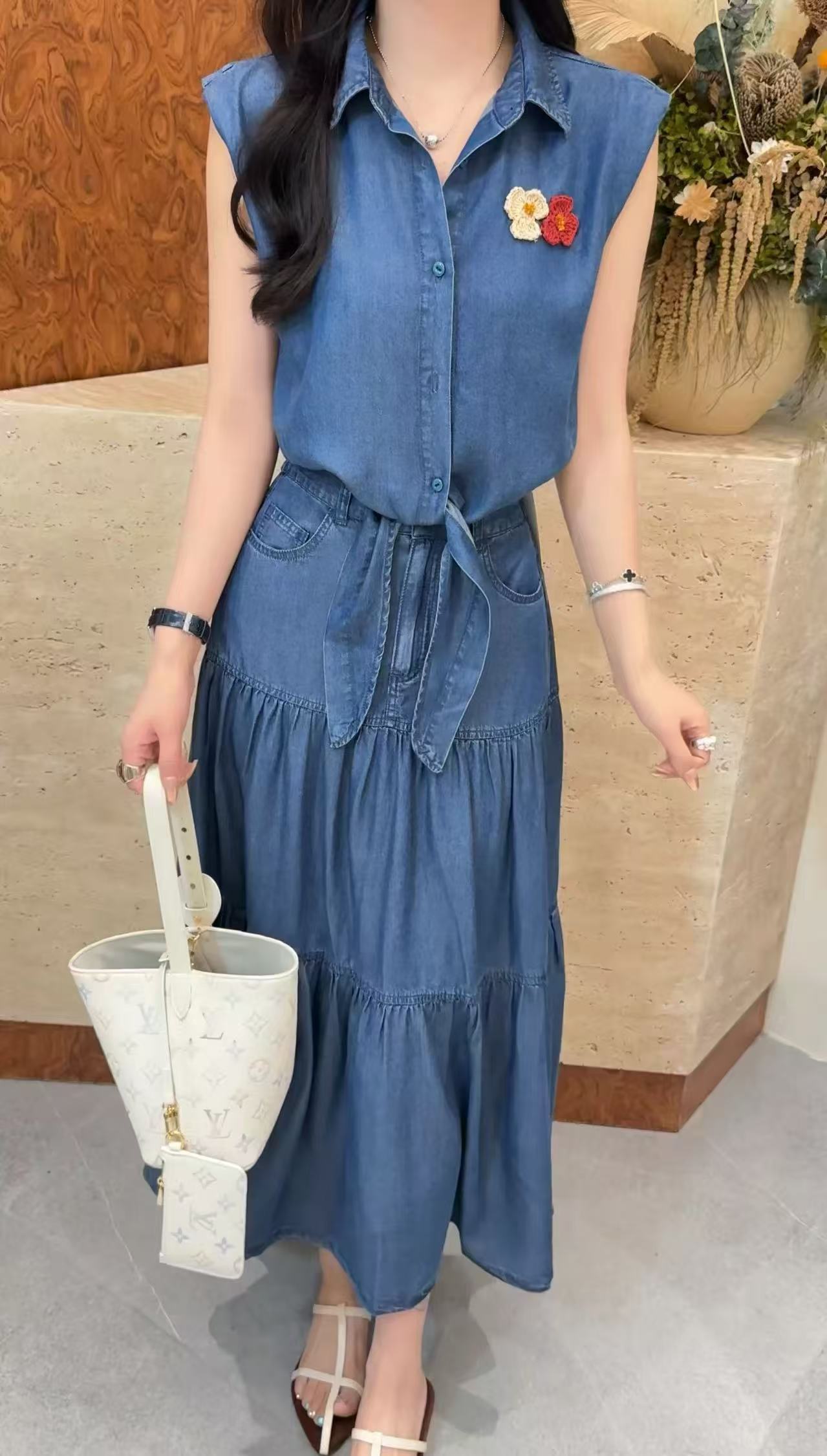 파란색 항구 바람 레트로 데님 세트 드레스 여성 여름 블루 좋은 도루 부드러운 미끄러짐 폴로 칼라 민소매 셔츠 발레 케이크 롱 스커트