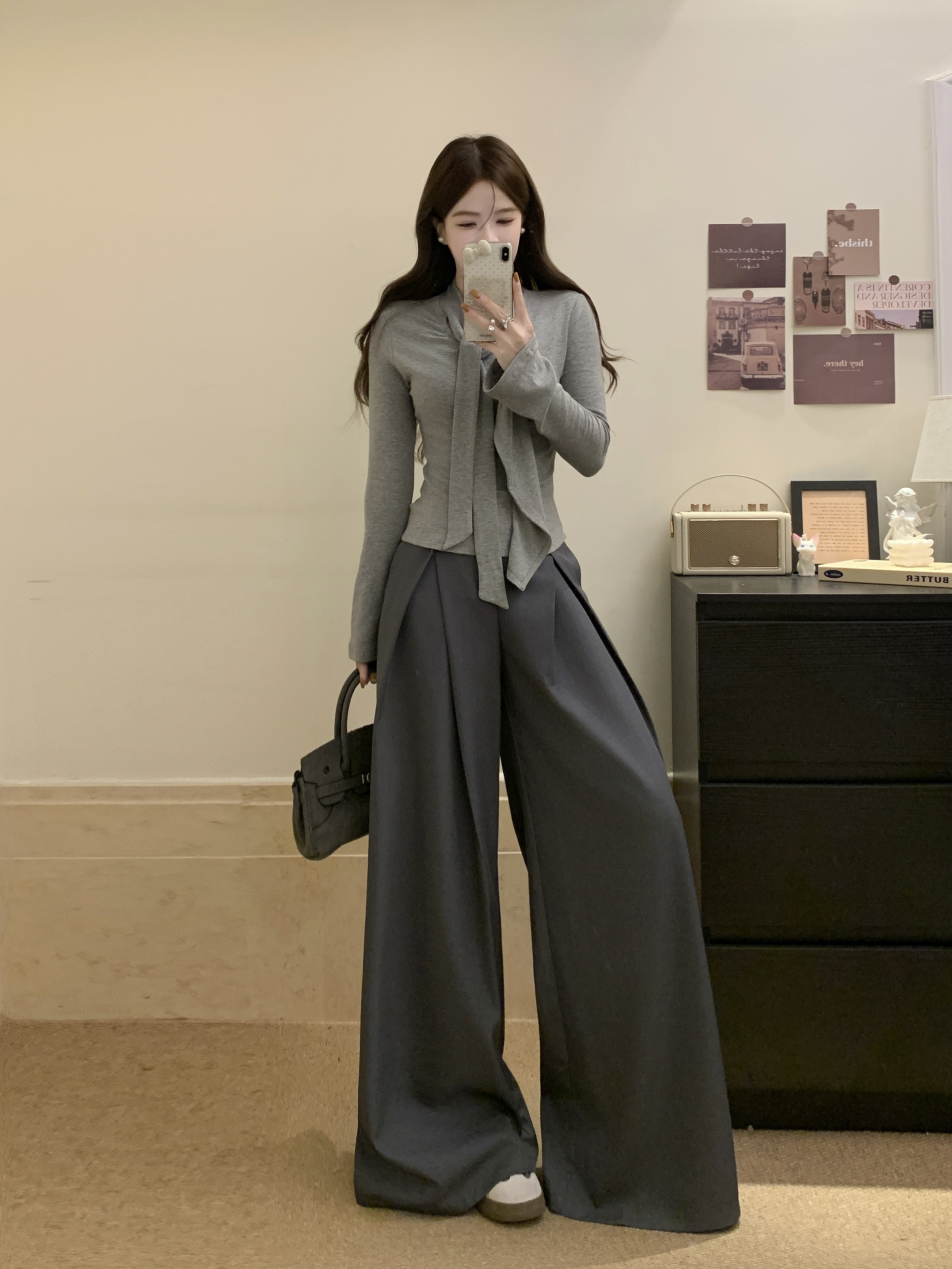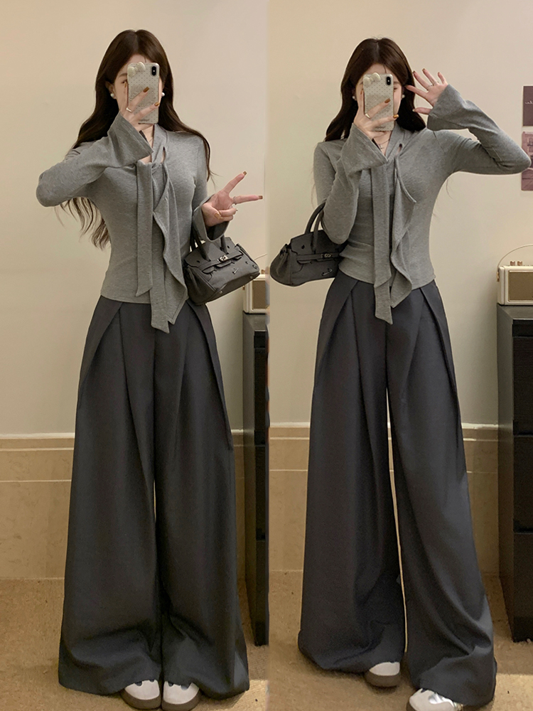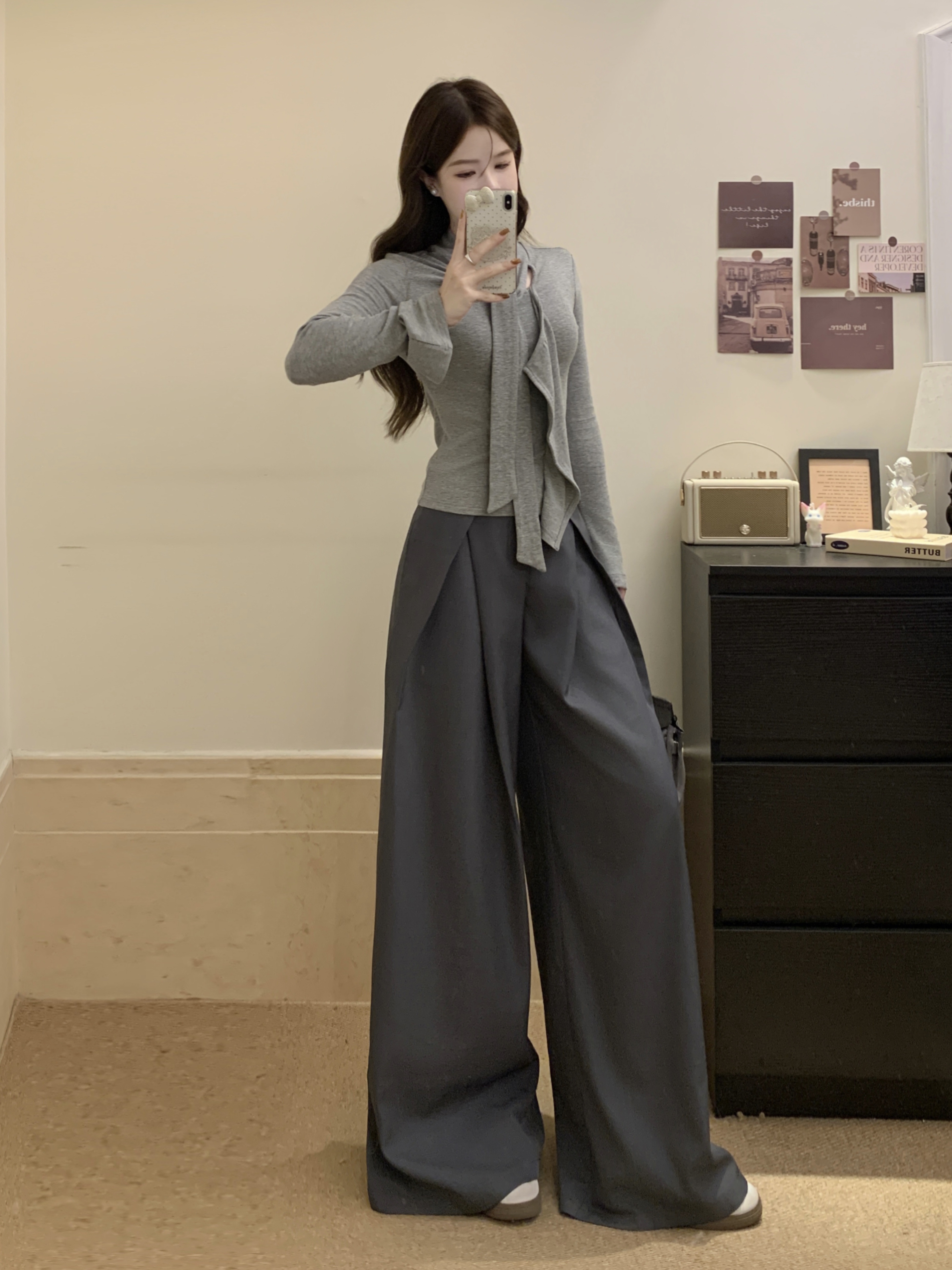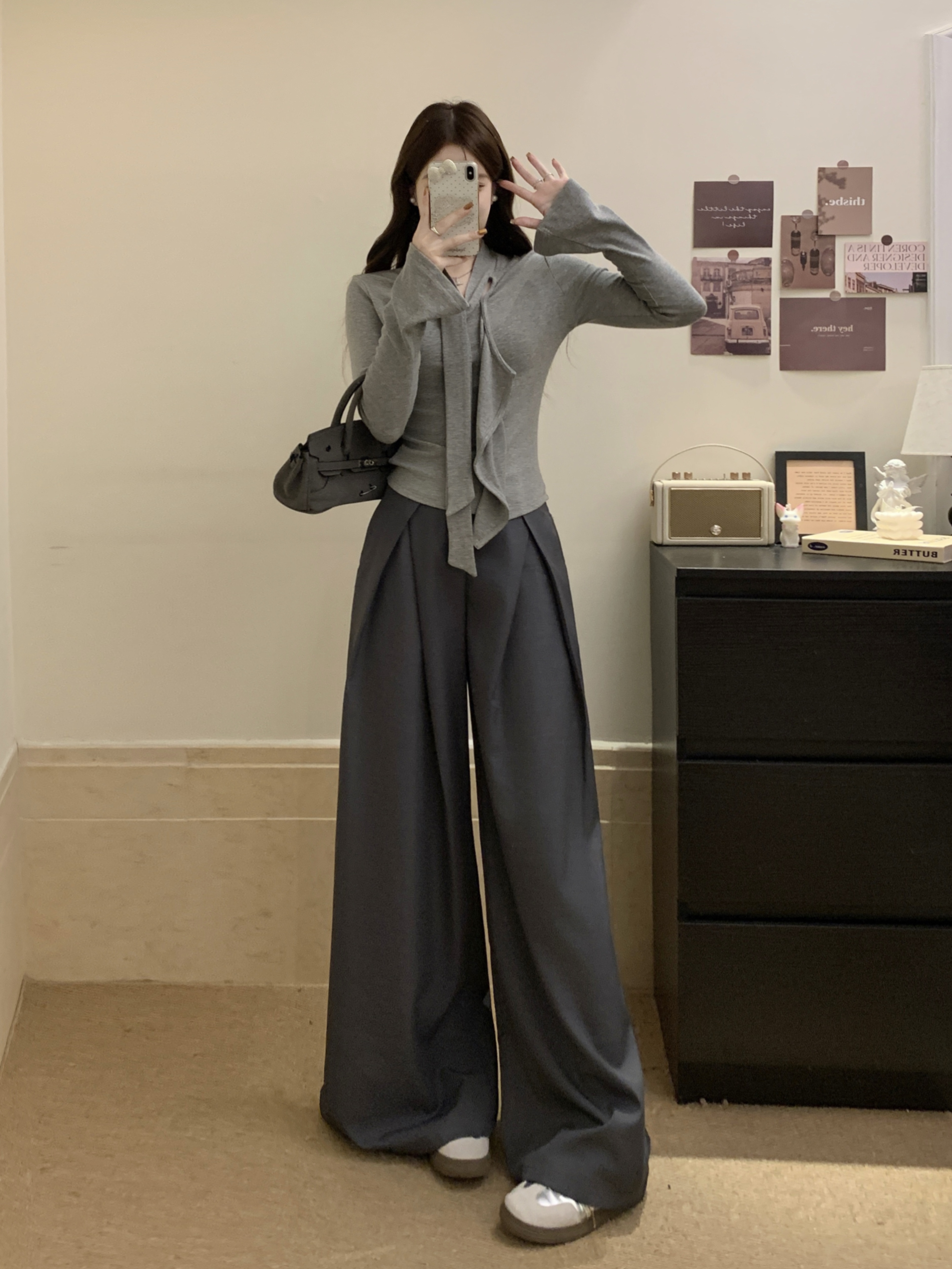 실사 빅 사이즈 여성 의류 2026 봄 새로운 한 부서 순수한 욕망 V넥 맨위 도루 센스 슬림해 보이는 정장 와이드 레그 팬츠