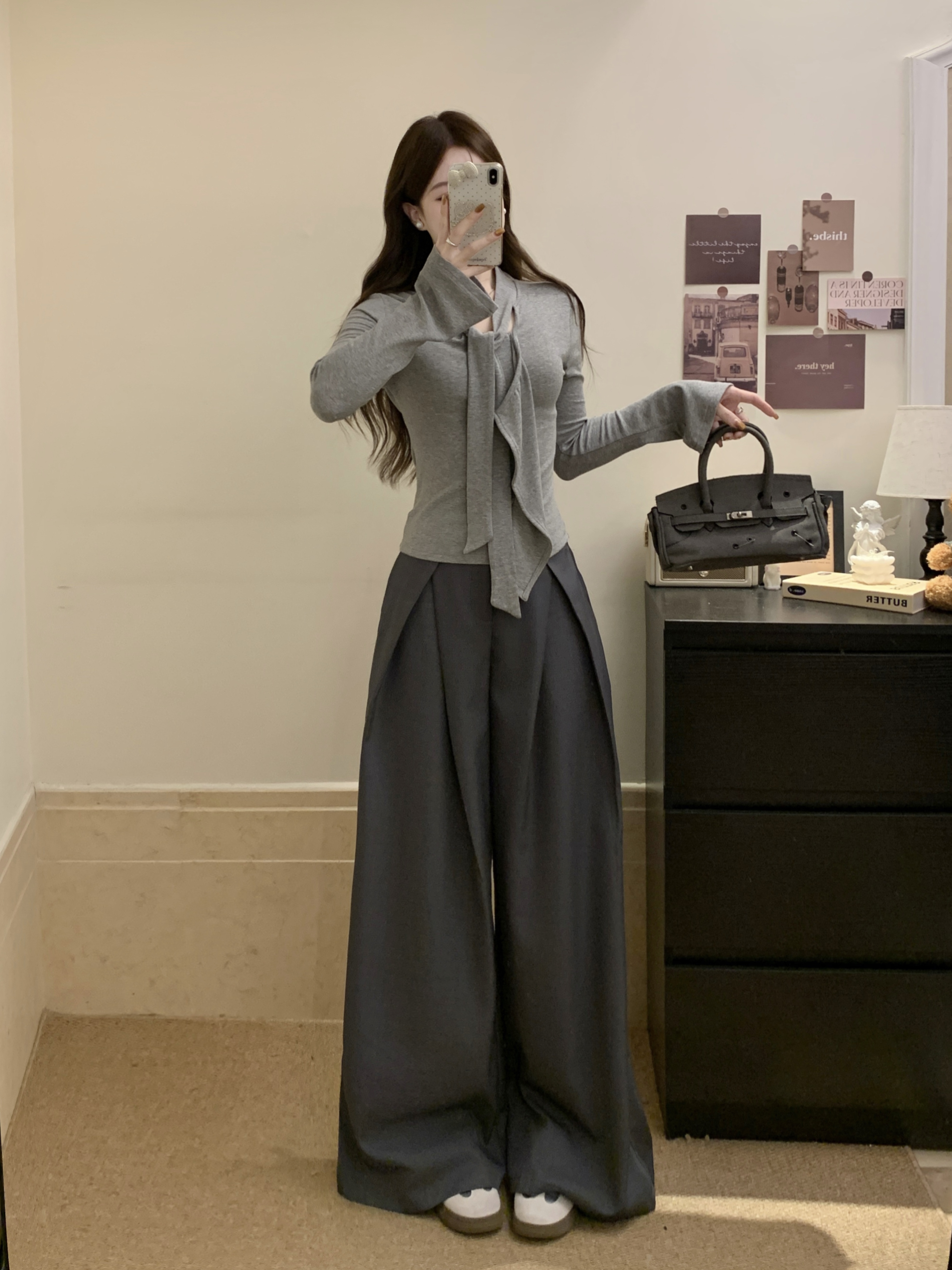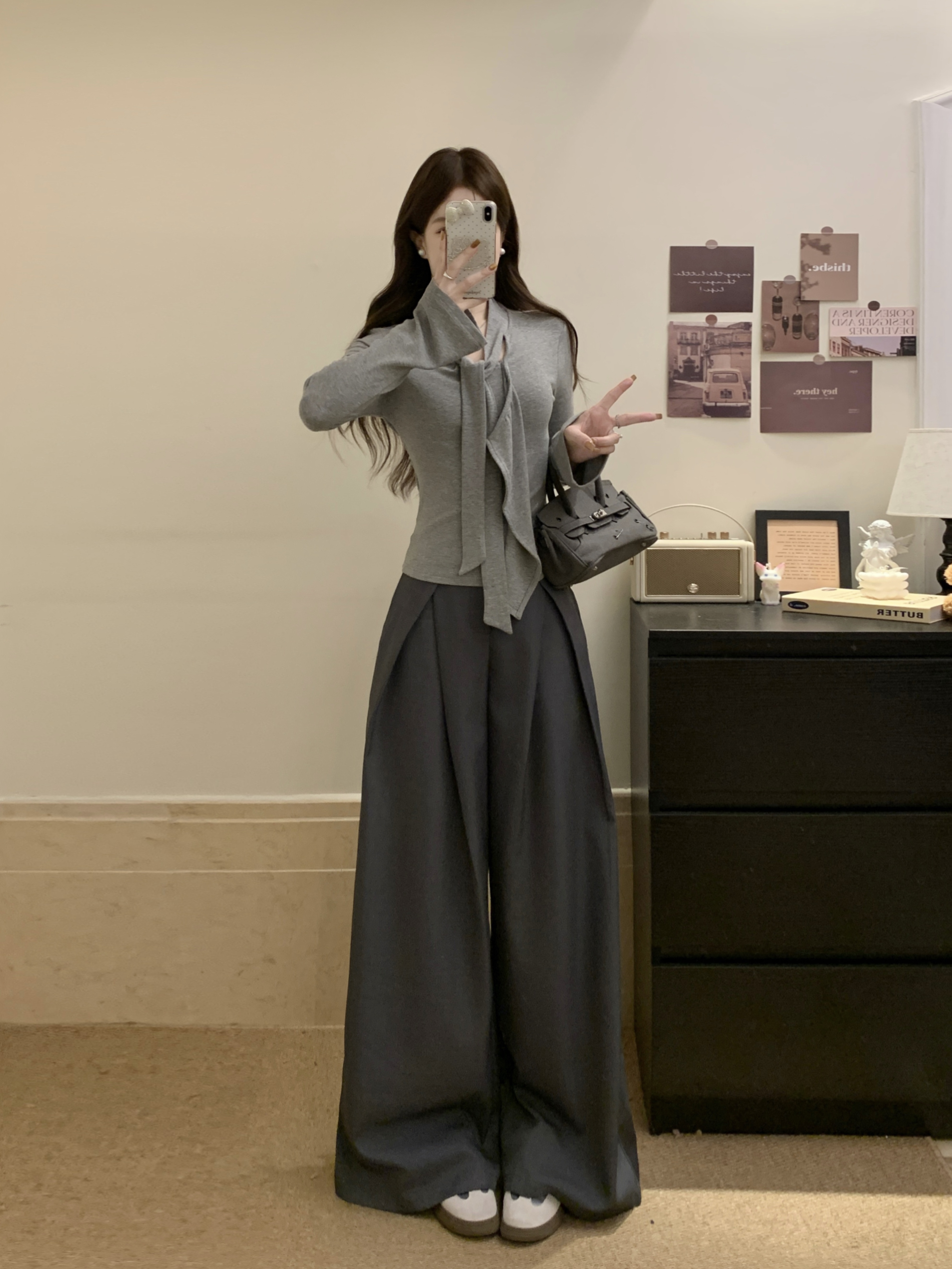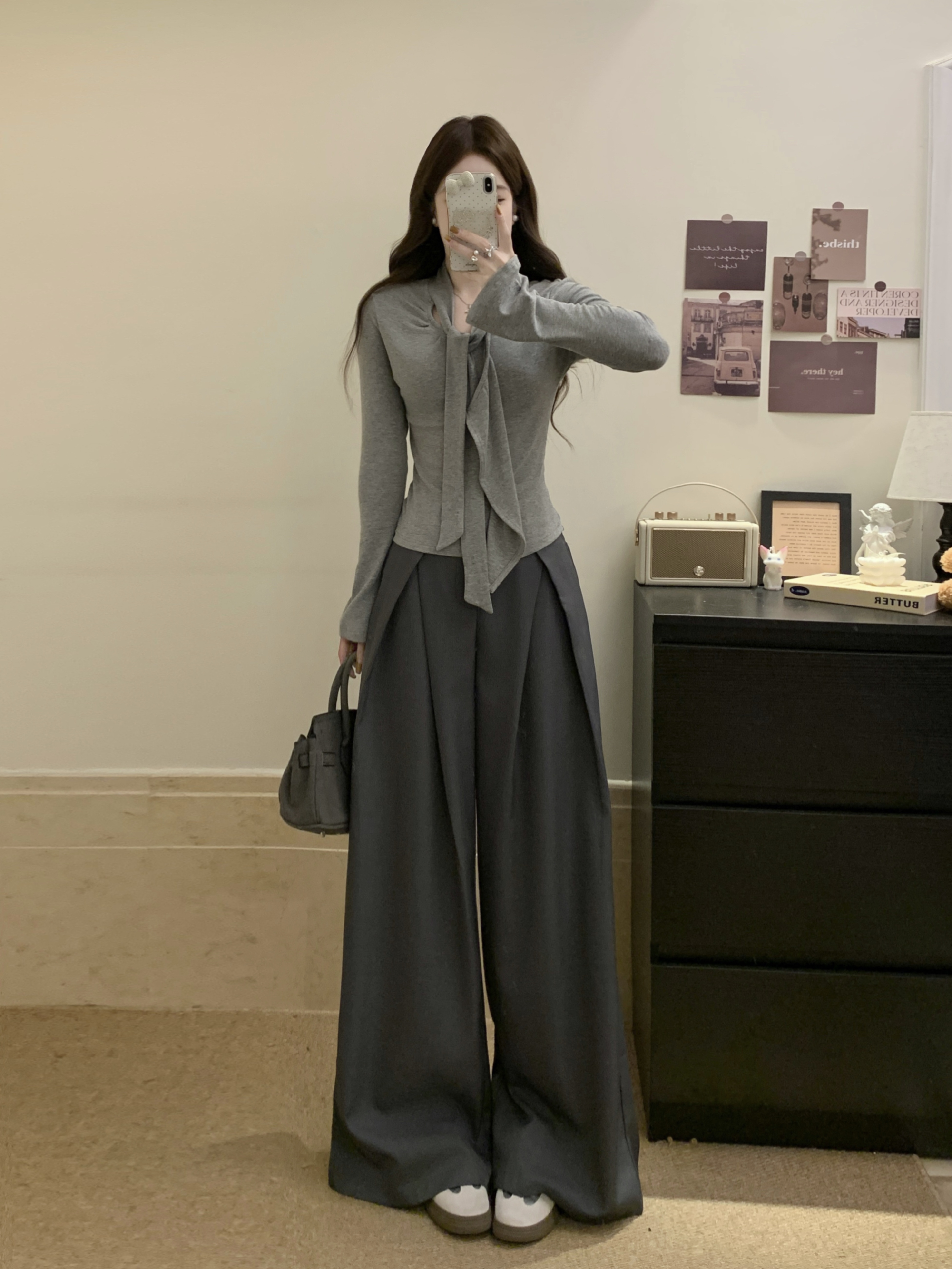 실사 빅 사이즈 여성 의류 2026 봄 새로운 한 부서 순수한 욕망 V넥 맨위 도루 센스 슬림해 보이는 정장 와이드 레그 팬츠