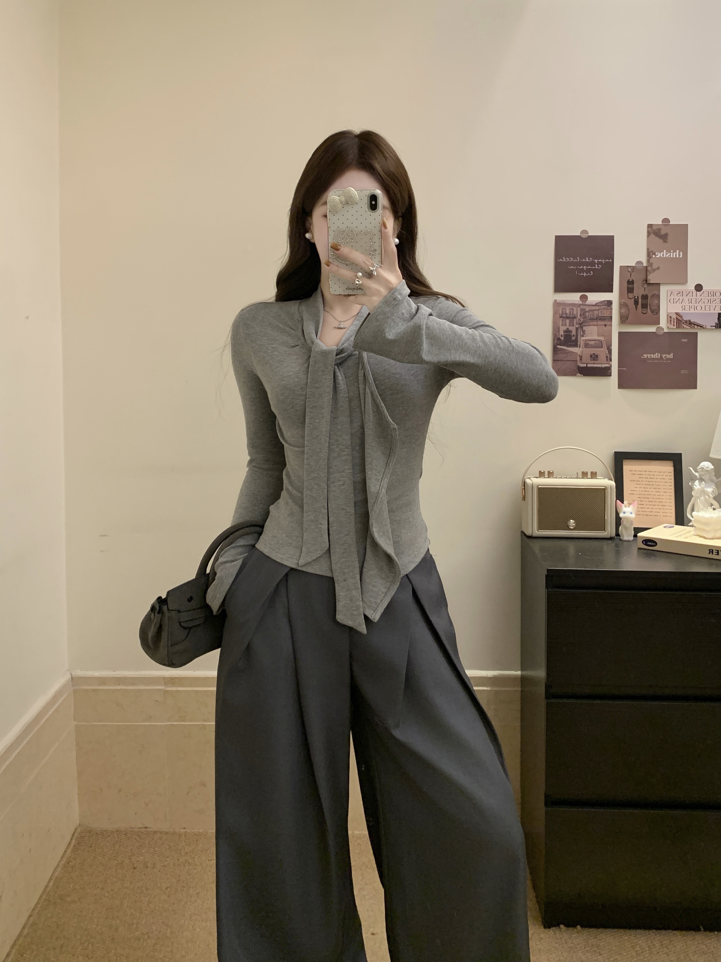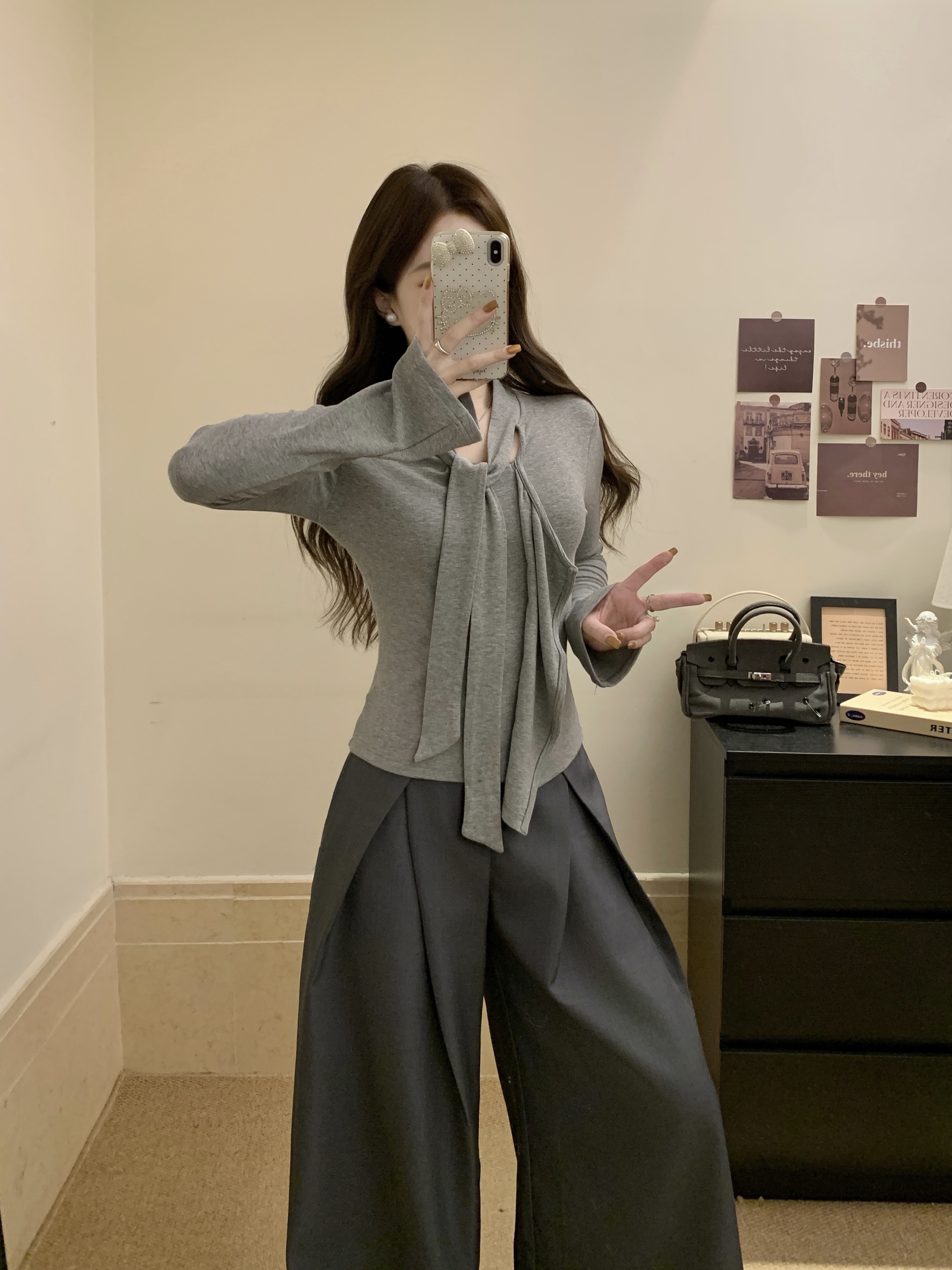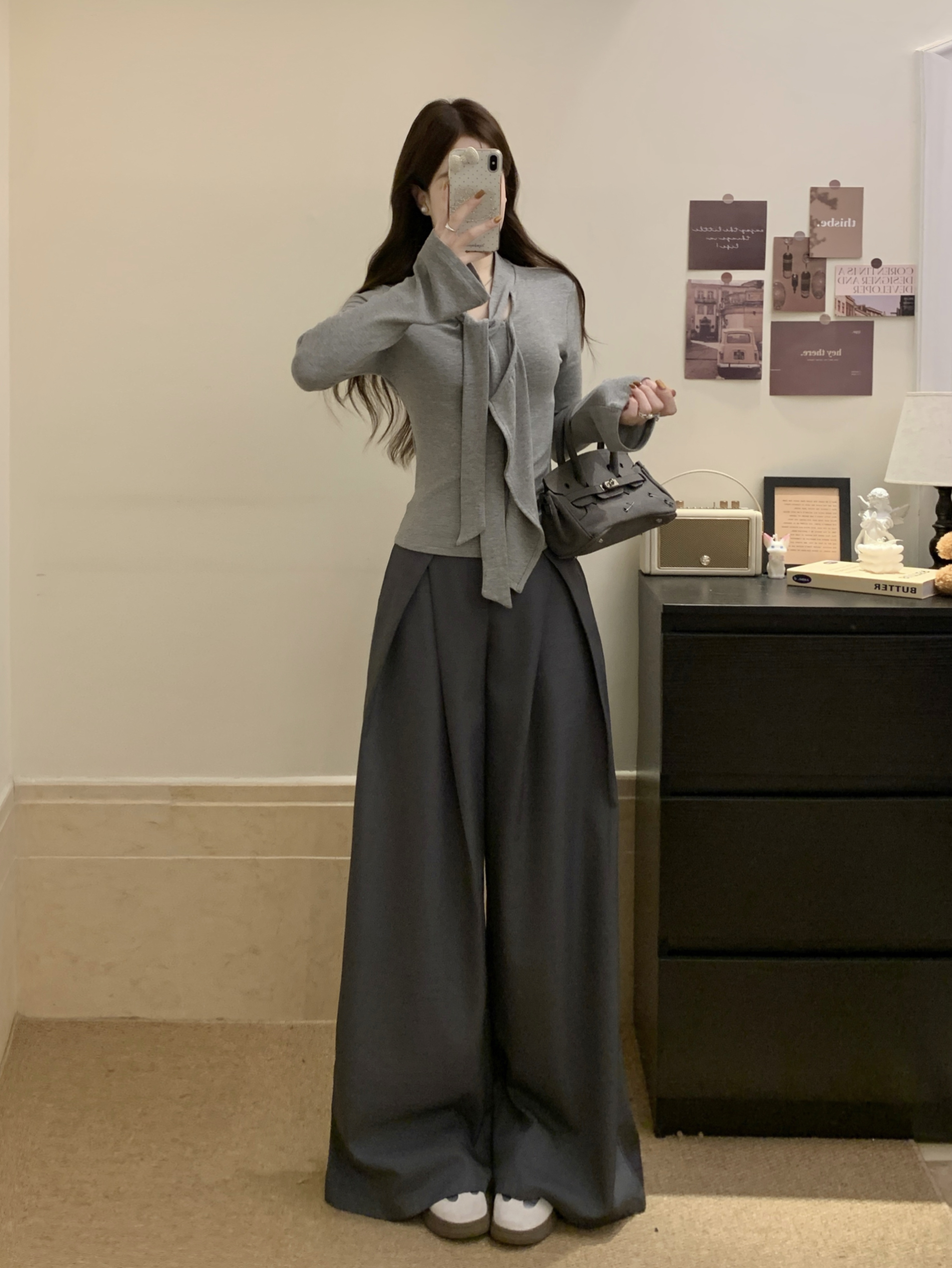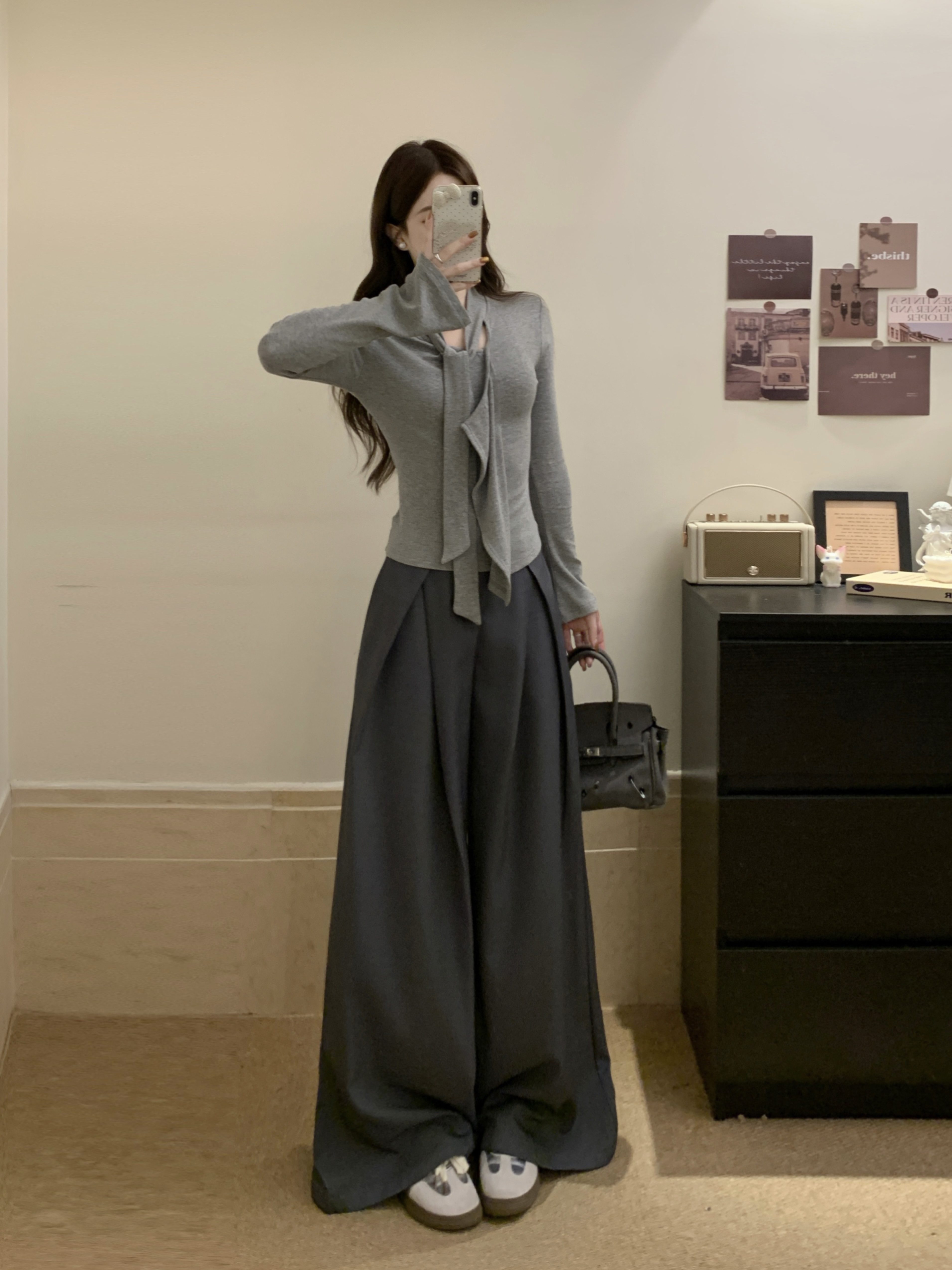 실사 빅 사이즈 여성 의류 2026 봄 새로운 한 부서 순수한 욕망 V넥 맨위 도루 센스 슬림해 보이는 정장 와이드 레그 팬츠