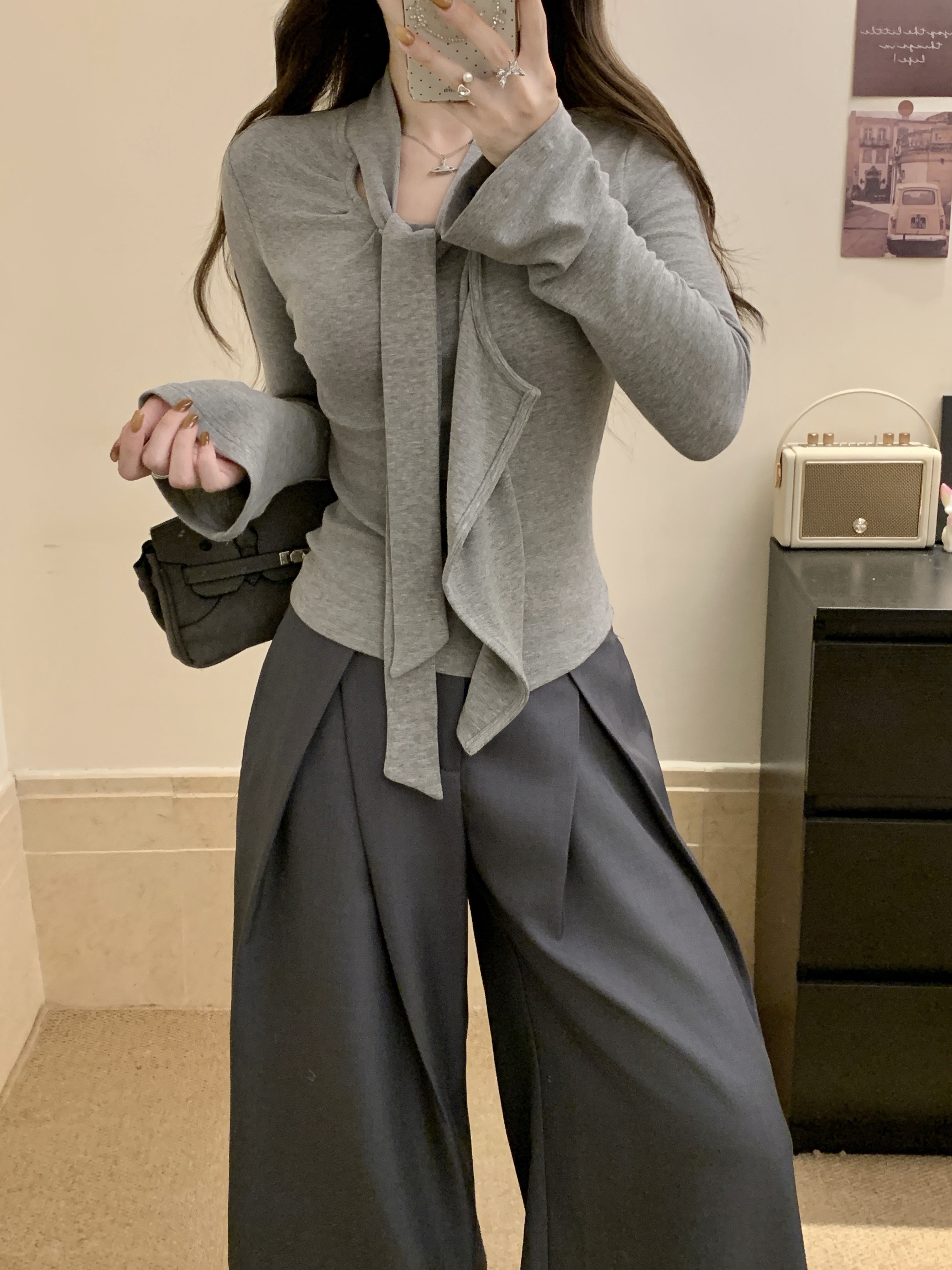 실사 빅 사이즈 여성 의류 2026 봄 새로운 고급 센스 슬림해 보이는 페이크 레이어드 재킷 와이드 레그 팬츠 투피스 세트