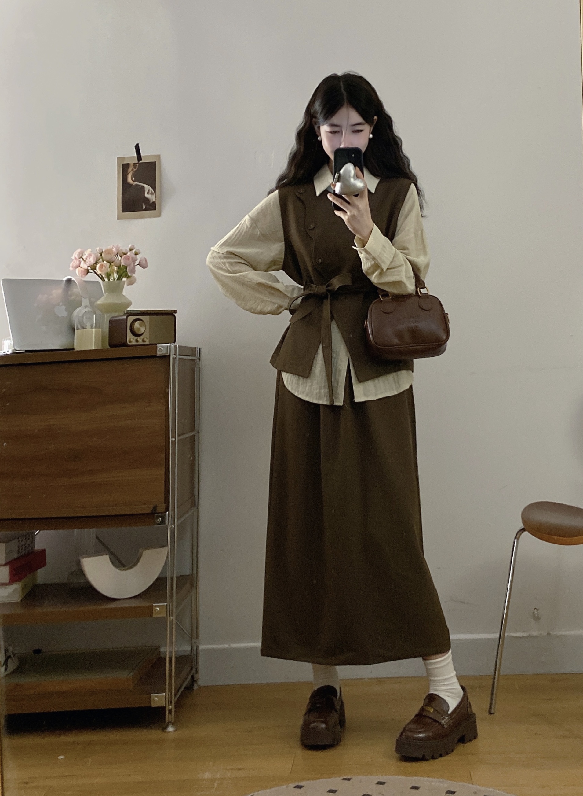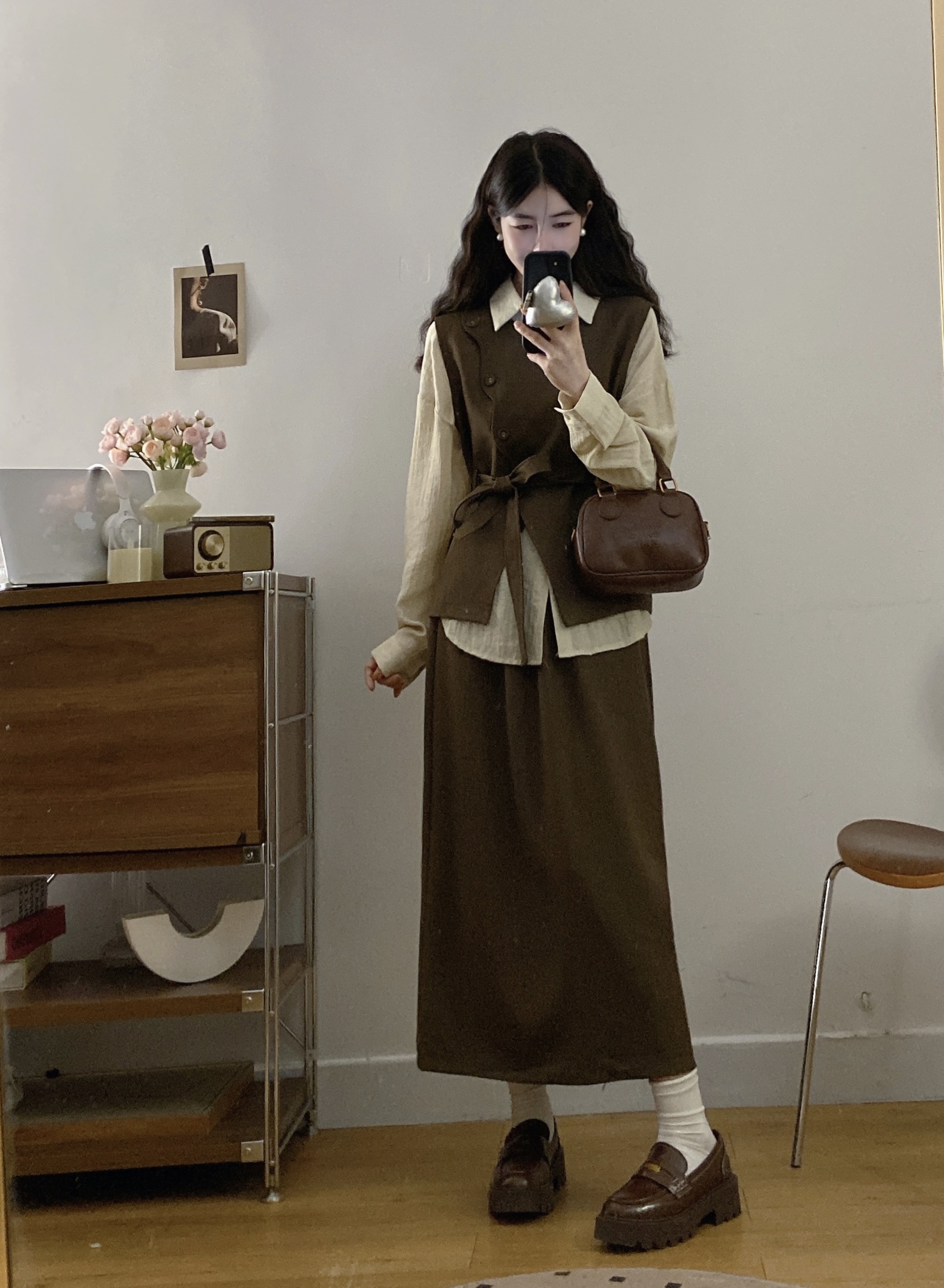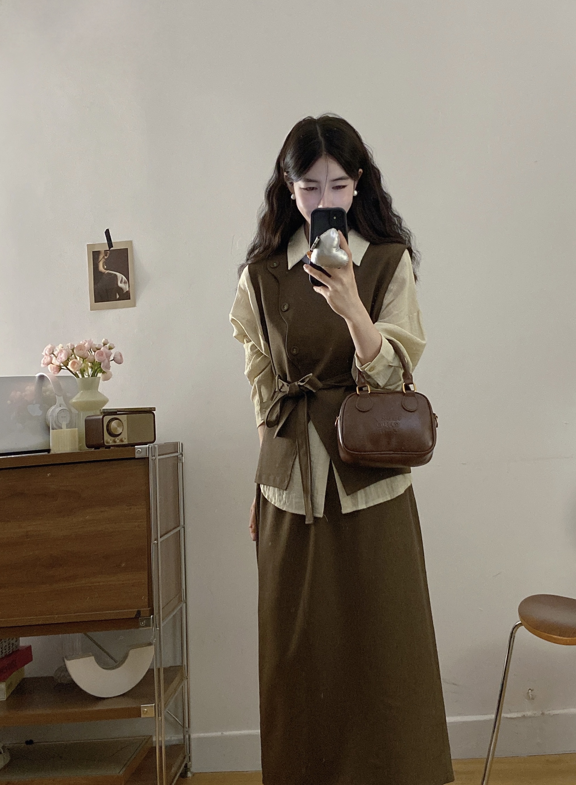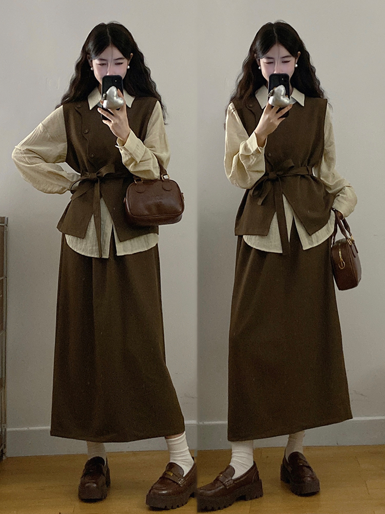 실사 빅 사이즈 여성 의류 2026 봄 새로운 커피 색상 한 부서 고급 센스 셔츠 베스트 반신 스커트 3종 세트
