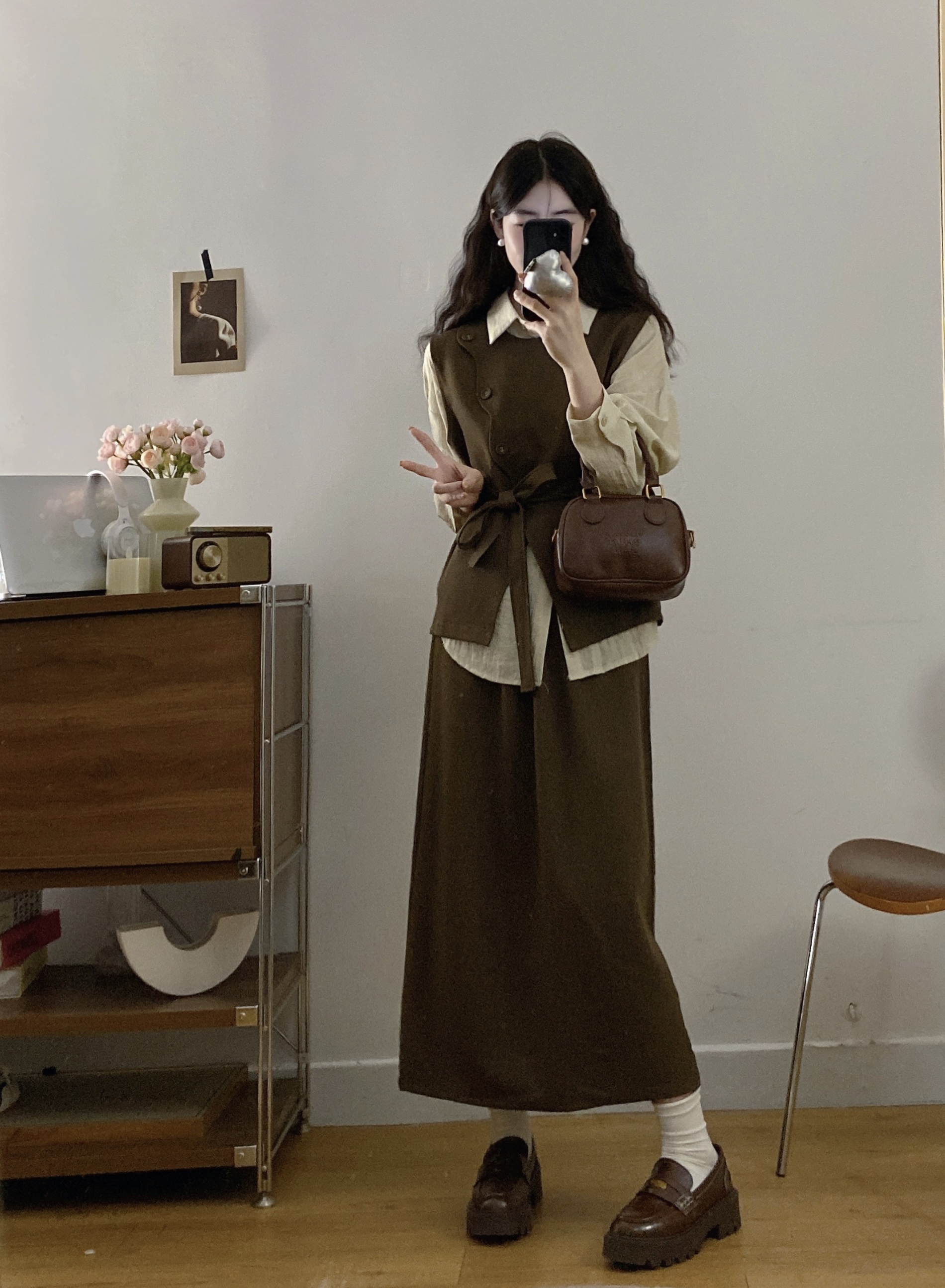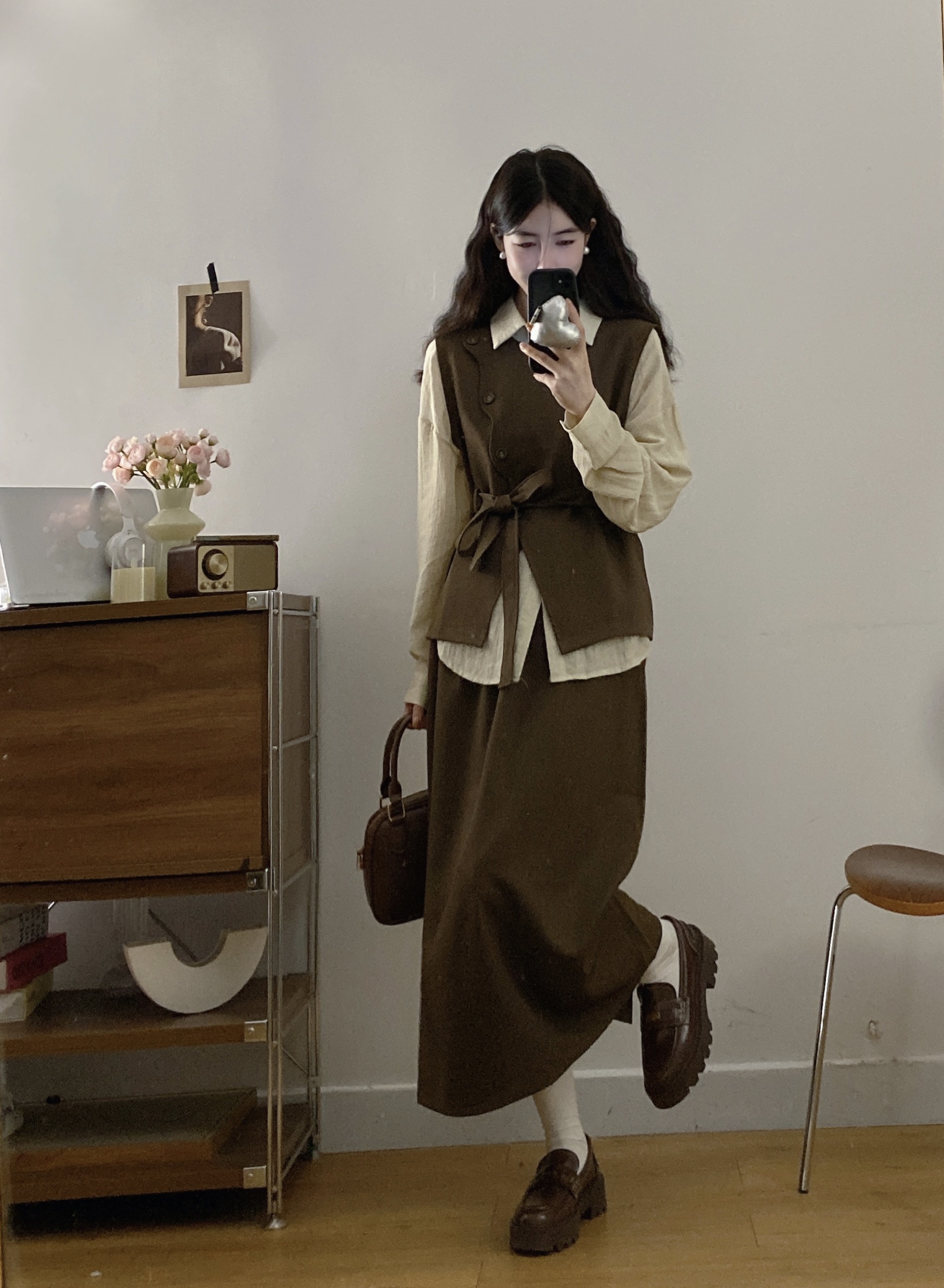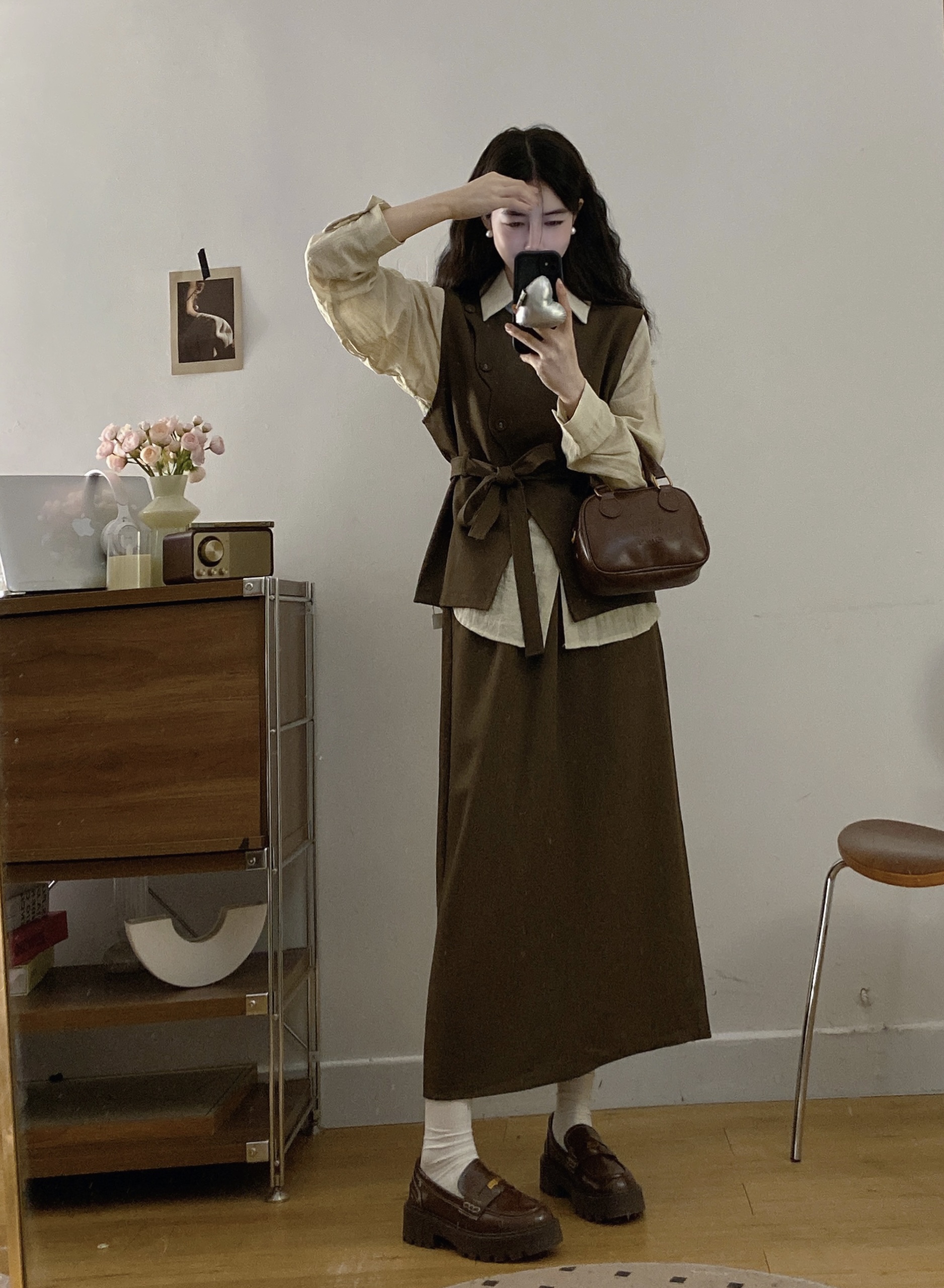 실사 빅 사이즈 여성 의류 2026 봄 새로운 커피 색상 한 부서 고급 센스 셔츠 베스트 반신 스커트 3종 세트