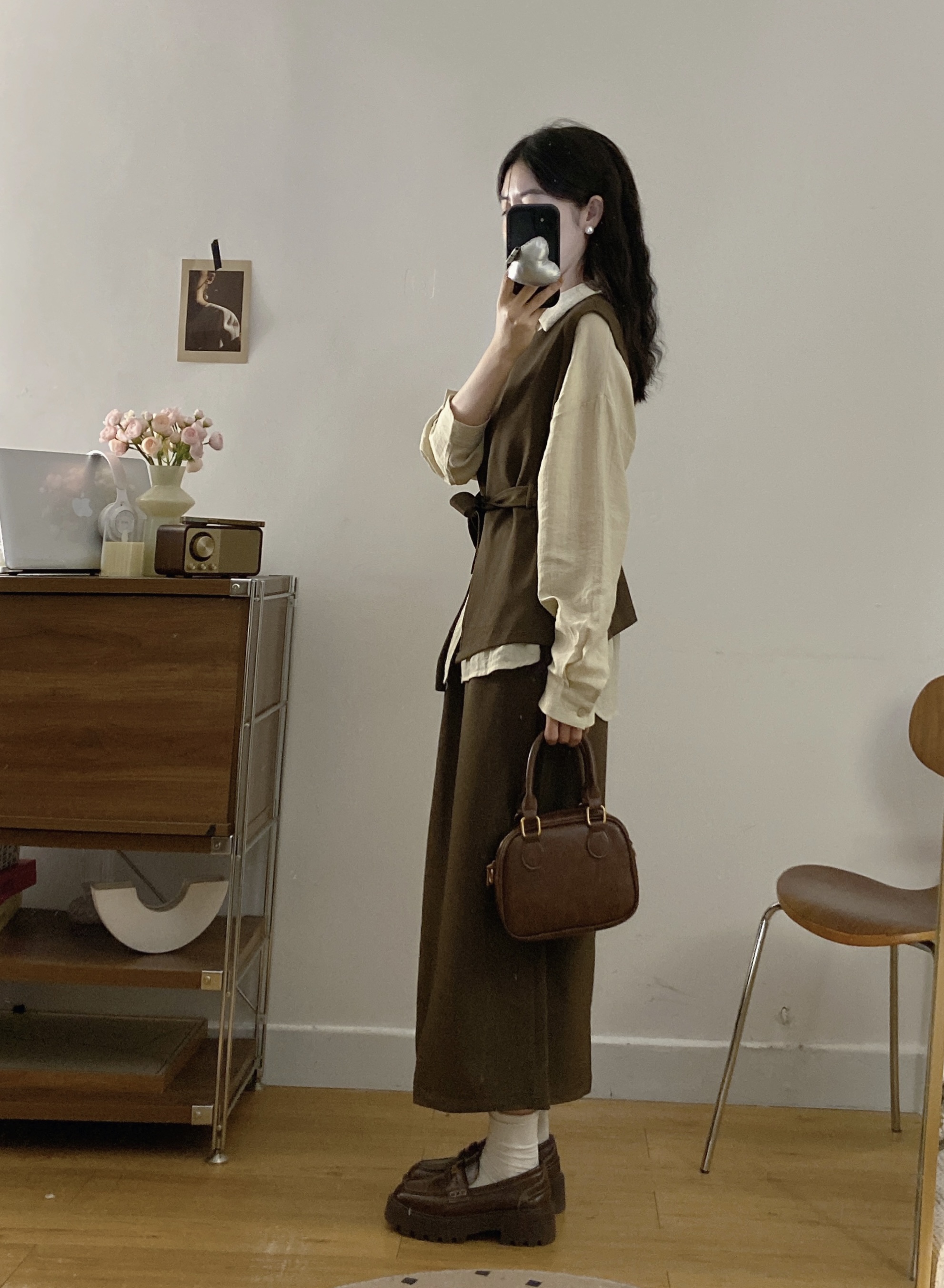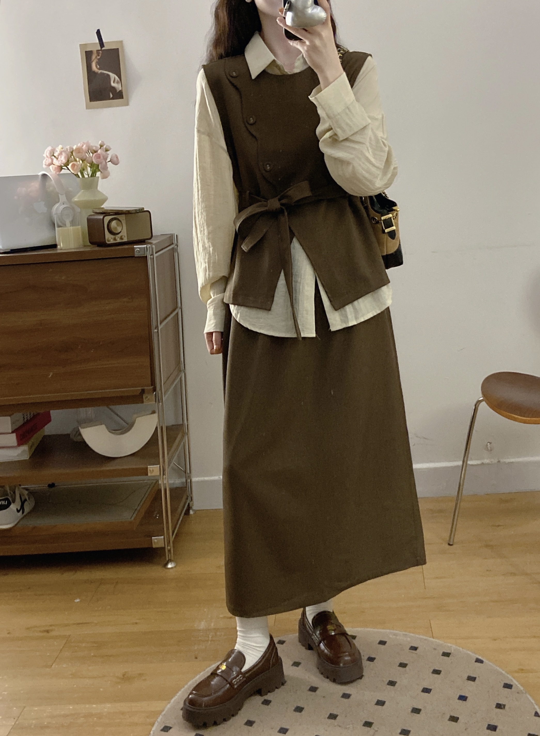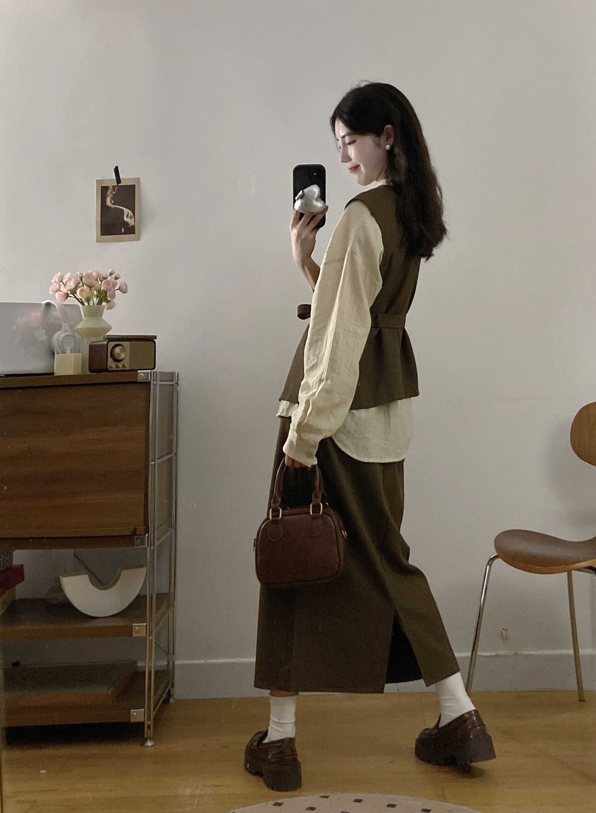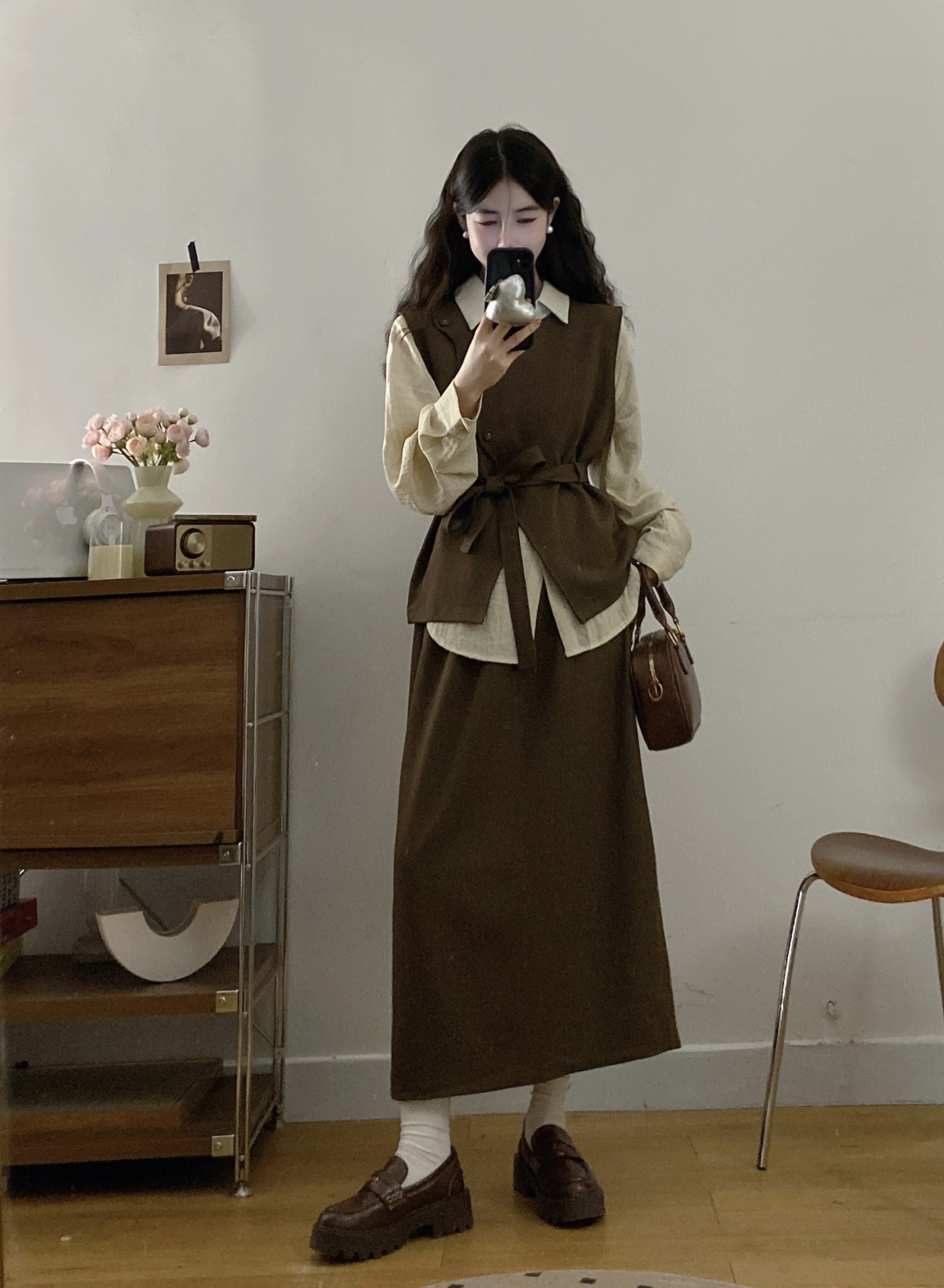 실사 빅 사이즈 여성 의류 2026 봄 새로운 커피 색상 한 부서 고급 센스 셔츠 베스트 반신 스커트 3종 세트