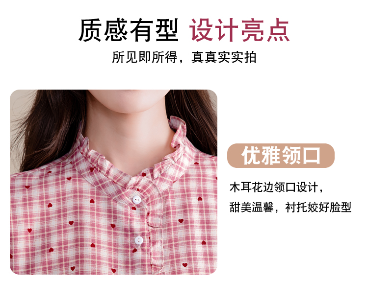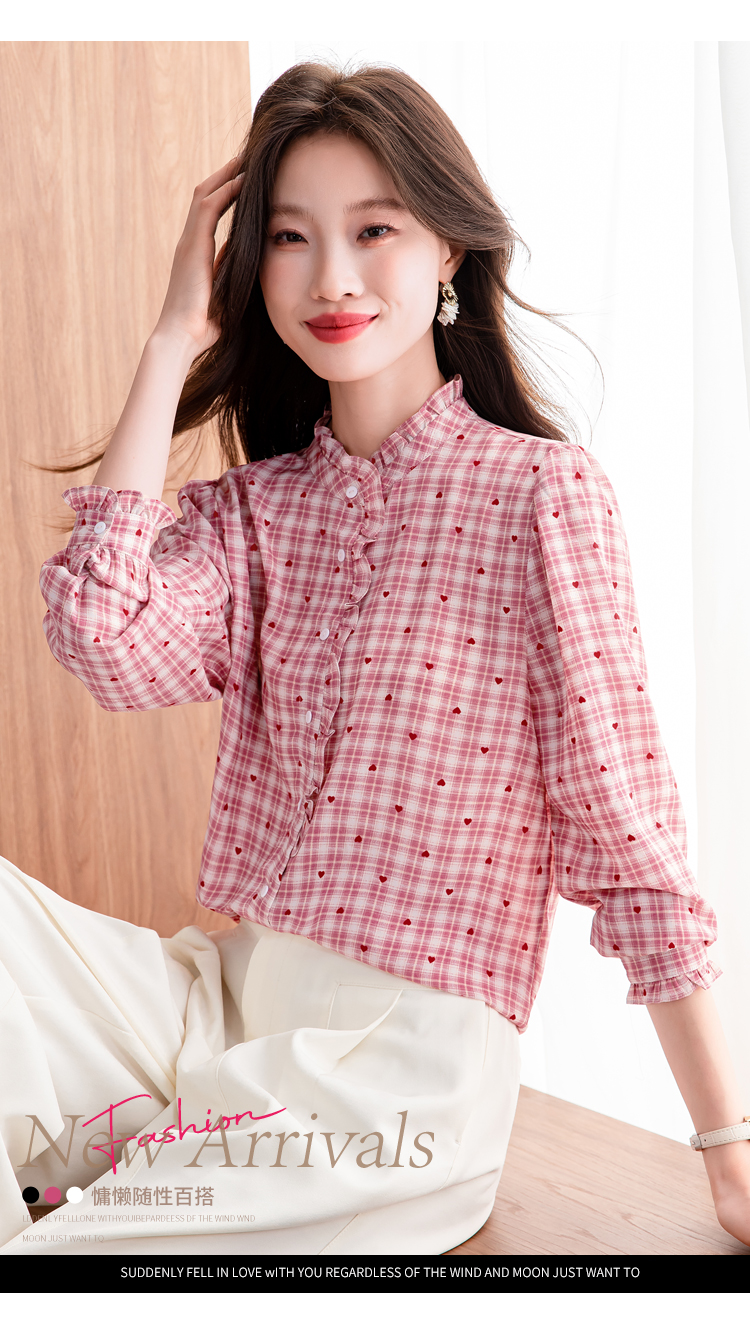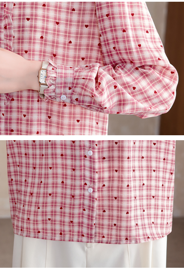 실사 프린트 체크무늬 뽕나무 누에 실크 긴팔 봄 프릴 스탠드 칼라 여성 셔츠 외국 가스 다용도 긴팔 맨위