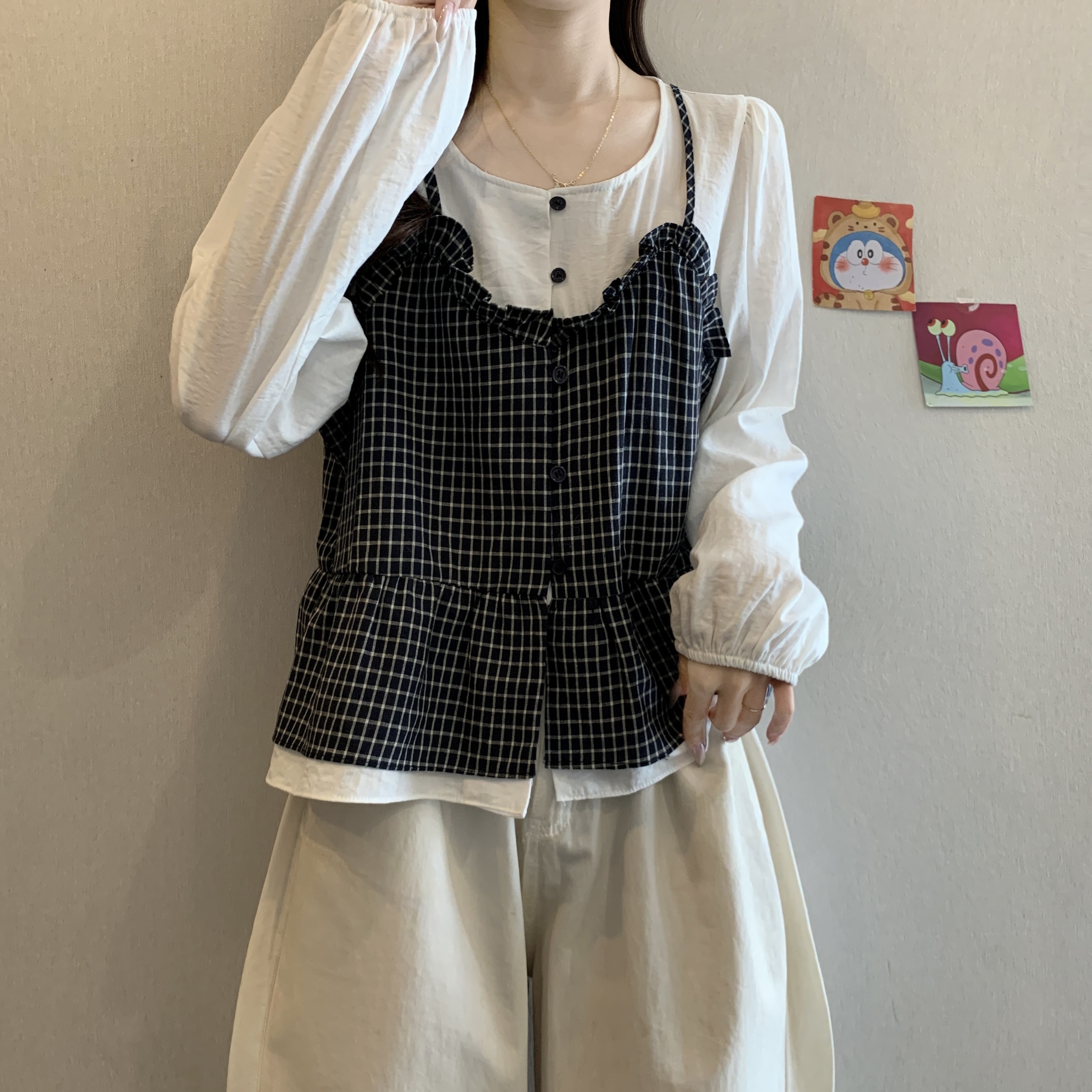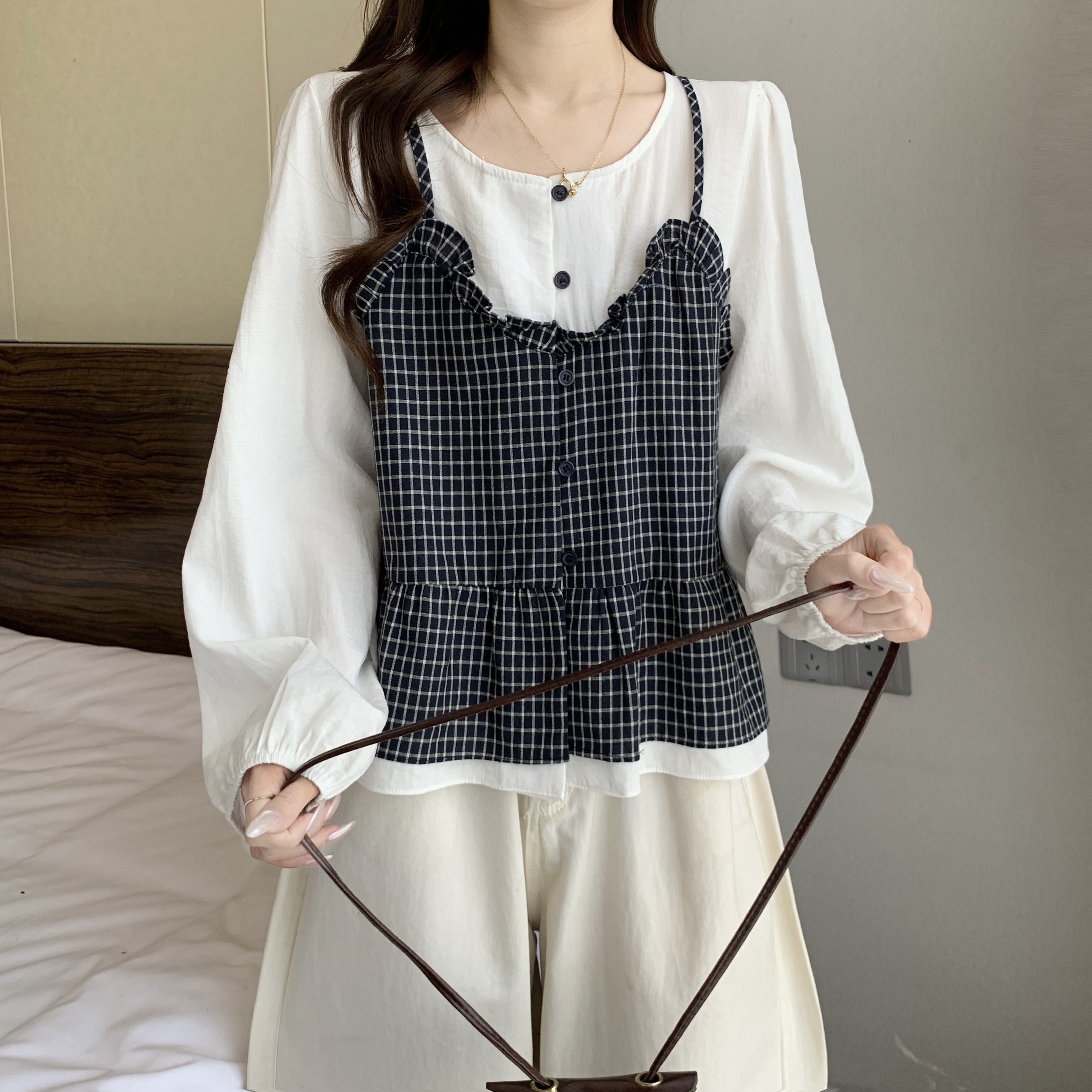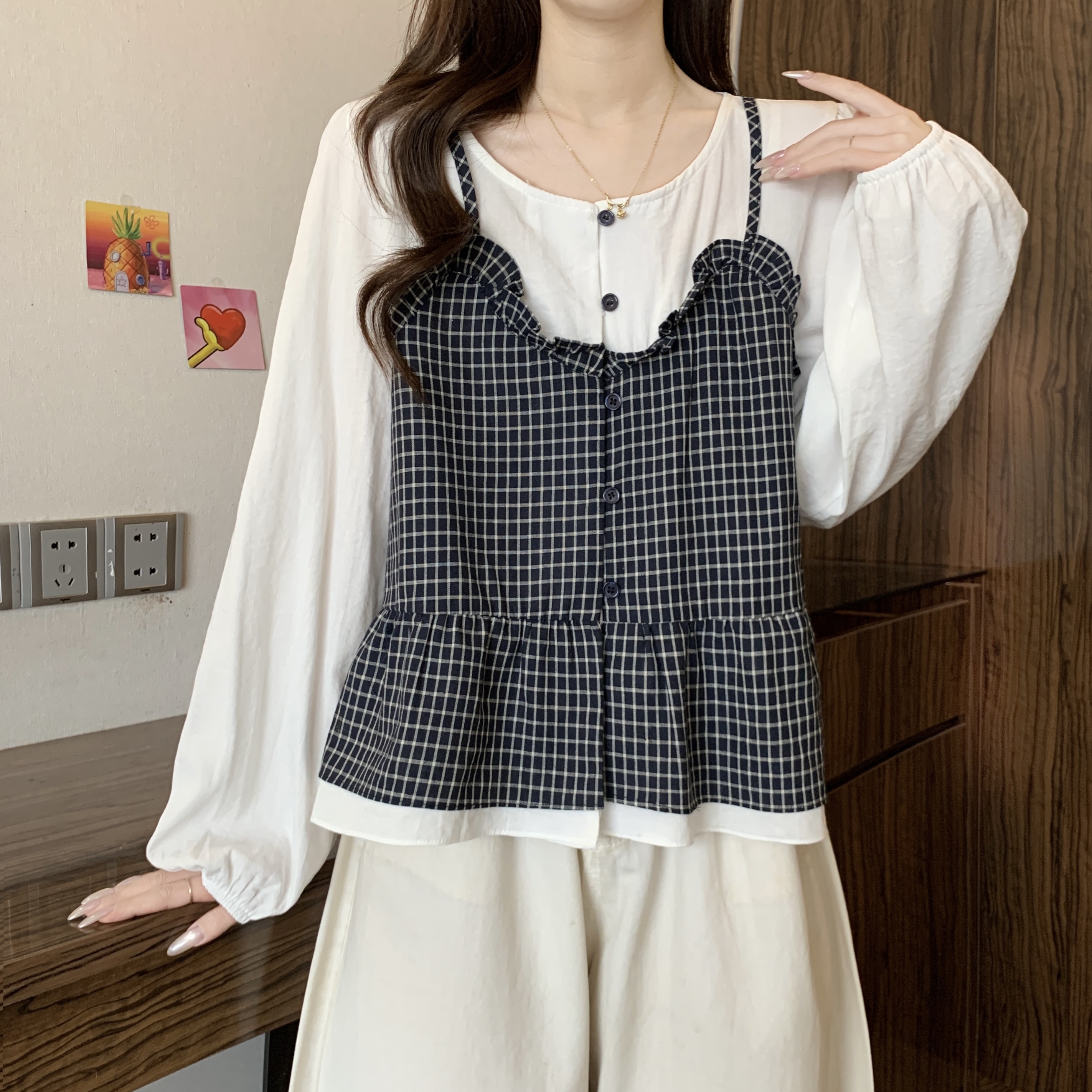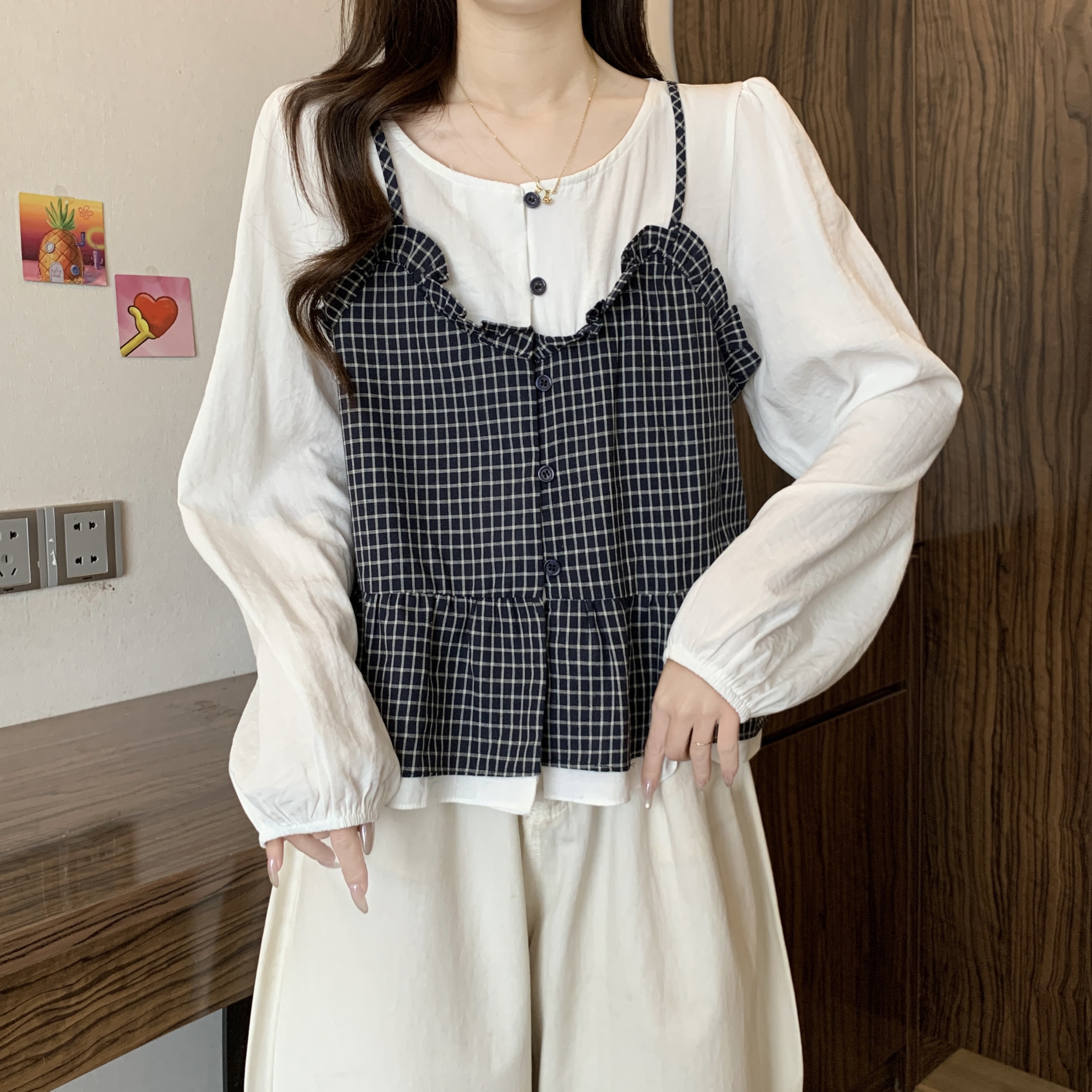 빅 사이즈 슬립 패치워크 체크무늬 페이크 레이어드 여성 셔츠 가을 2026 새로운 루즈핏 슬림해 보이는 캐주얼 다용도 맨위