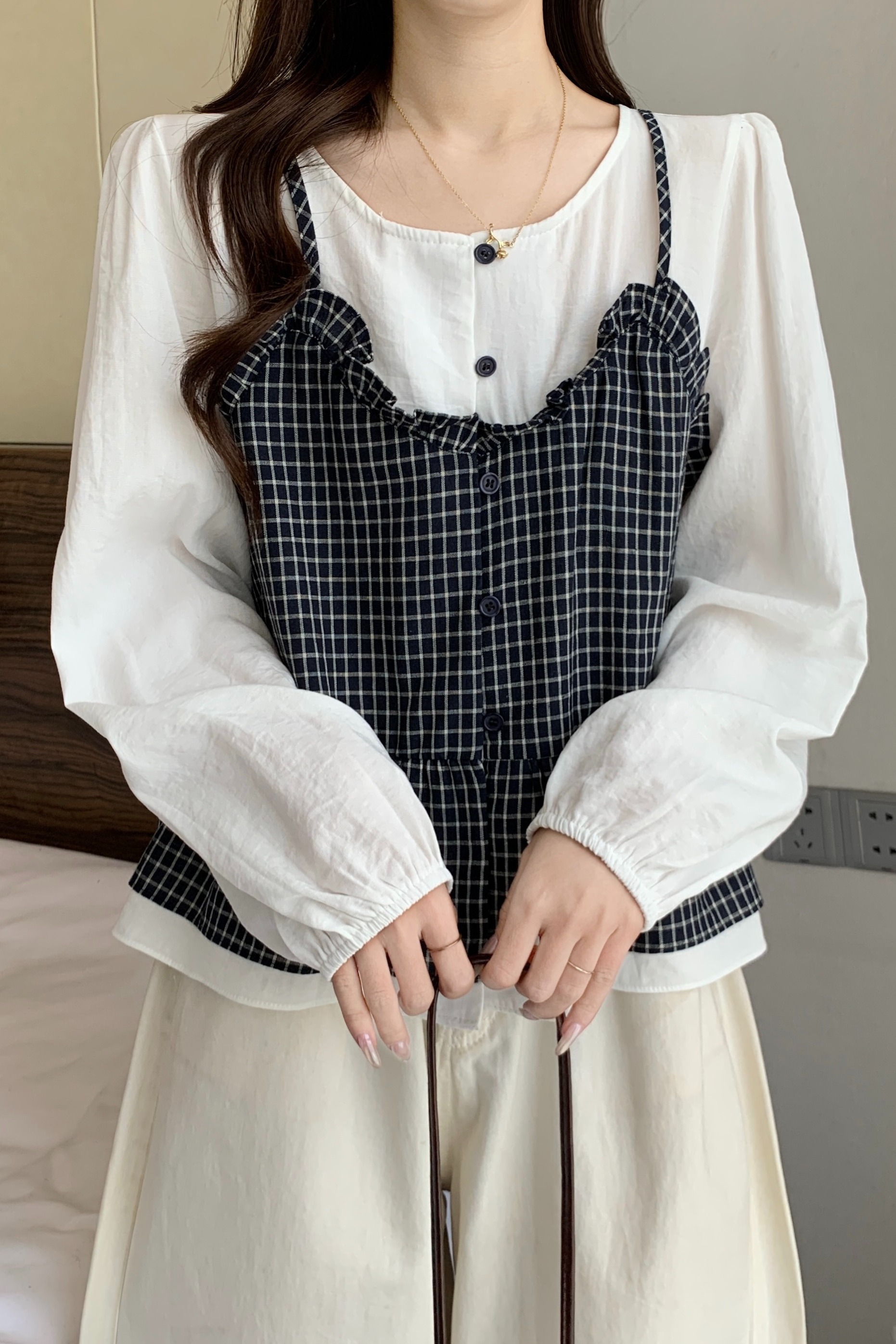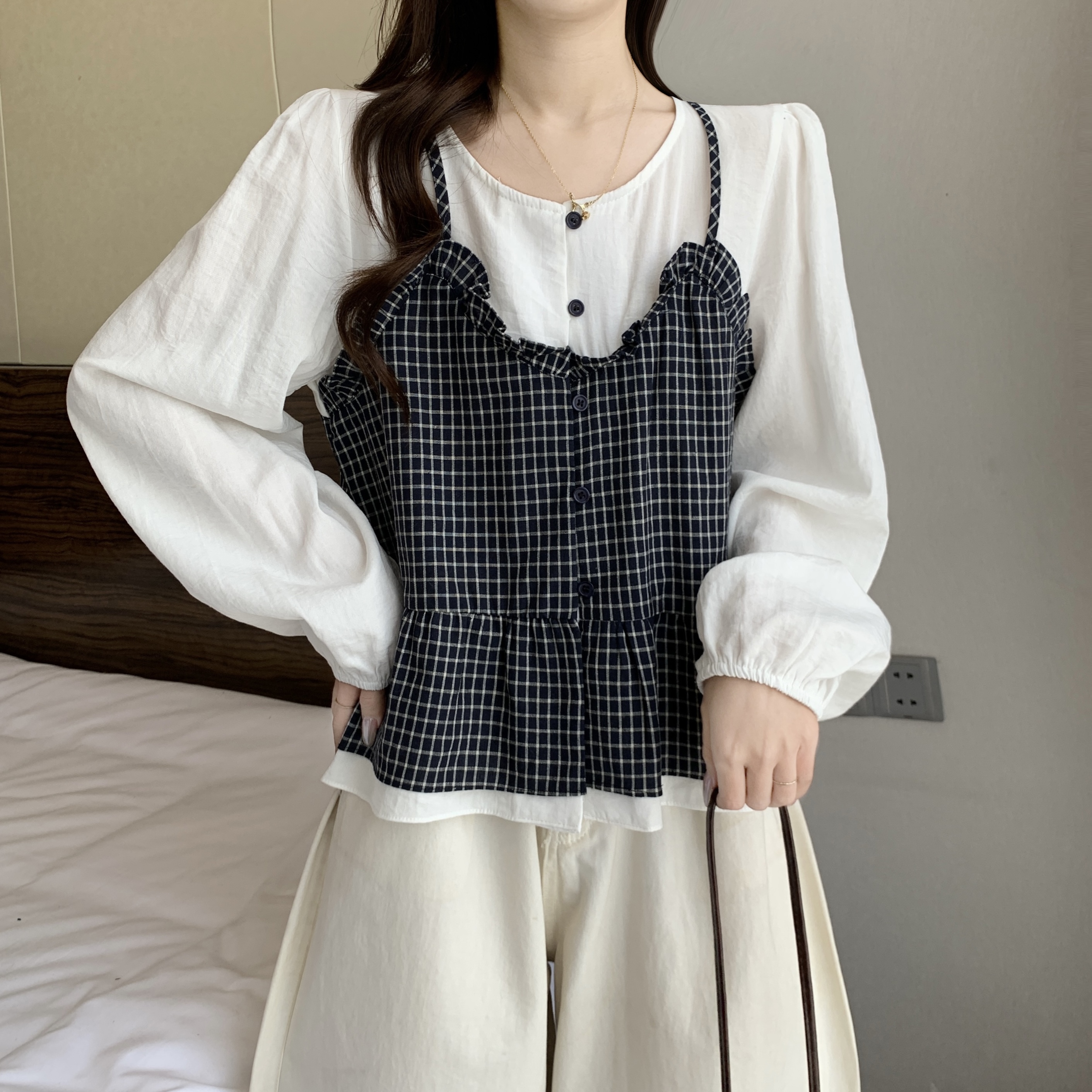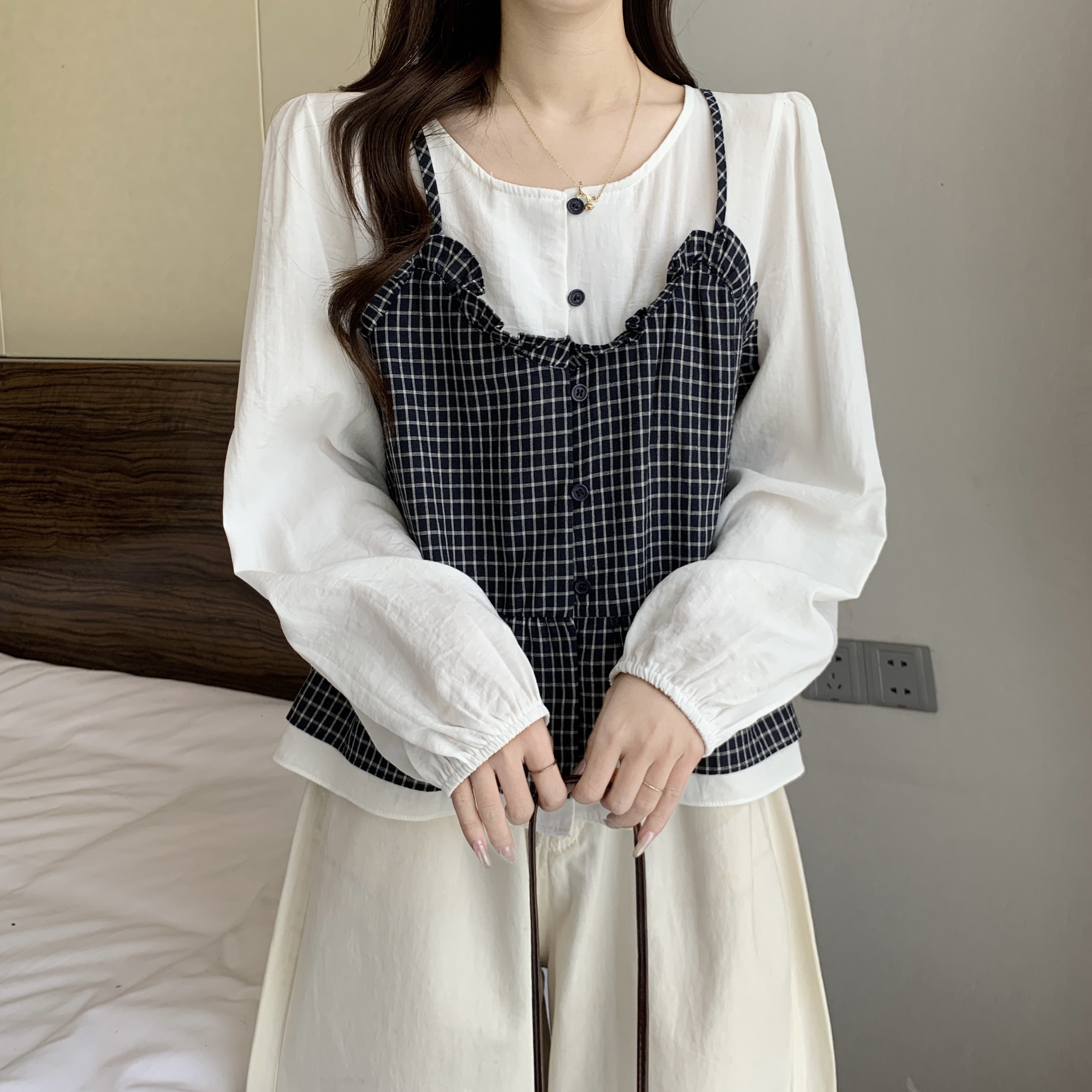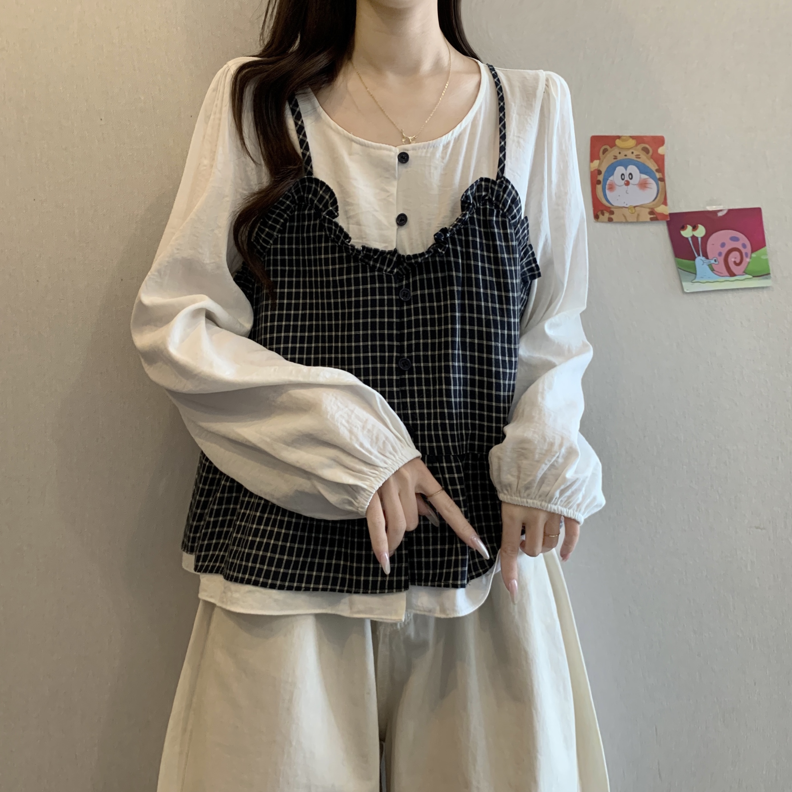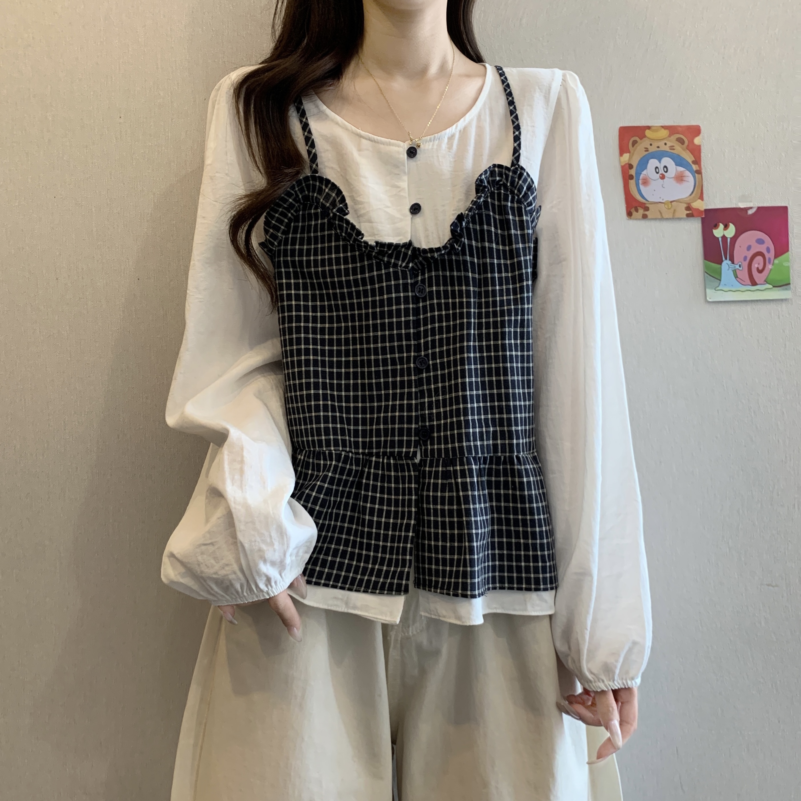 빅 사이즈 슬립 패치워크 체크무늬 페이크 레이어드 여성 셔츠 가을 2026 새로운 루즈핏 슬림해 보이는 캐주얼 다용도 맨위