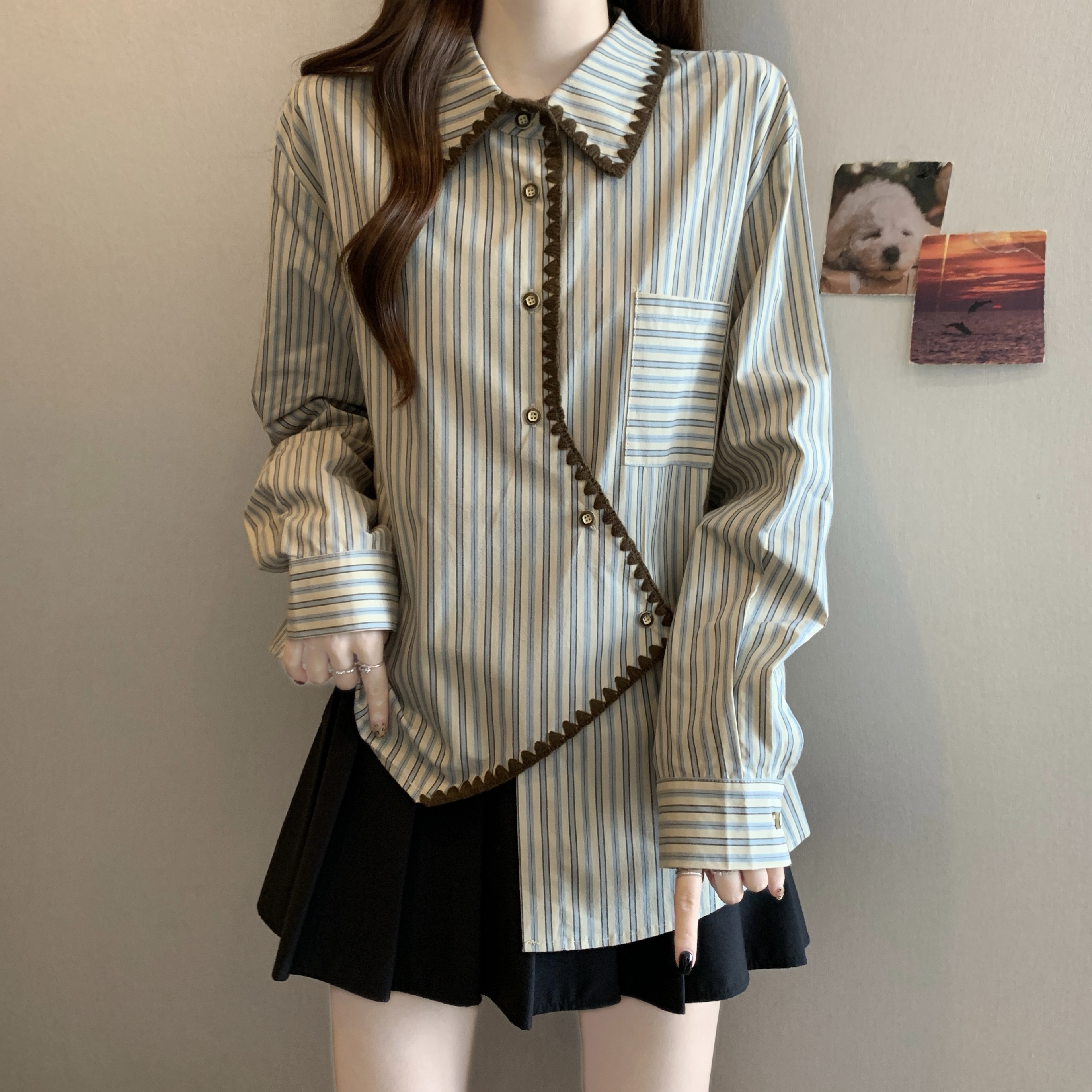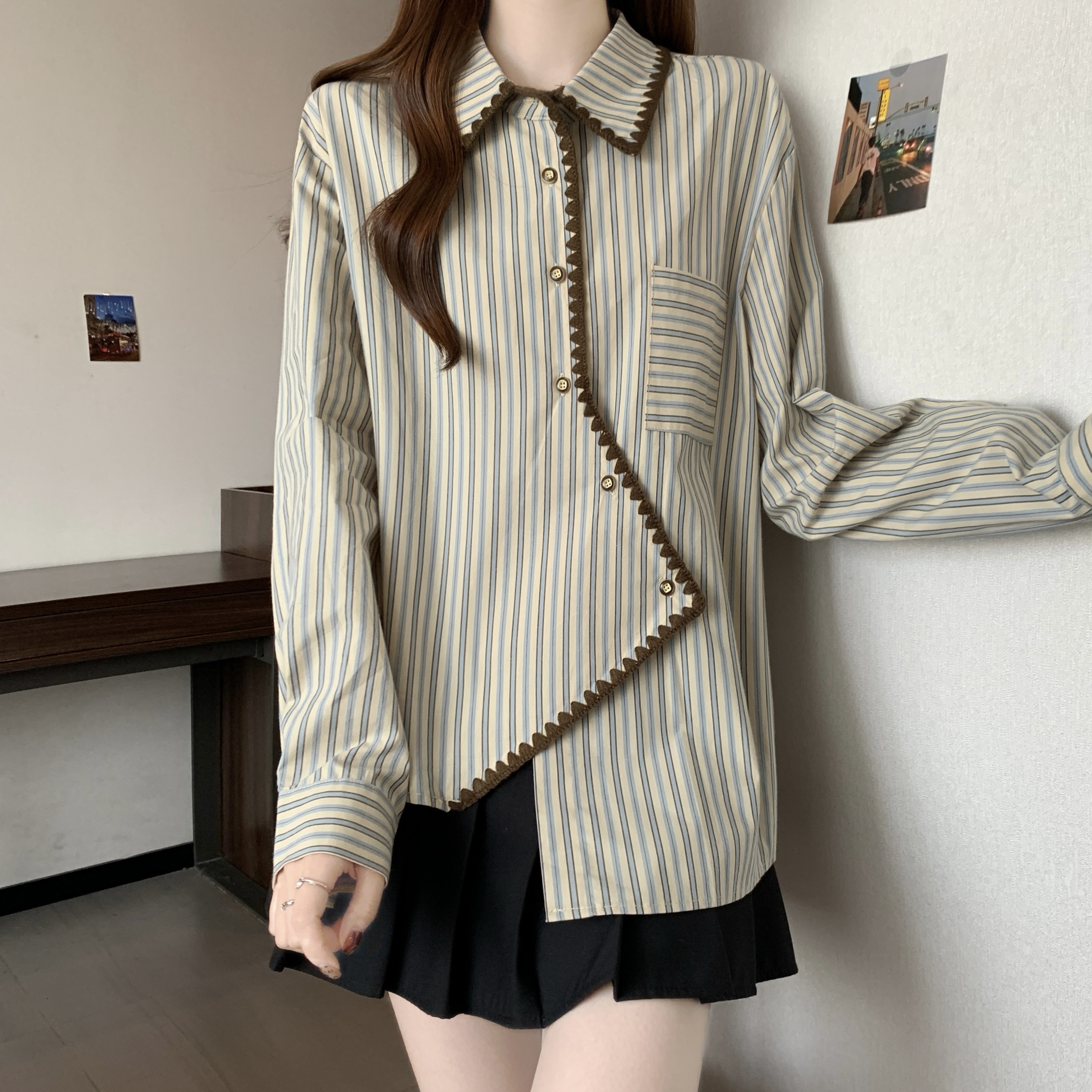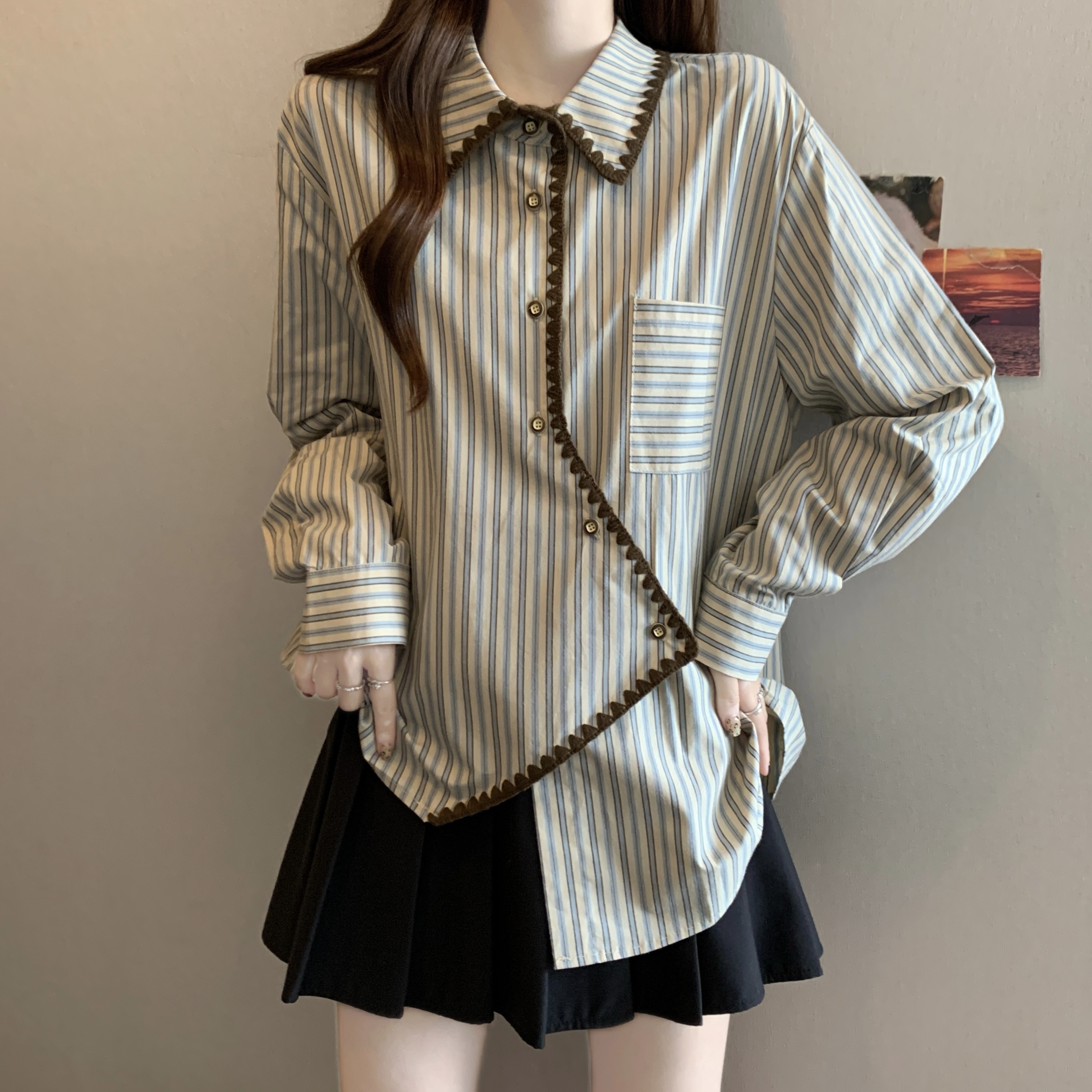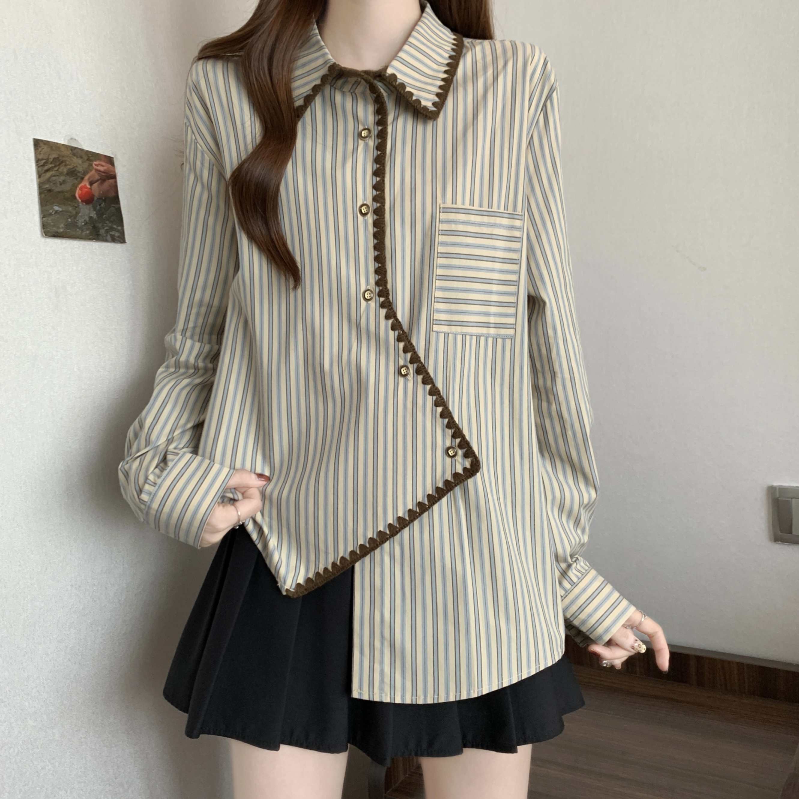 빅 사이즈 무거운 작업 2026 새로운 프랑스식 긴팔 셔츠 여성 의류 고급 센스 스트라이프 셔츠 슬림해 보이는 불규칙 맨위