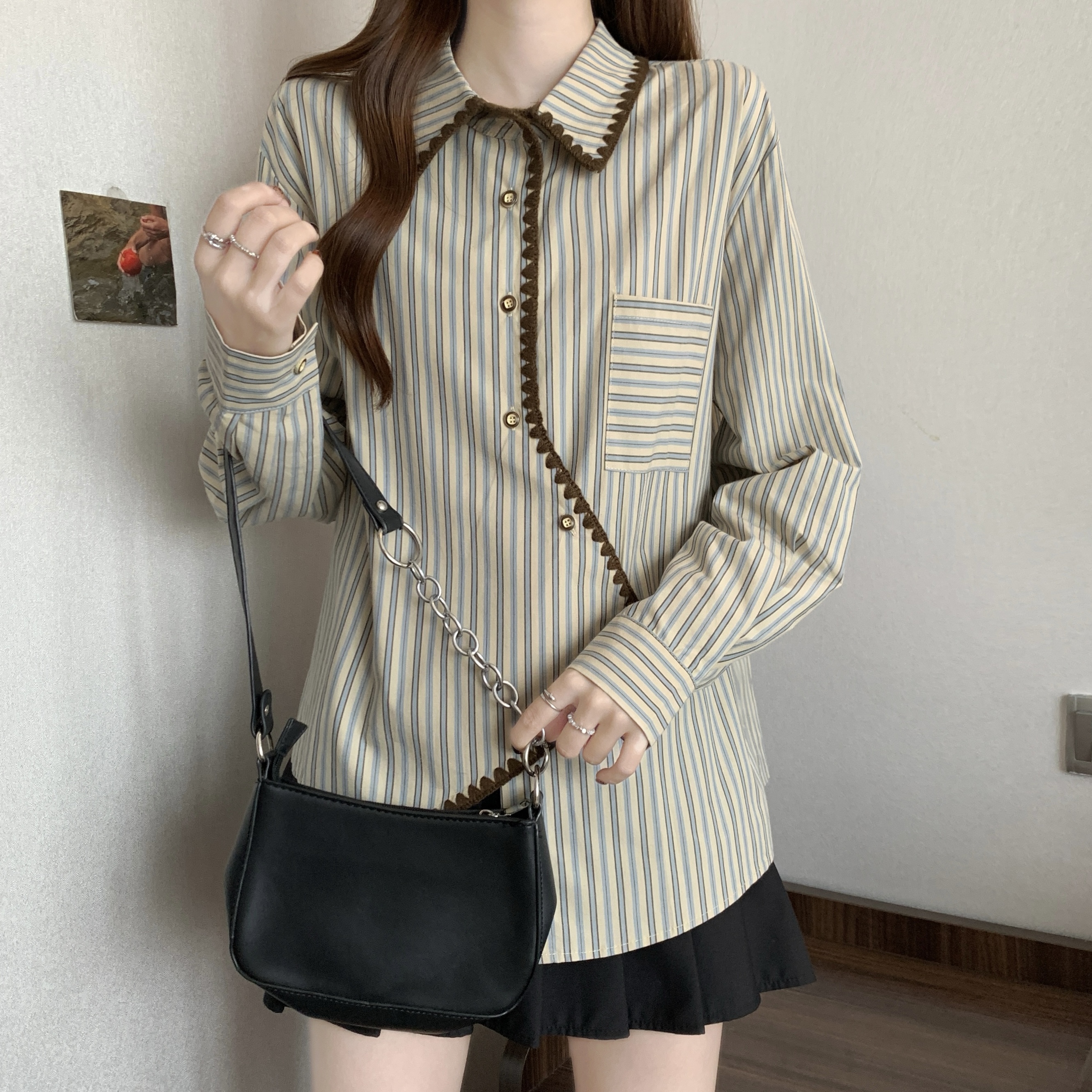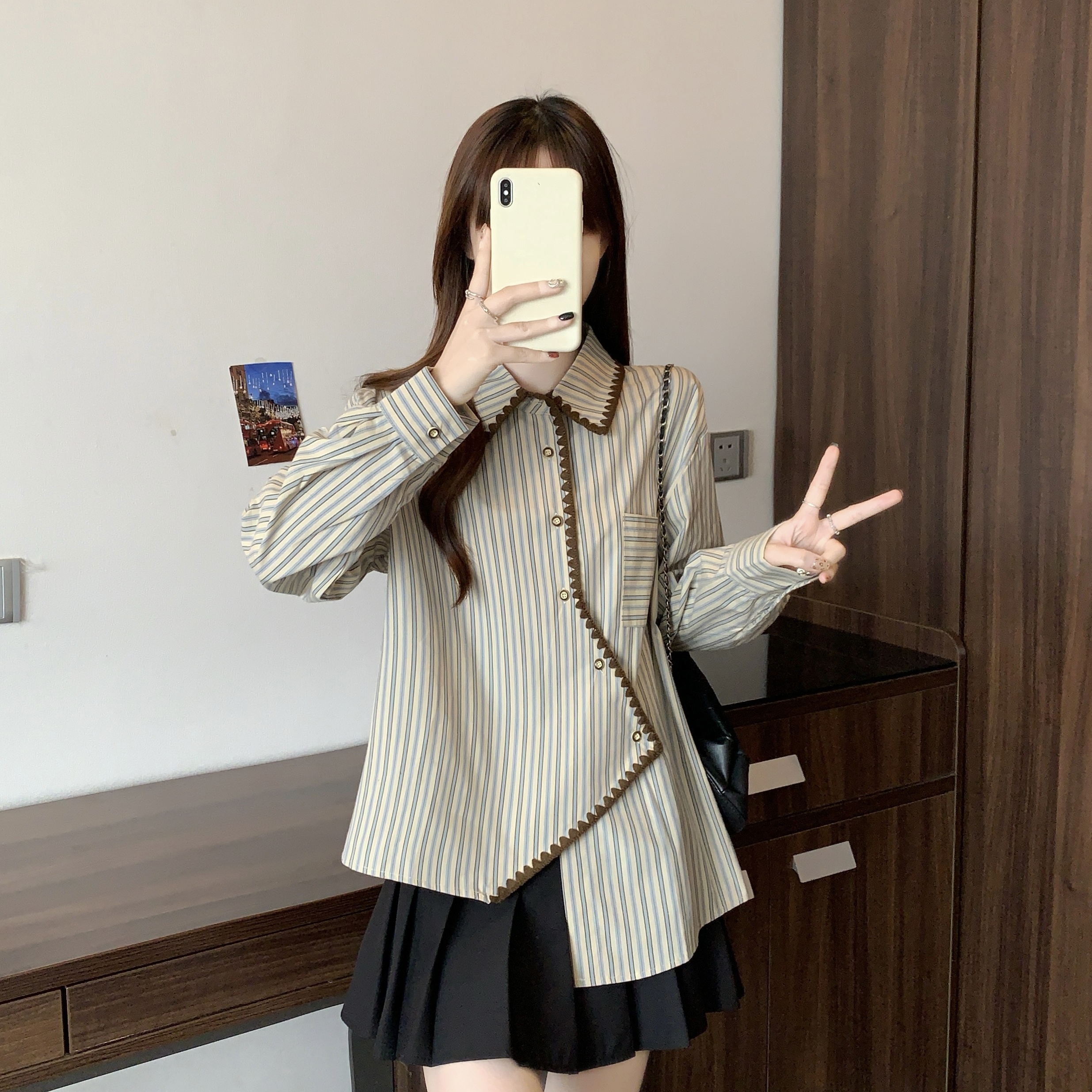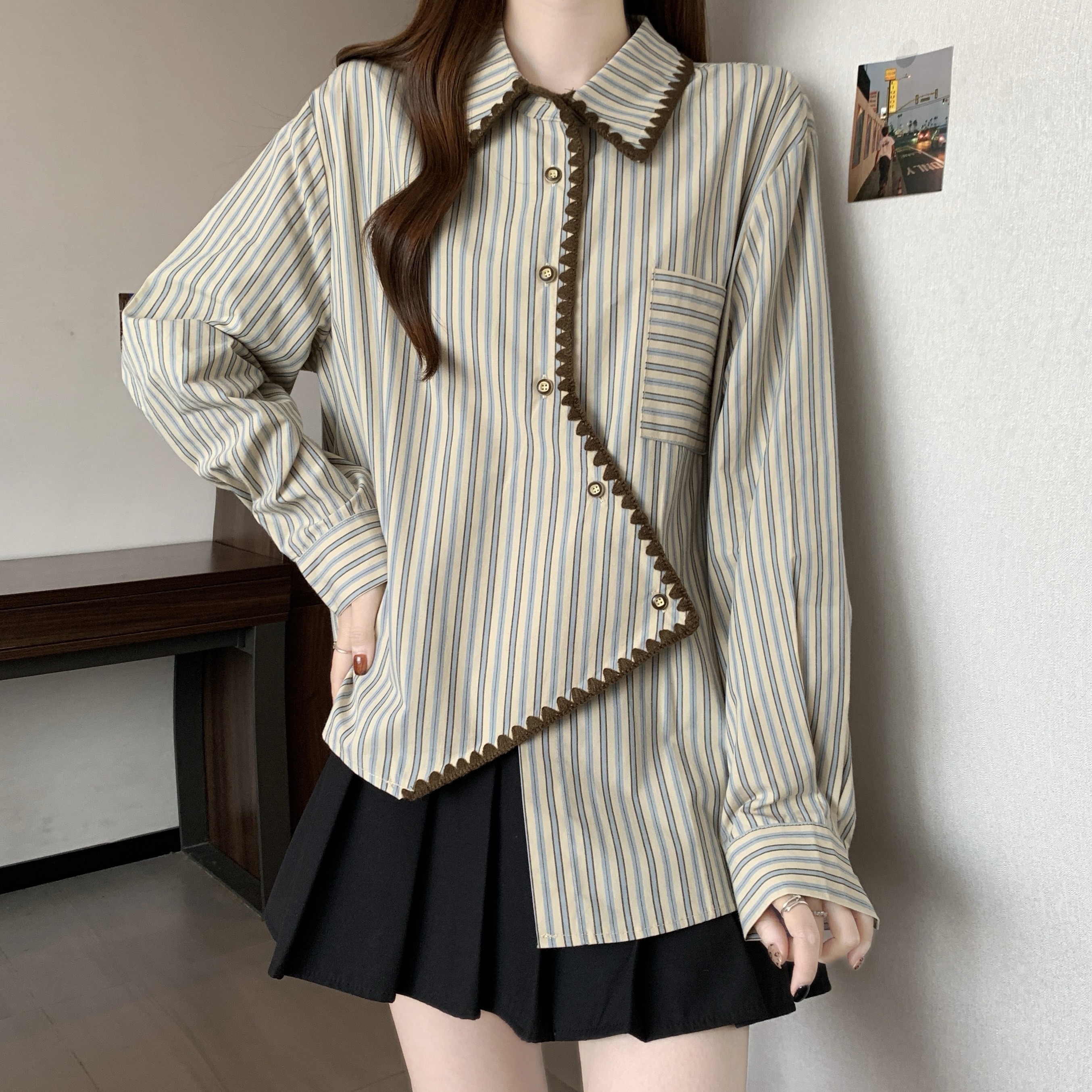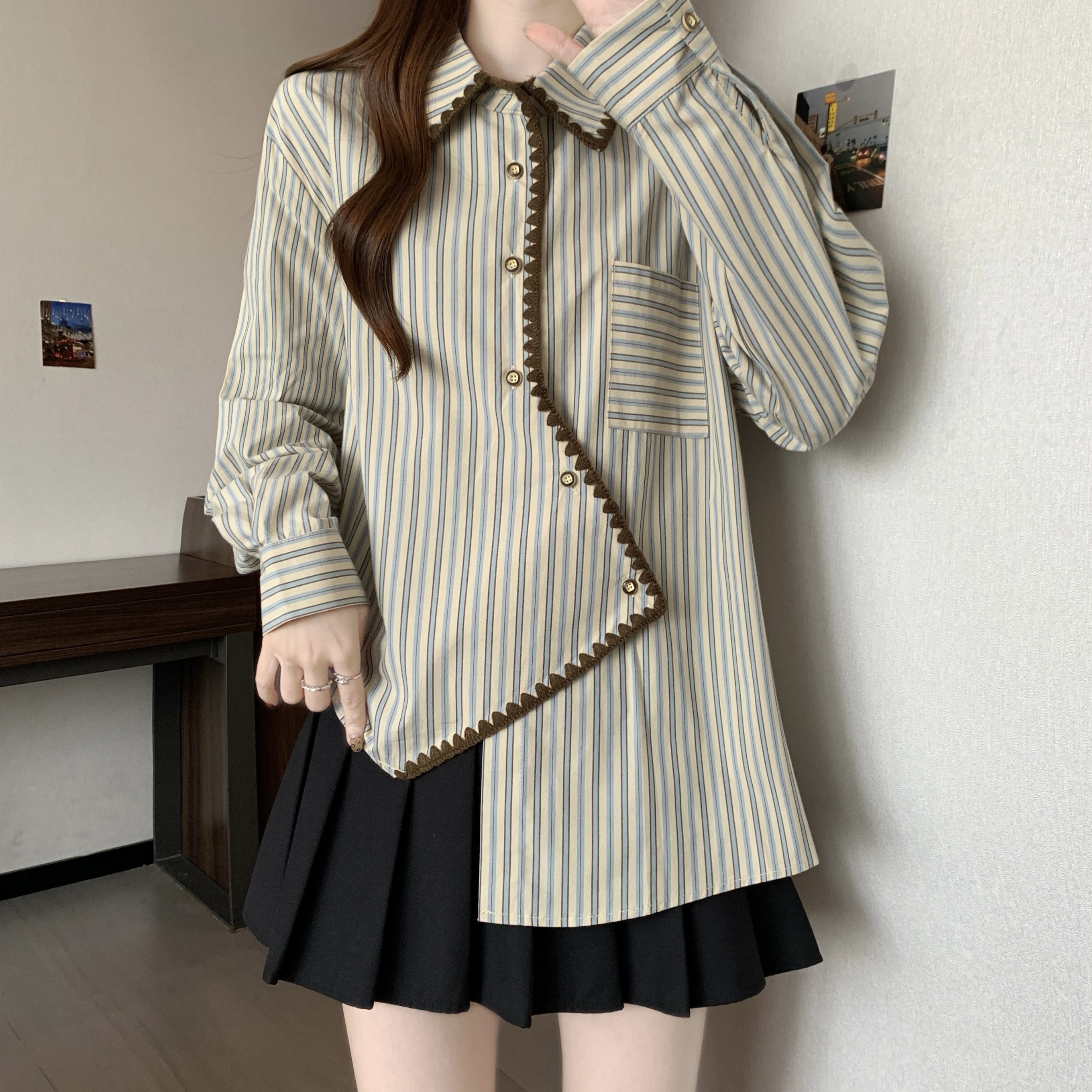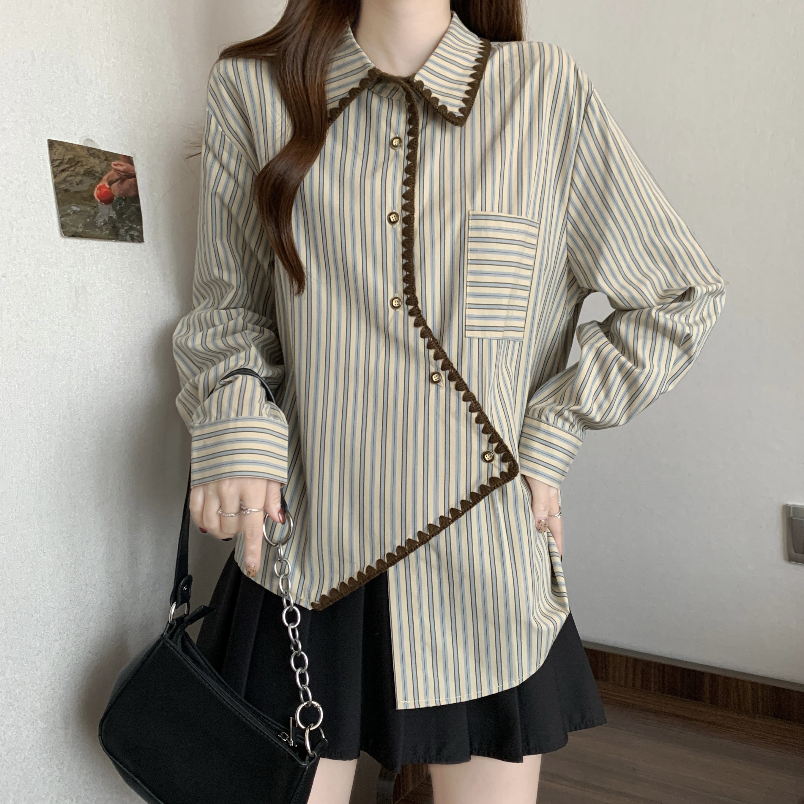 빅 사이즈 무거운 작업 2026 새로운 프랑스식 긴팔 셔츠 여성 의류 고급 센스 스트라이프 셔츠 슬림해 보이는 불규칙 맨위