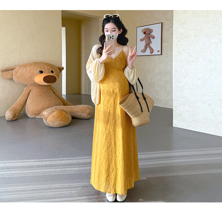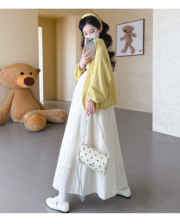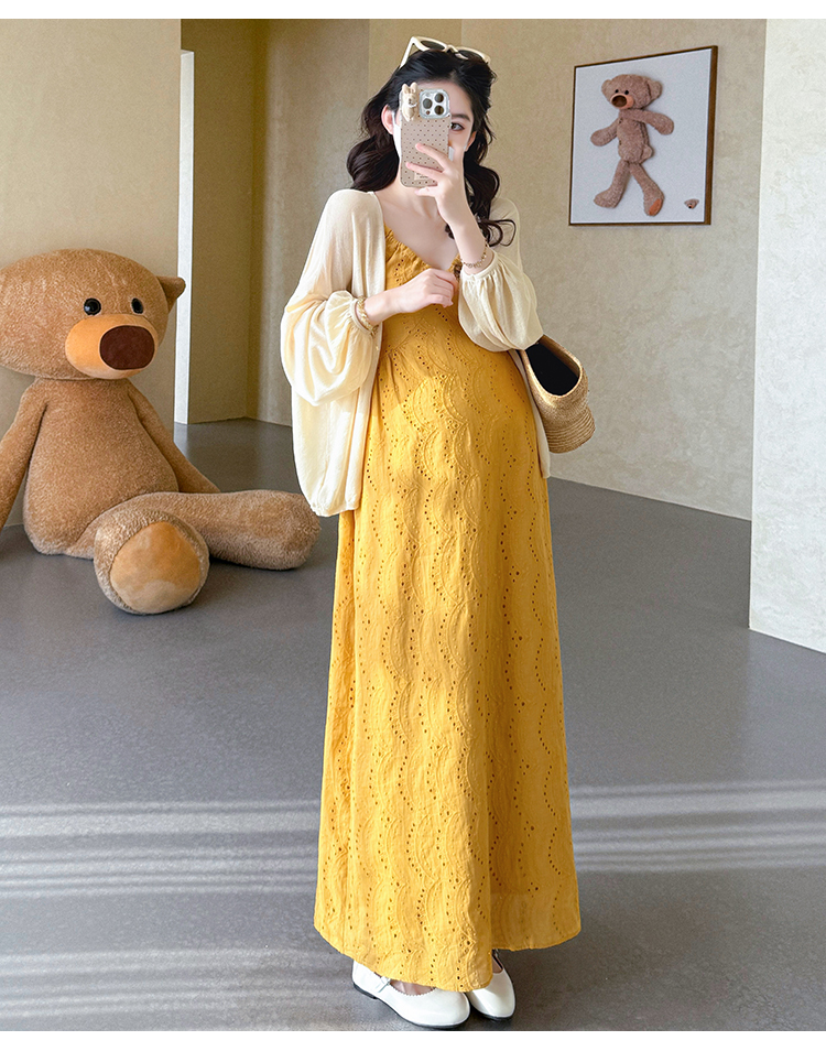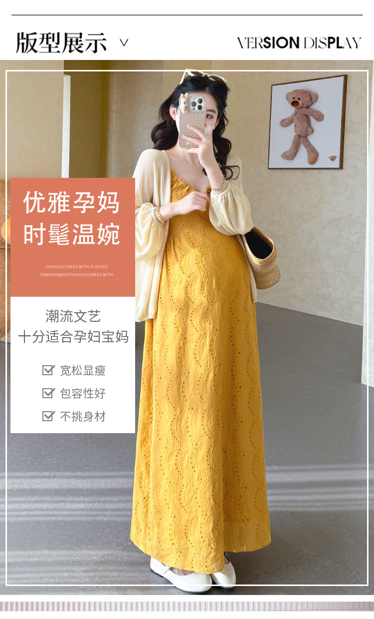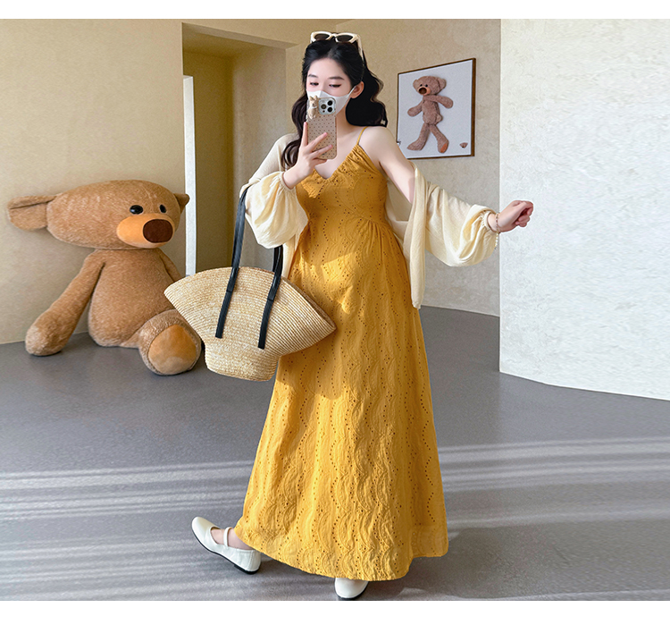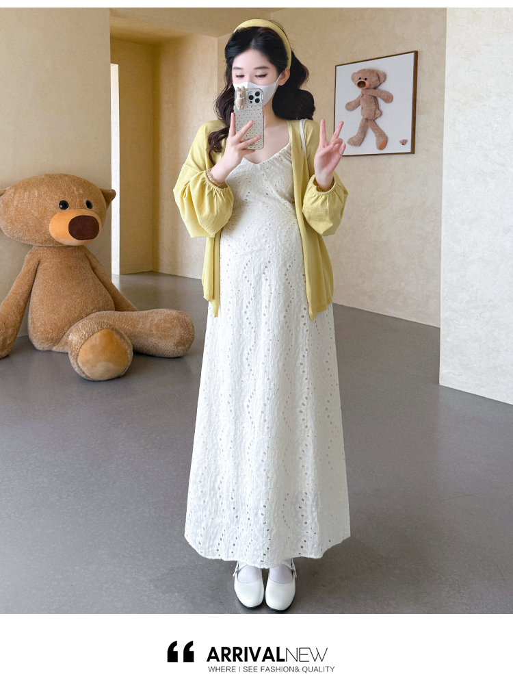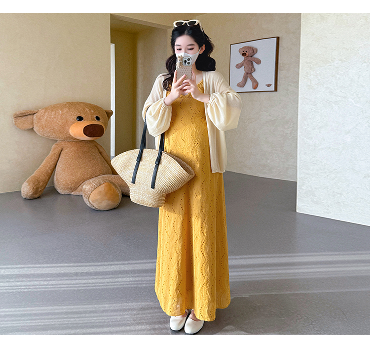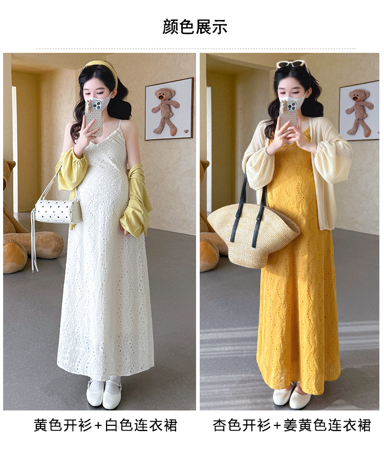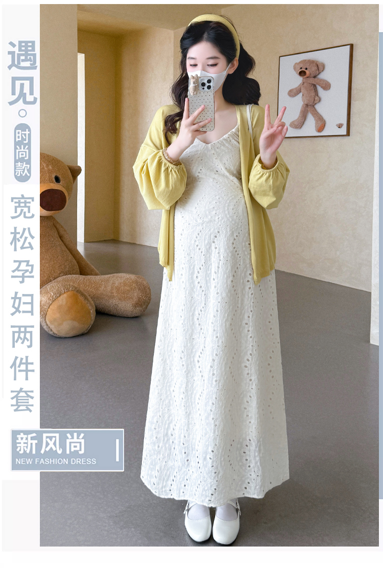 실사 xian 물품 봄 신제품 V넥 휴가 바람 드레스 니트 오픈 가디건 임산부 세트