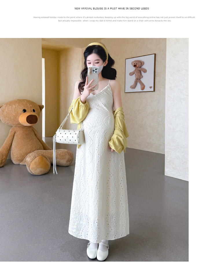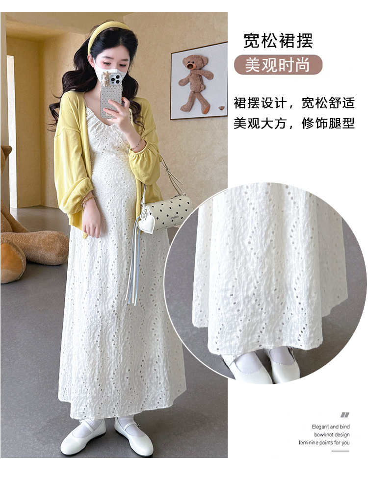 실사 여름 프랑스식 레이스 조각 레트로 천 금빛 바람 임신 엄마 디스플레이 화이트 식물 플러시 니트 롱 코트 드레스
