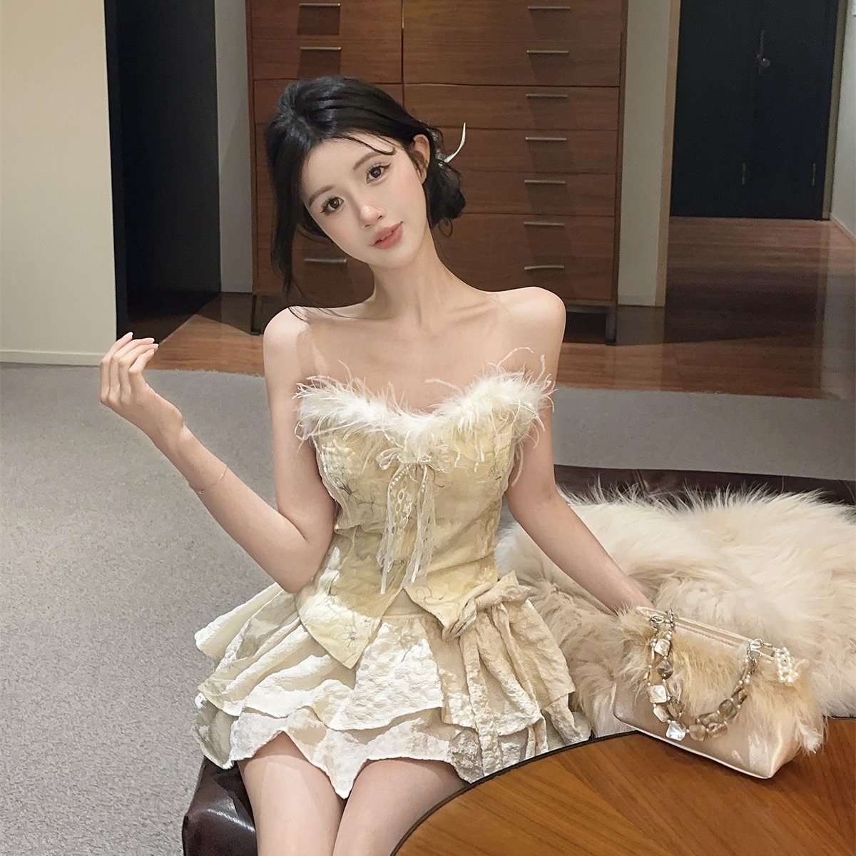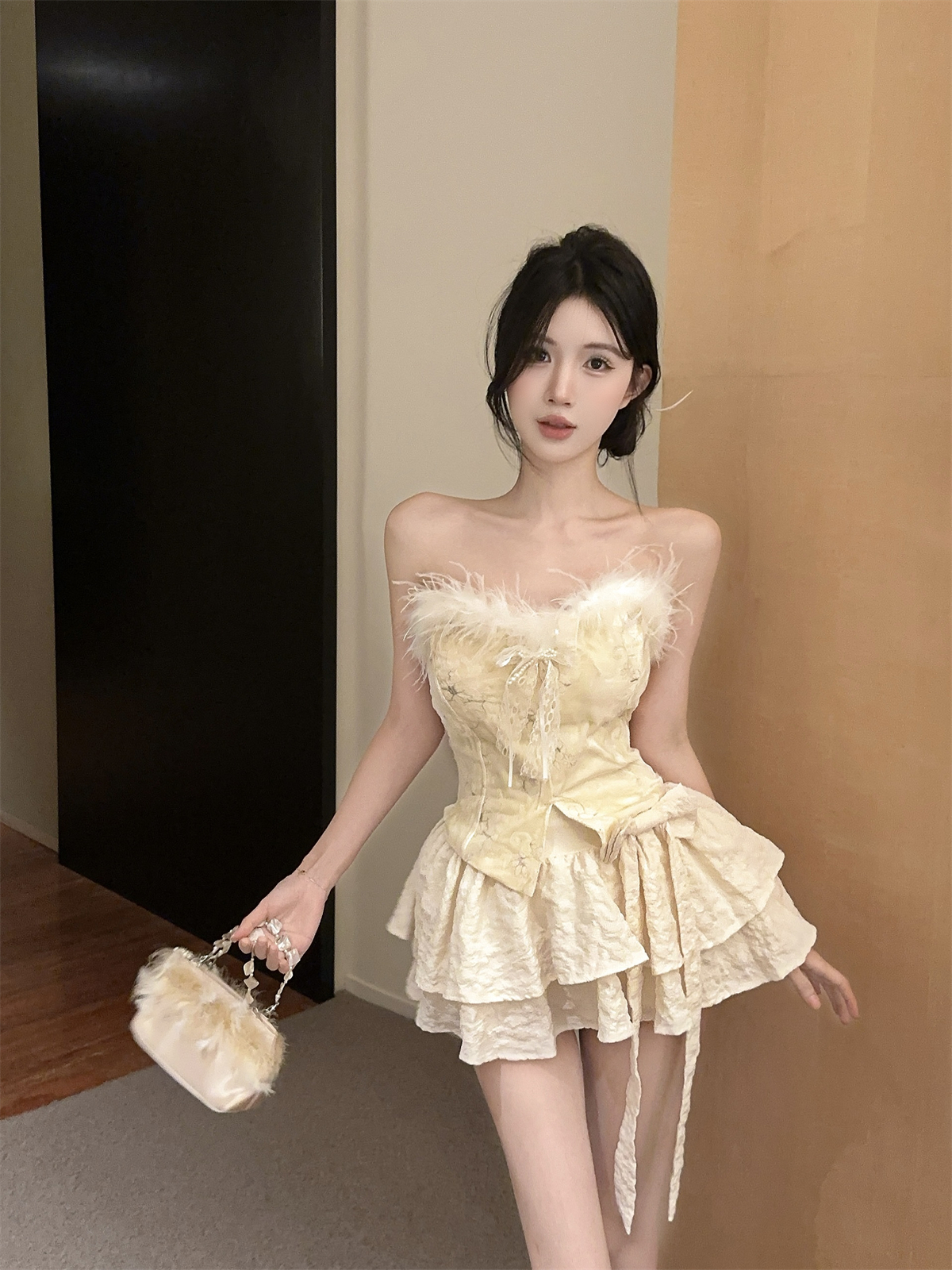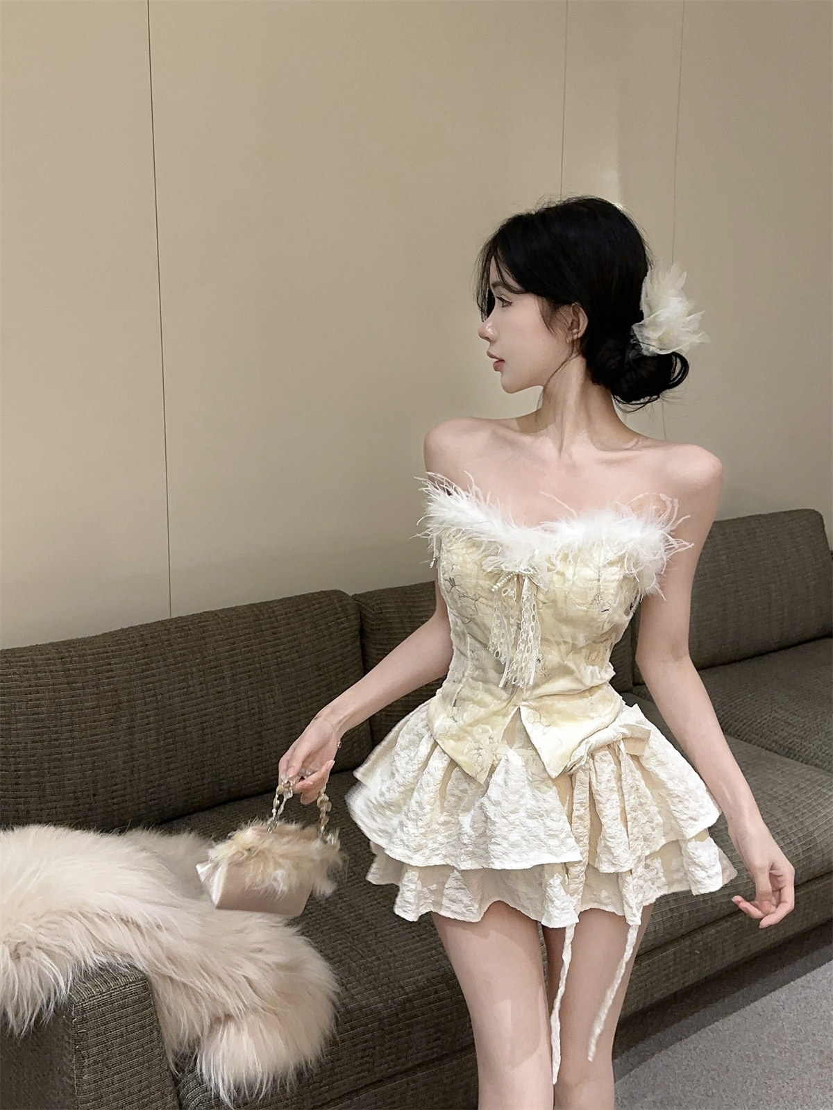 실사 정가 부드러운 모피 철자 레이스 레이스 스트랩 순수한 욕망 튜브탑 빛 럭셔리 자수 미니 스커트 여성 봄 세트
