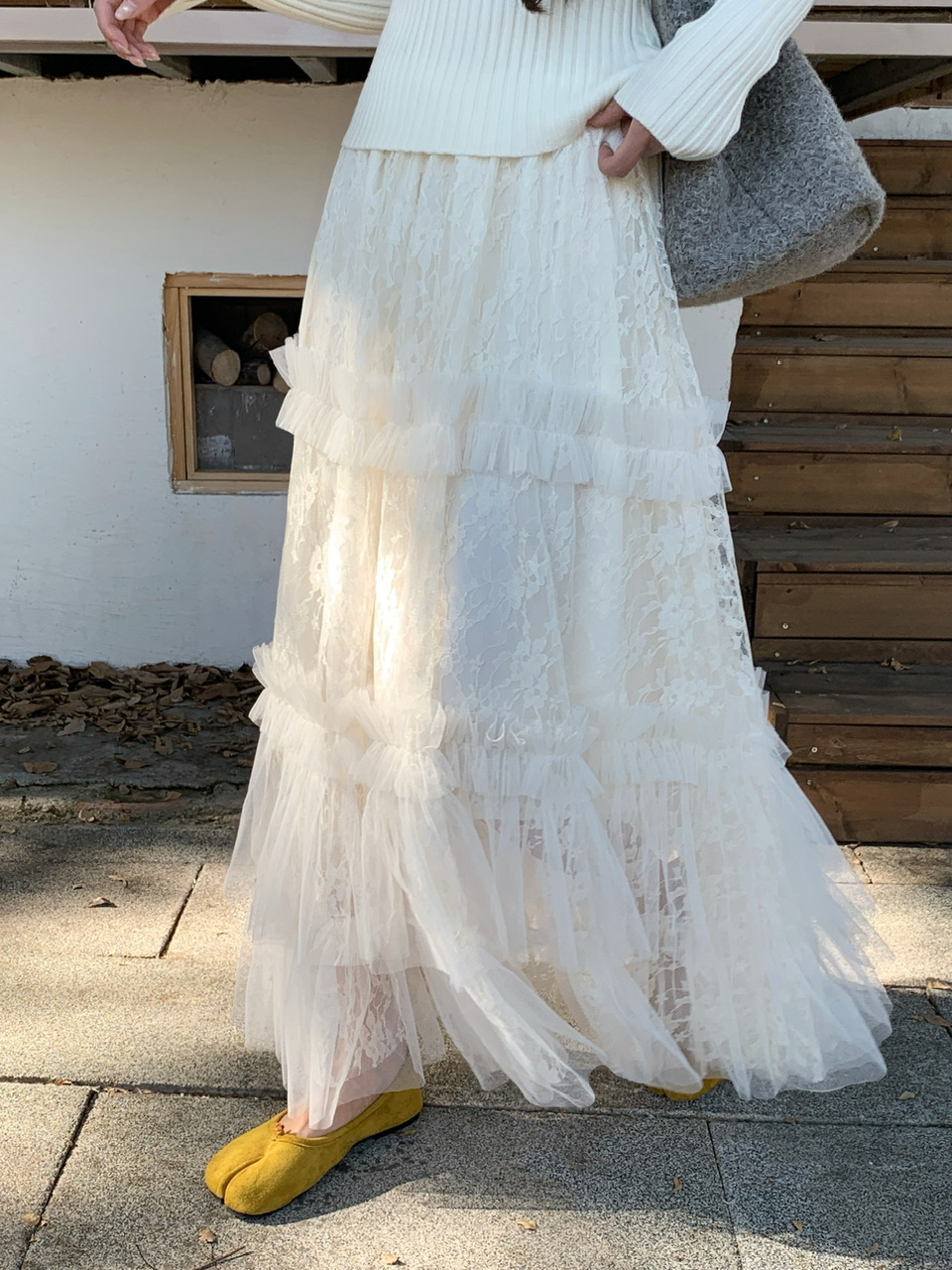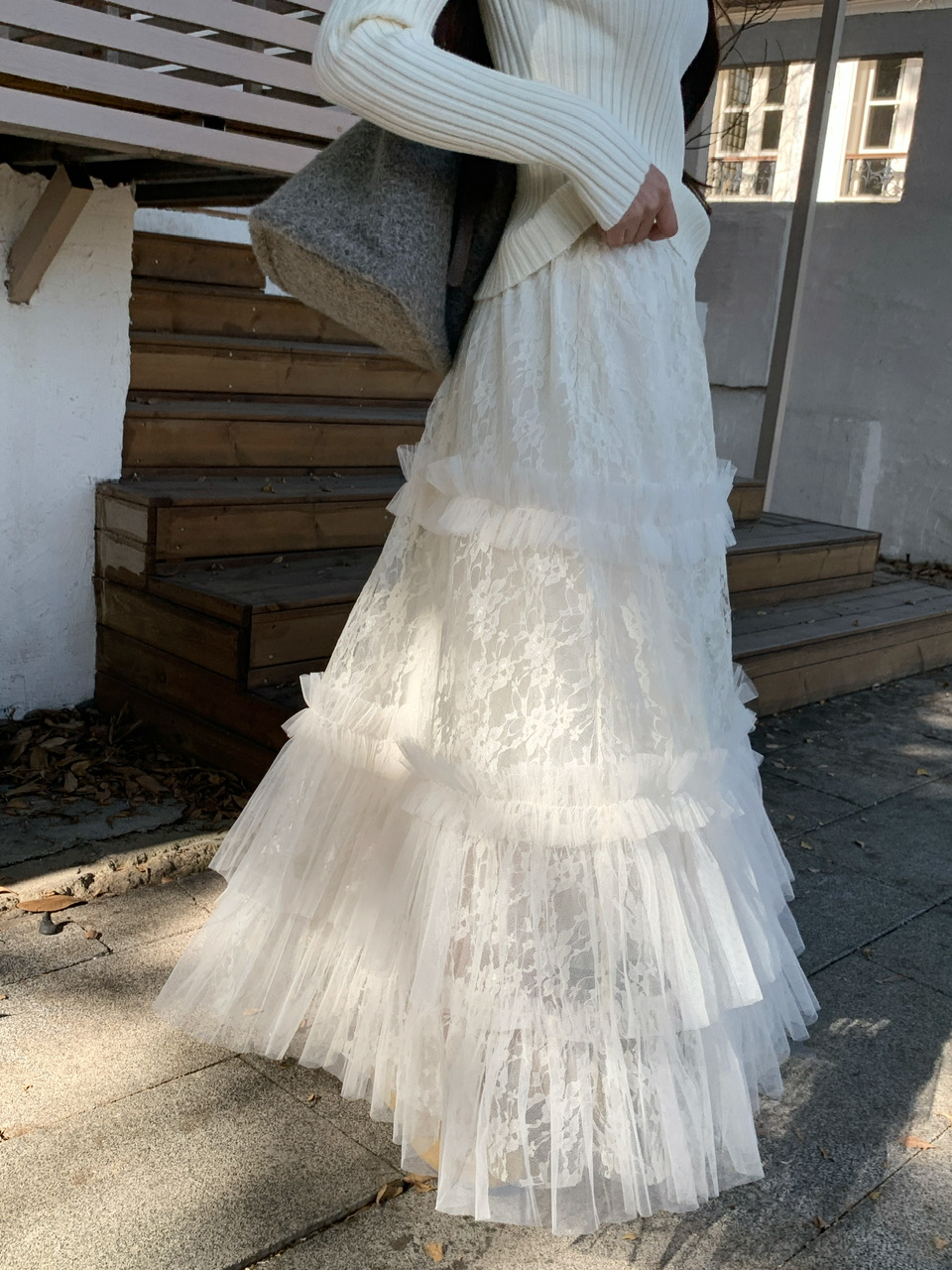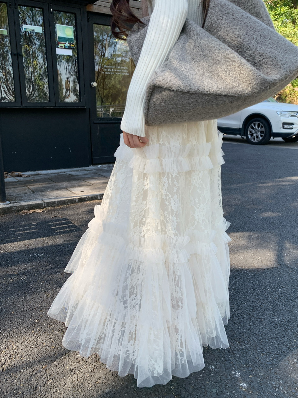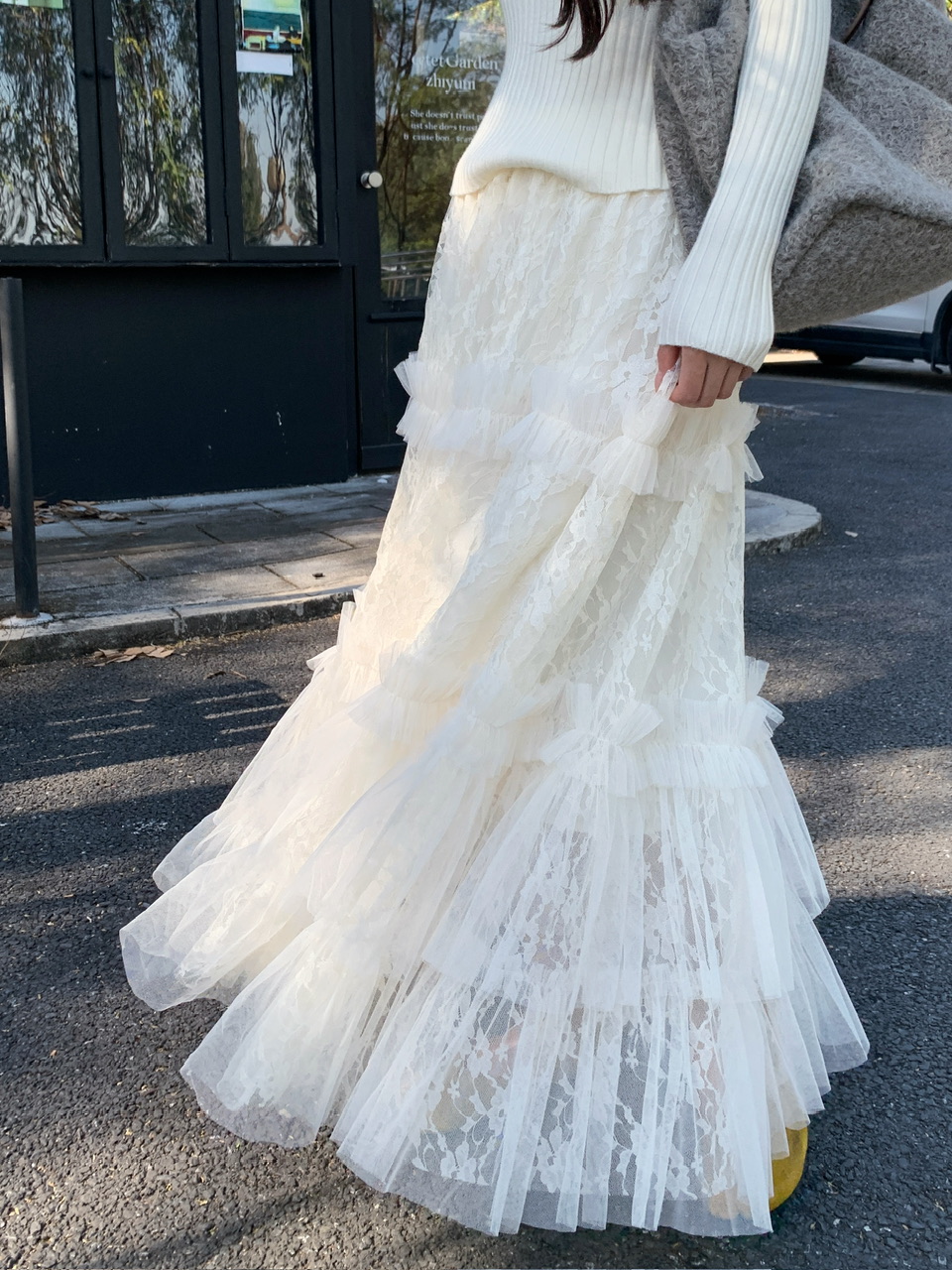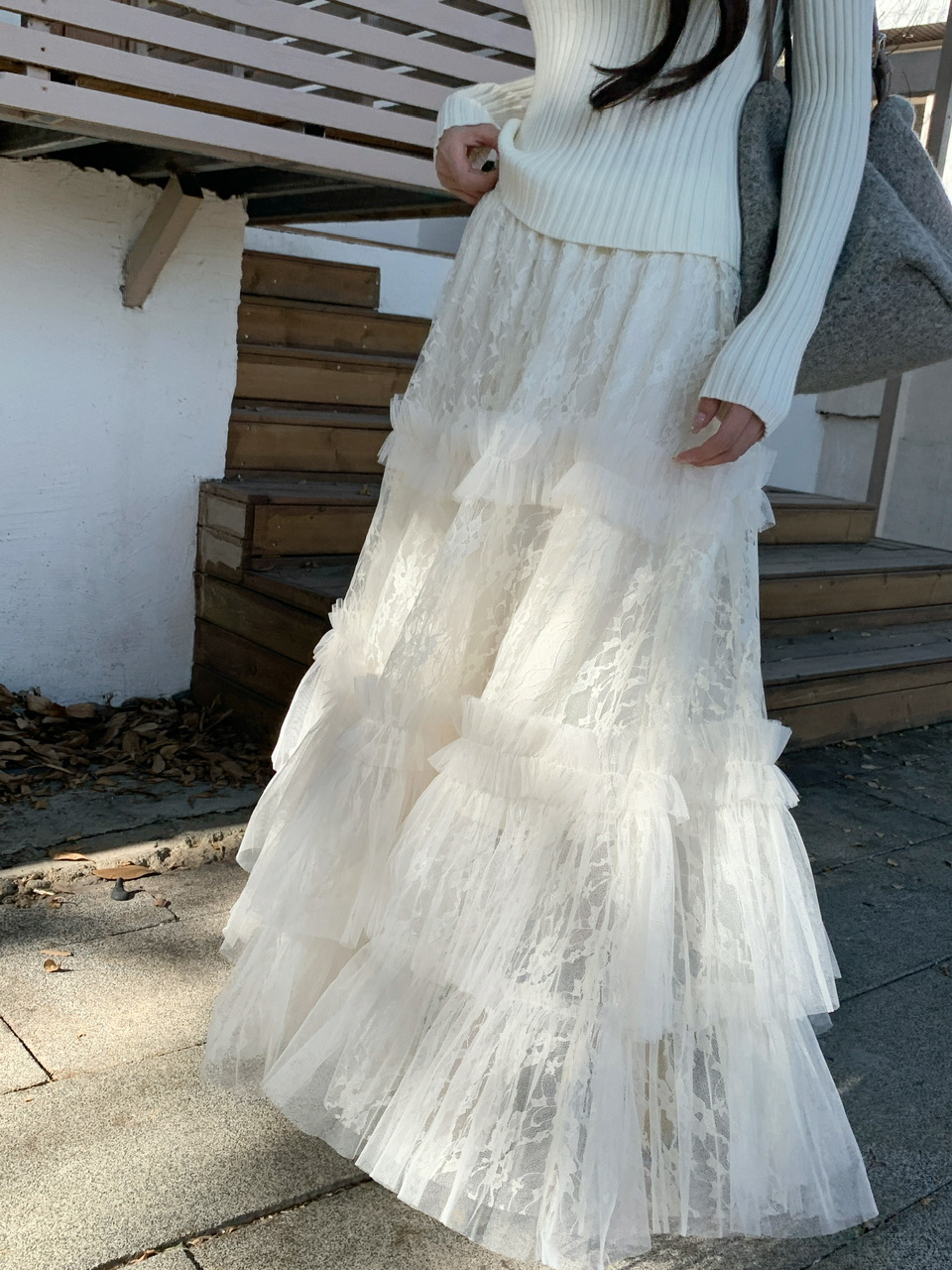정가 실사 새로운 달콤한 차가운 바람 화이트 레이스 반신 스커트 프릴 큰 진자 롱 스커트